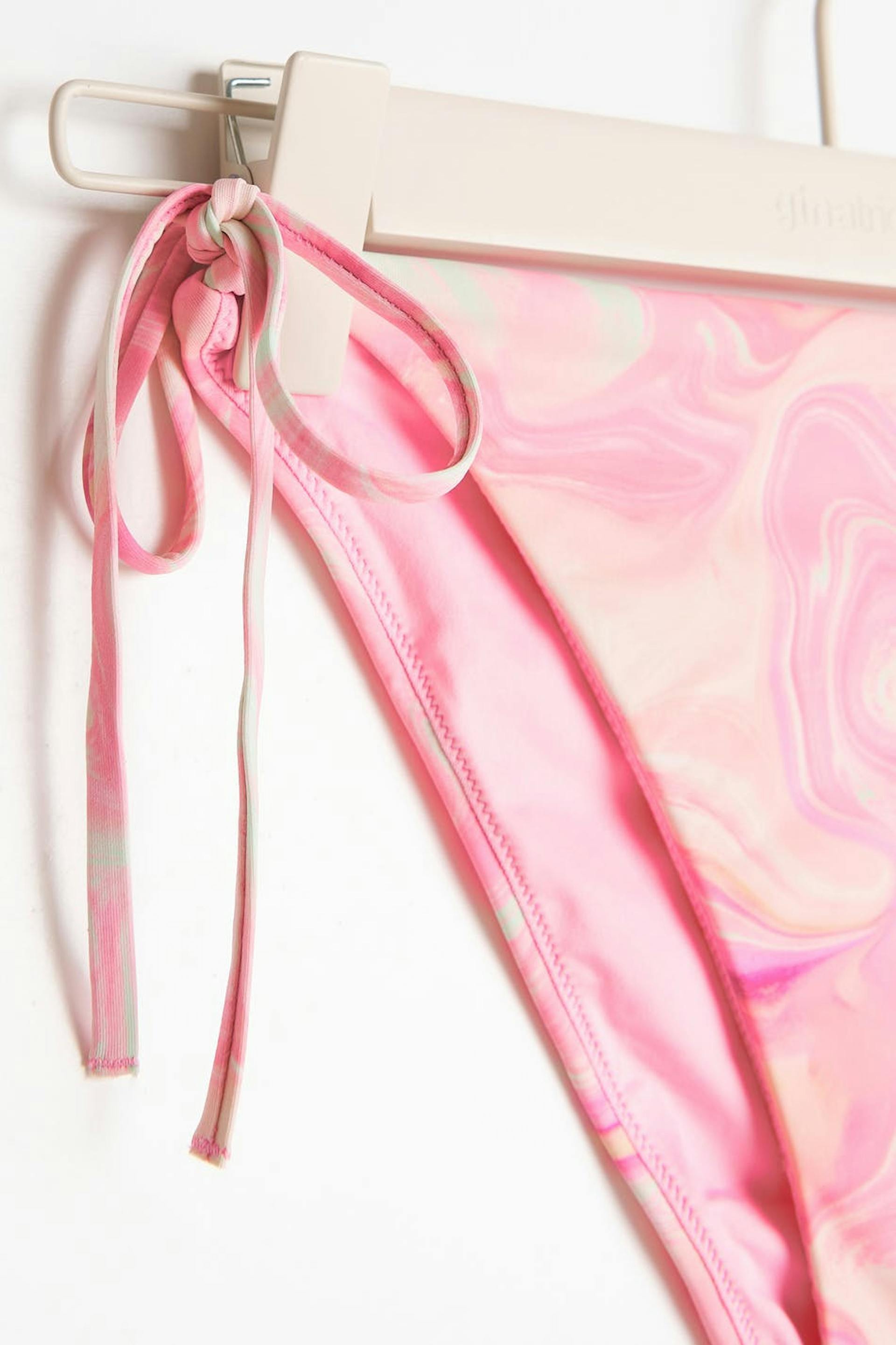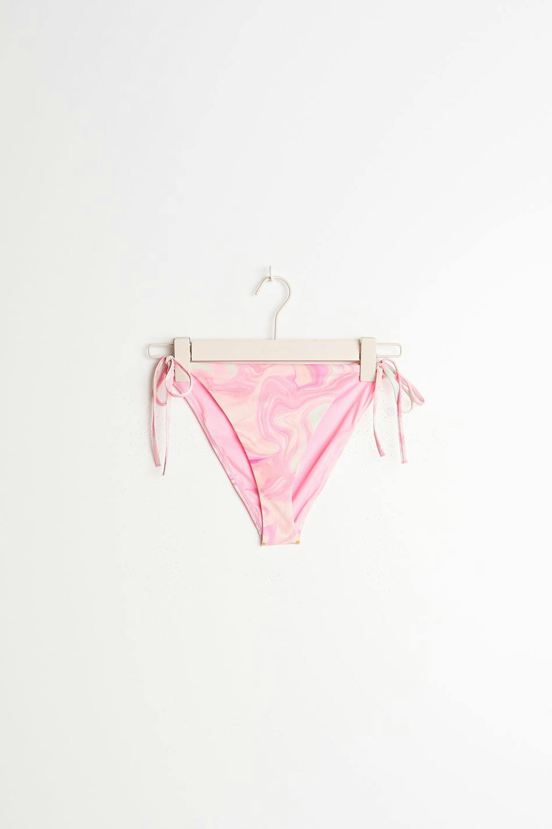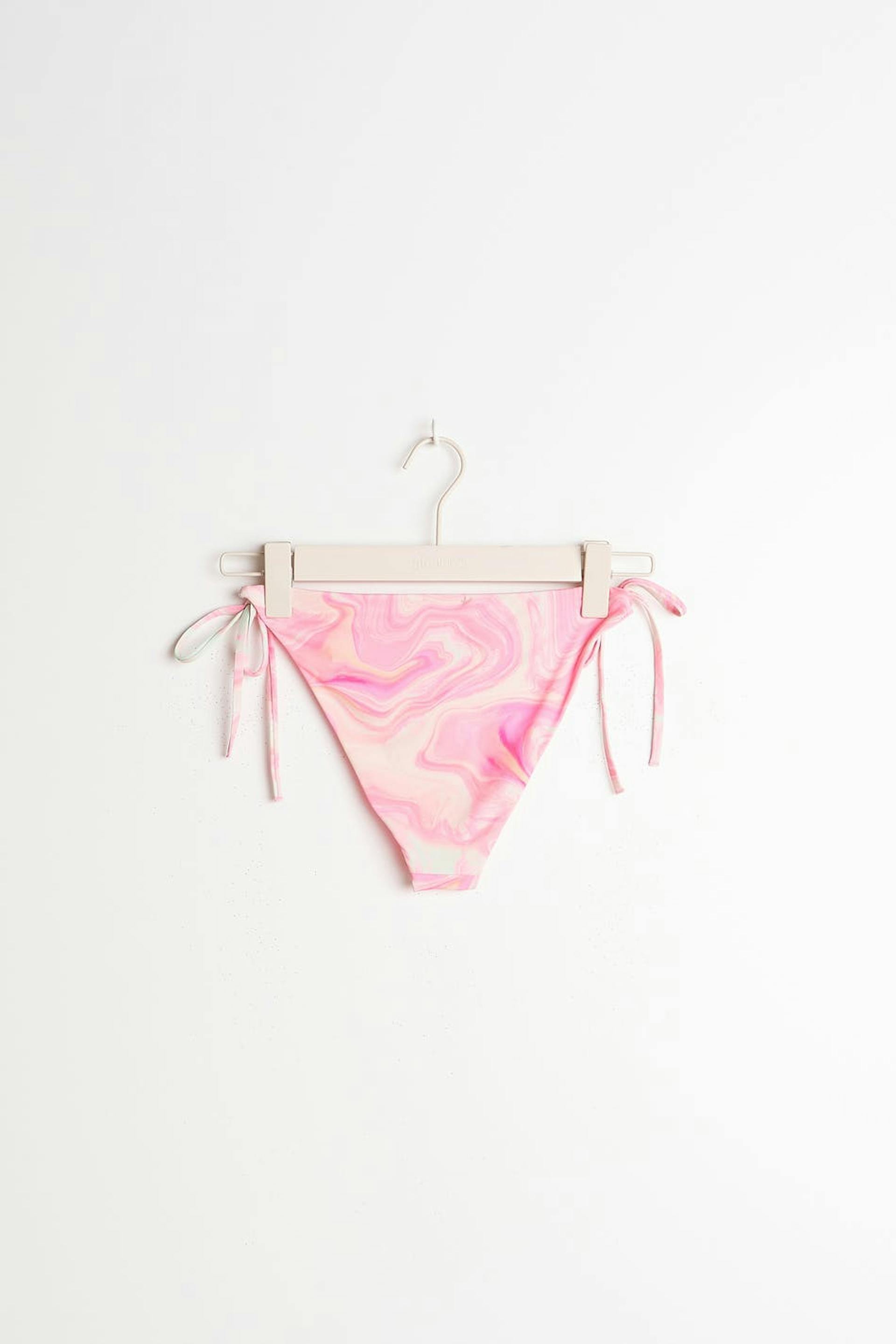 Forede bikiniunderdele med snøringer på siderne. Trusserne er pink og har et halvskinnende badedragtsmateriale. De har en elastik ved taljen og på benåbningerne.