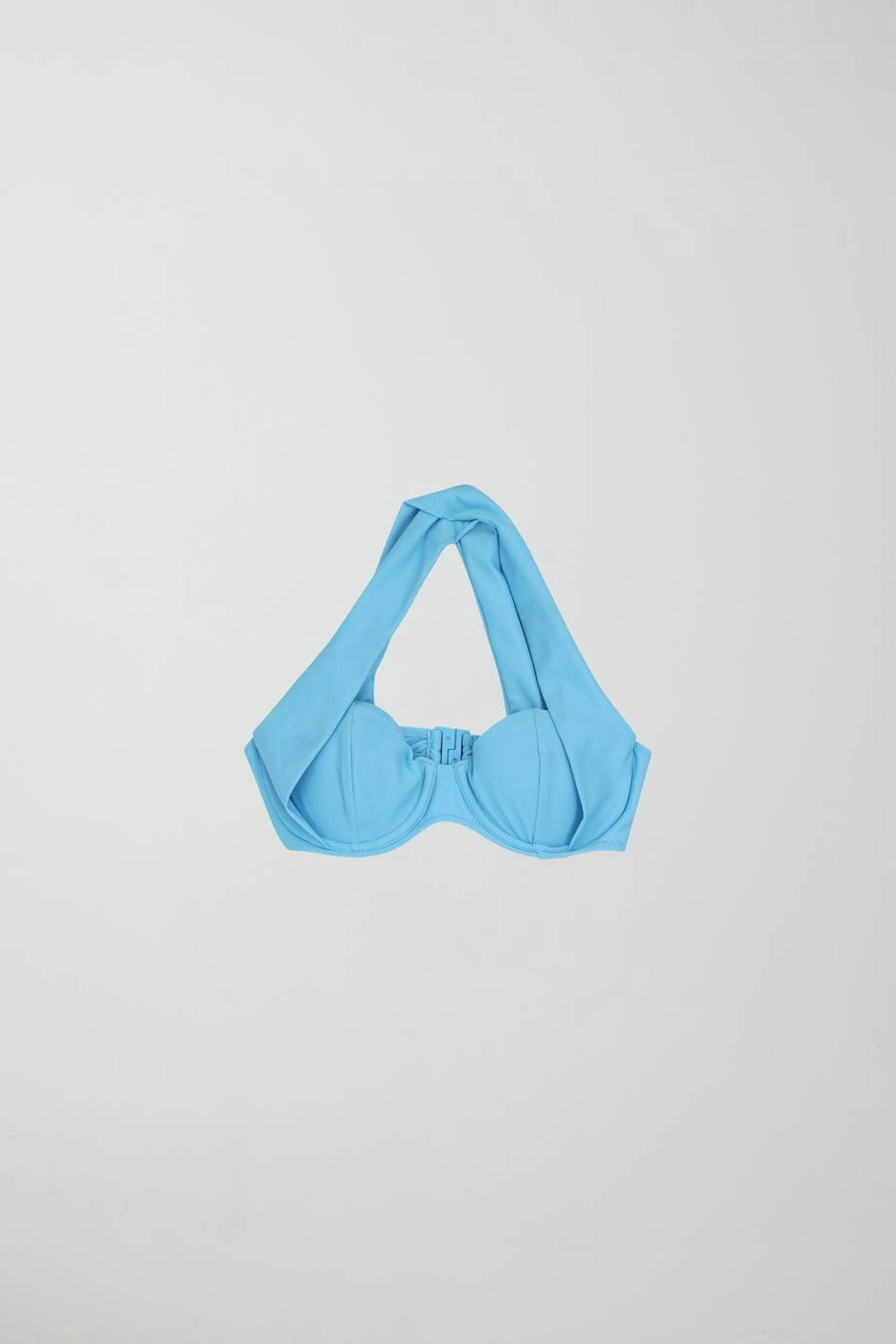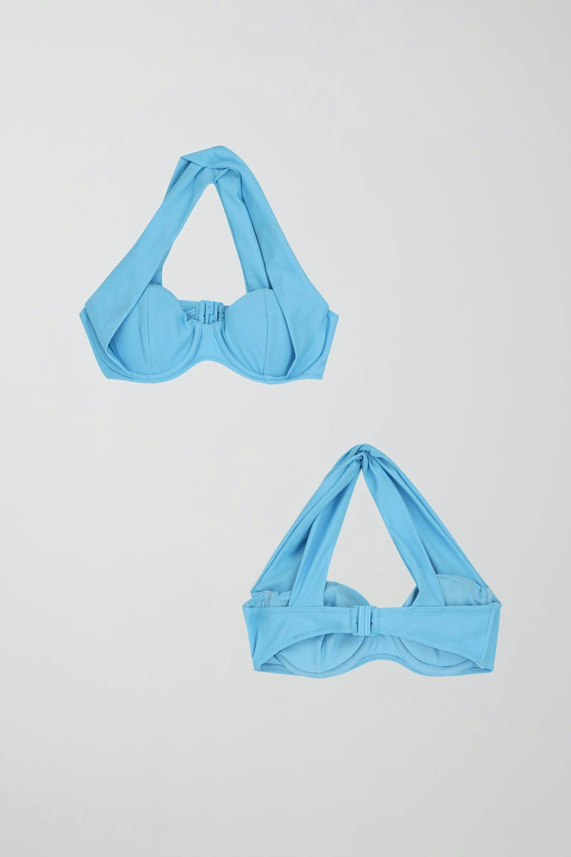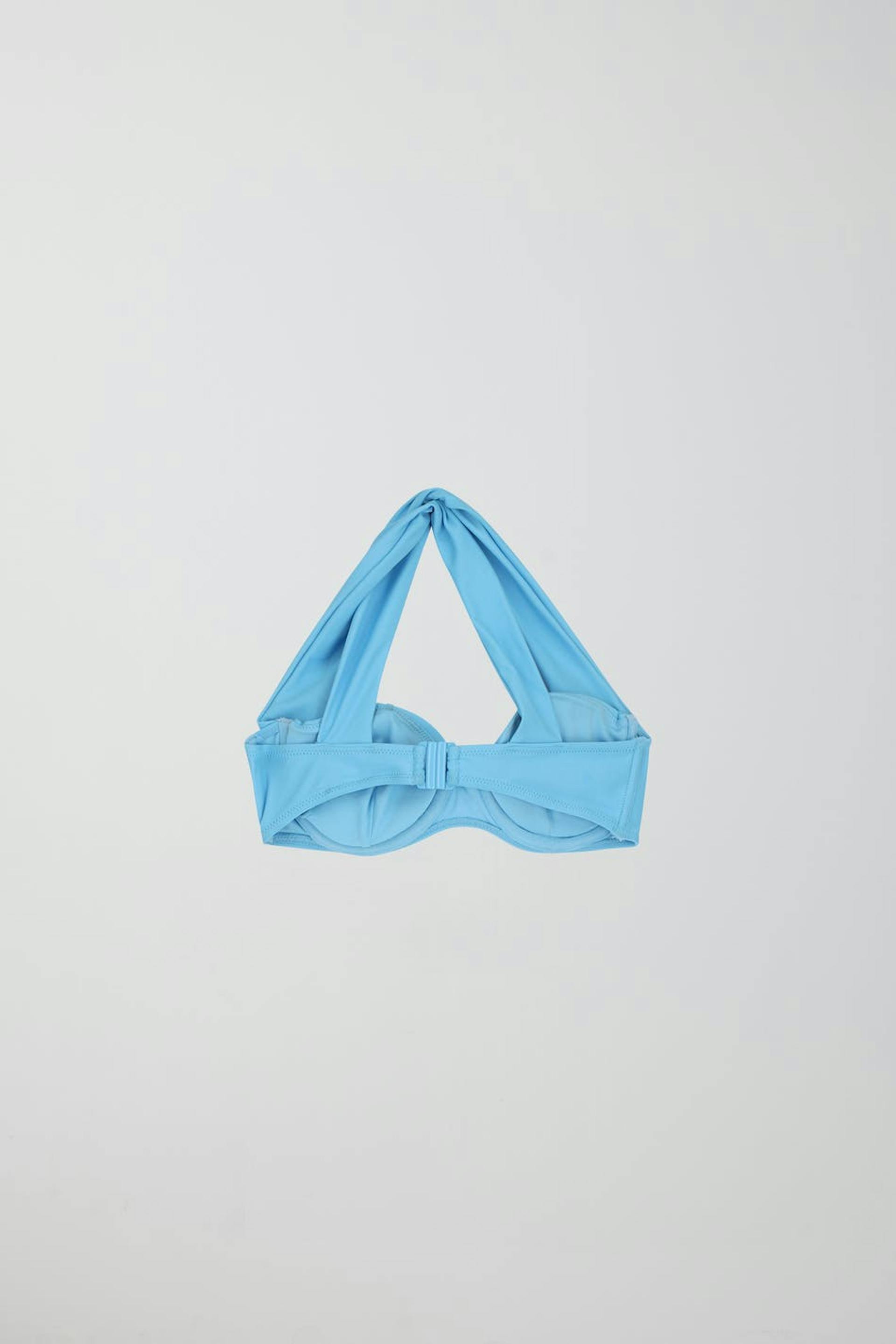 Bikini-BH med brede skulderstropper der krydses på ryggen. Bikini-BH'en er blå og har bøjle med blød støtte. Den har et halvskinnende badedragtsmateriale og lukning med spænde i ryggen.