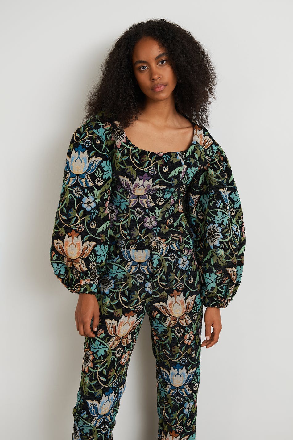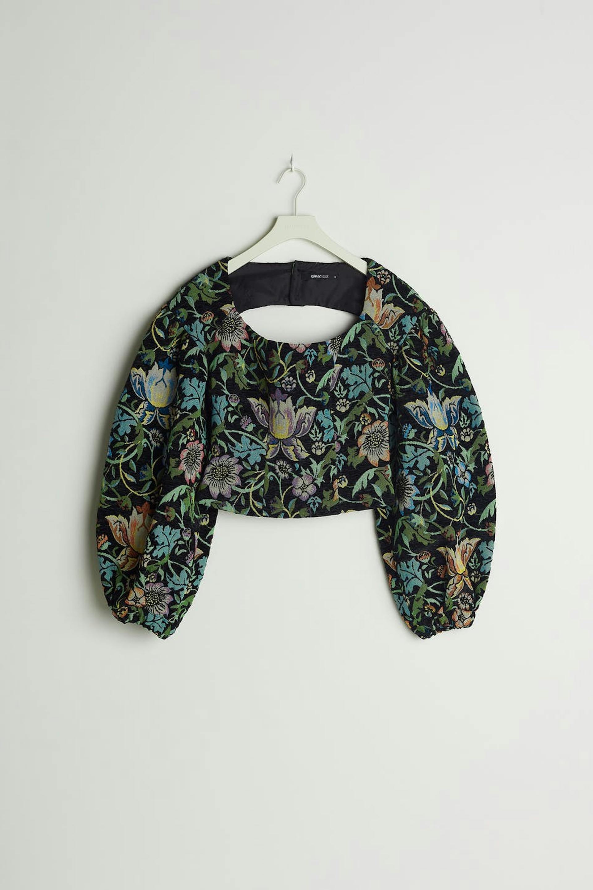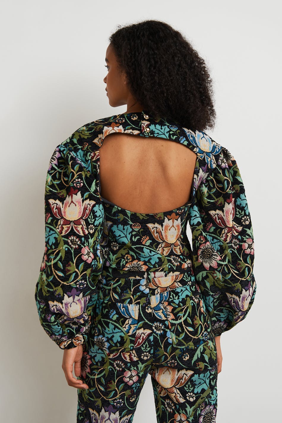 Blomstret bluse med en formende pasform. Blusen er grøn og har en detalje i ryggen med et udsnit. Den er fremstillet af jacquardvæv og har pufærmer og en knapstolpe ved bagsiden.