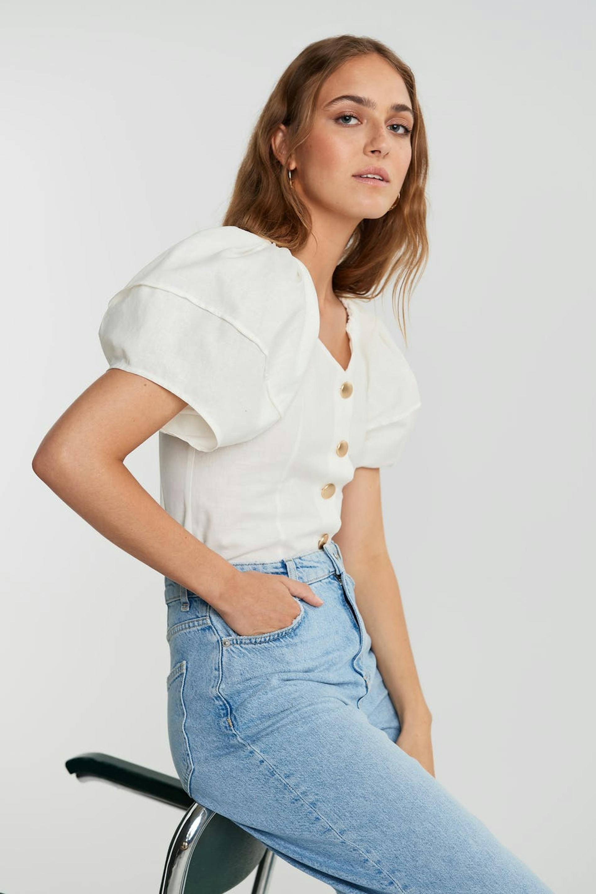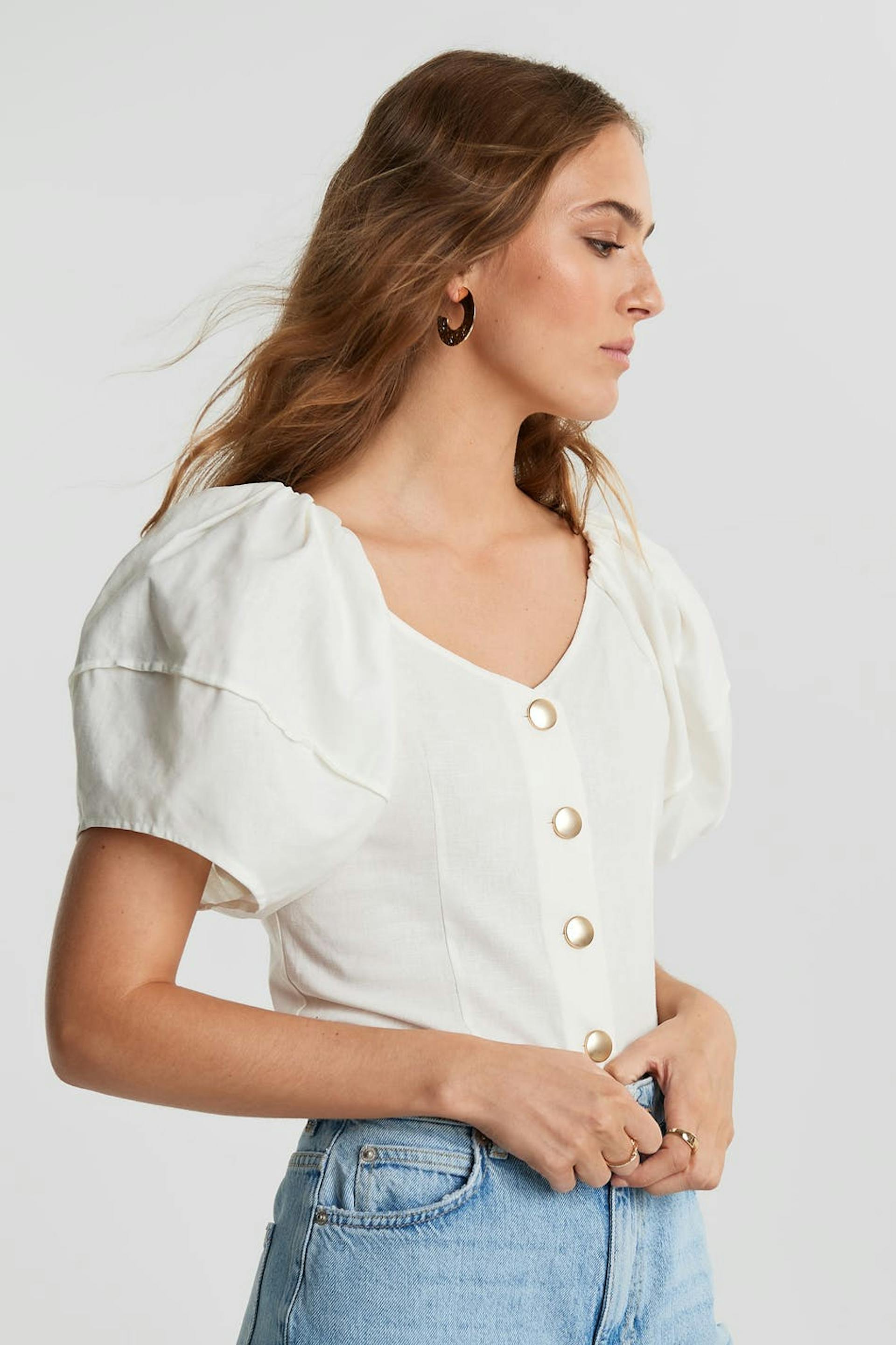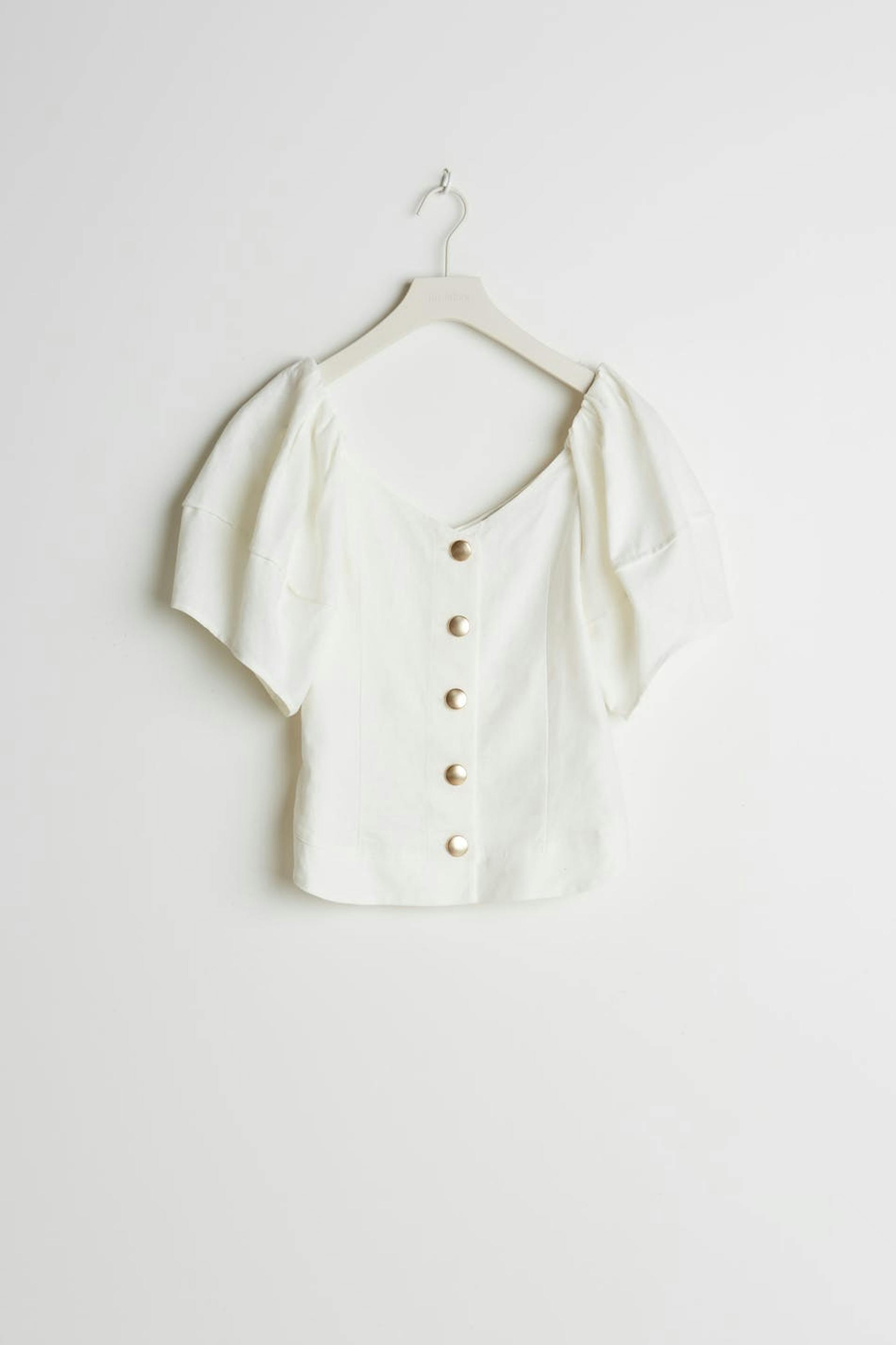 Bluse med korte, store pufærmer med sømdetaljer. Blusen er hvid og har gyldne knapper ved fronten.