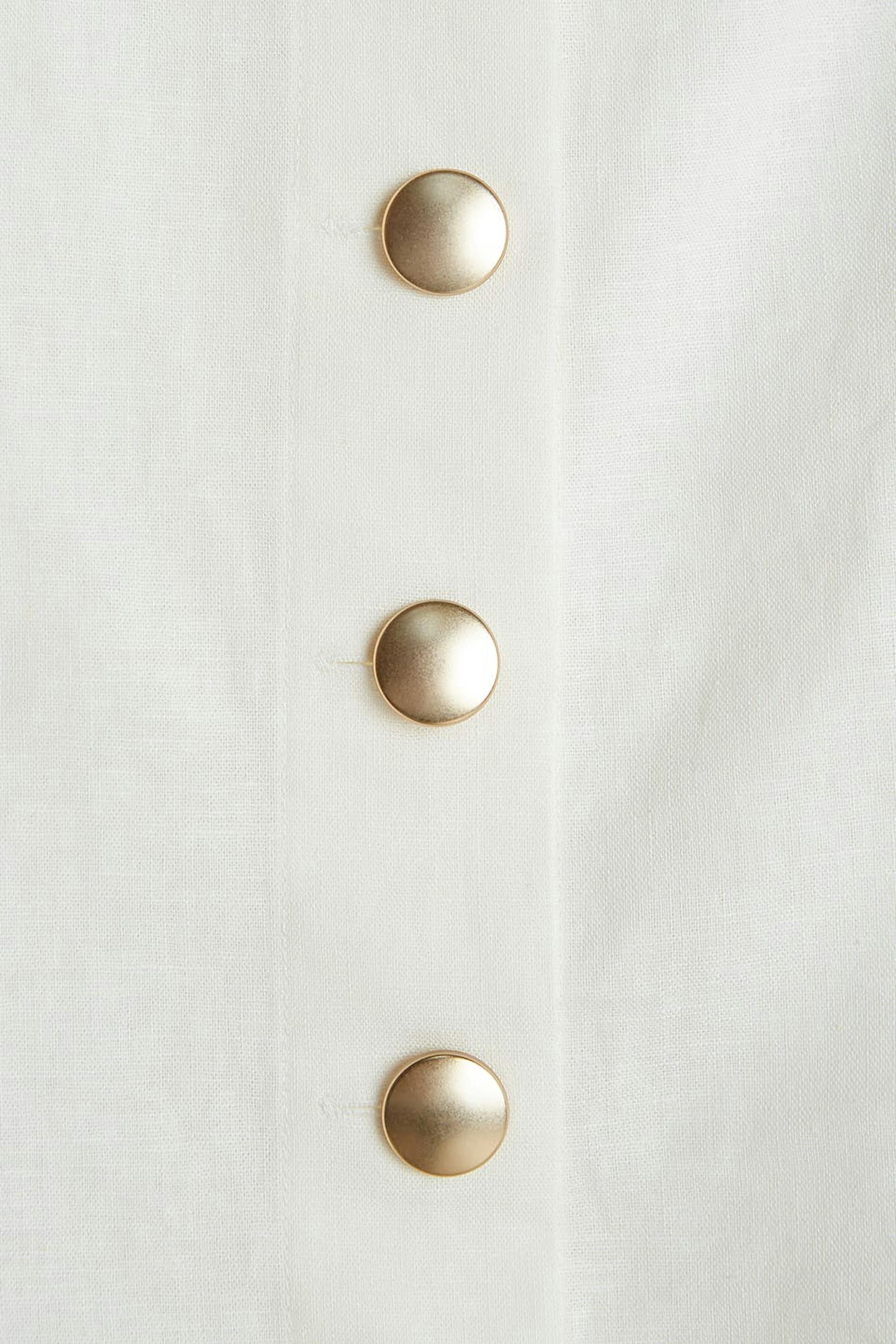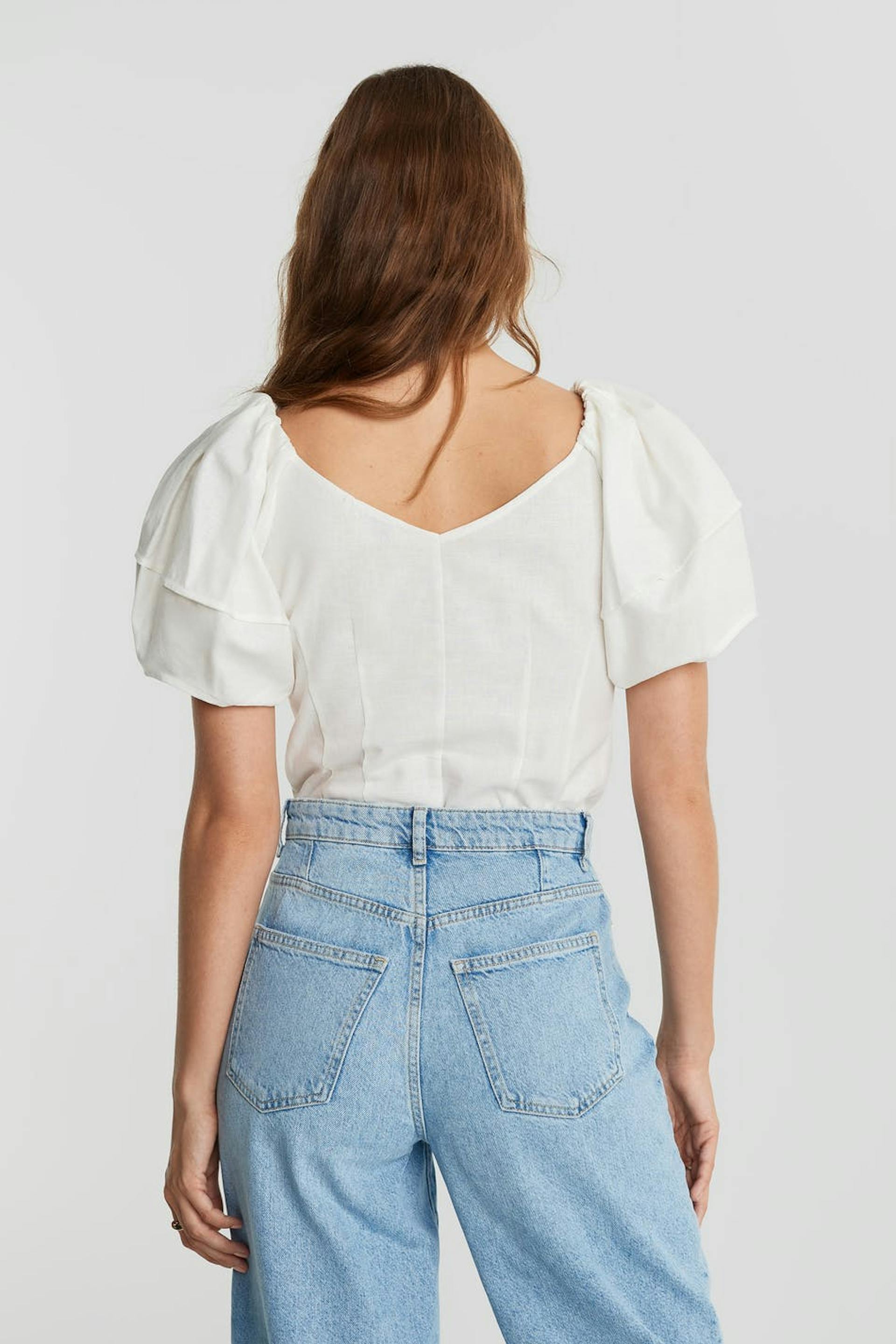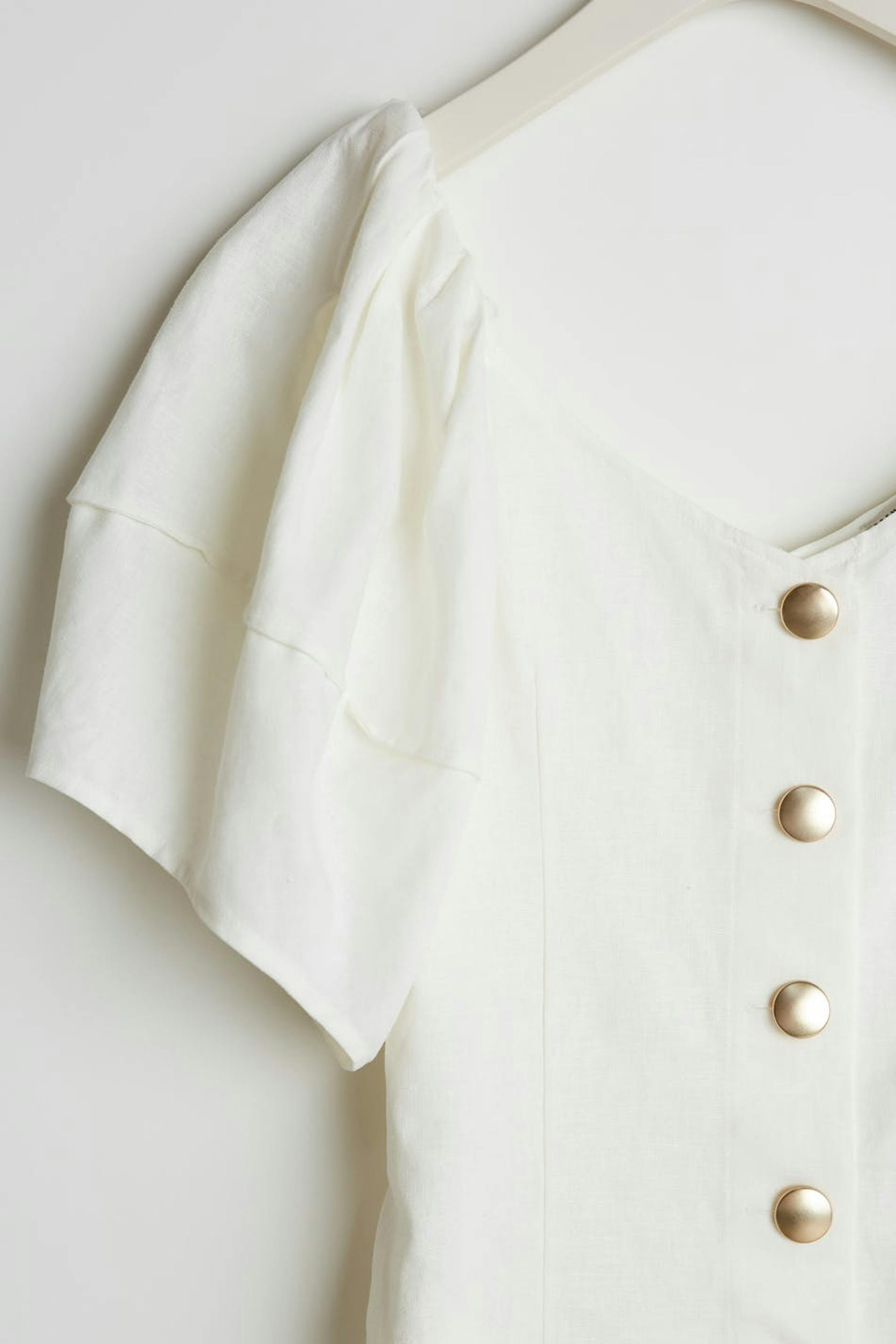 Bluse med korte, store pufærmer med sømdetaljer. Blusen er hvid og har gyldne knapper ved fronten.