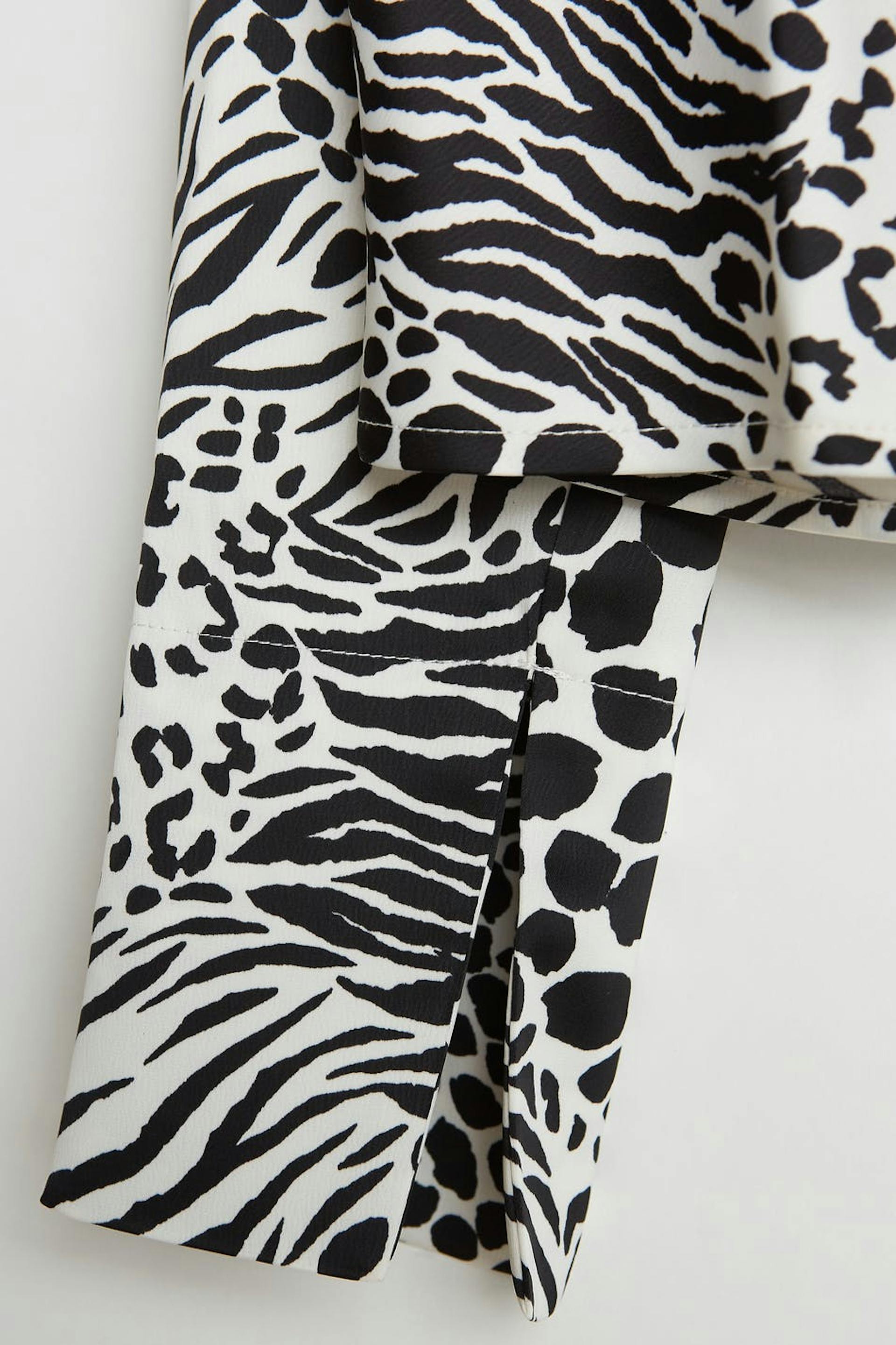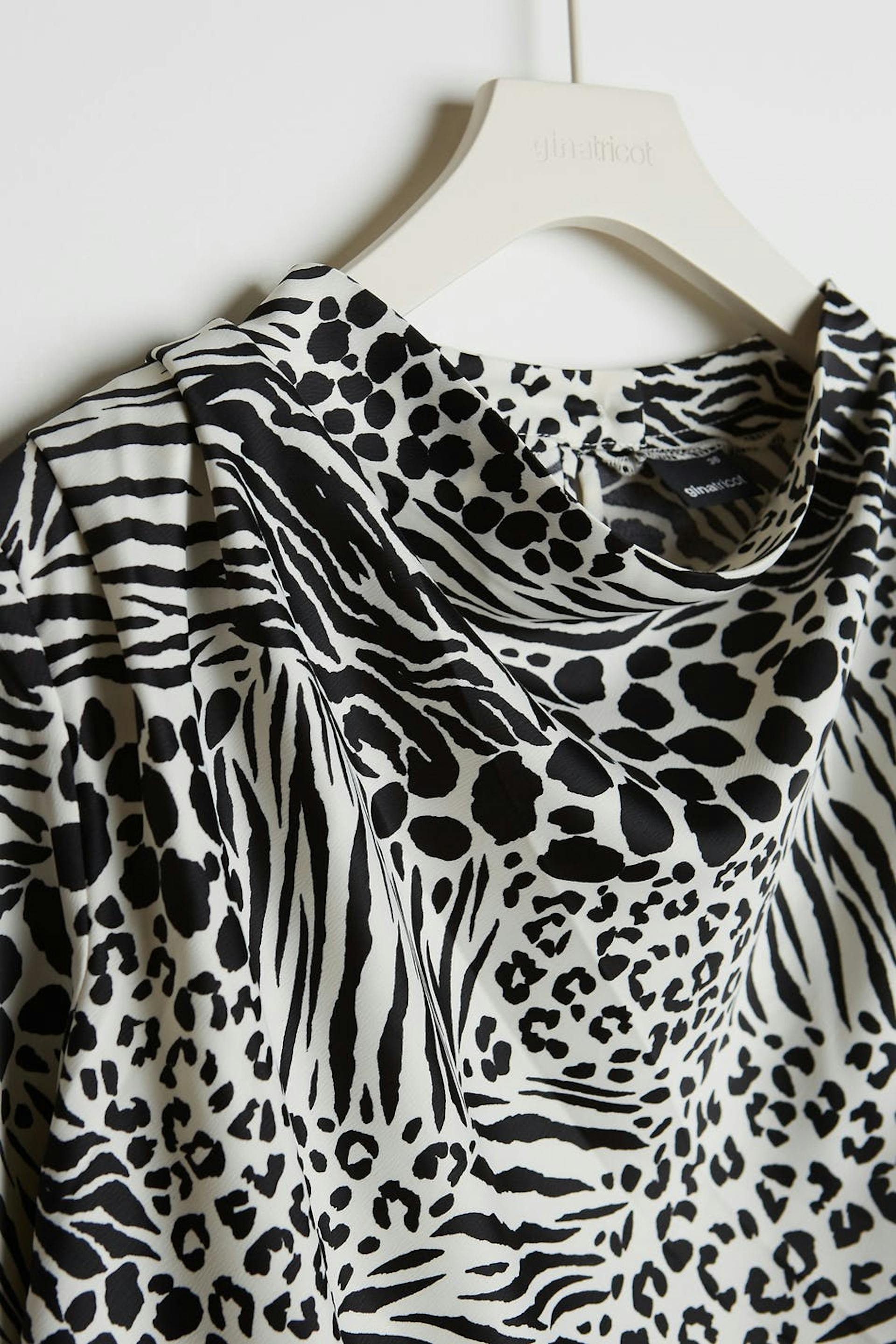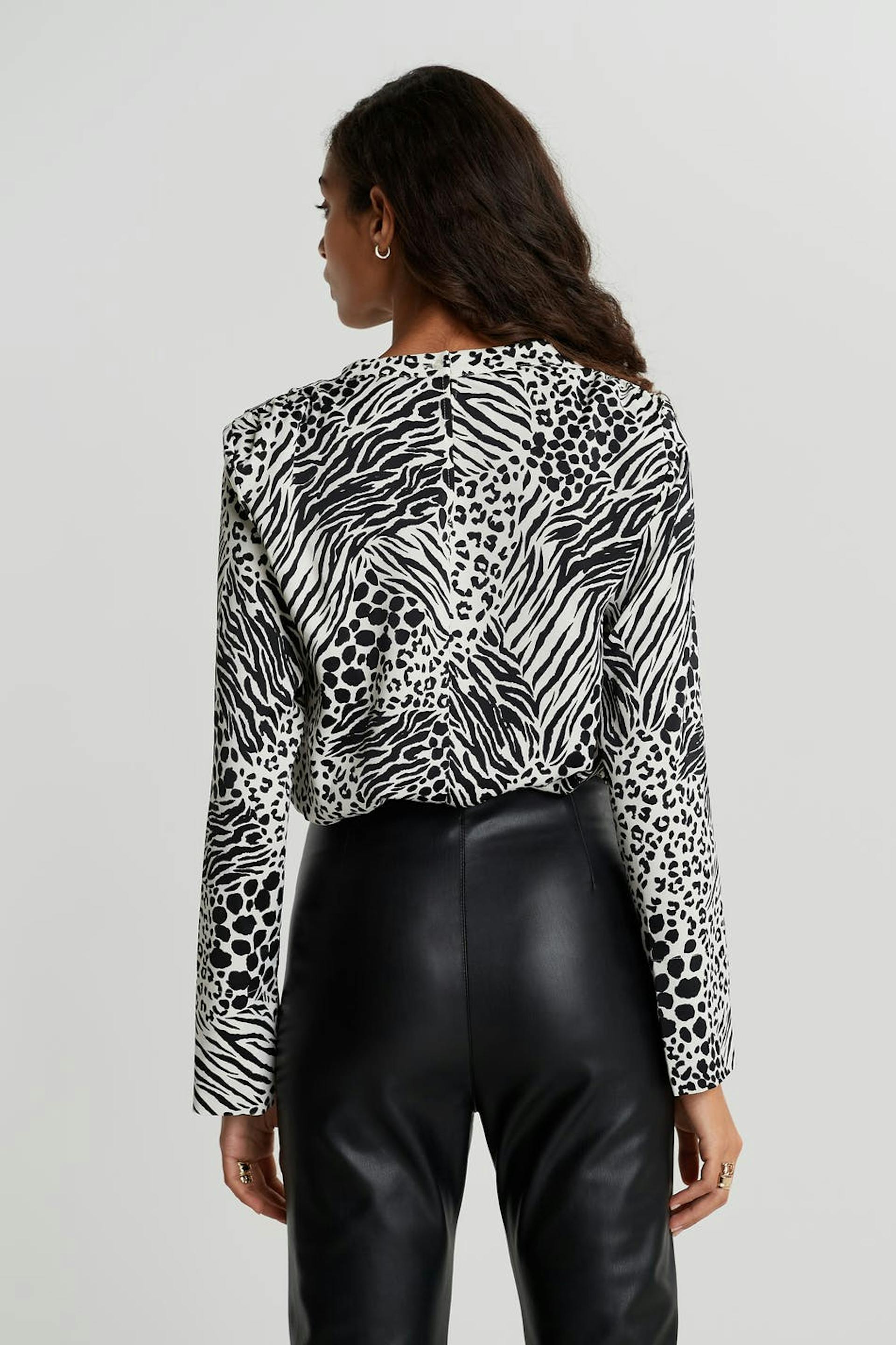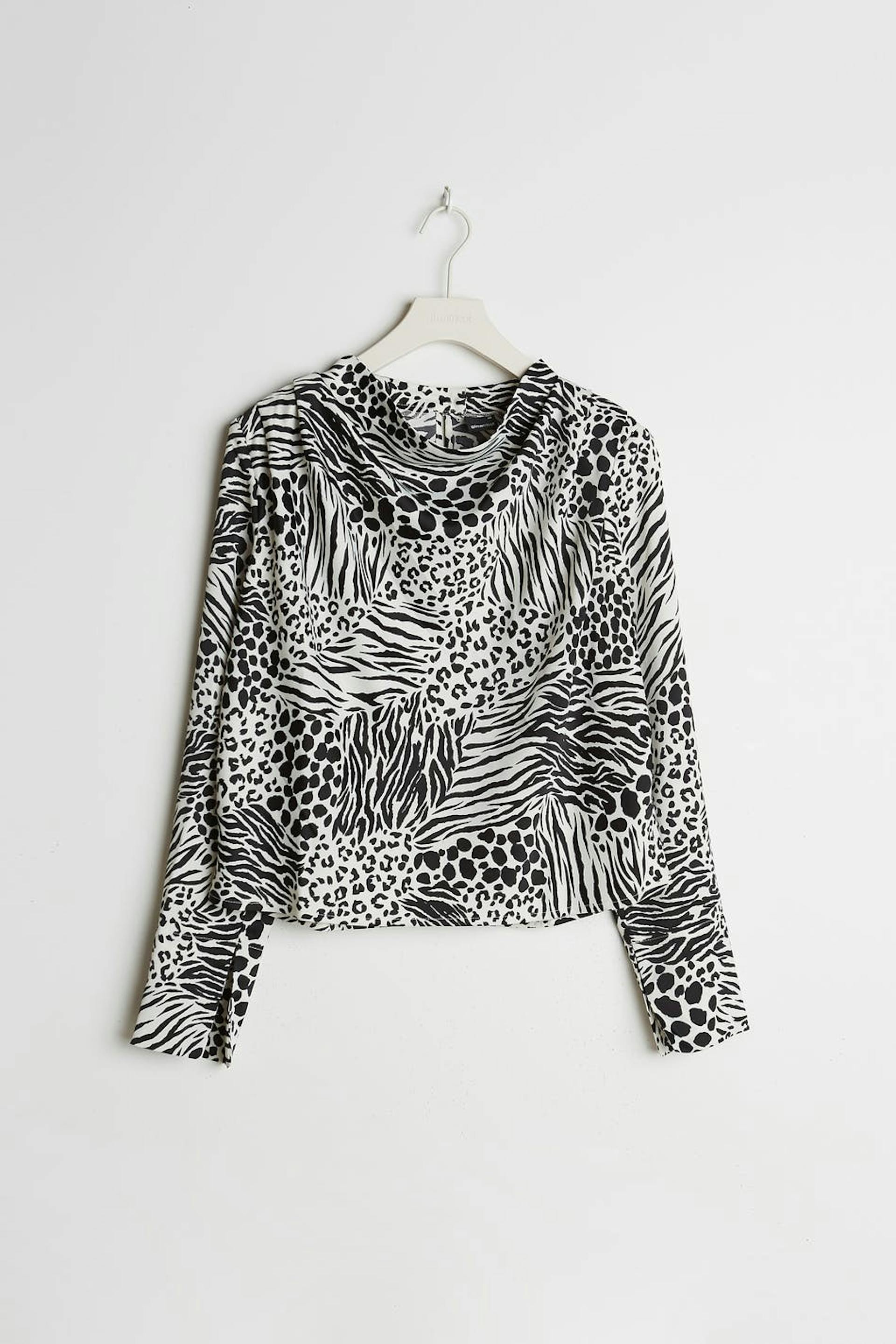 Langærmet bluse med et mønster. Blusen er hvid og sort og har drapering på udskæringen.