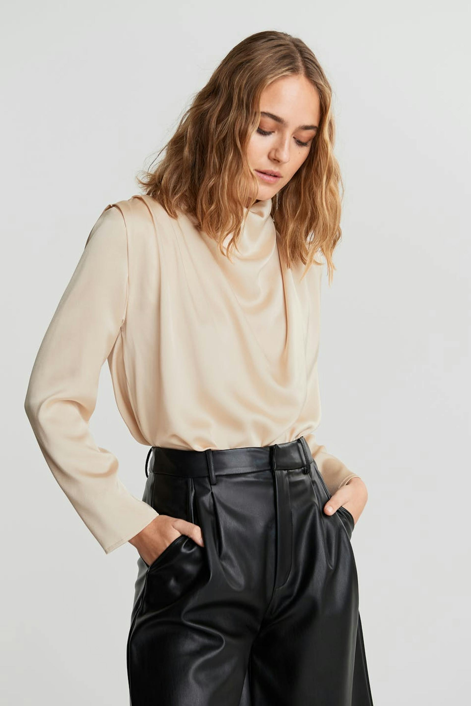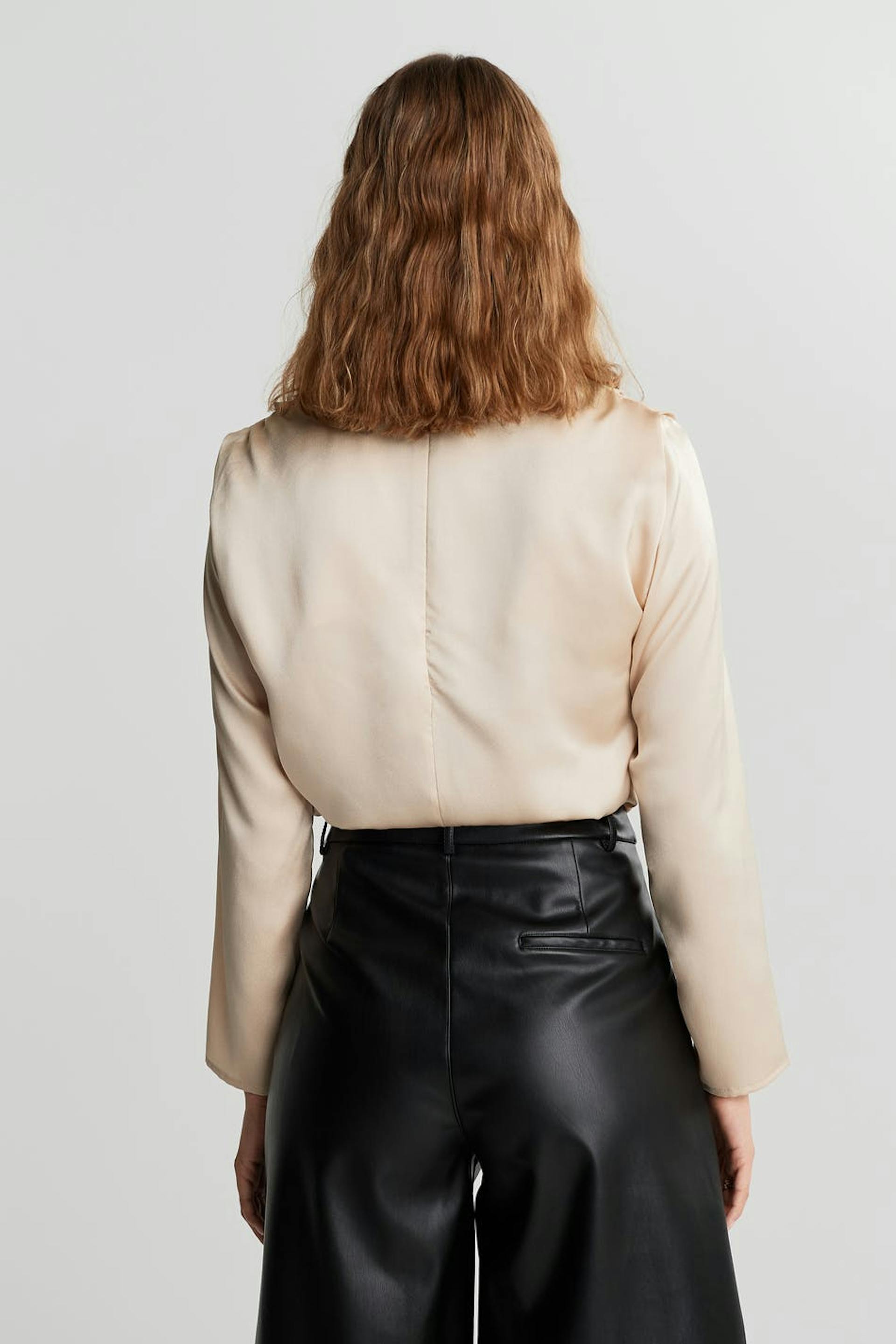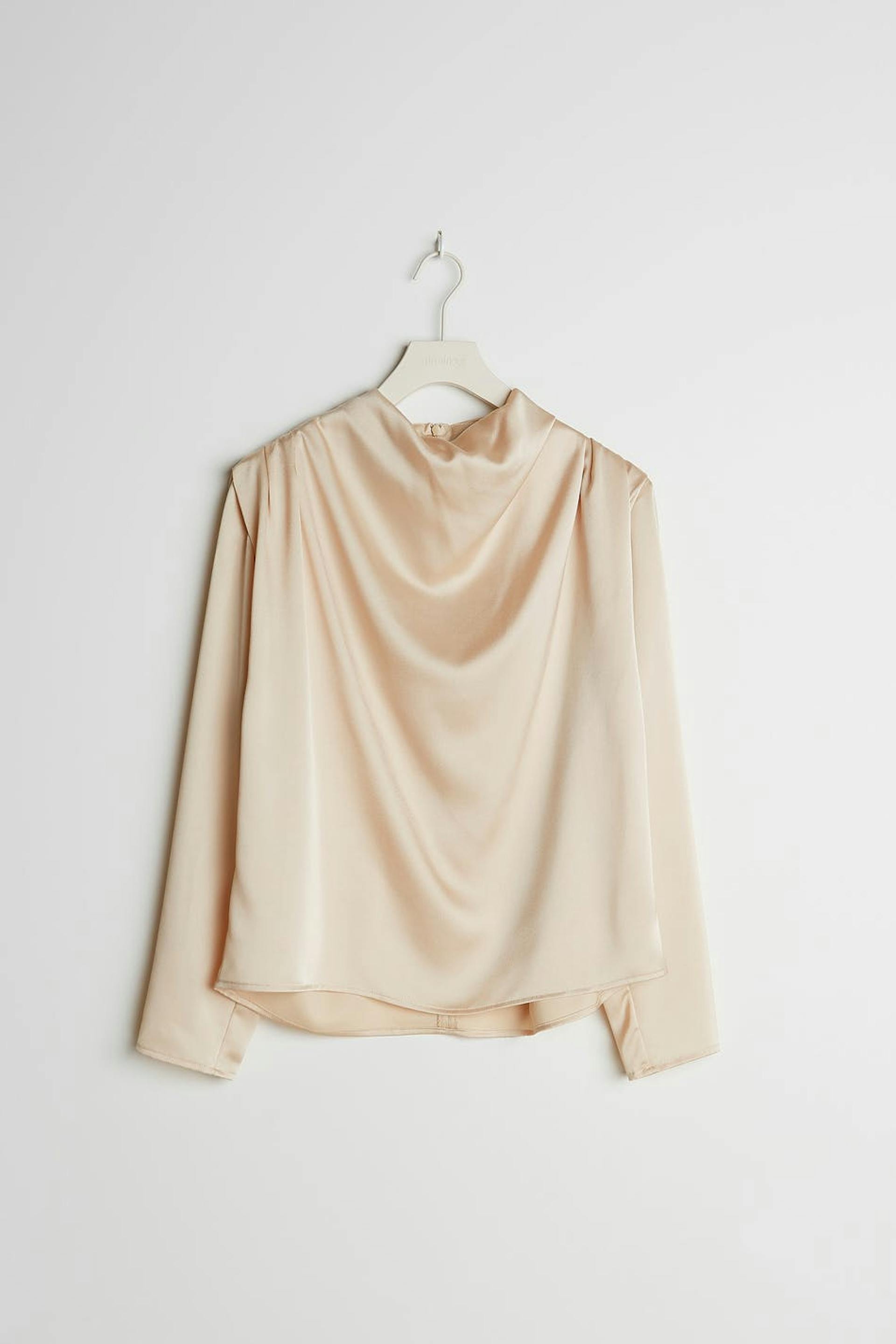 Langærmet bluse med drapering på forsiden. Blusen er beige og har en lynlås i ryggen. Den har et silkelignende materiale.
