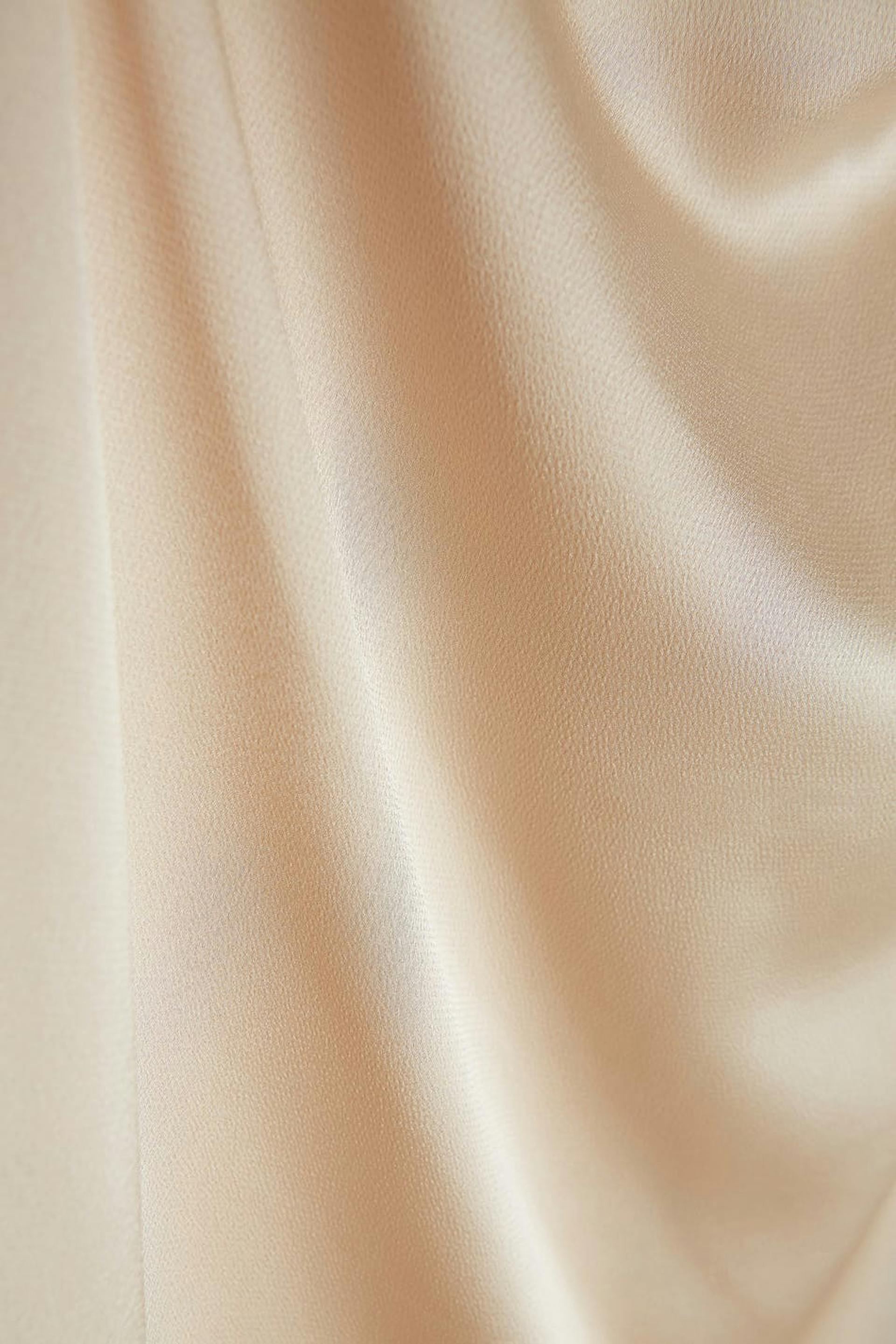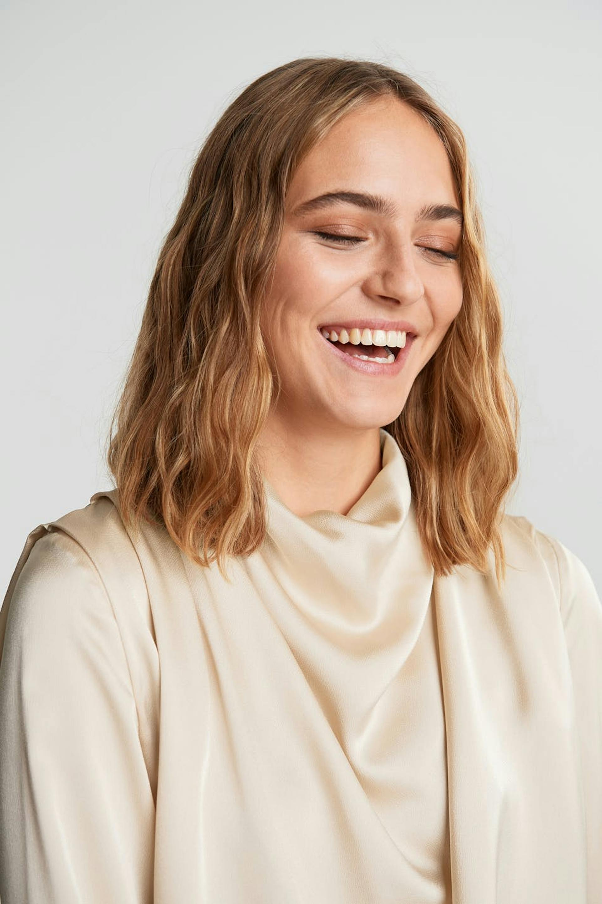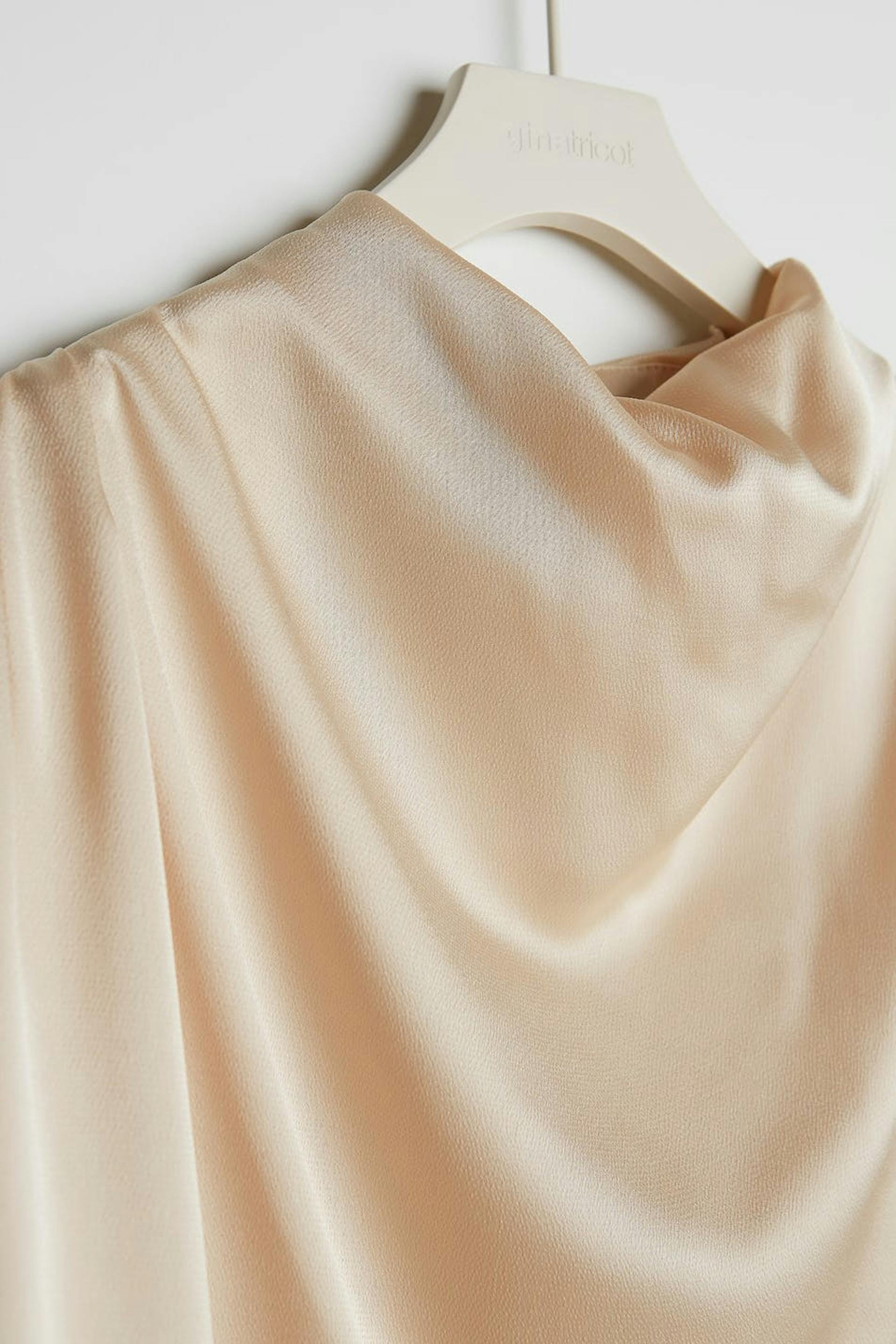 Langærmet bluse med drapering på forsiden. Blusen er beige og har en lynlås i ryggen. Den har et silkelignende materiale.