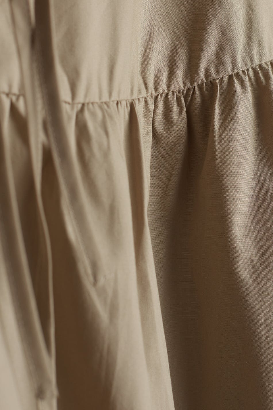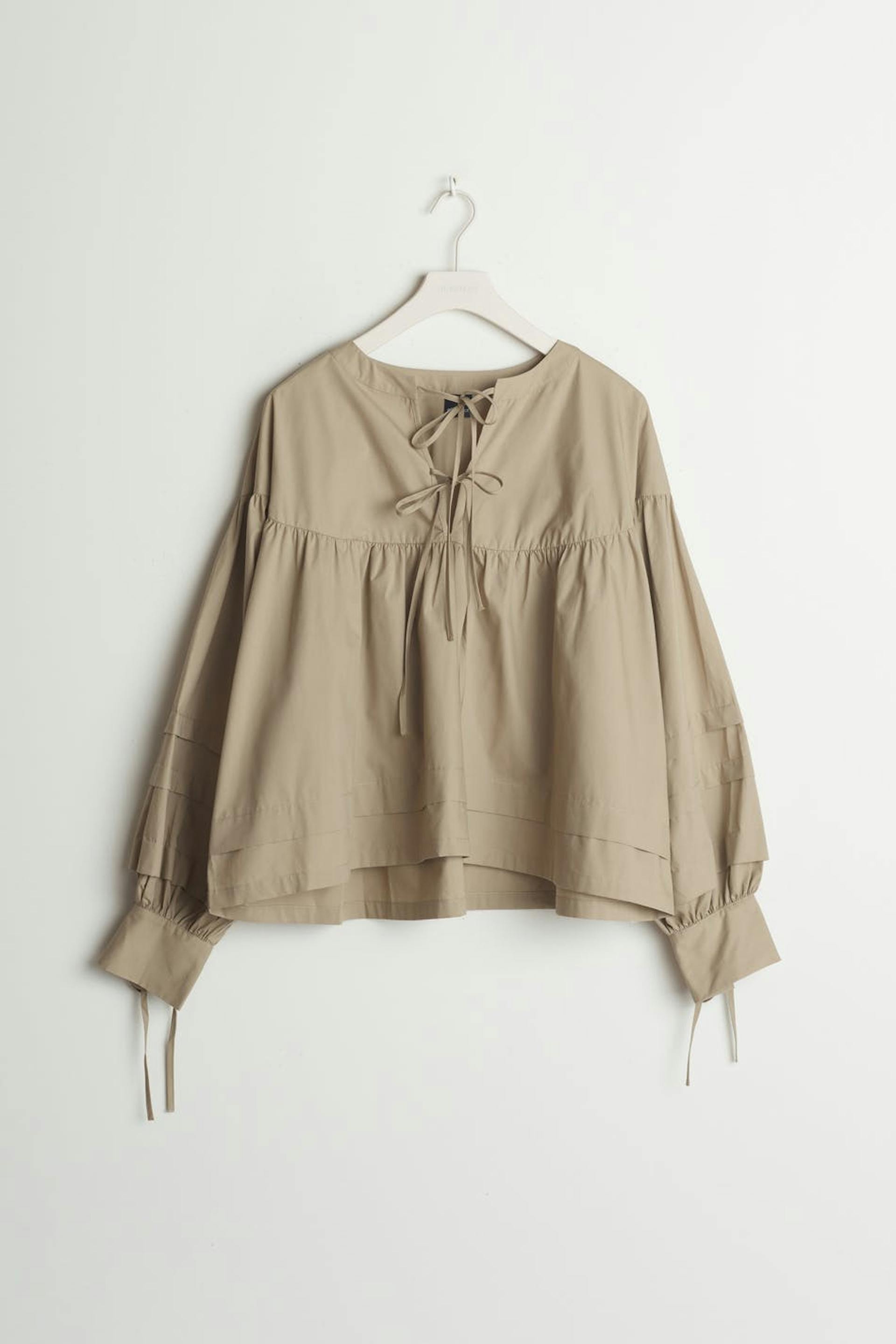 Voluminøs bluse med lange pufærmer. Blusen er beige og har snøringer på udskæringen og på ærmeafslutningerne.