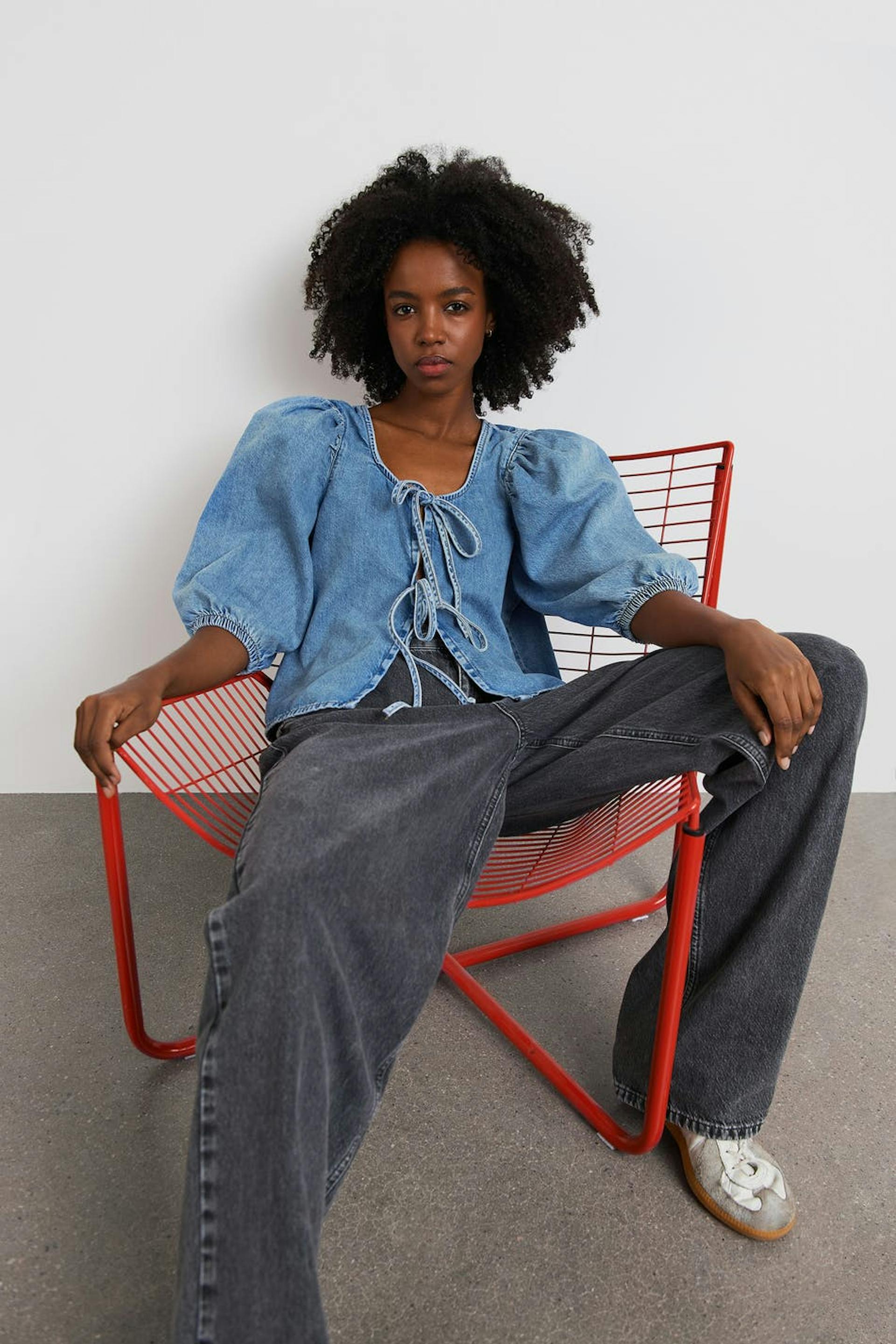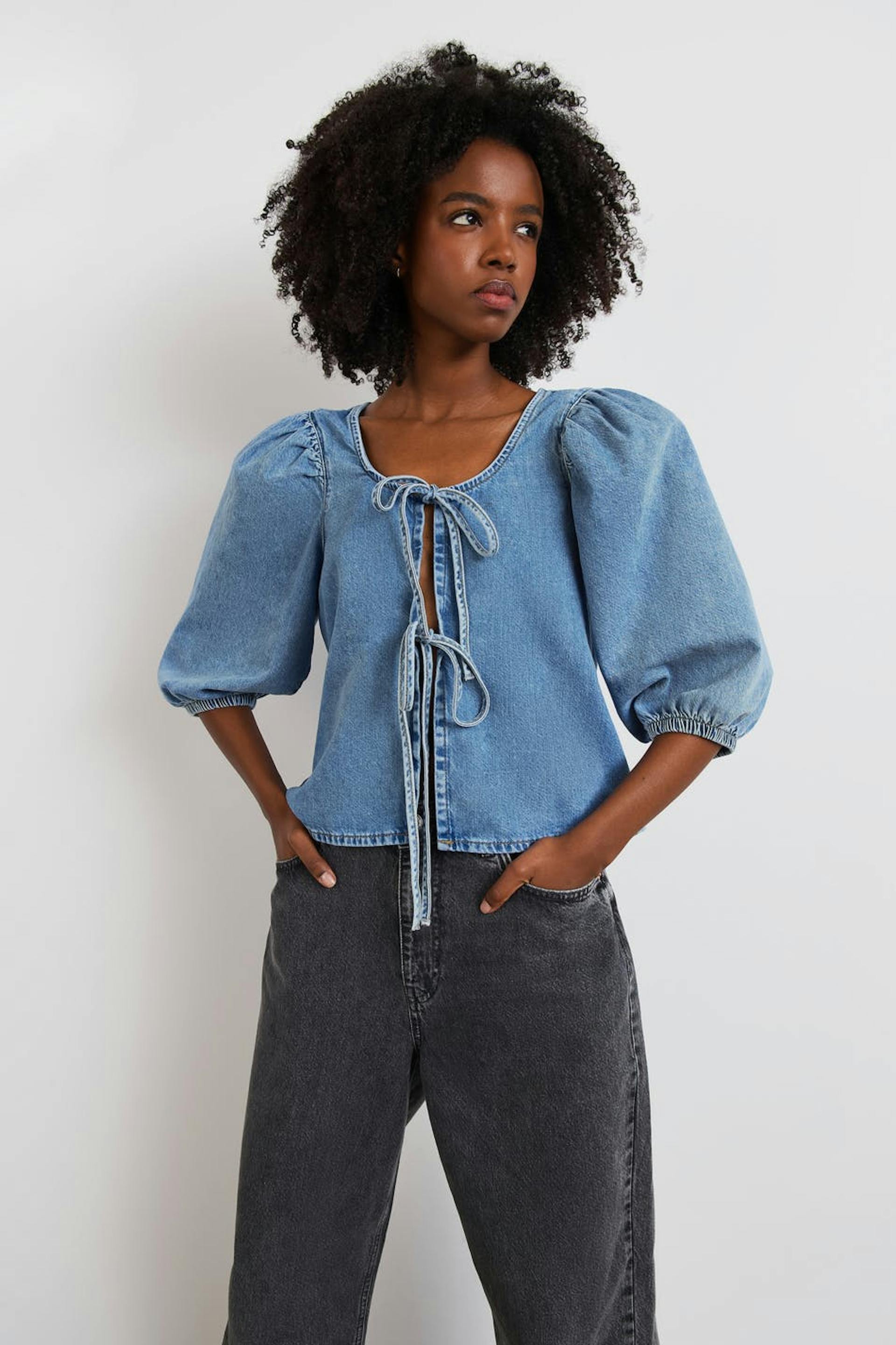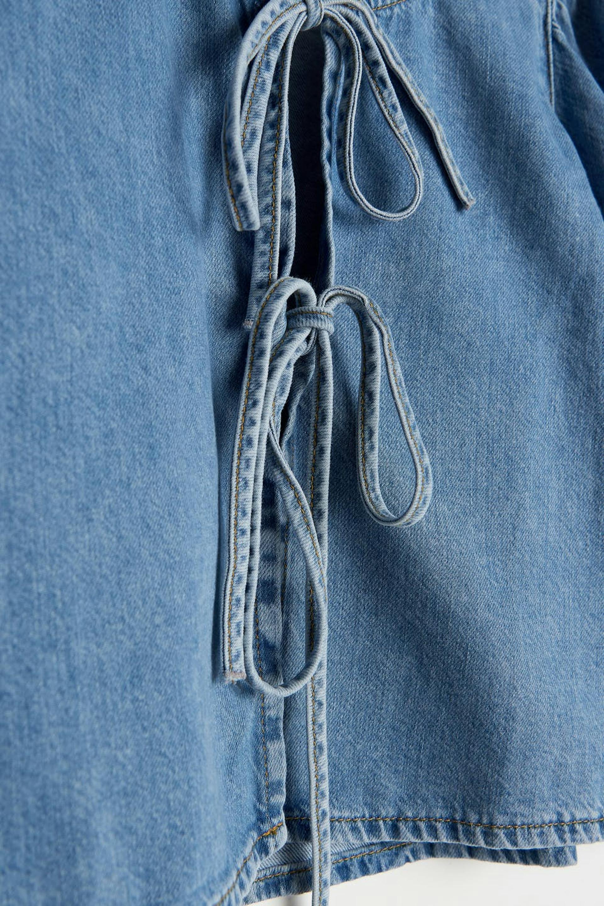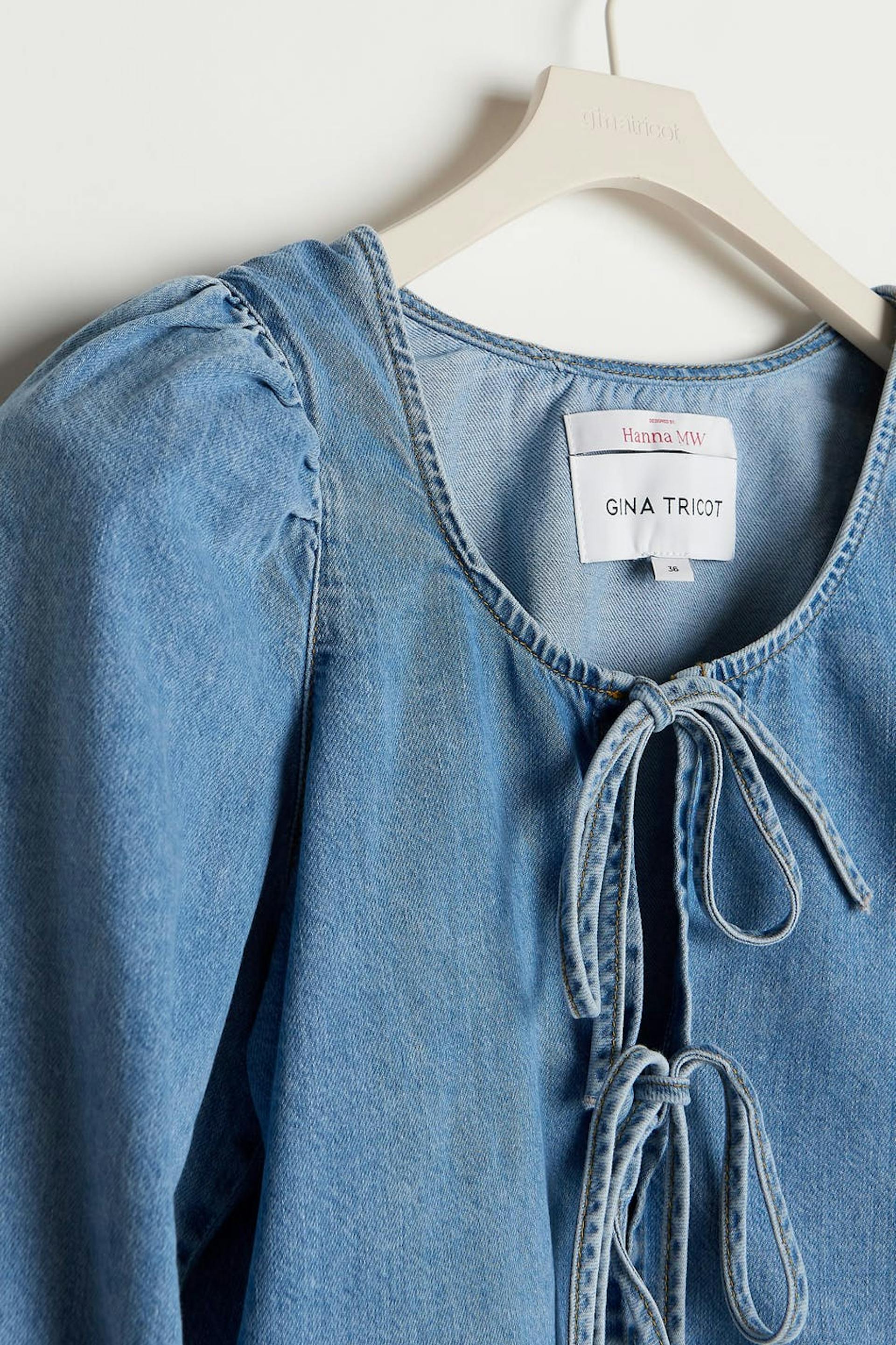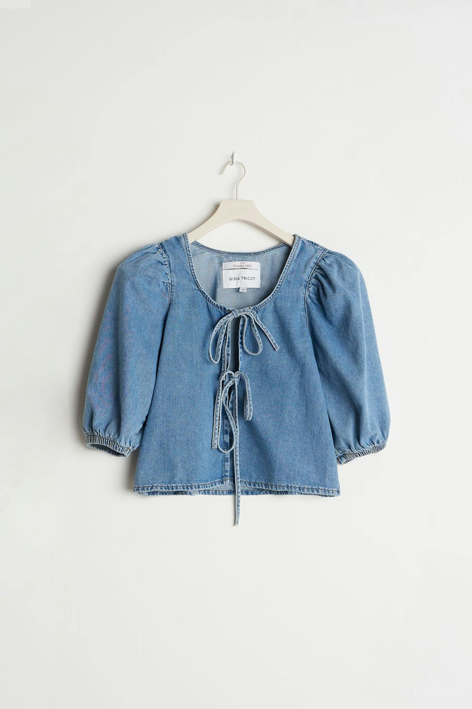 Hanna MW X Gina Tricot. Cowboyskjorte med en normal pasform. Blusen er blå og har knudedetaljer ved fronten. Den har halvlange pufærmer, en afrundet udskæring, elastisk bånd på ærmeafslutningerne og et blødt materiale i denim uden stræk. .