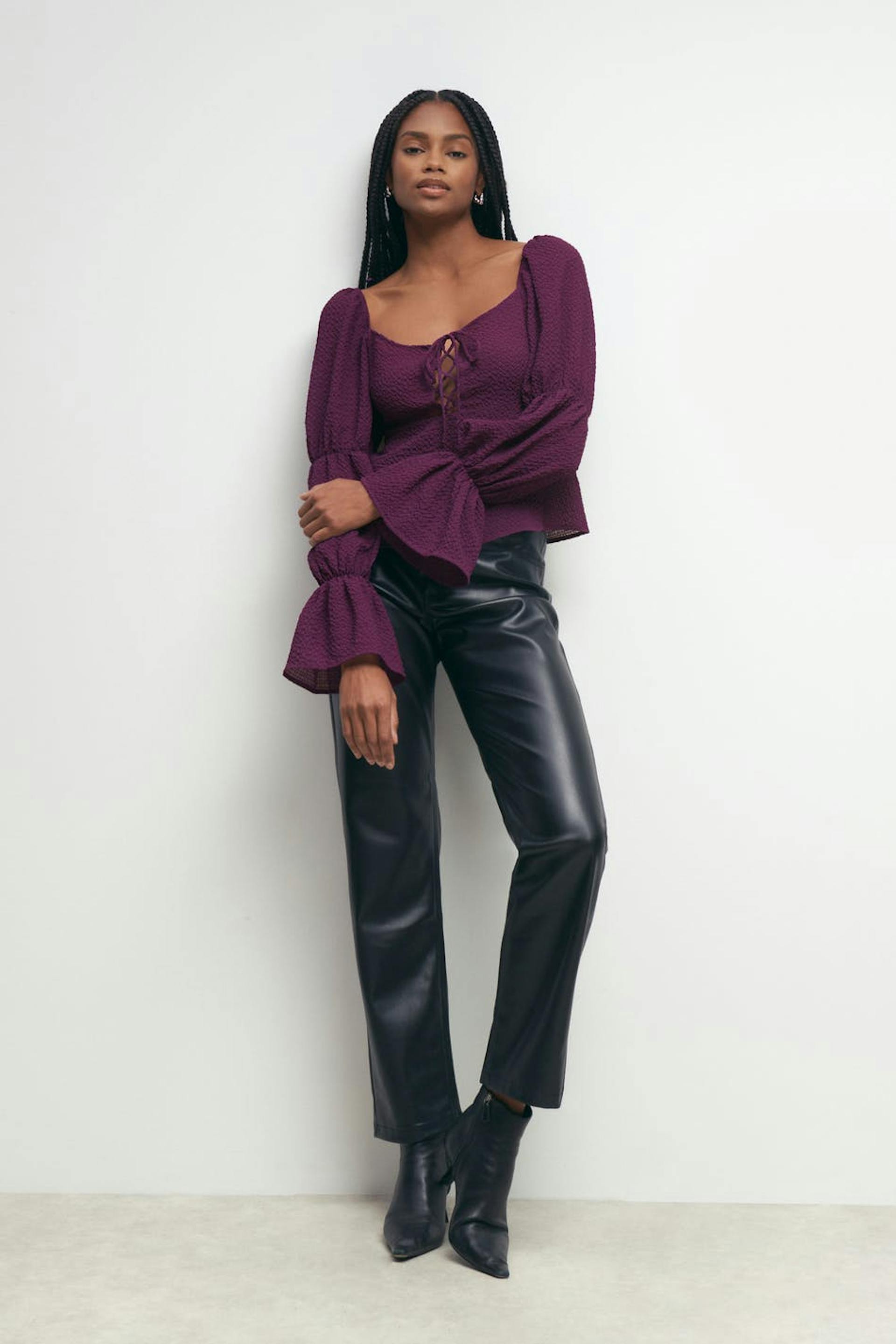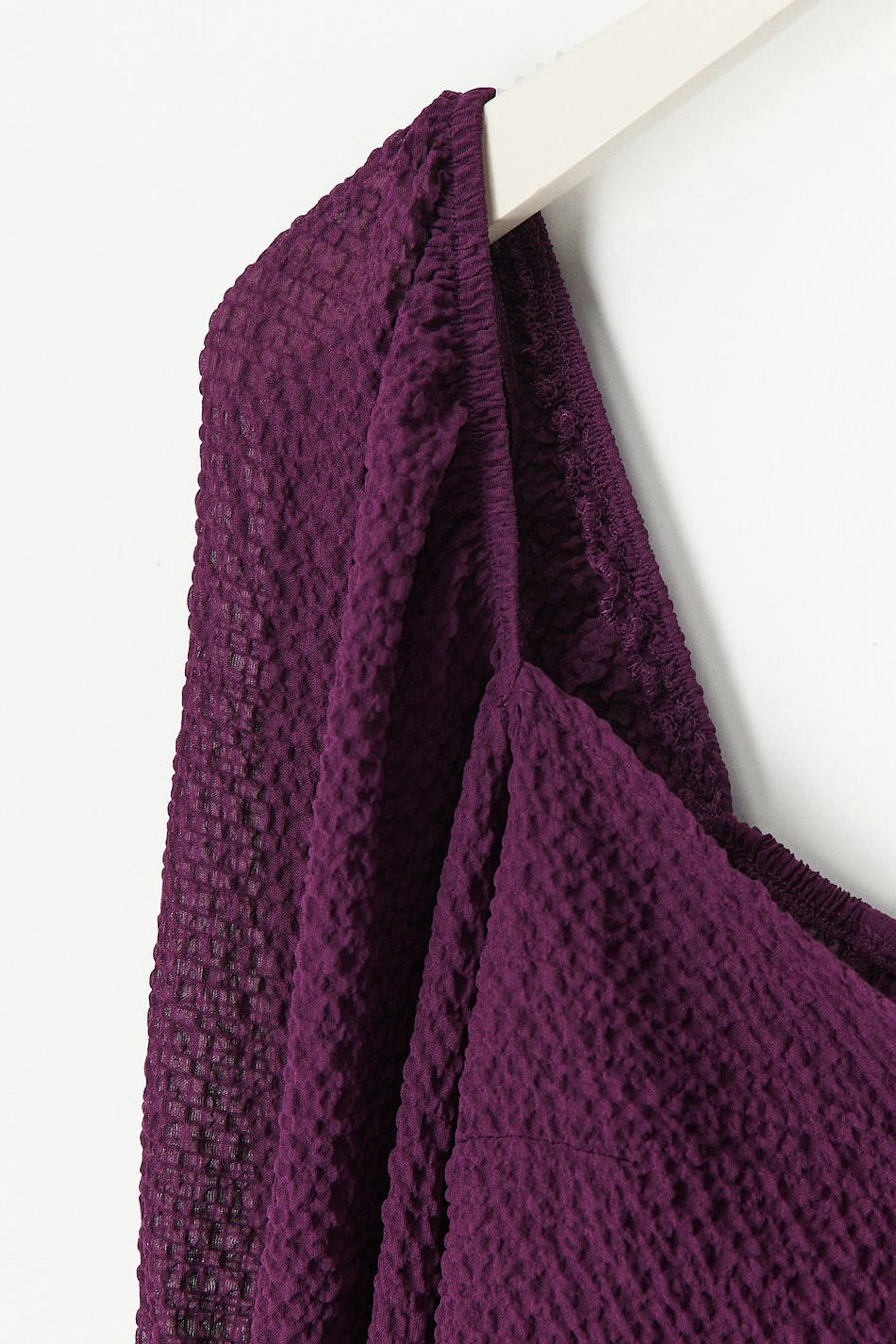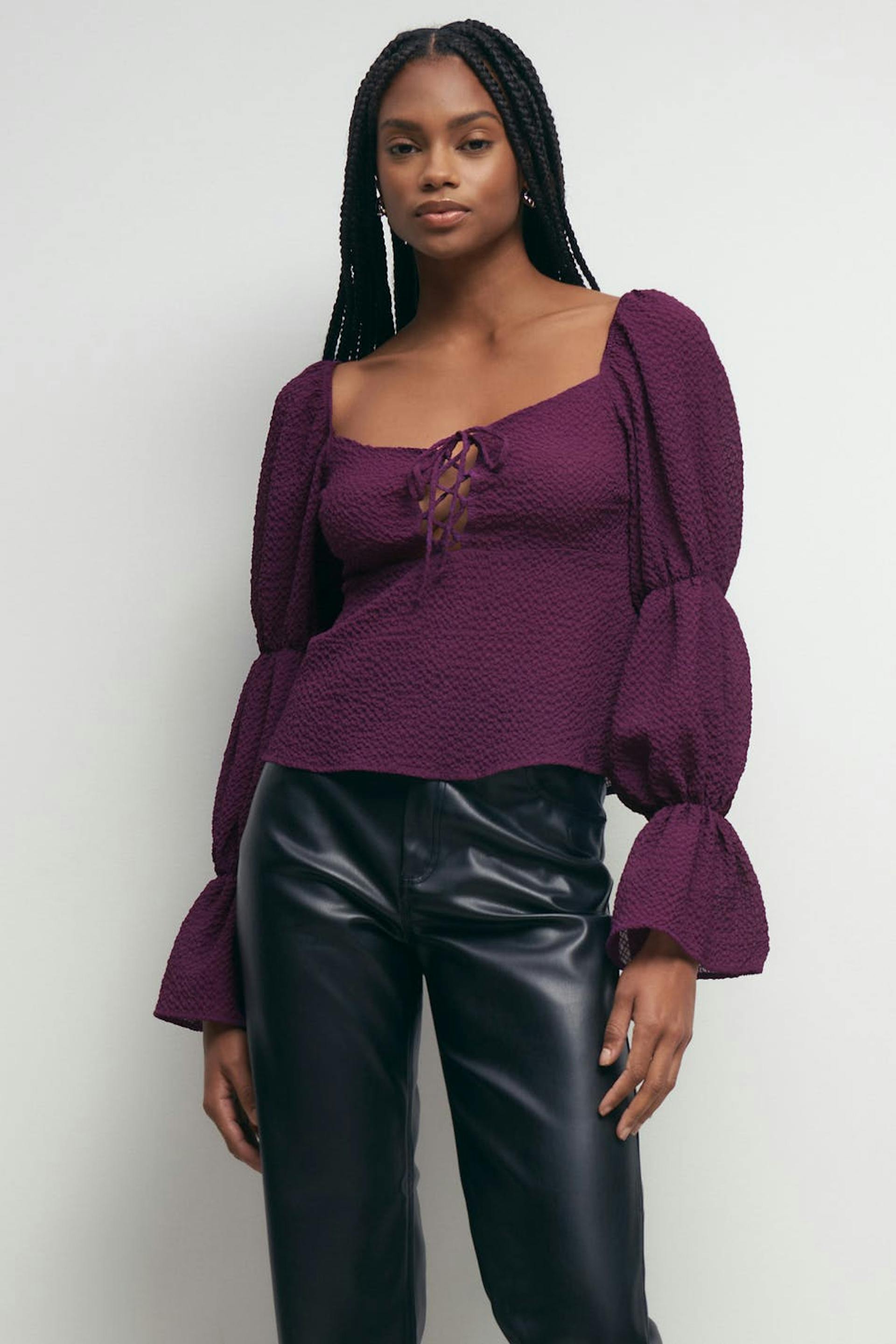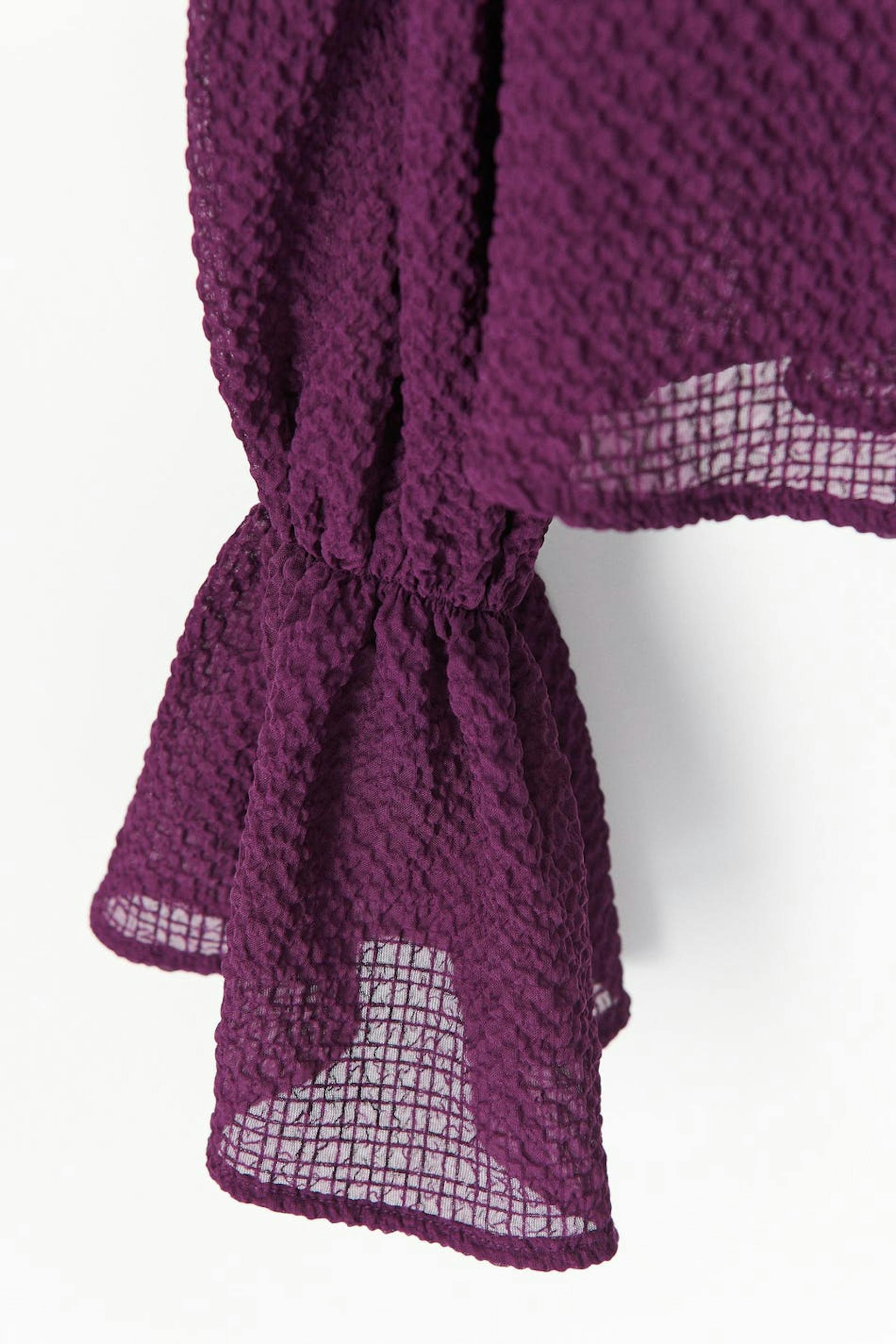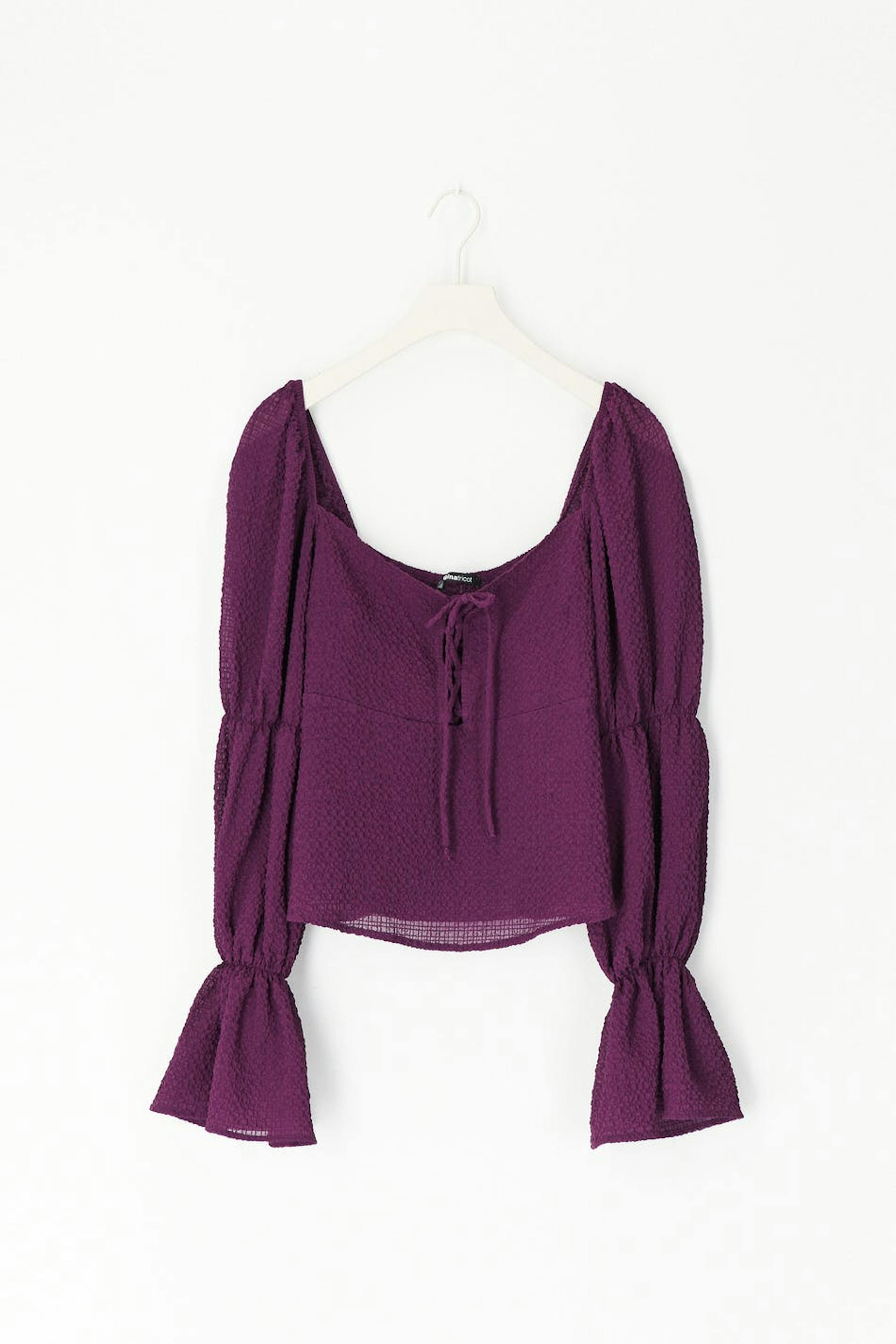 Langærmet bluse med voluminøse pufærmer. Blusen er lilla og har en tekstureret kvalitet. Den har knudedetalje ved brystet, smock bagpå og elastik på ærmerne og omkring skuldrene.