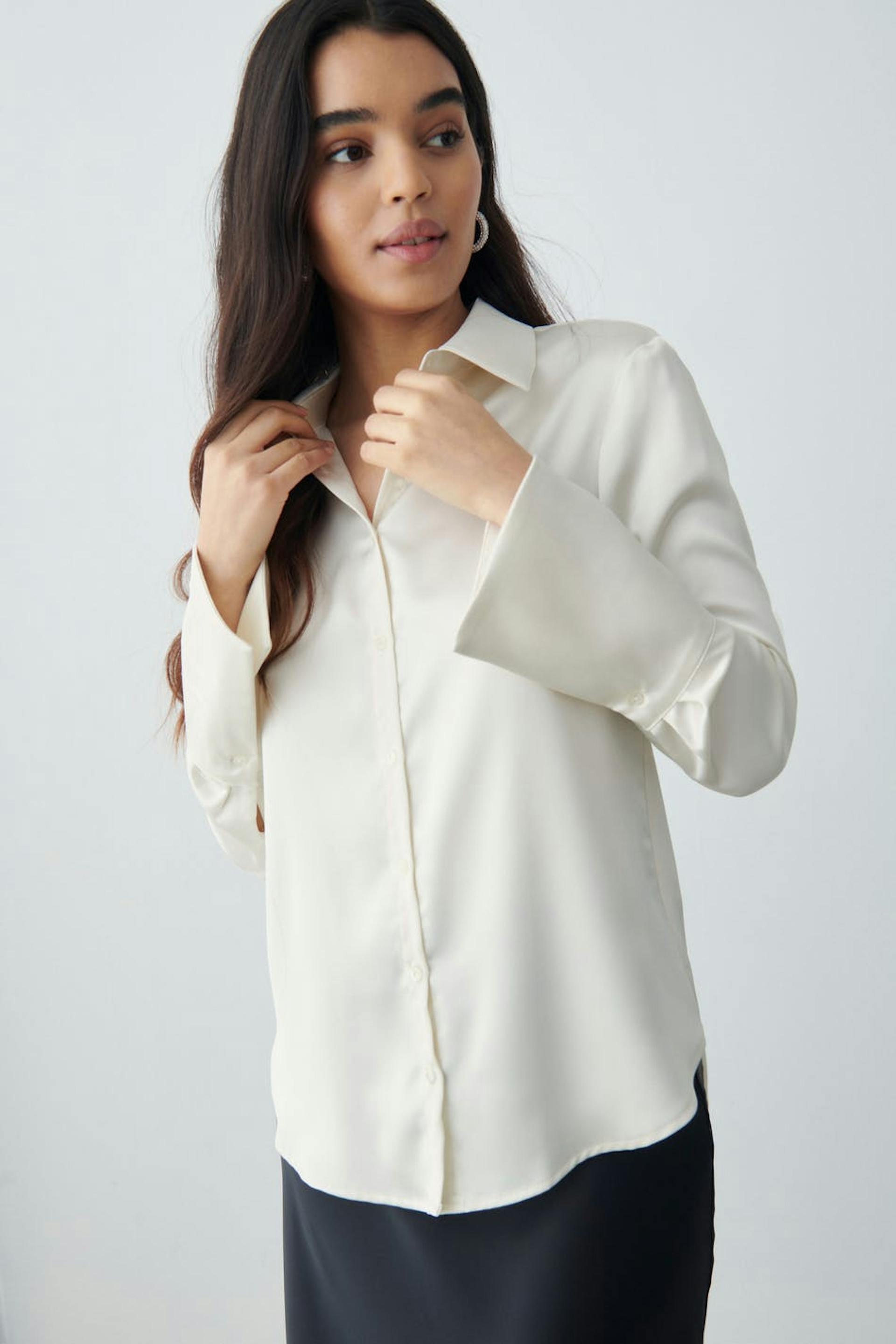 Oversized satinskjorte med brede manchetter. Skjorten er hvid og har knapstolpe foran.