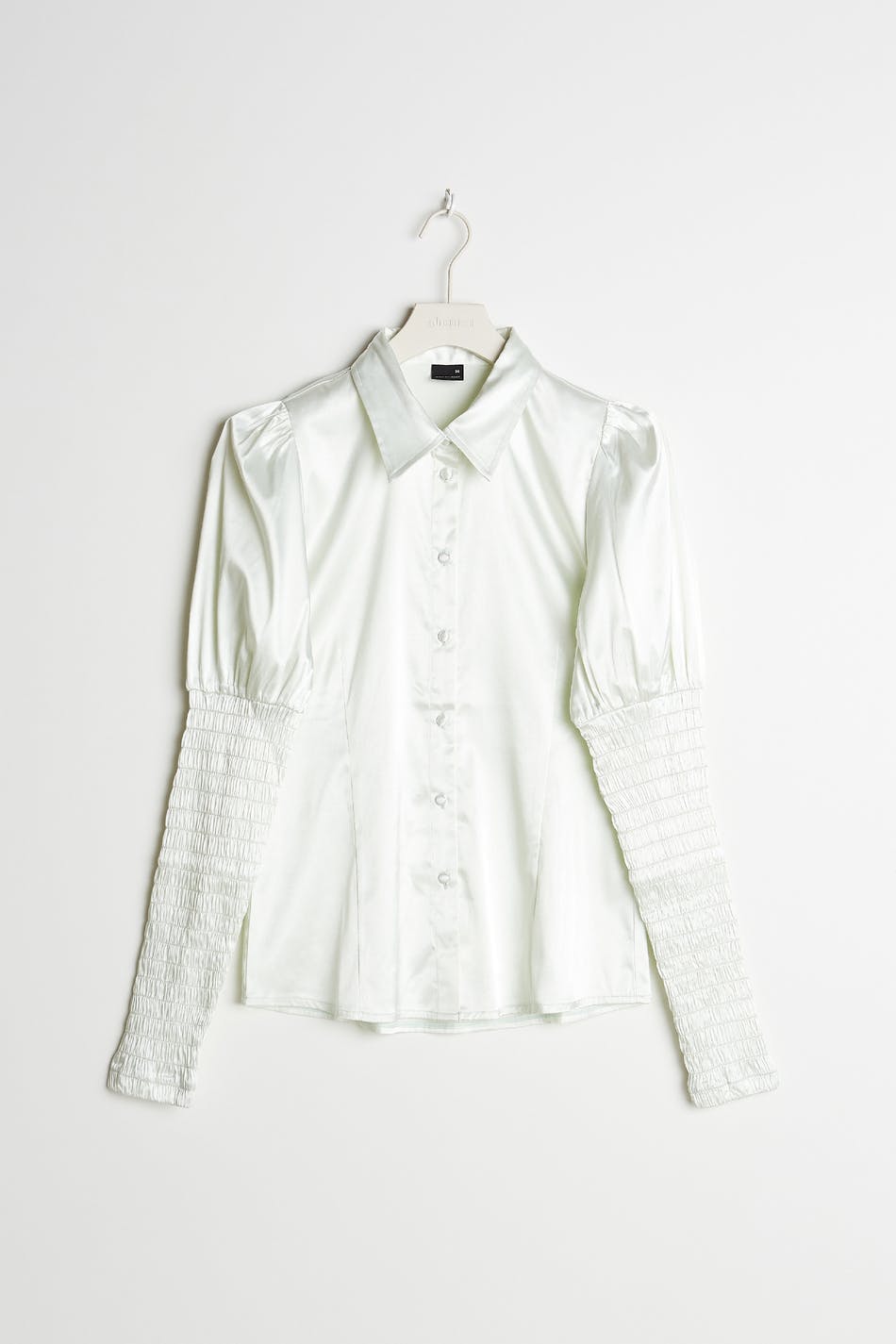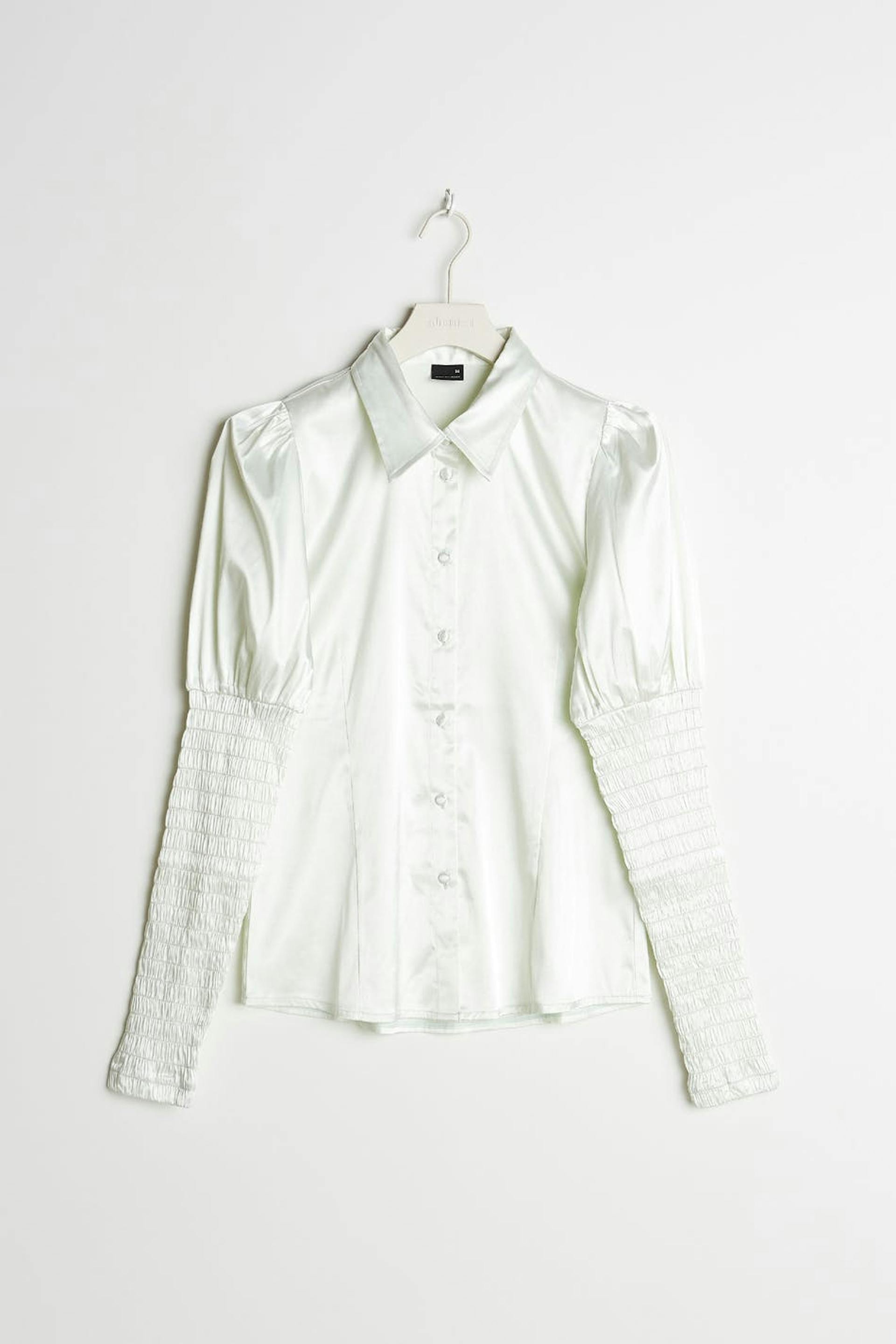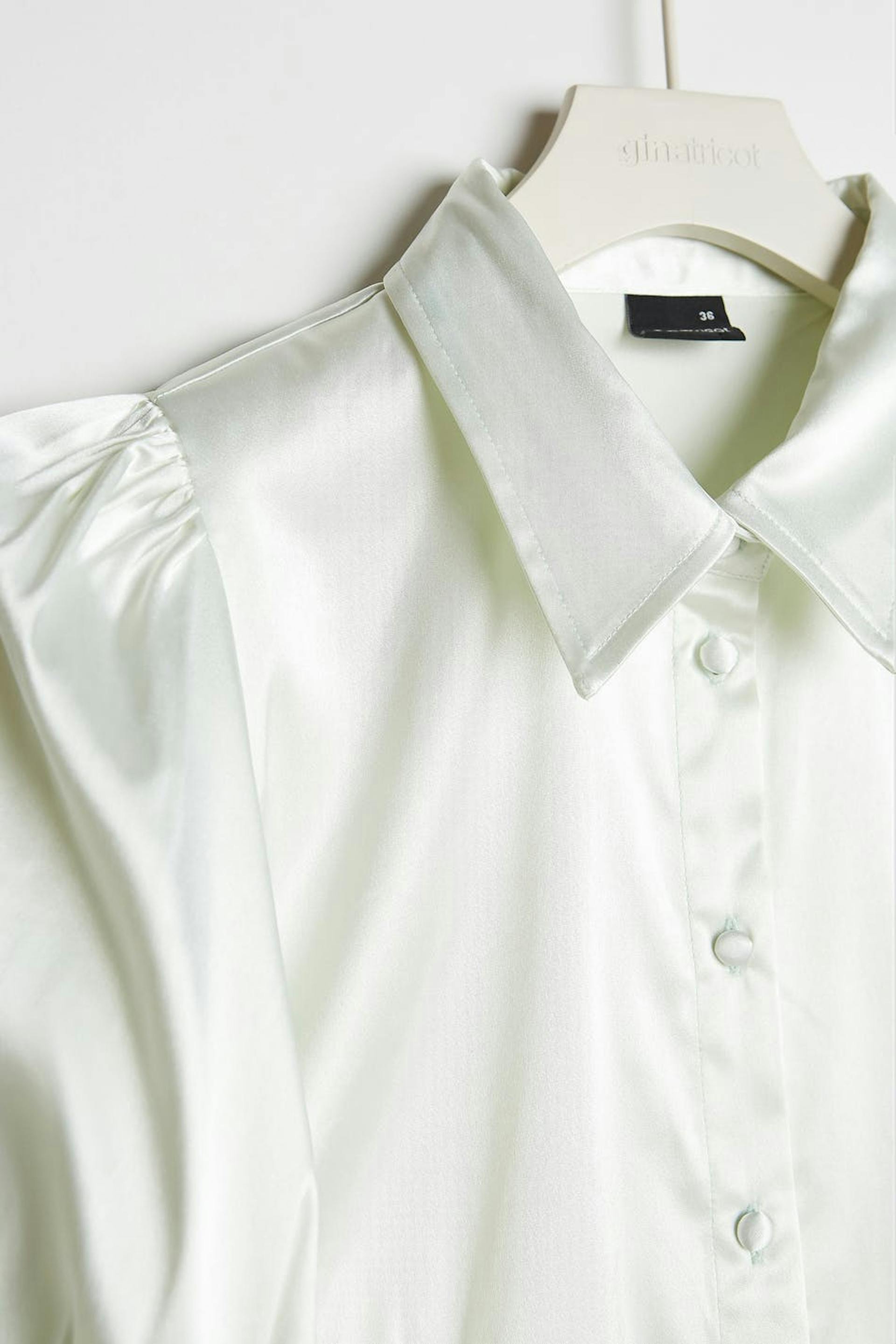 Skjorte med en tætsiddende pasform. Skjorten er lysegrøn og har lange pufærmer med smock på ærmet. Den er fremstillet af satin og har stofbetrukkede knapper ved fronten.