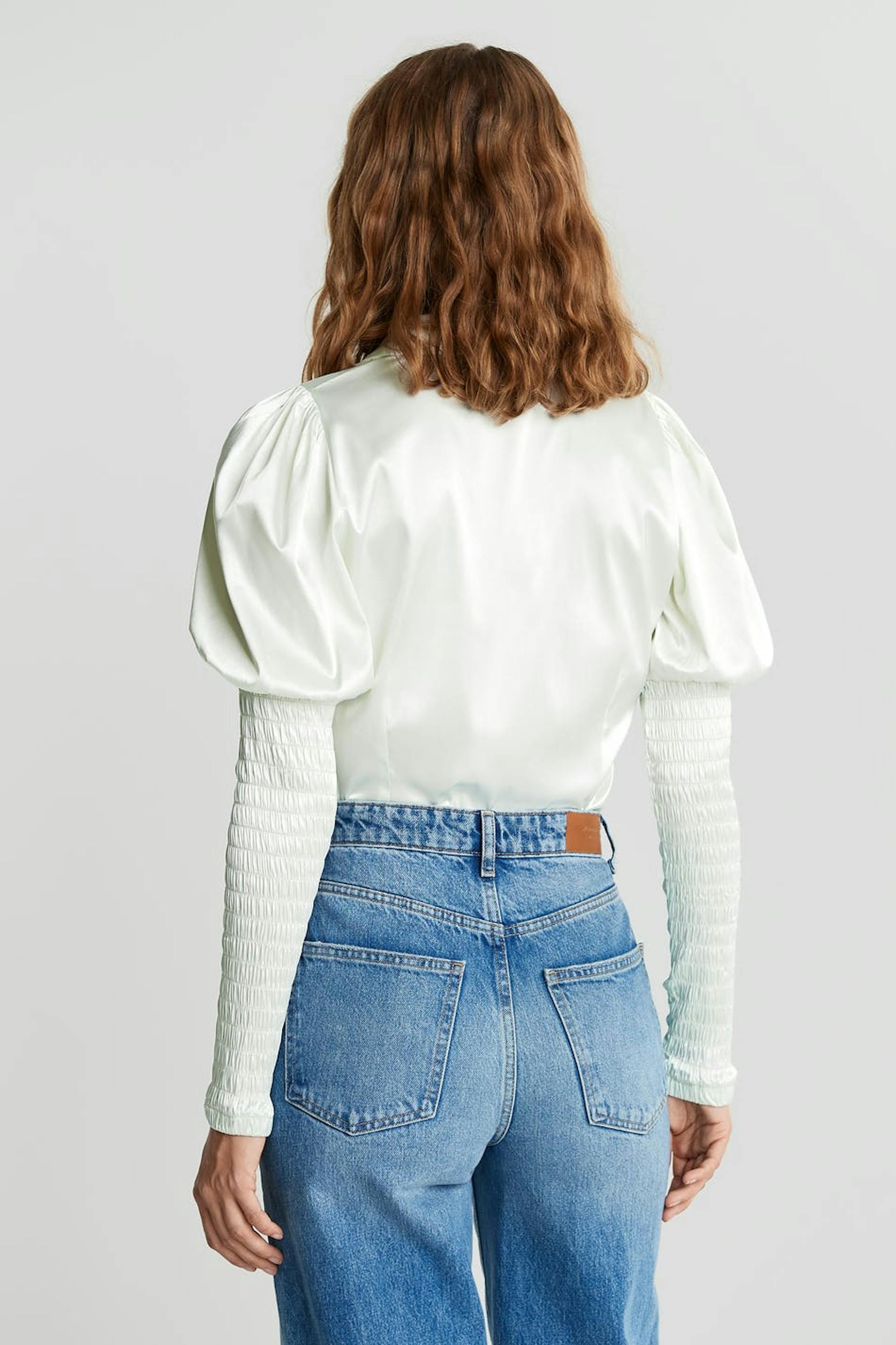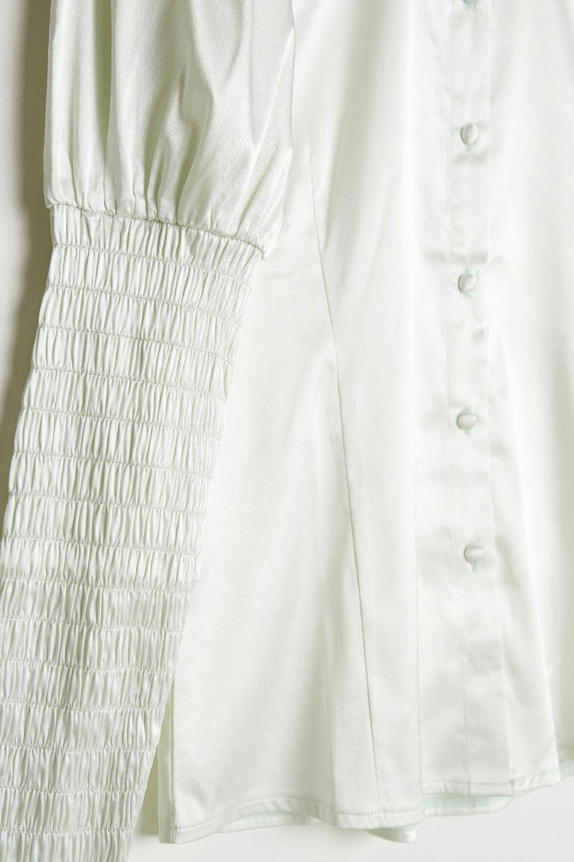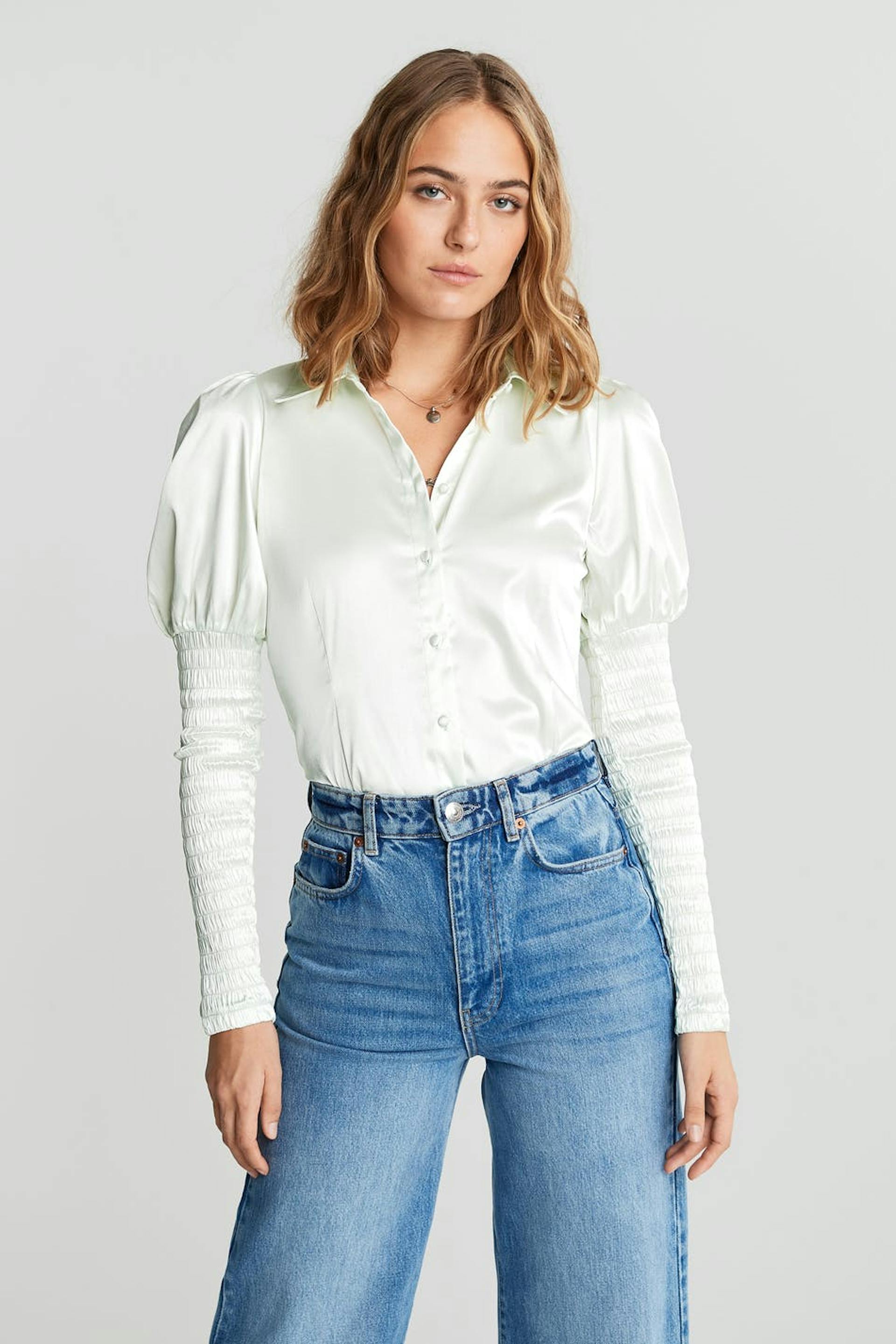 Skjorte med en tætsiddende pasform. Skjorten er lysegrøn og har lange pufærmer med smock på ærmet. Den er fremstillet af satin og har stofbetrukkede knapper ved fronten.