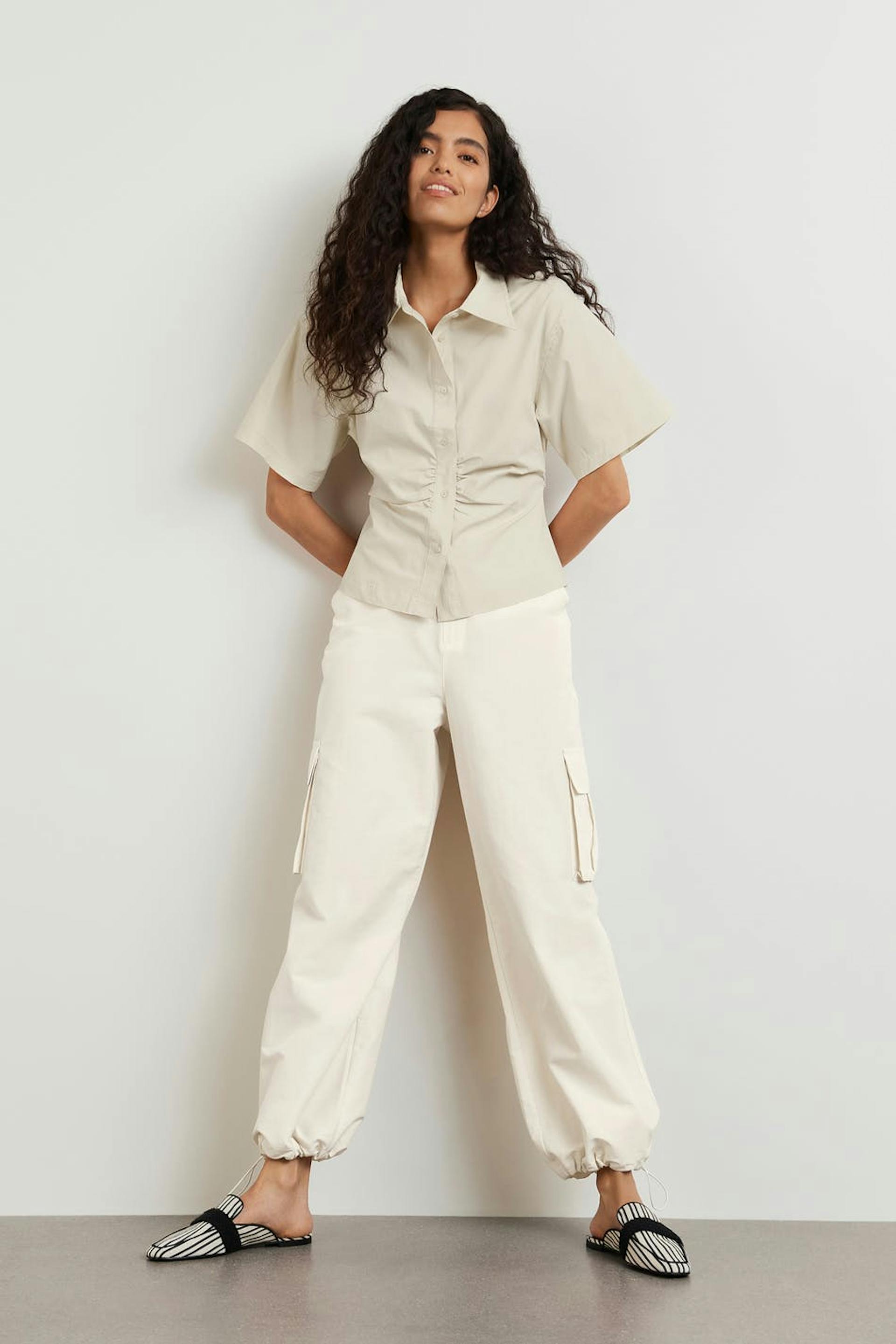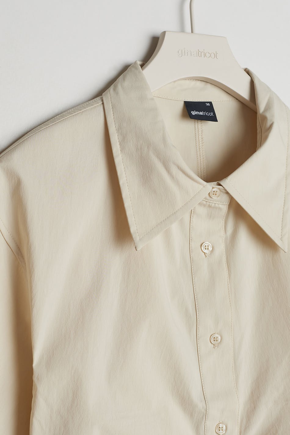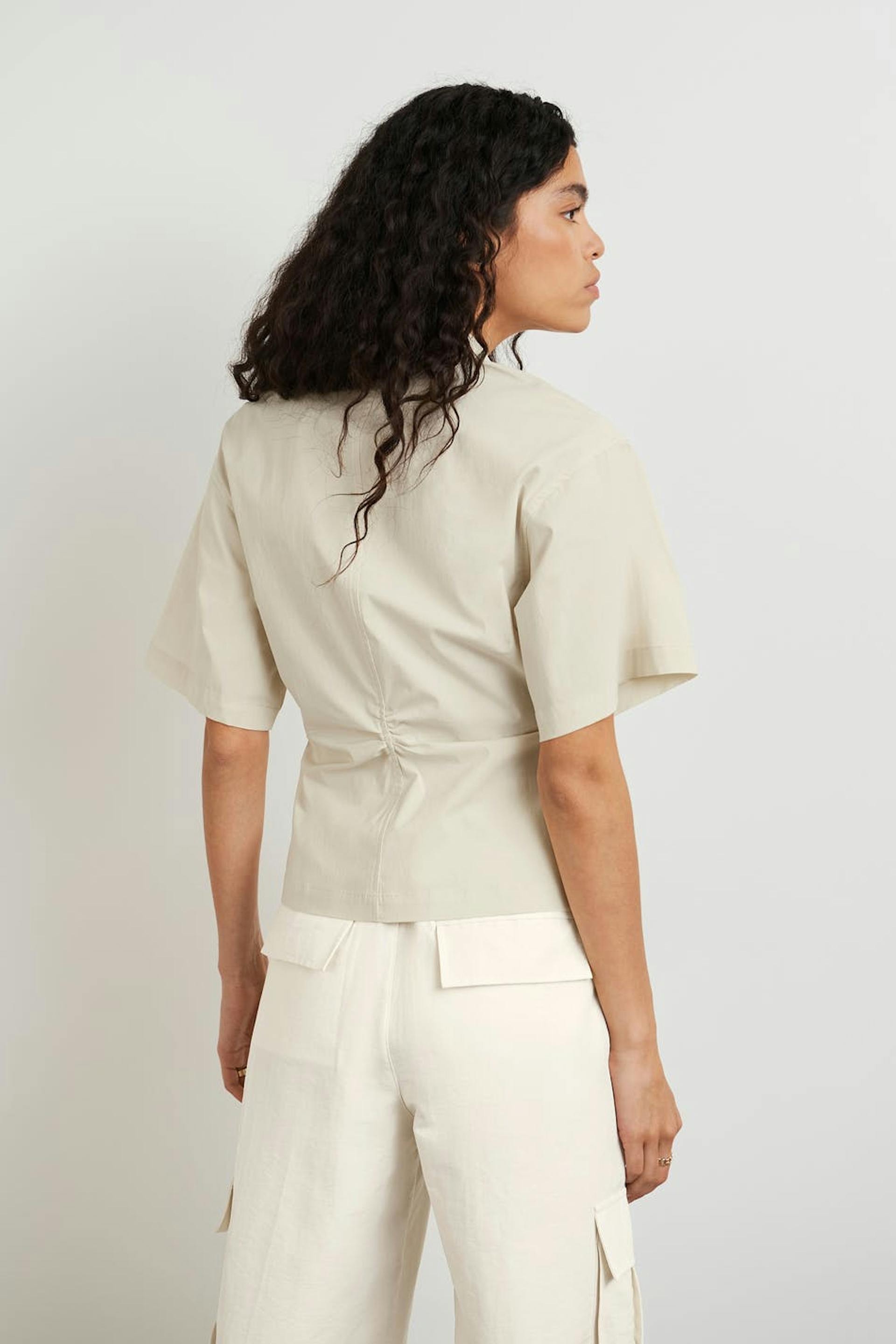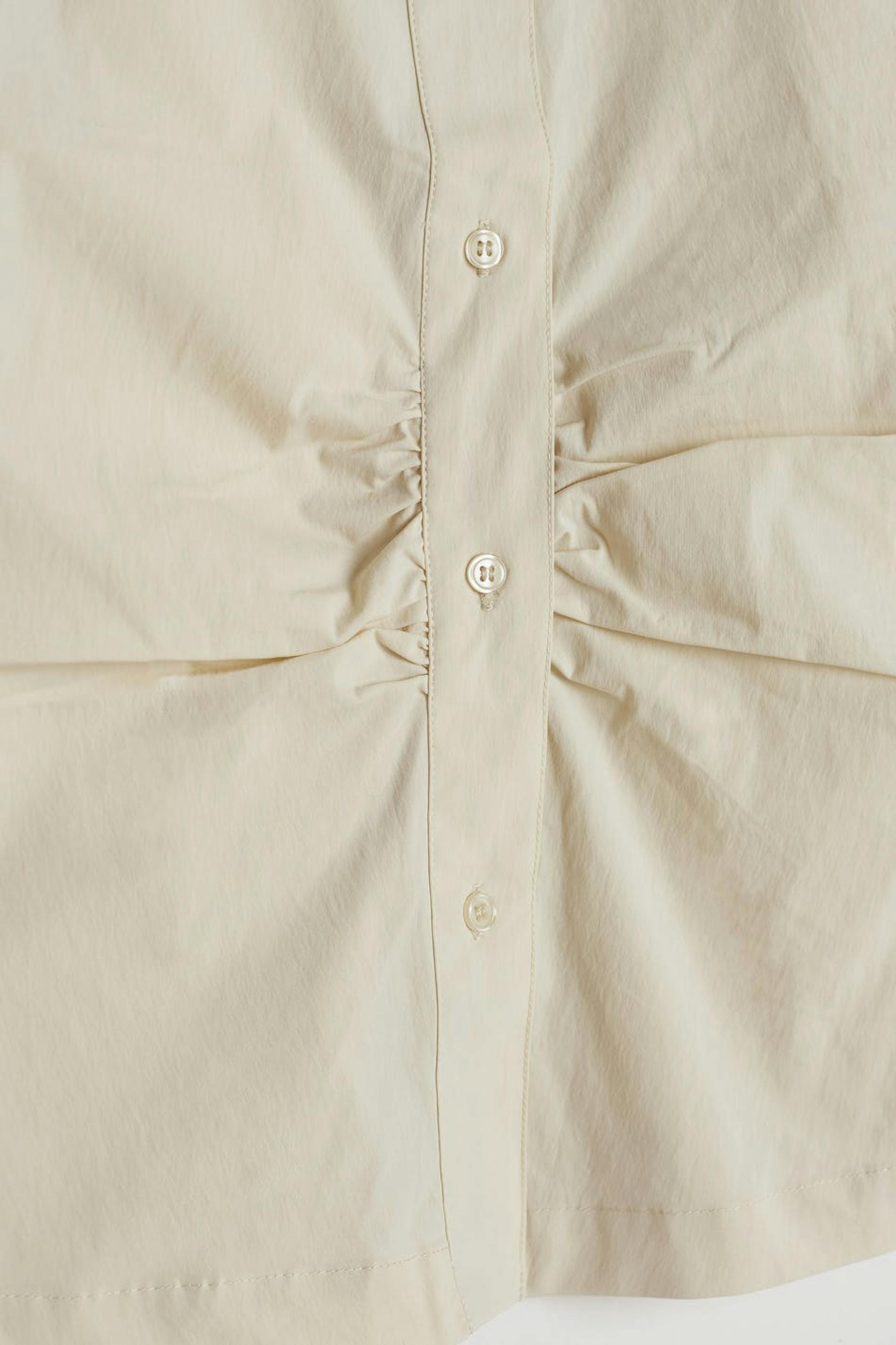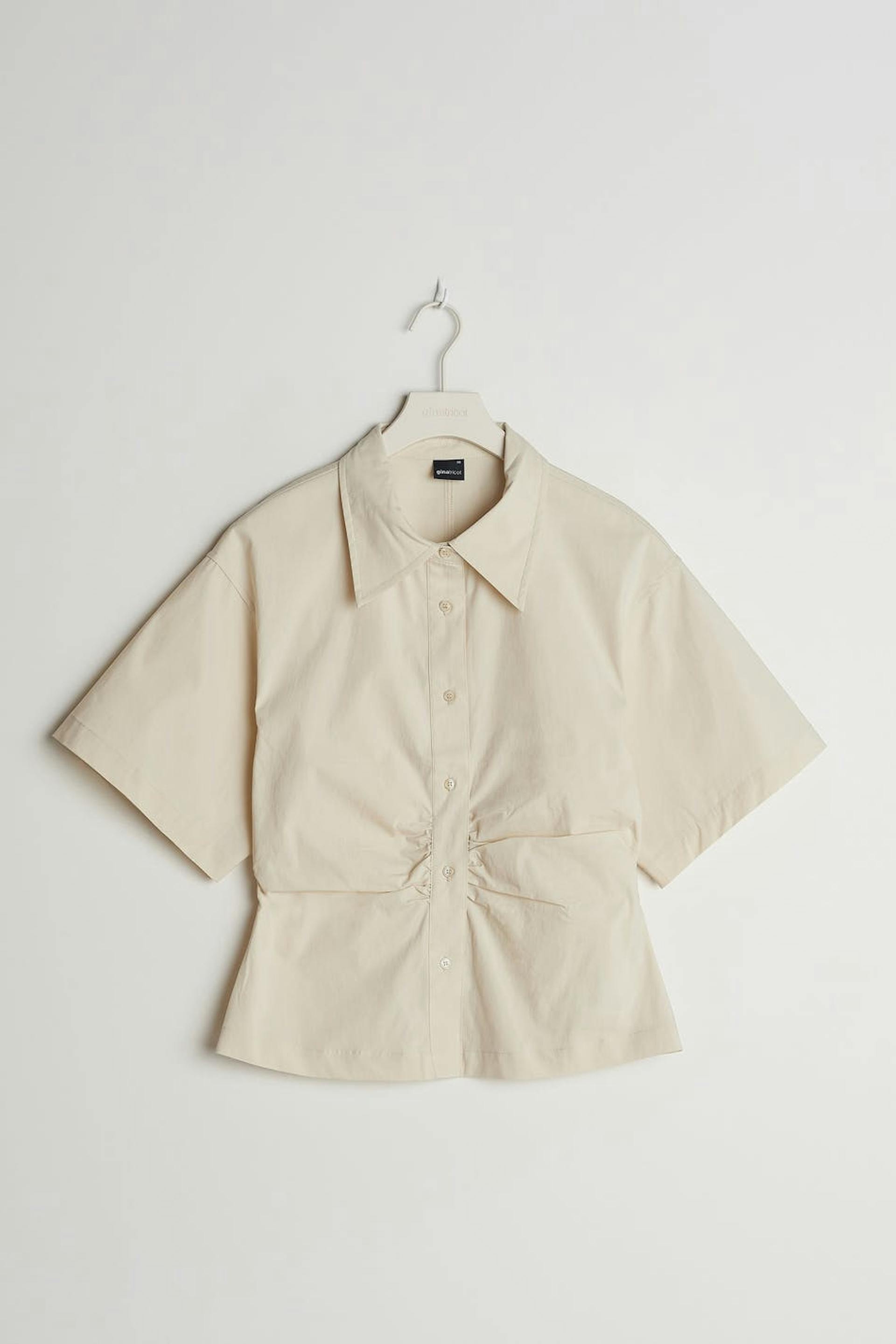 Kortærmet skjorte med rynkede detaljer ved taljen. Skjorten er beige og har en krage. Den har en knaplukning ved fronten.