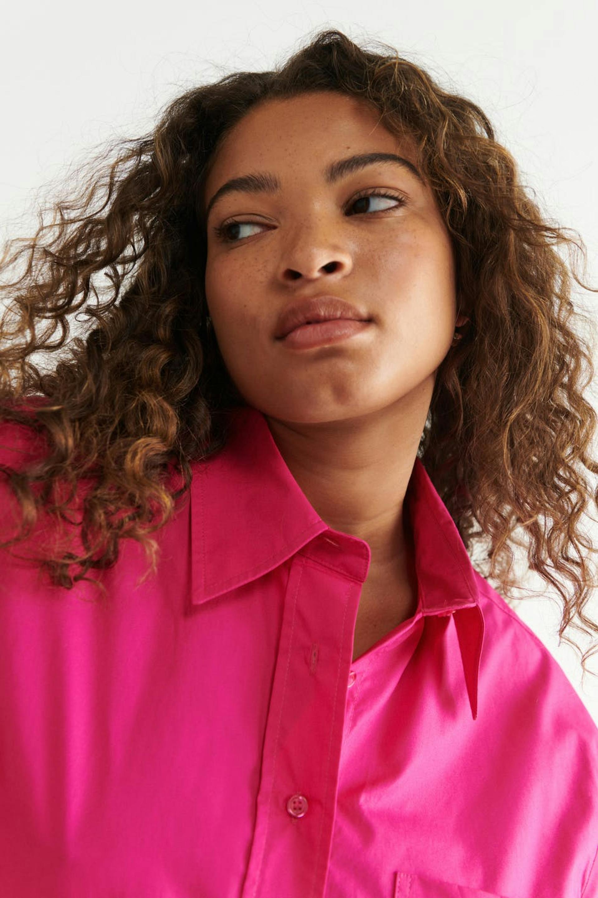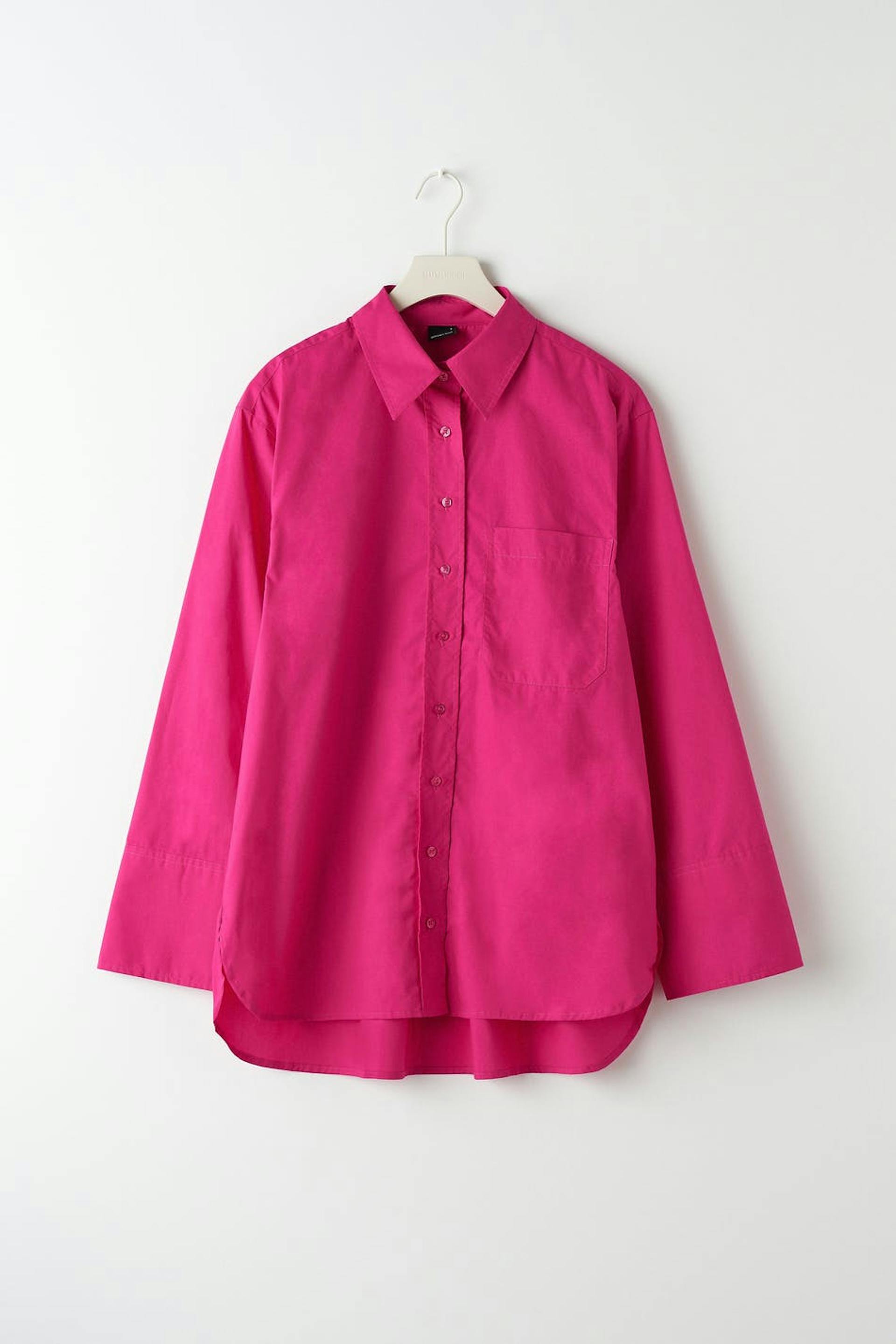 Oversized poplinskjorte med afslappet pasform. Skjorten er pink og har en vævet bomuldskvalitet. Den har en brystlomme, brede manchetter og ventilation i siderne.