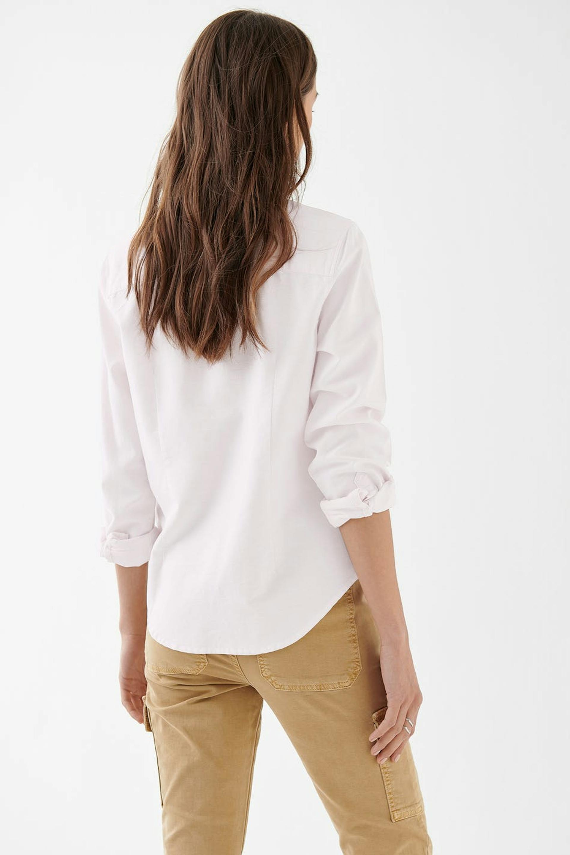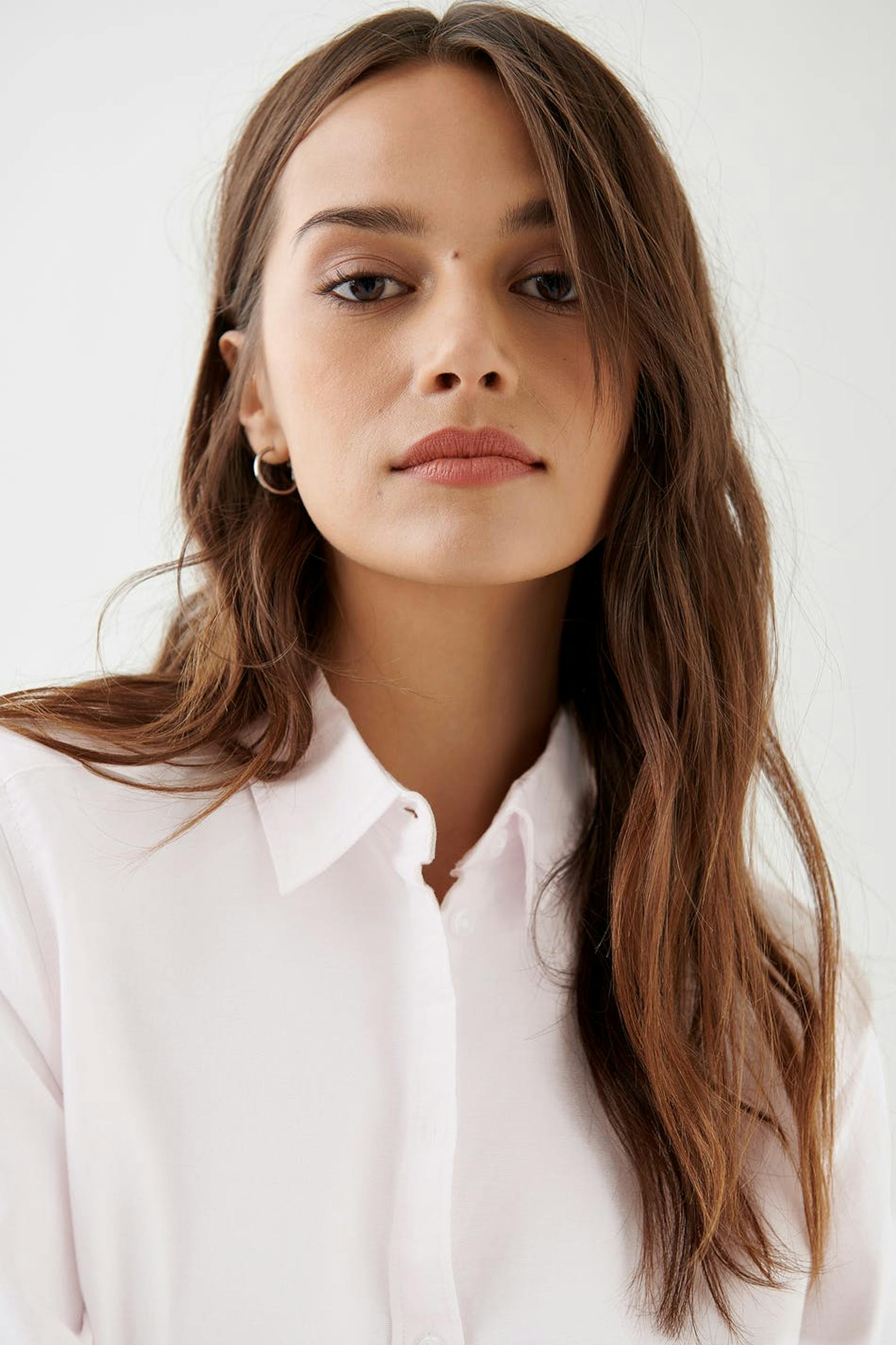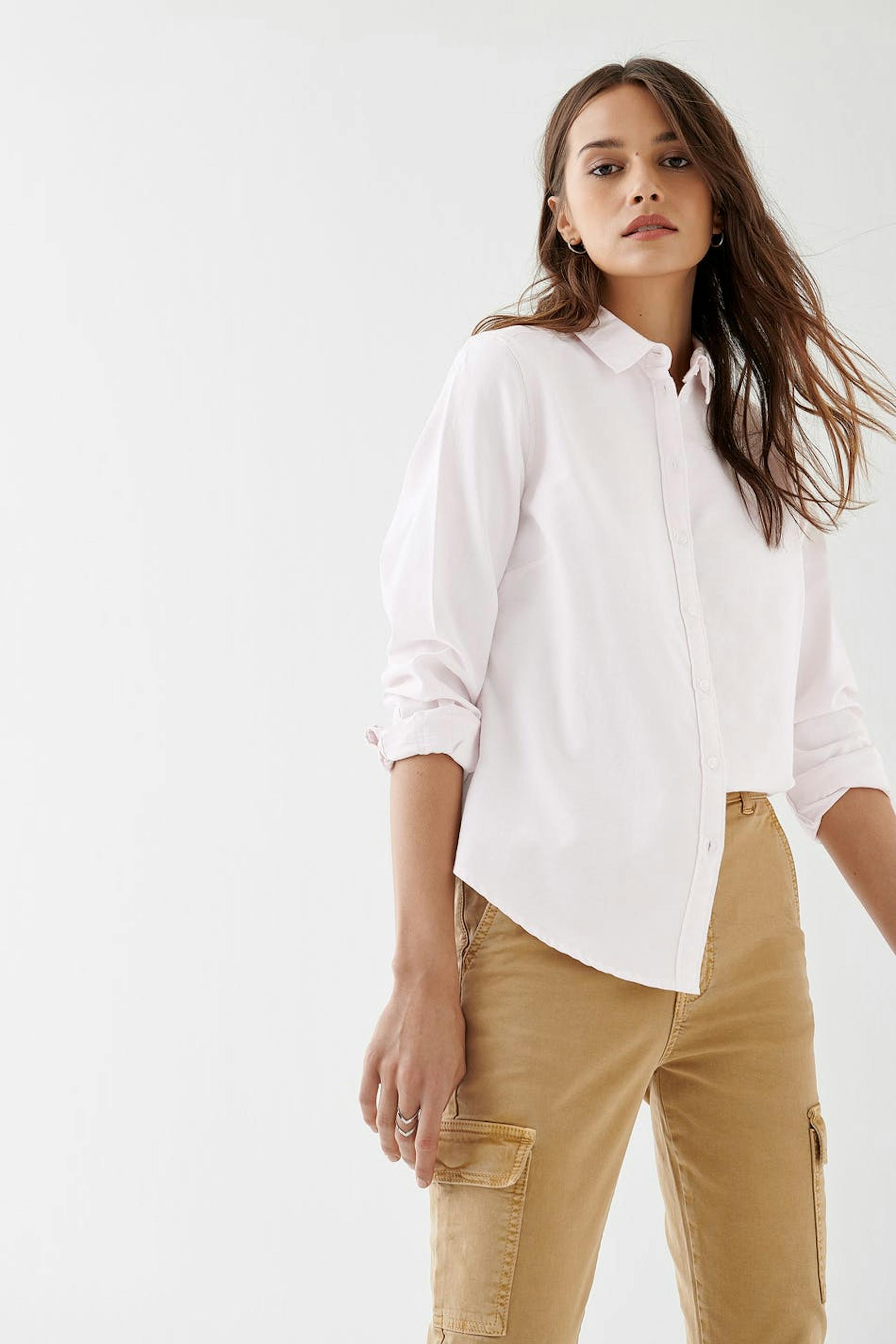 Langærmet skjorte med en normal pasform. Skjorten er lyserød og let figursyet og har en krage. Den har knapper ved fronten.