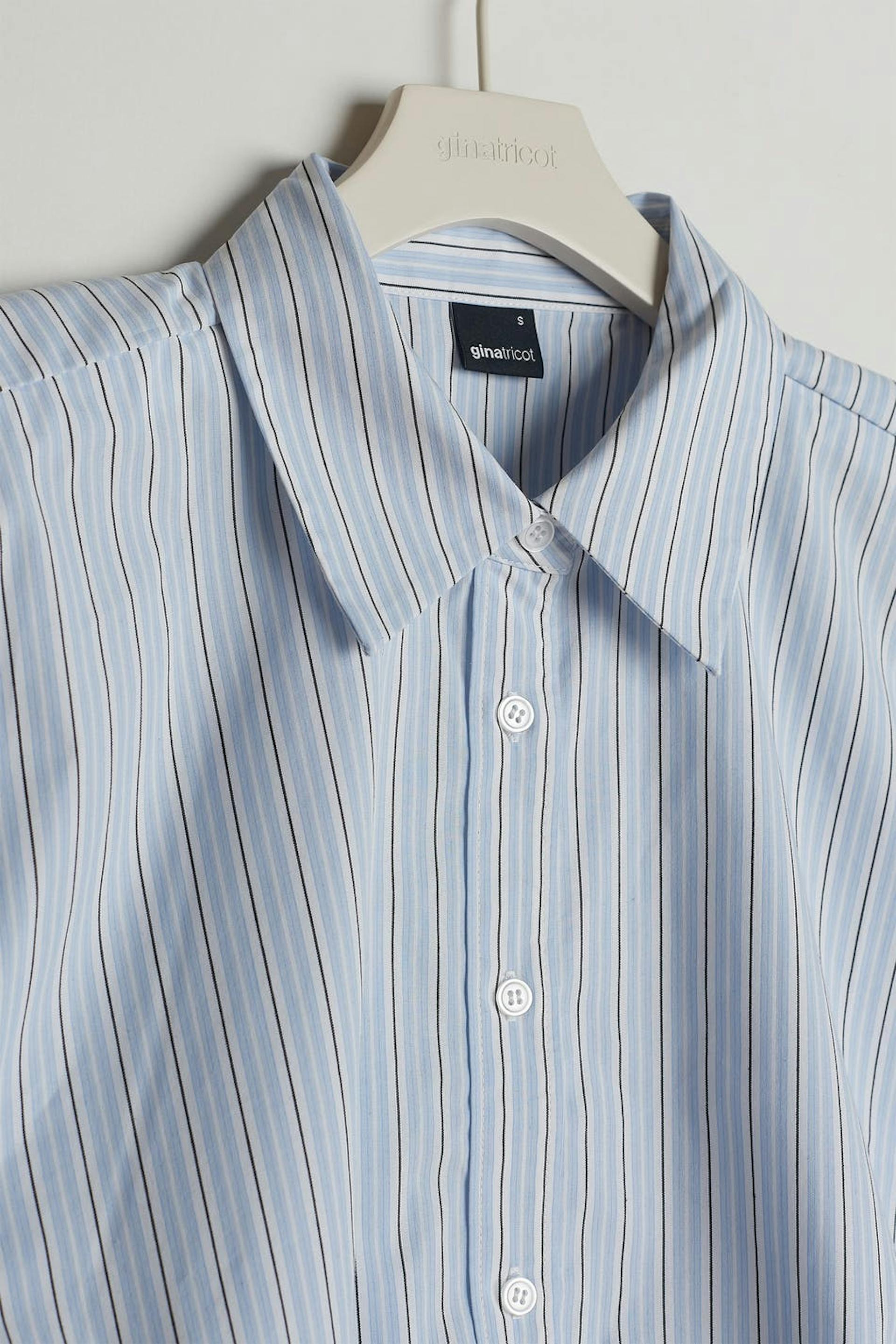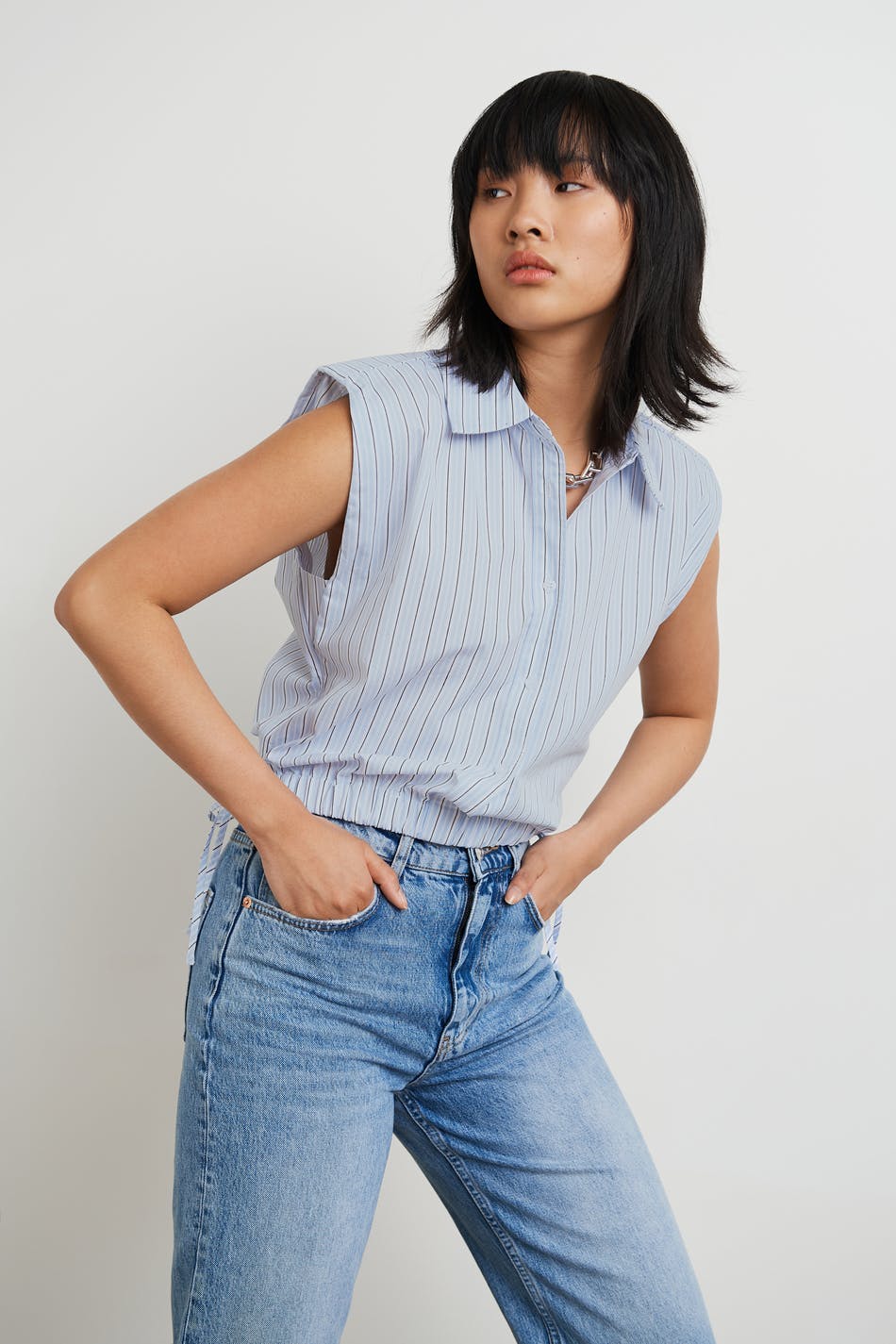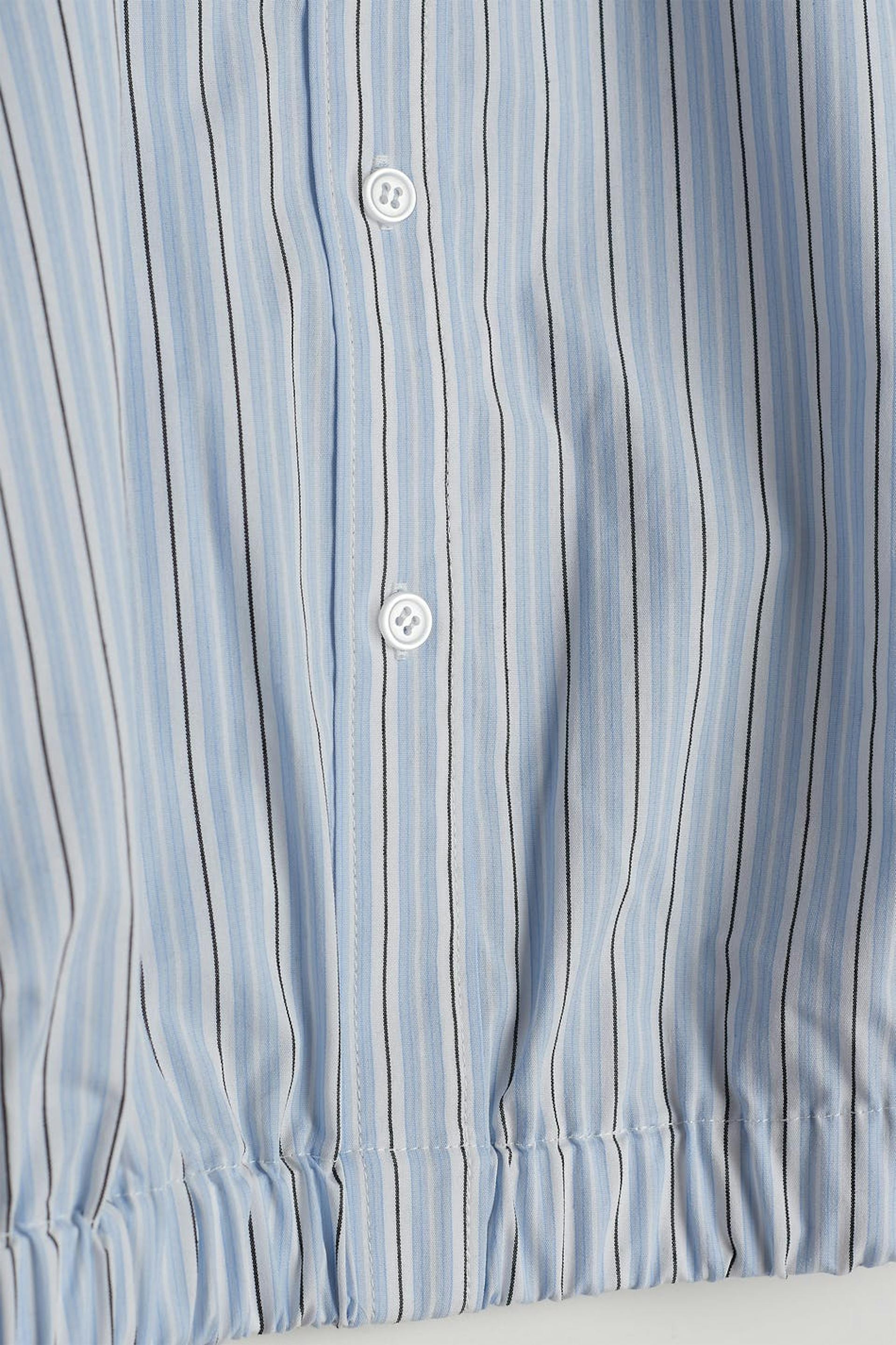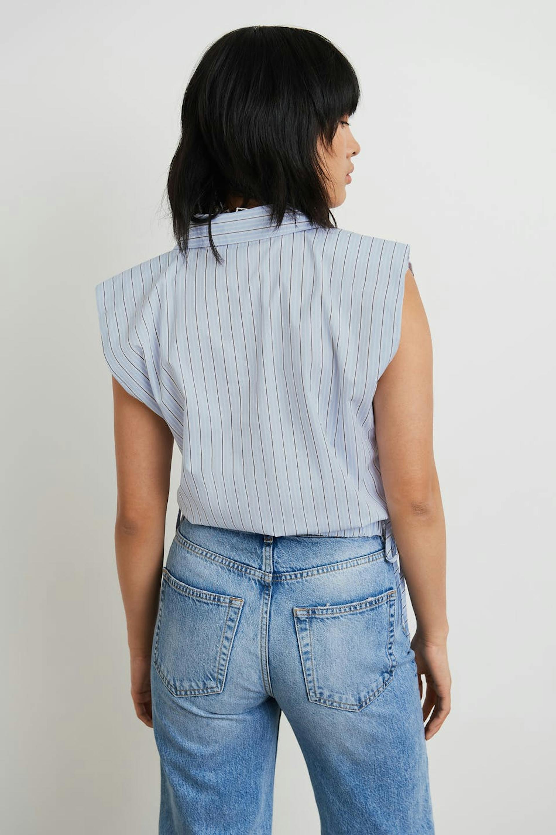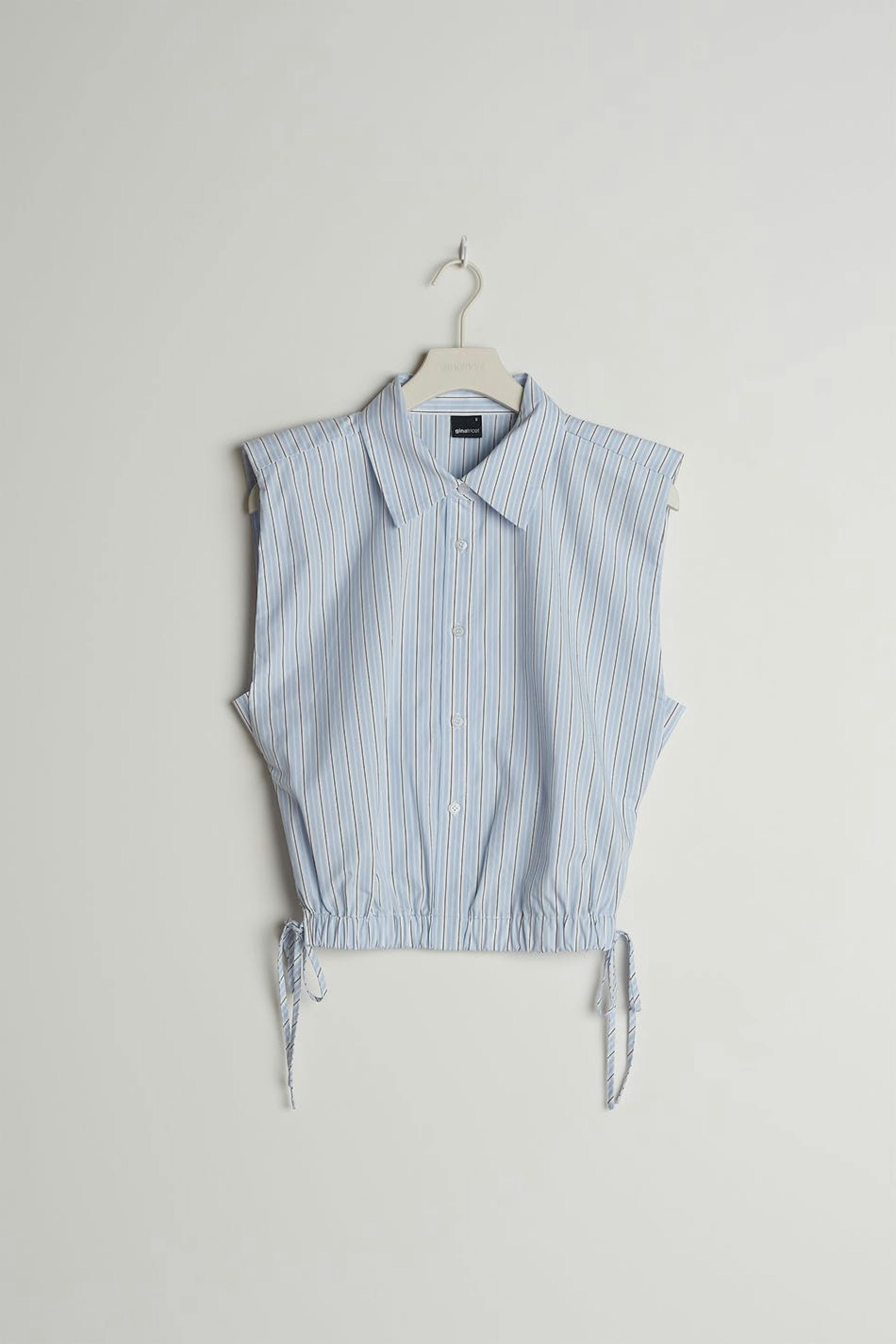 Stribet skjorte med en firkantet pasform. Skjorten er blå og ærmeløs og har en skjortekrage. Den har samlinger nederst med dekorative snøringer på begge sider.