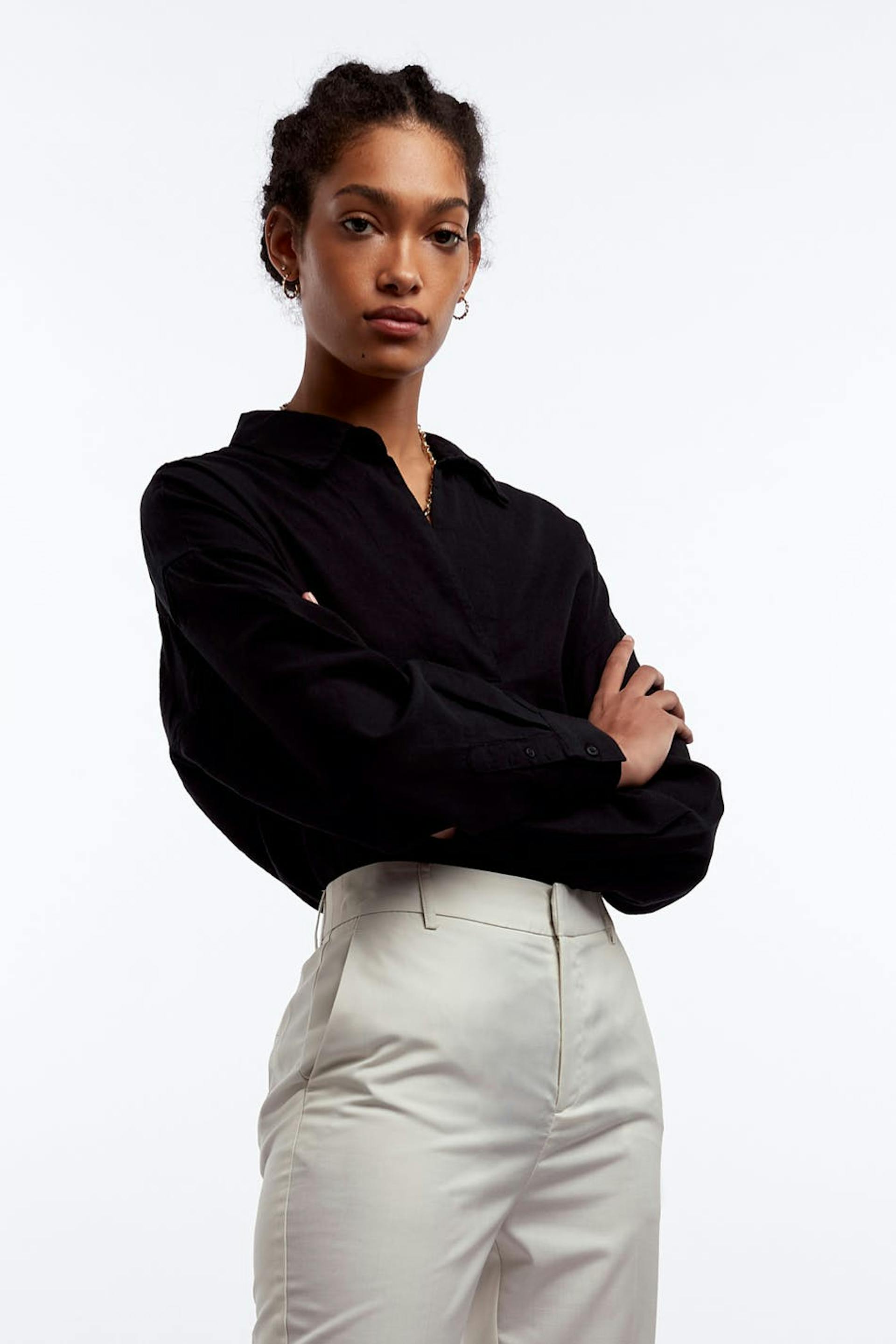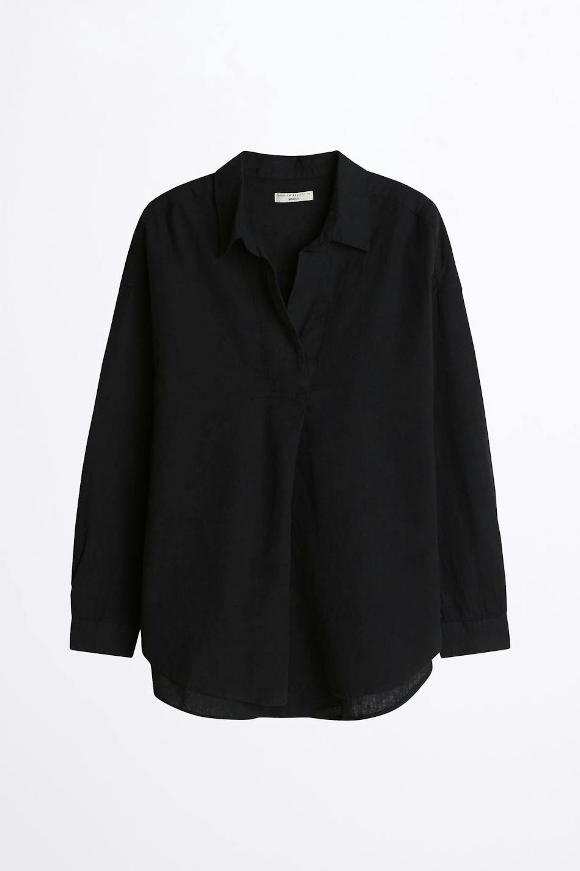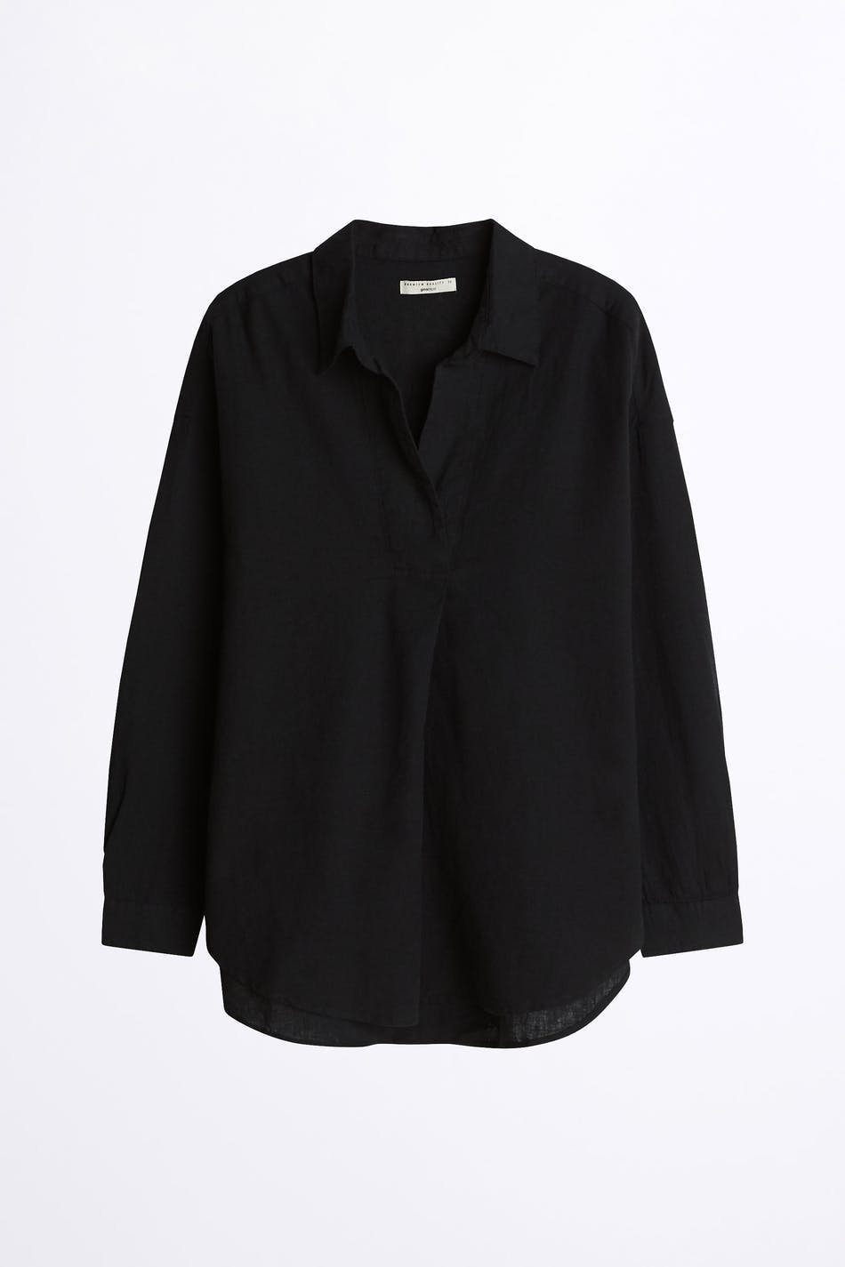 Langærmet skjorte med en krage med en dyb v-hals. Skjorten er sort og har en afrundet søm. Den er fremstillet af hør.