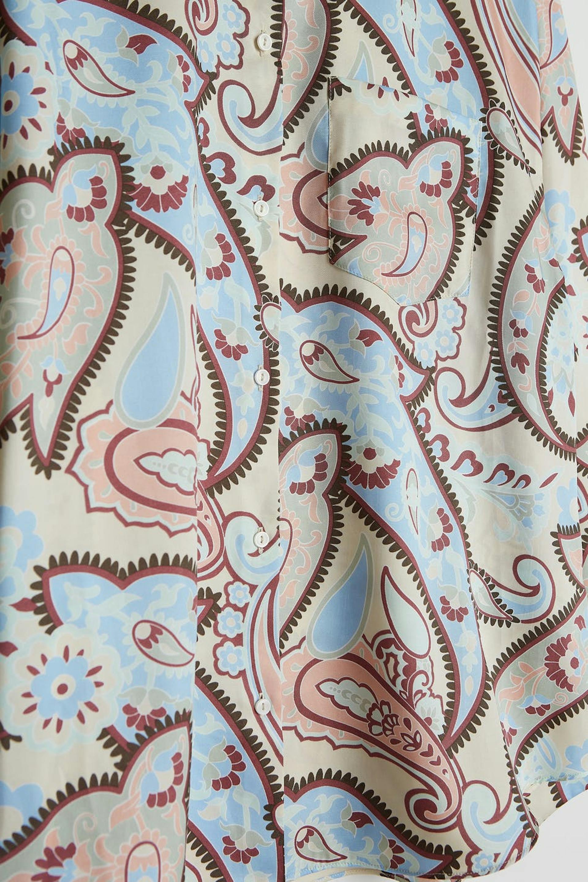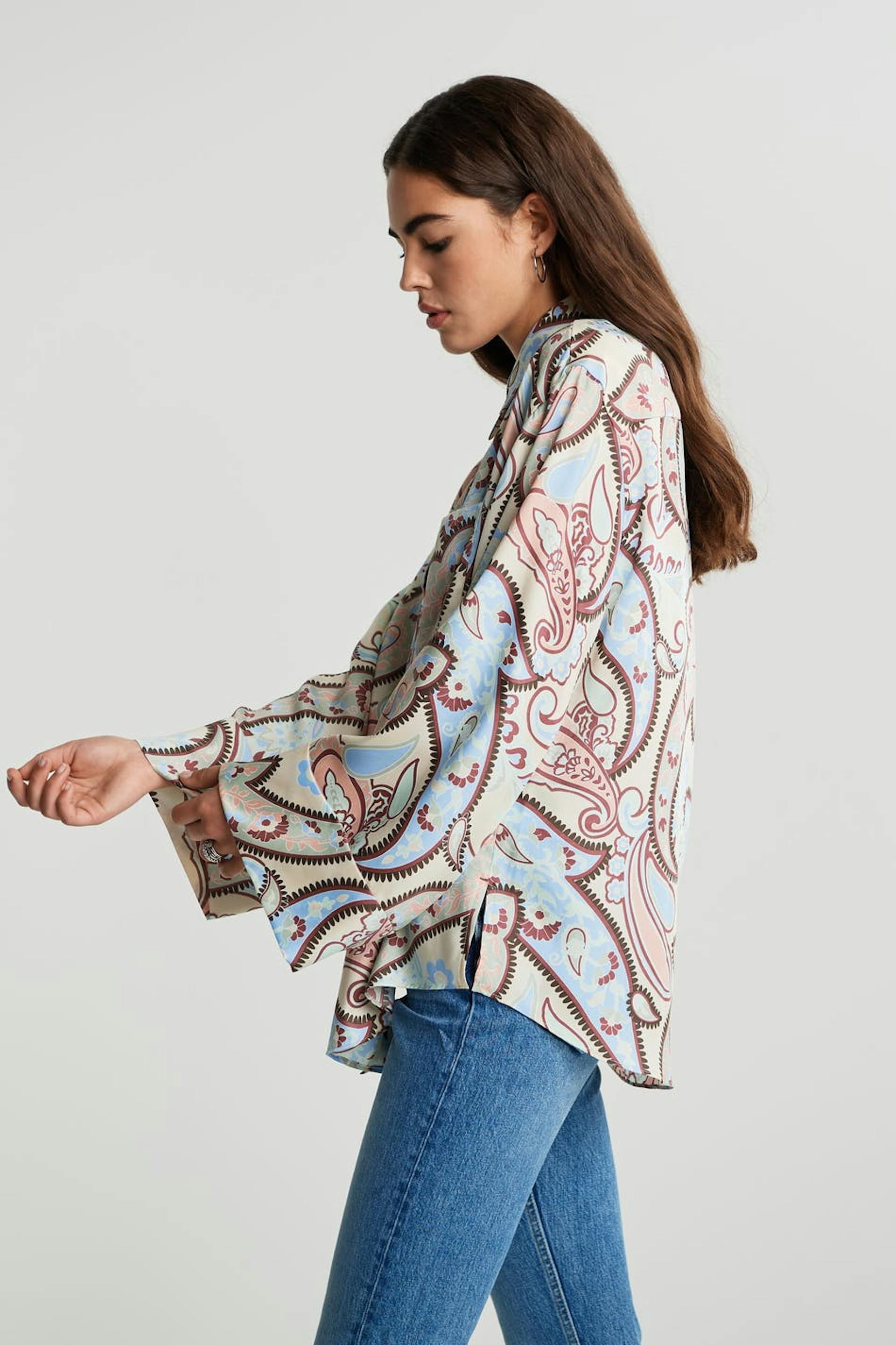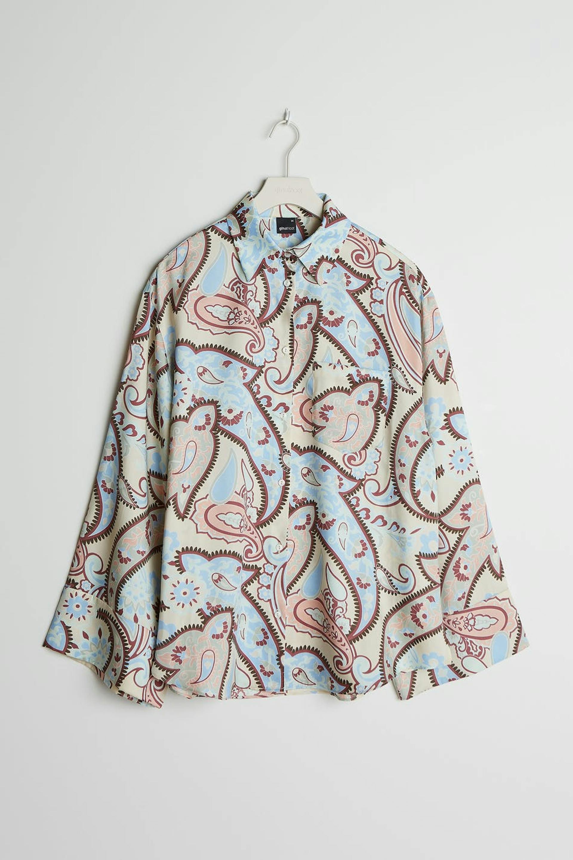 Skjorte med et paisleymønster og lange, rummelige ærmer med en slids på ærmeafslutningerne. Blå, beige, pink og grøn. Den har et satinlignende materiale.