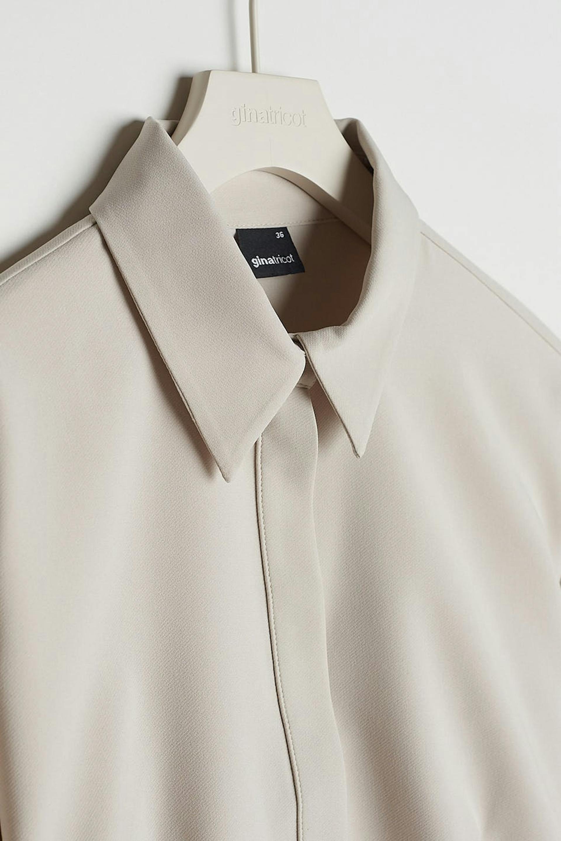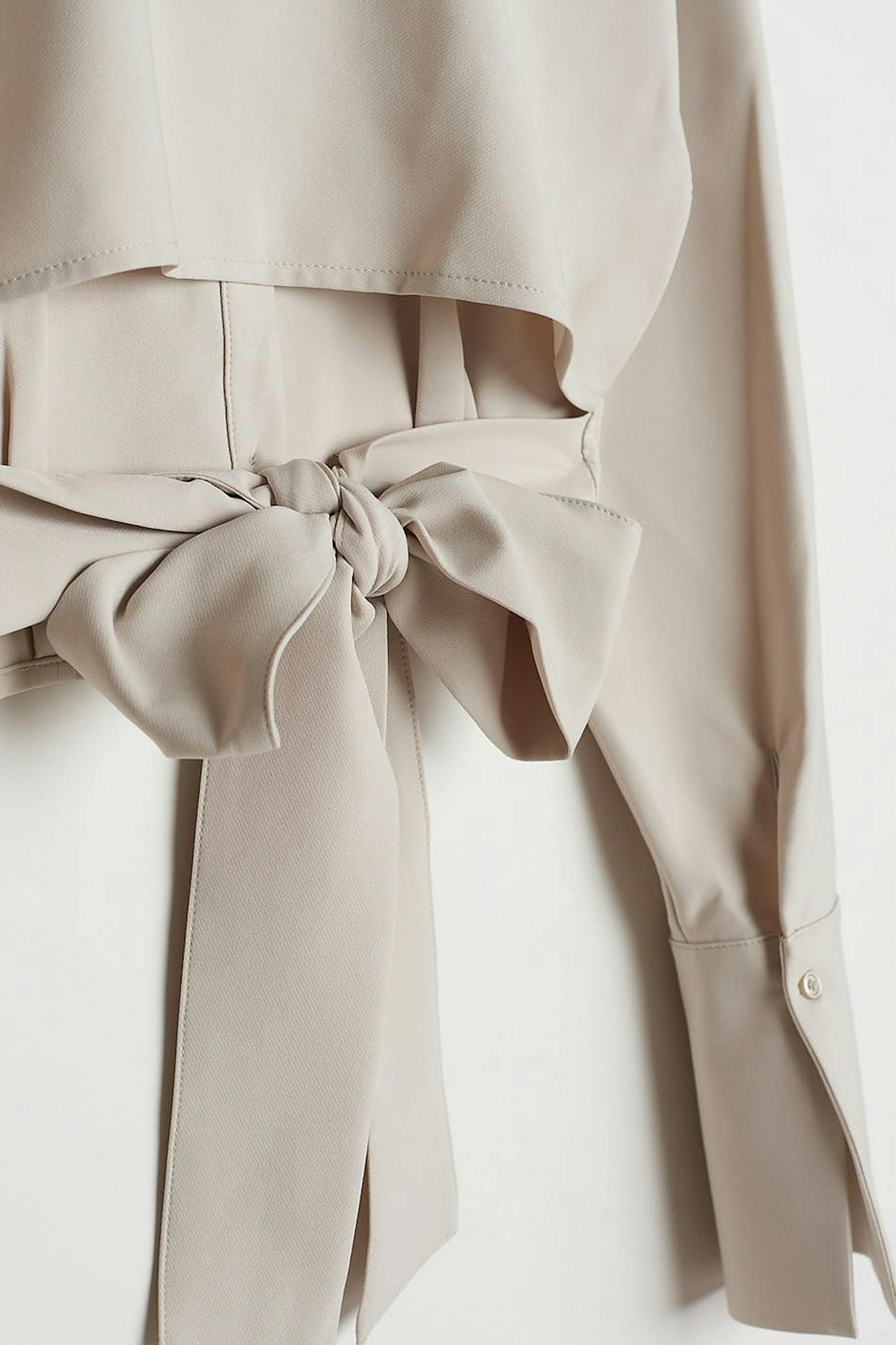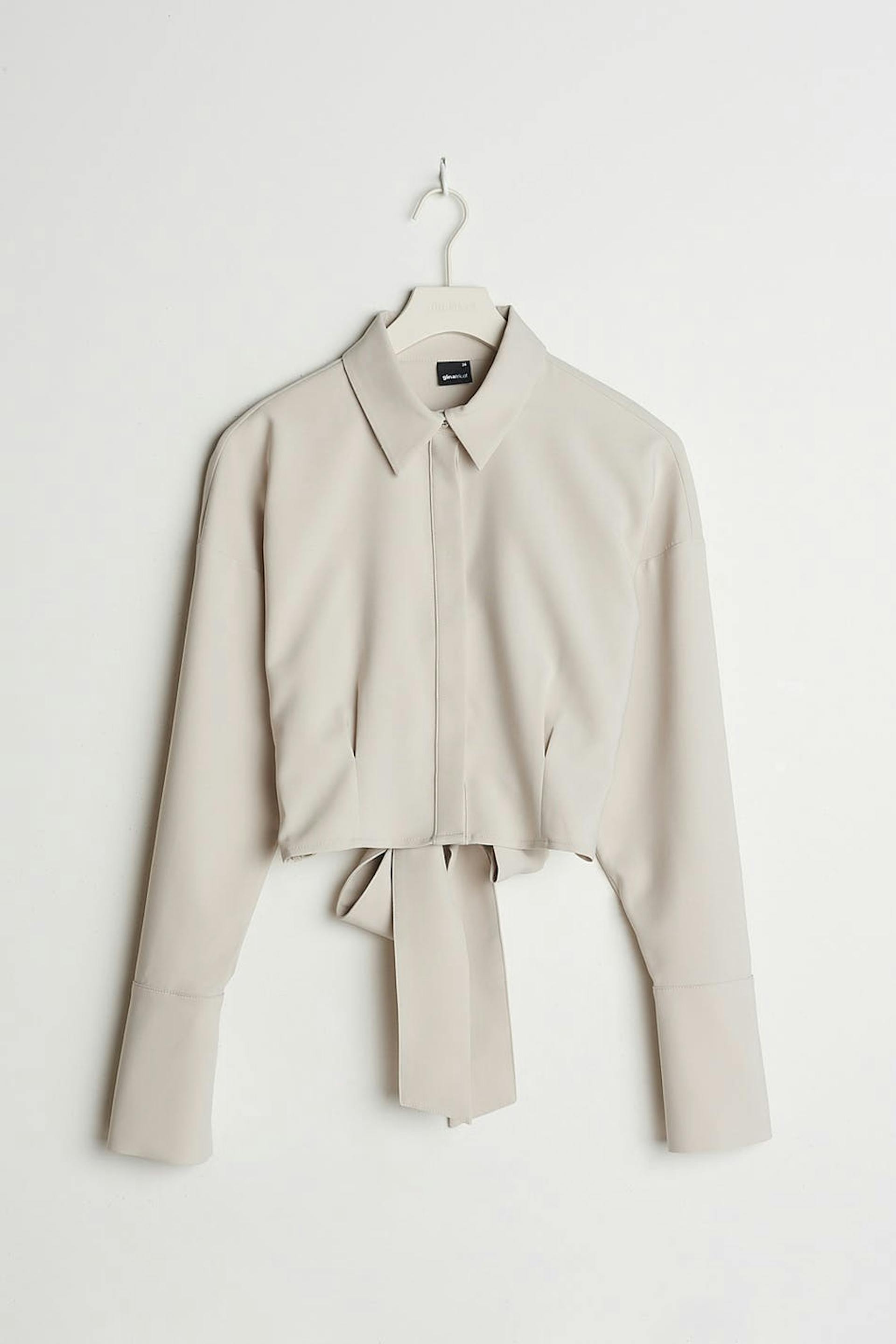 Kort skjorte med en åben ryg med et bindbart bånd på den nederste del. Skjorten er grå og har en skjult knapstolpe ved fronten.