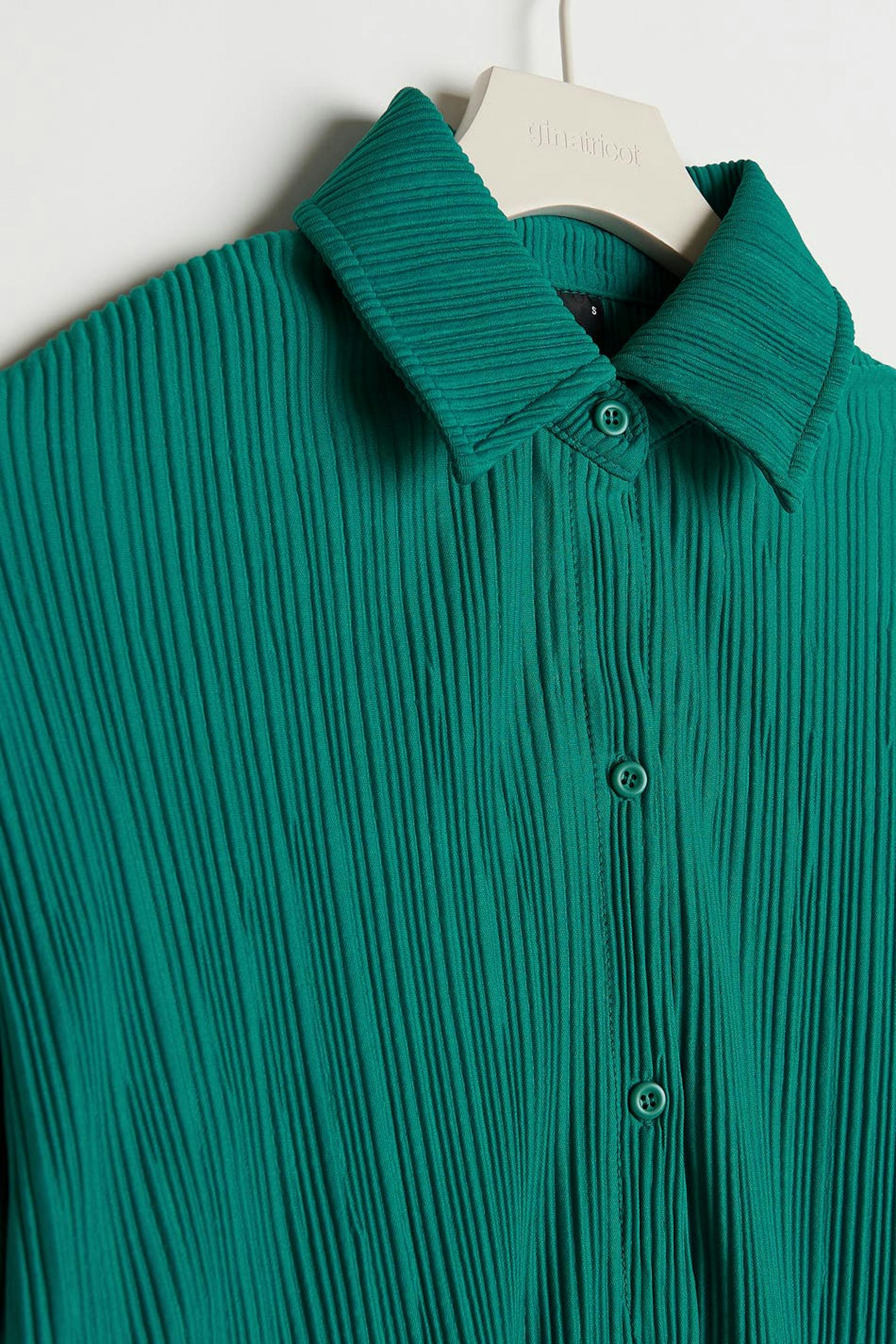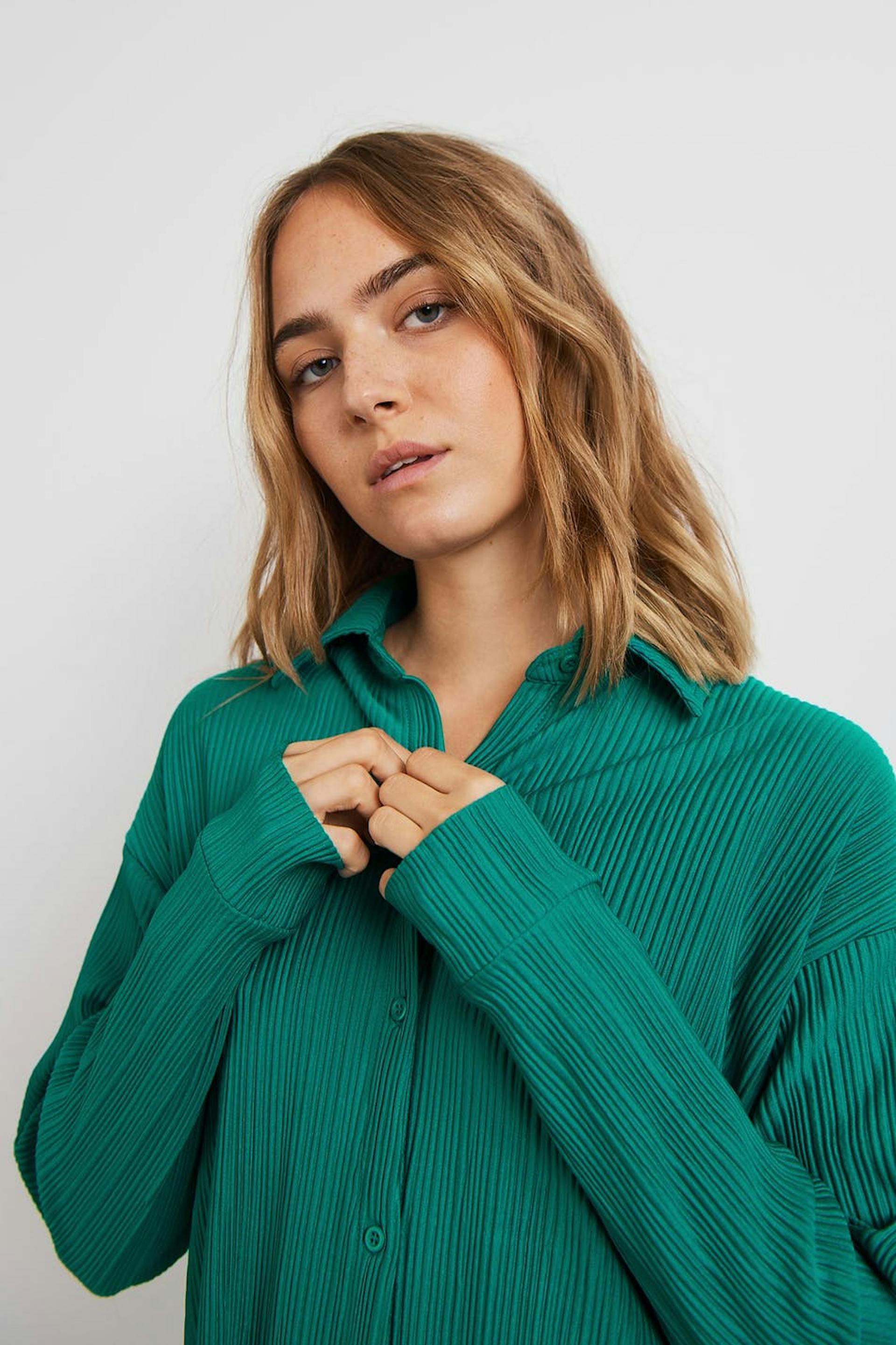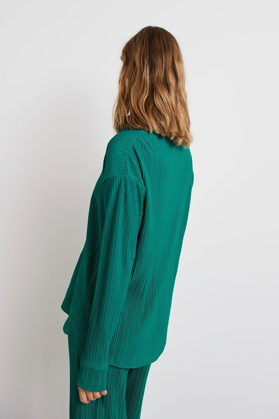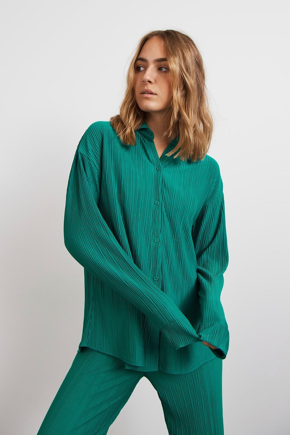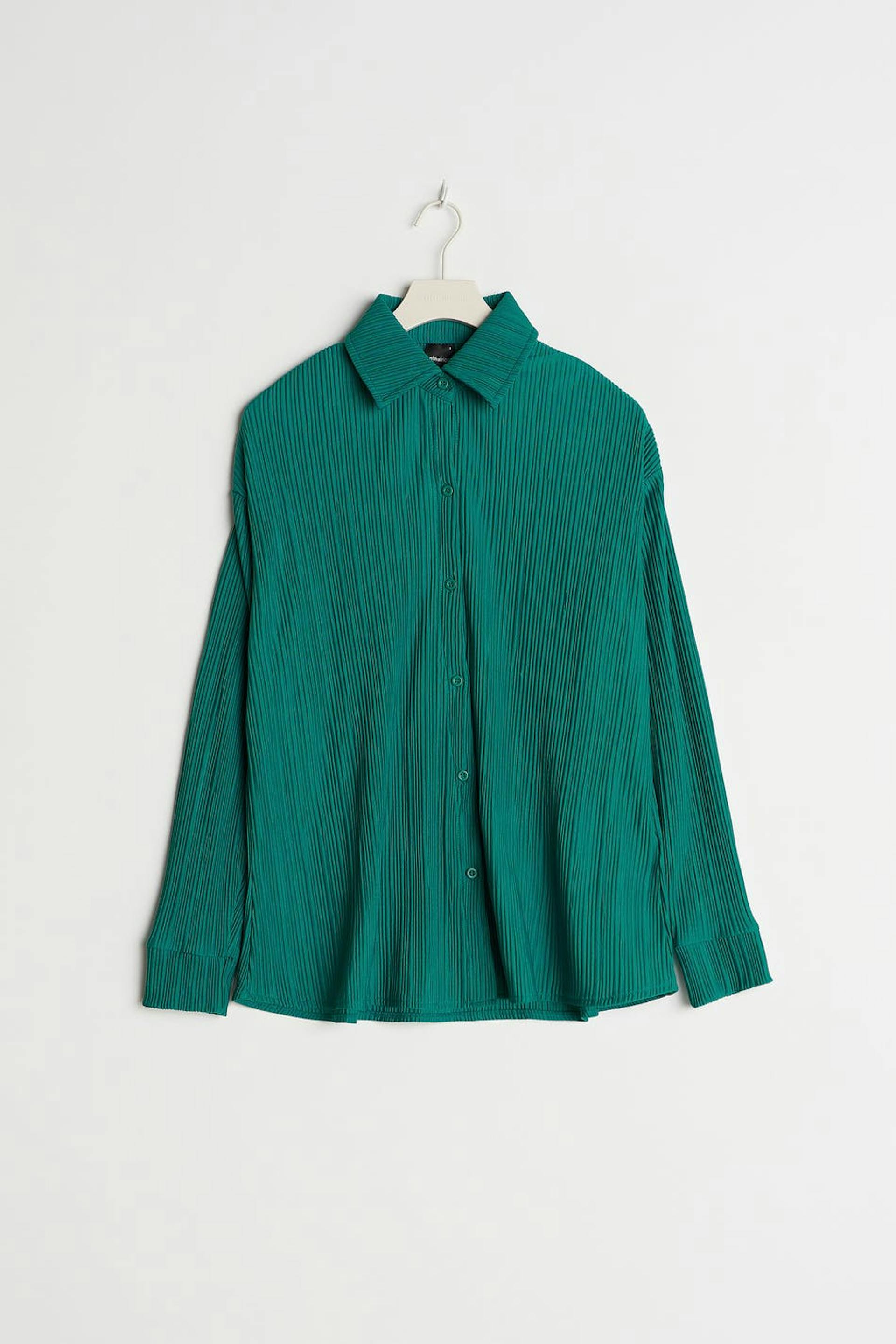 Plisseret skjorte med en oversize pasform. Skjorten er grøn og har en knaplukning ved fronten.