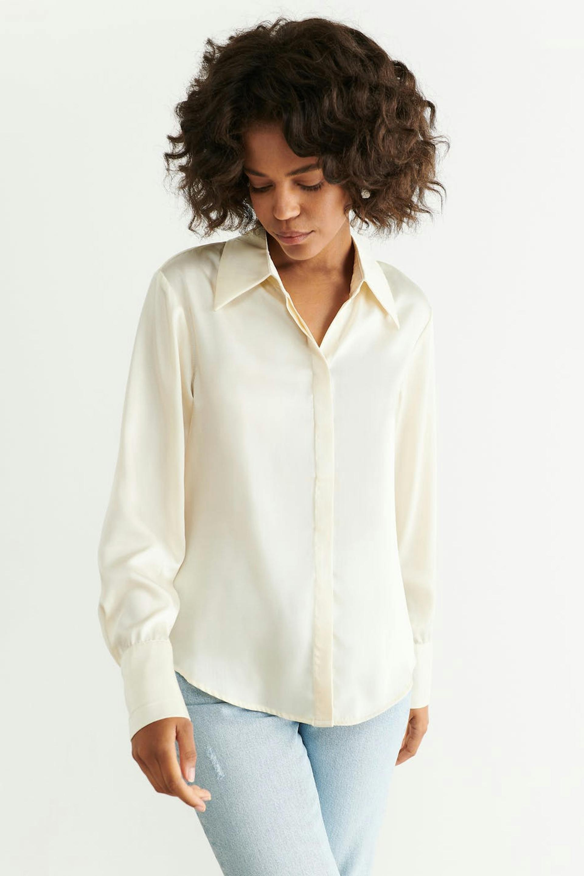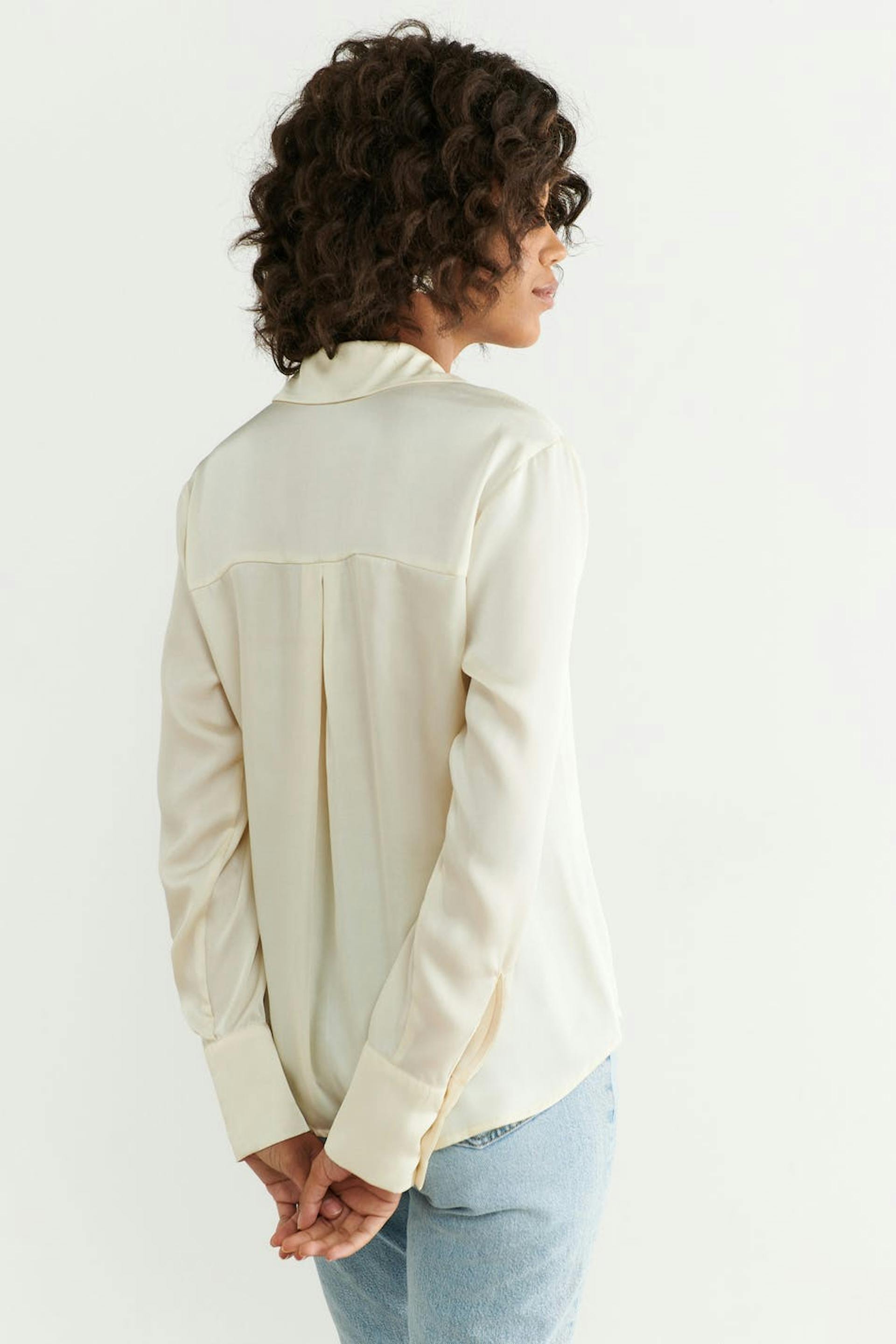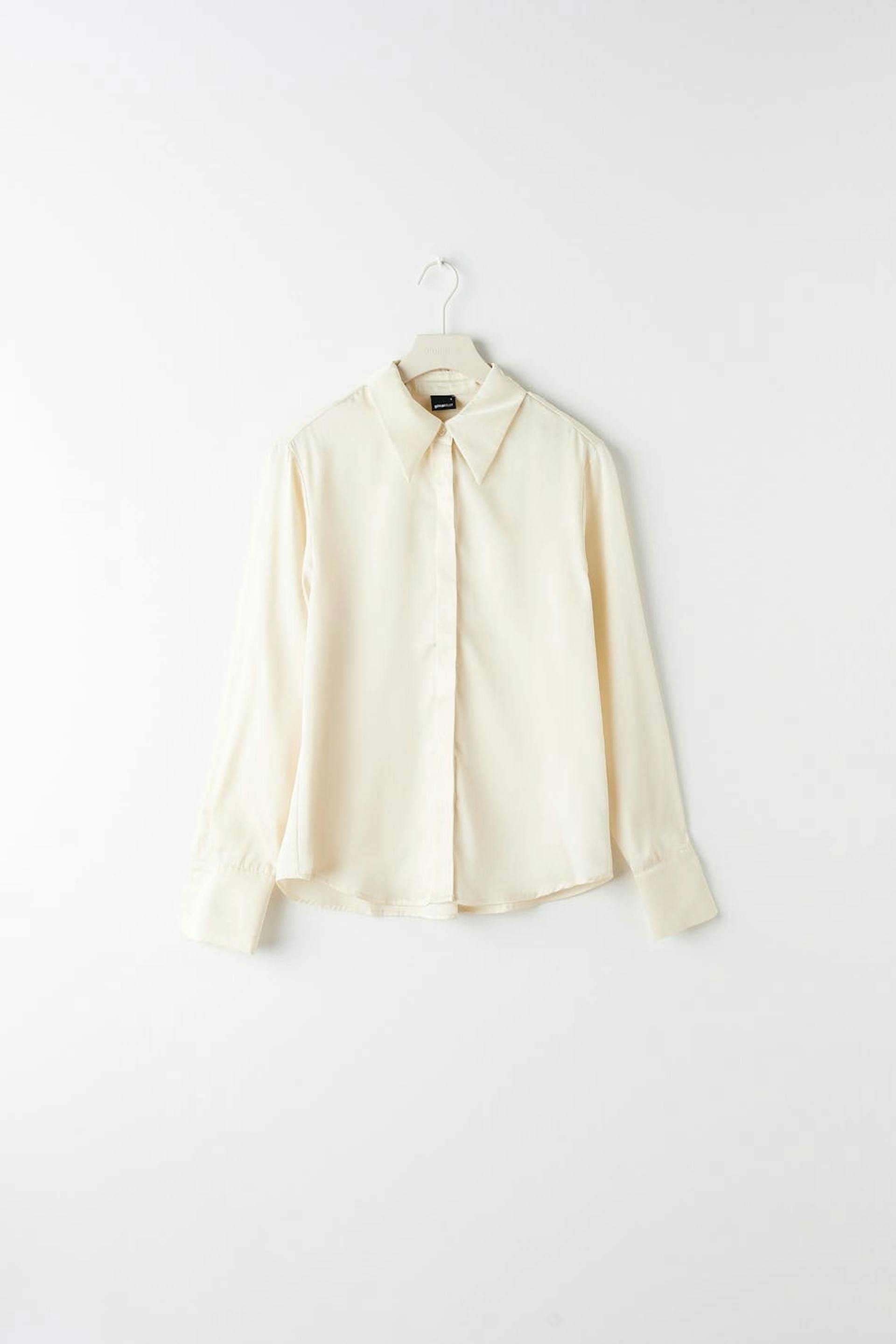 Skjorte med afslappet pasform. Skjorten er hvid og har lange ærmer med manchetter. Den har krave og knapstolpe ved fronten.
