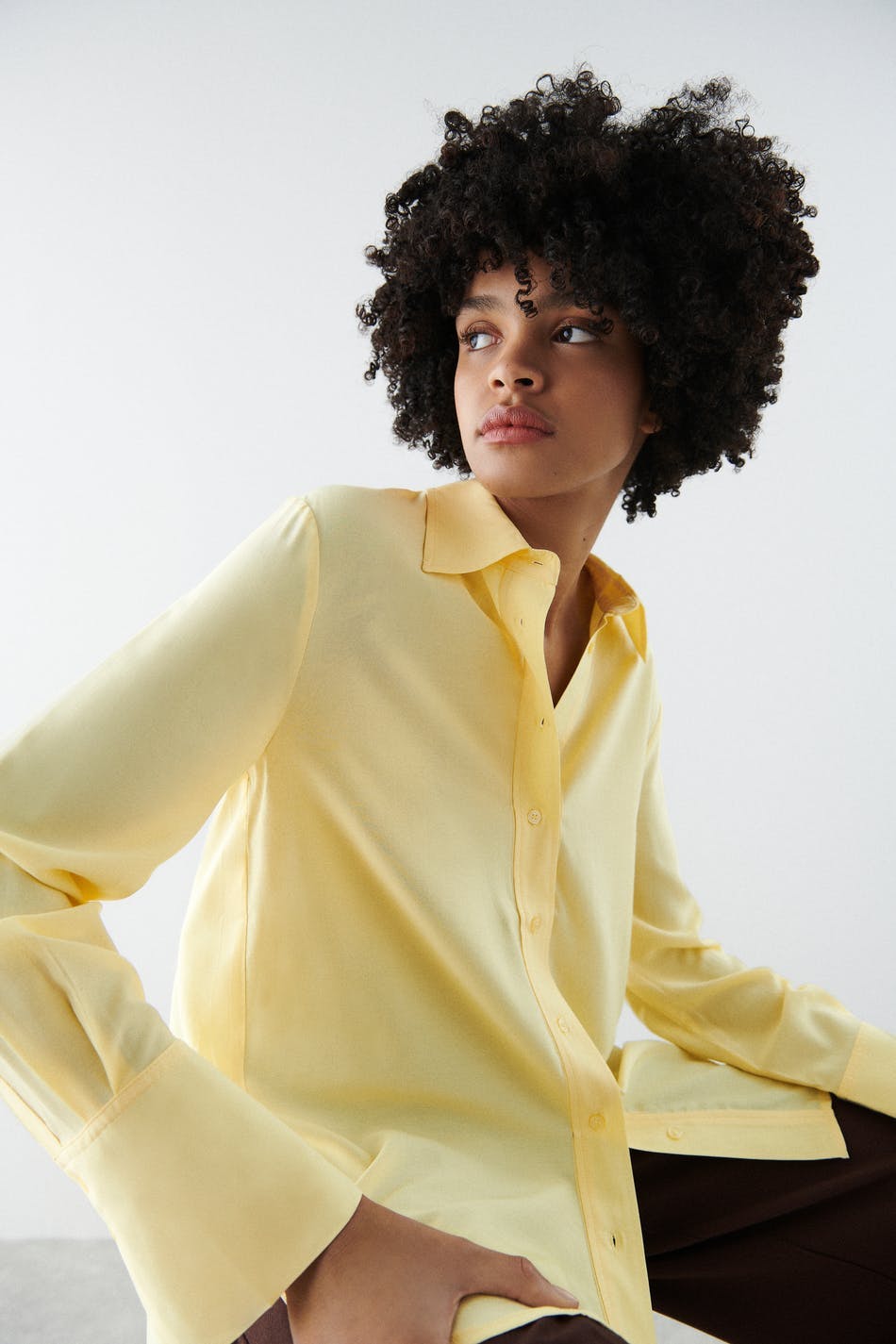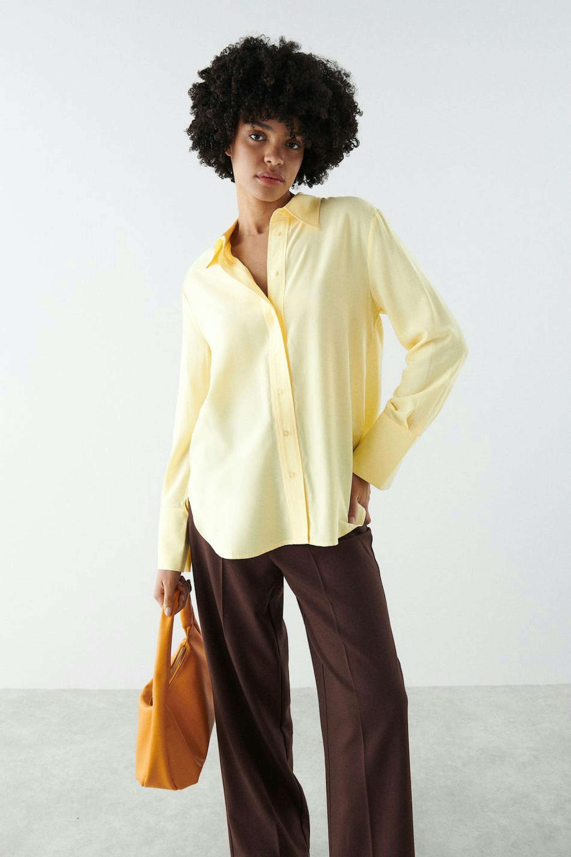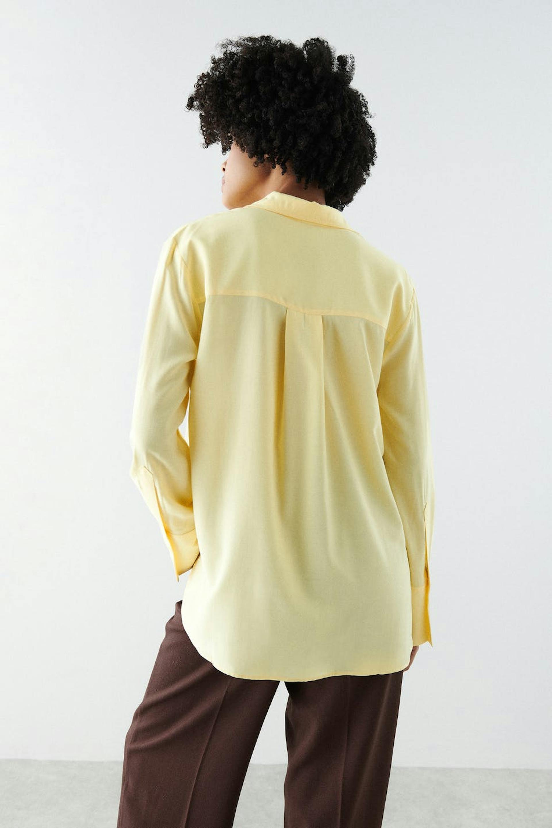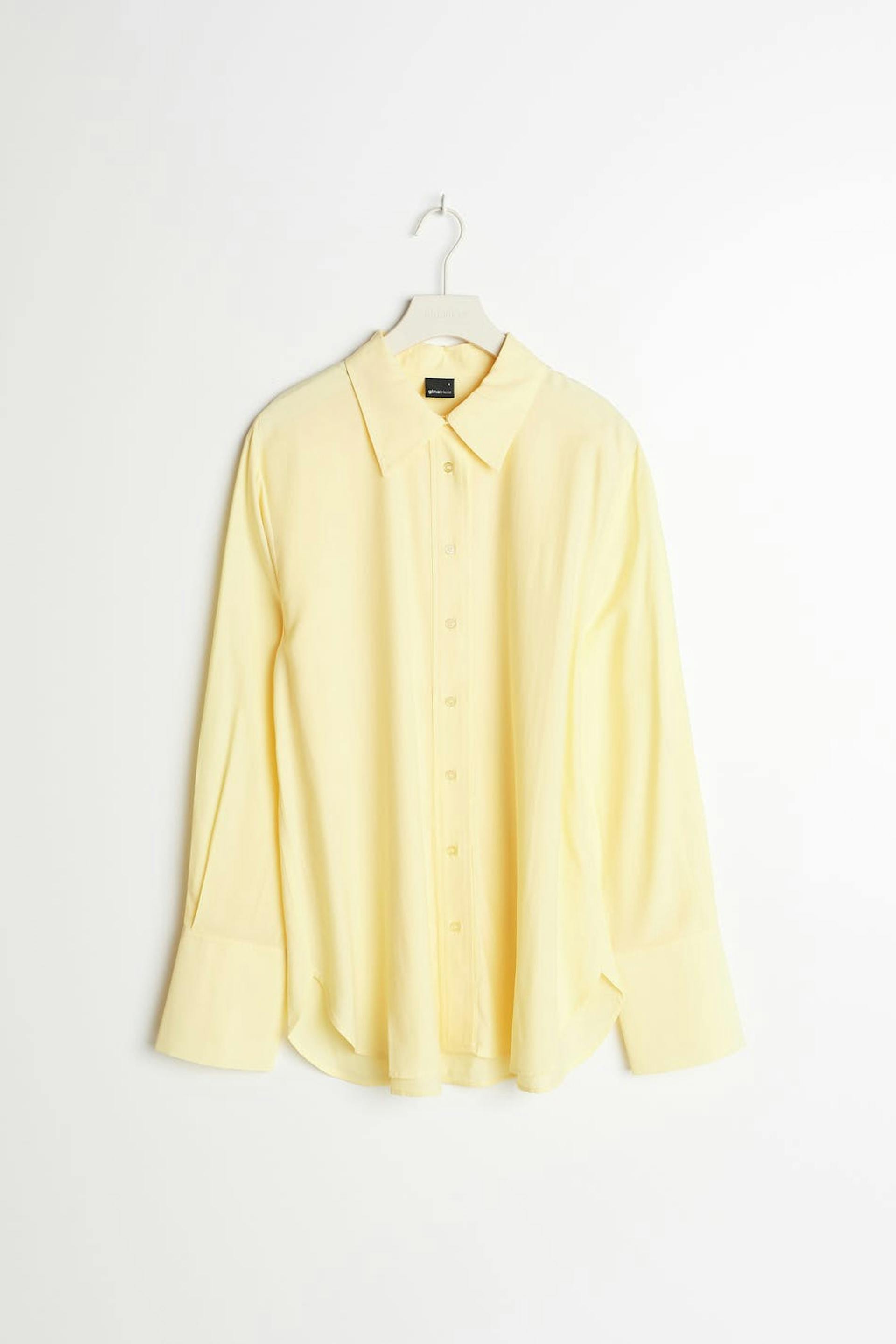 Klassisk skjorte med lige søm. Skjorten er gul og har knapstolpe foran. Den har en krave og lægdetaljer ved bagsiden og på ærmerne.