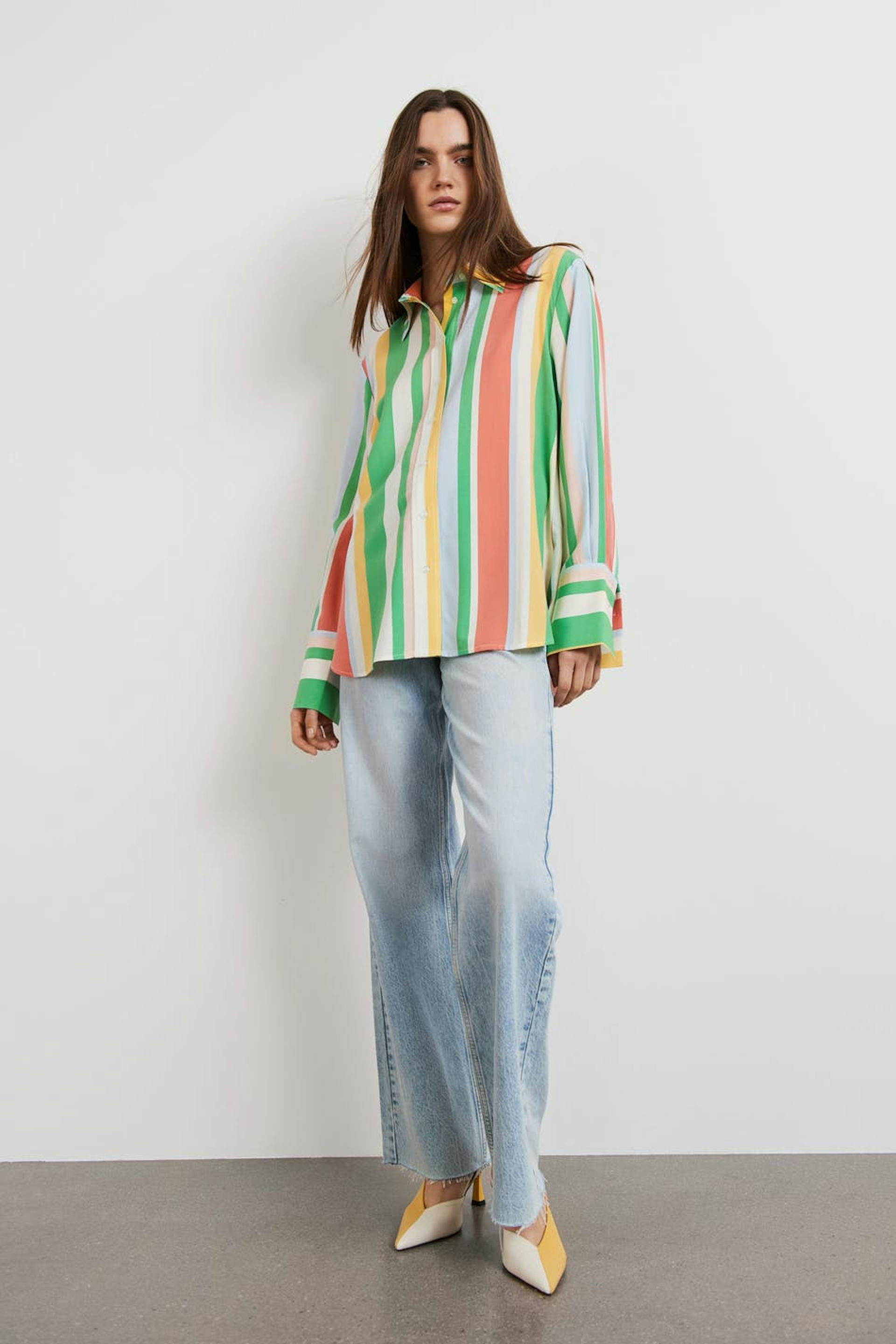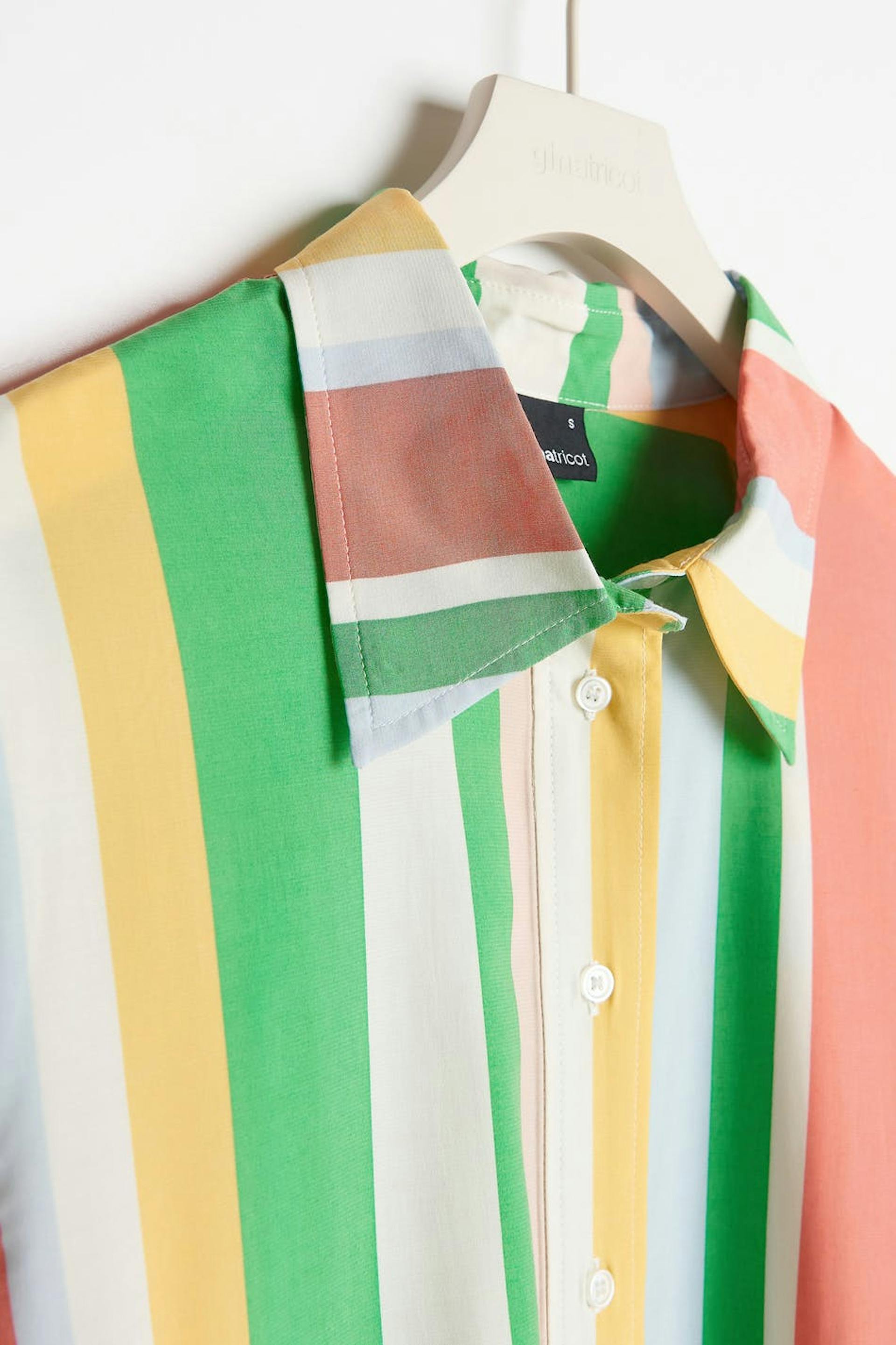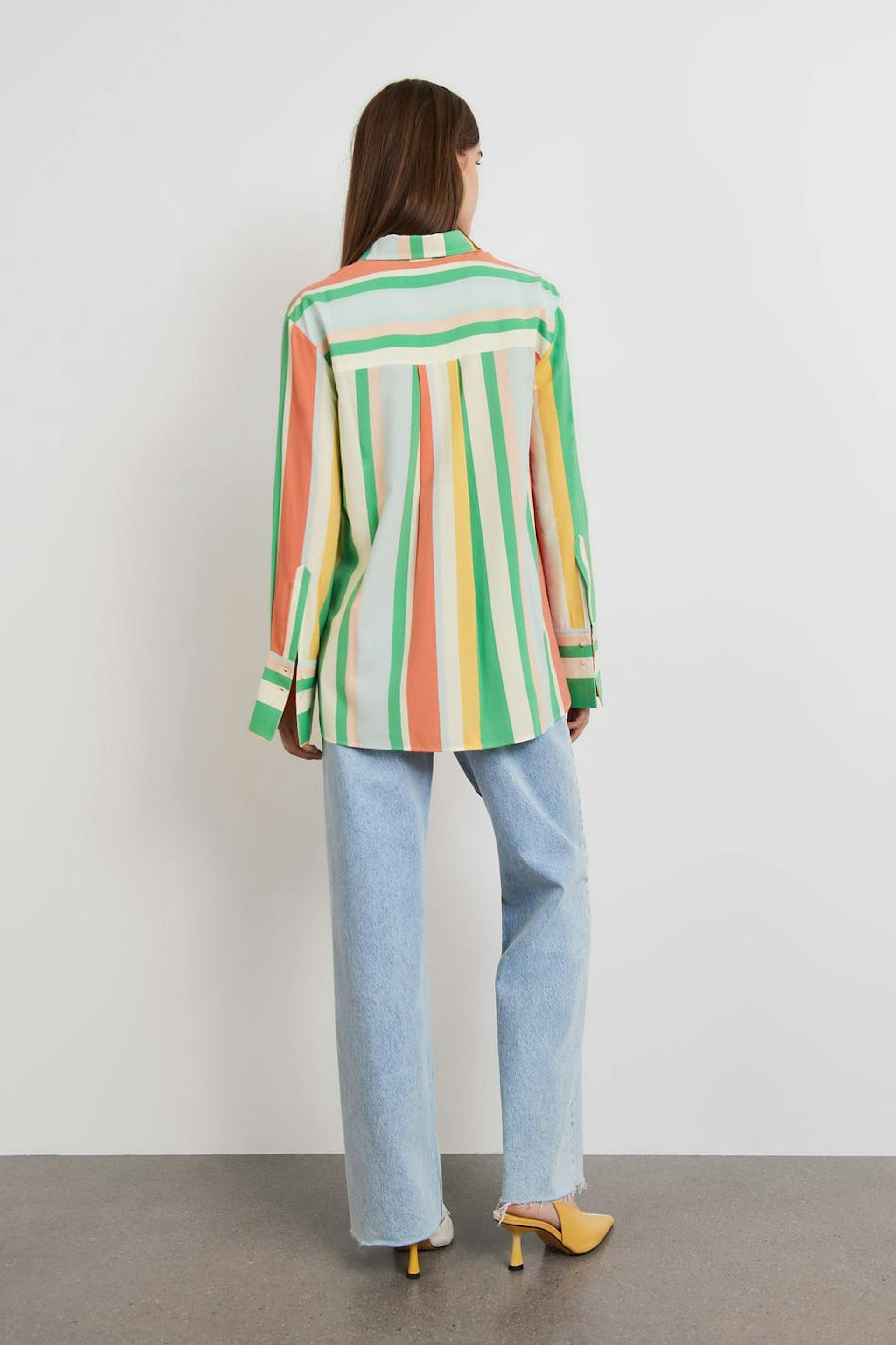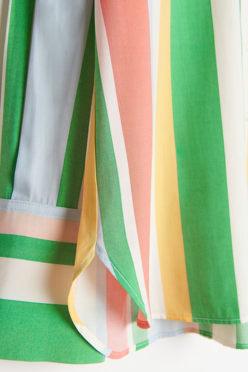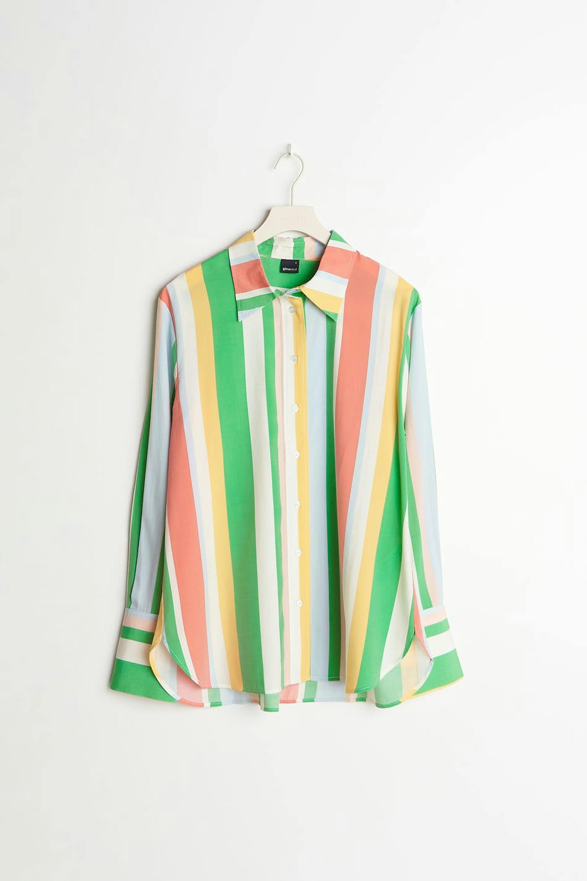 Klassisk skjorte med lige søm. Skjorten er grøn, blå og stribet. Den har knapstolpe foran, en krave og lægdetaljer ved bagsiden og på ærmerne.