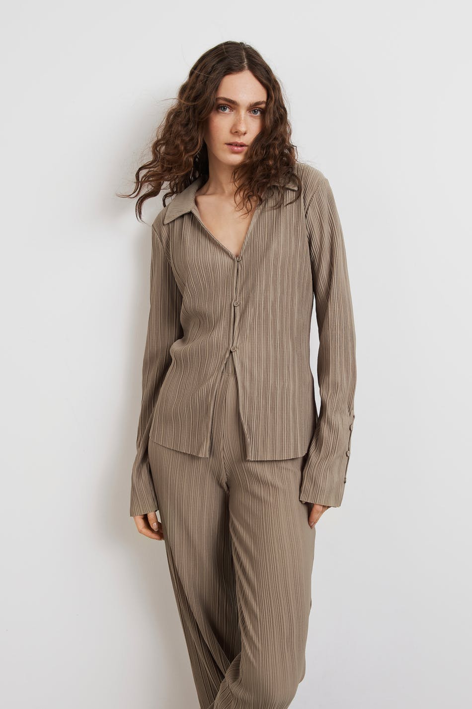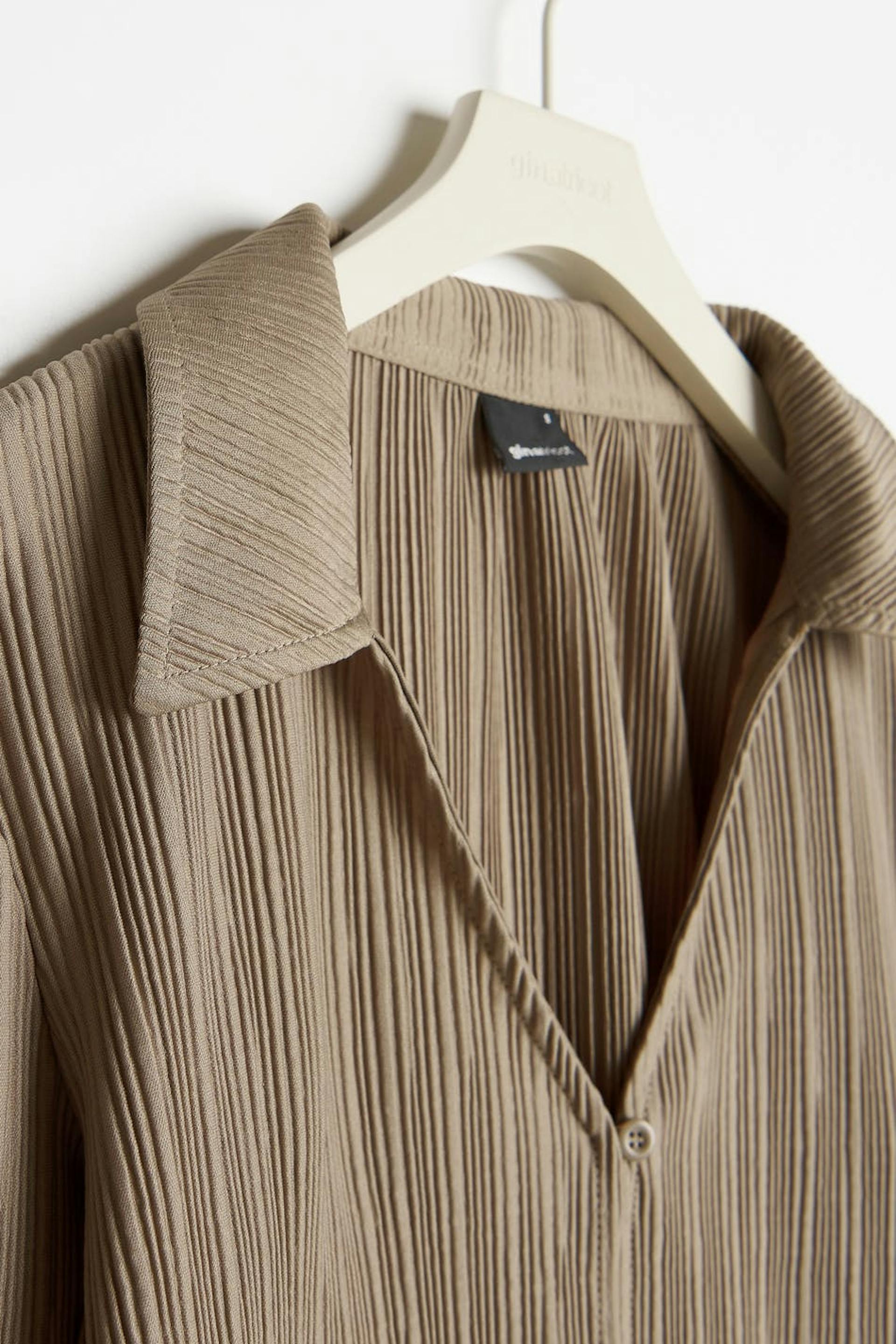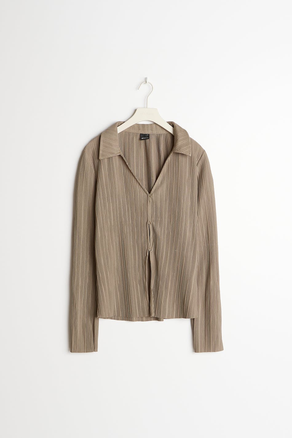 Plisseret skjorte med dyb v-udskæring. Skjorten er beige og har en normal pasform. Den har en krage, knaplukning foran og slids med knapstolpe på ærmeafslutningerne.