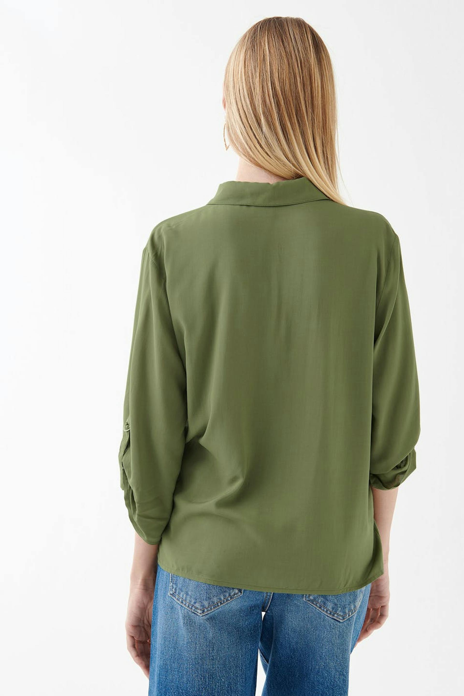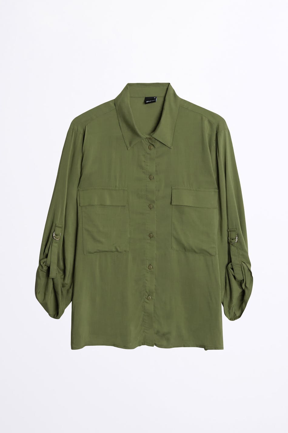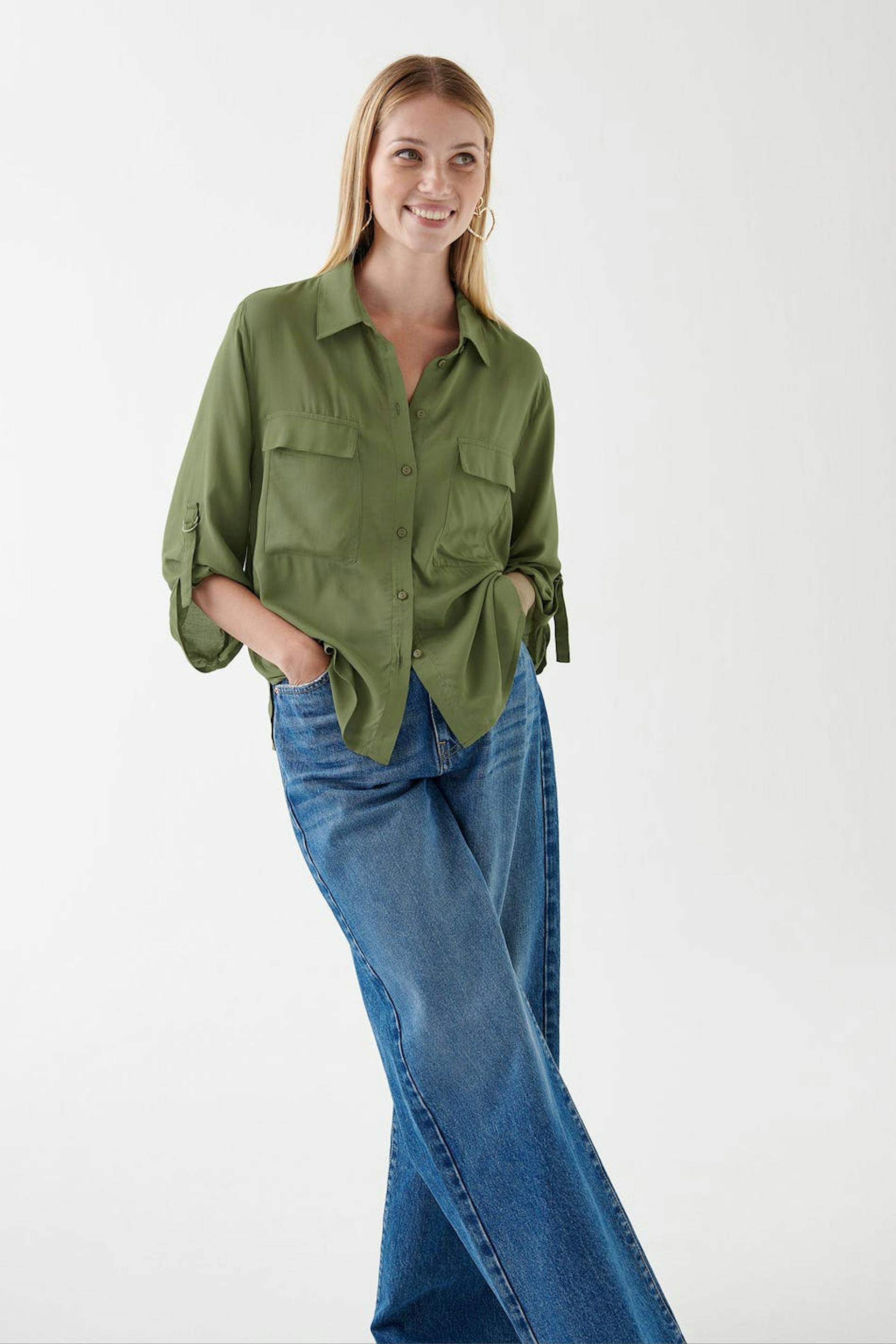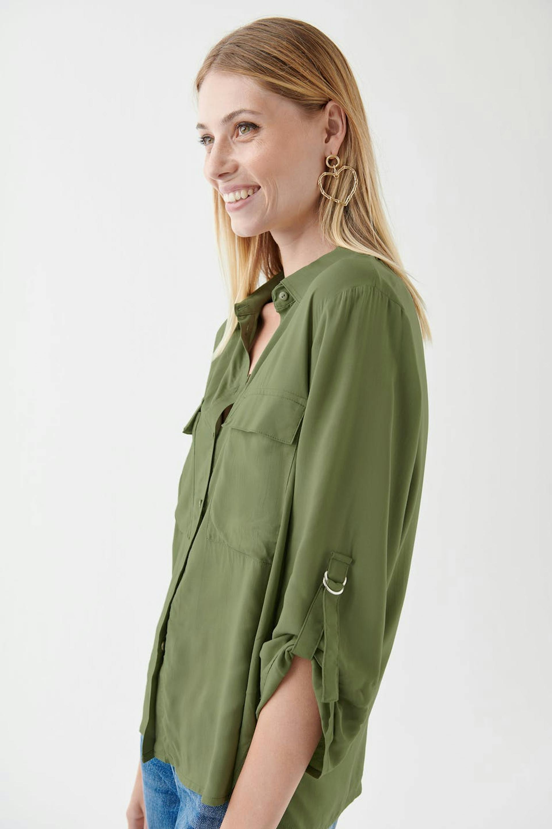 Skjorte med utility lommer foran. Skjorten er grøn og har 3/4 lange ærmer.