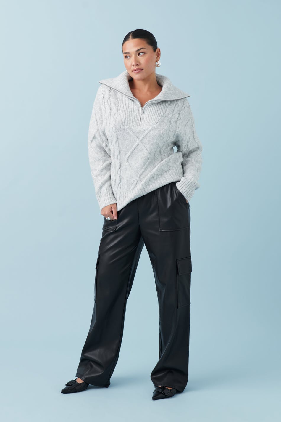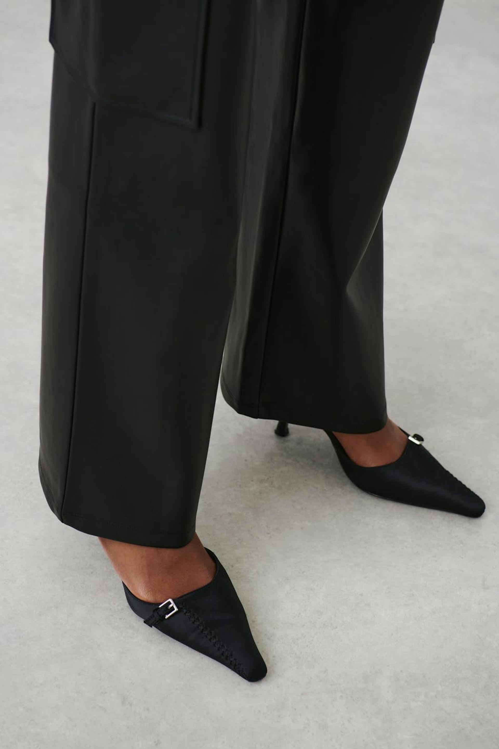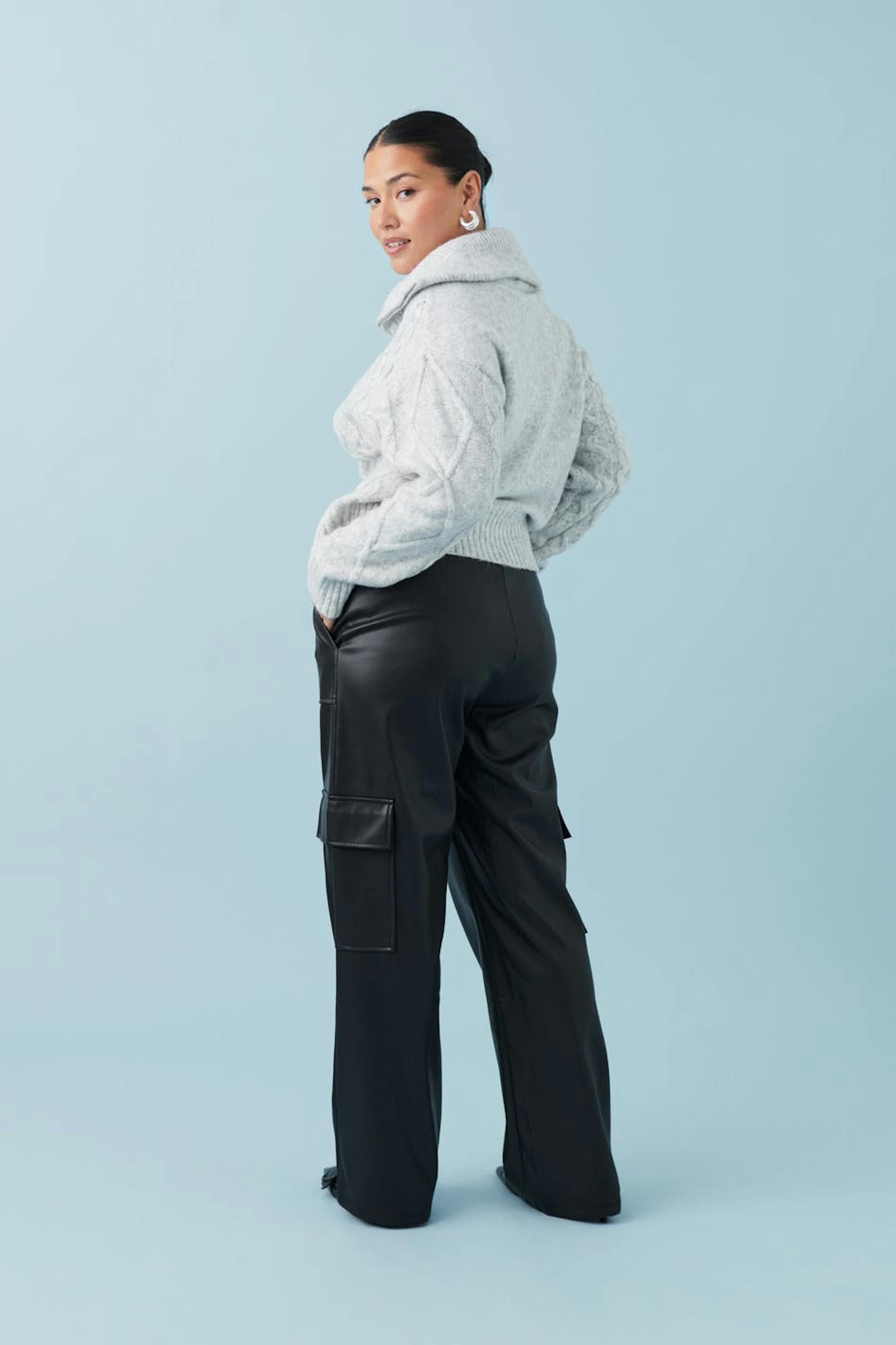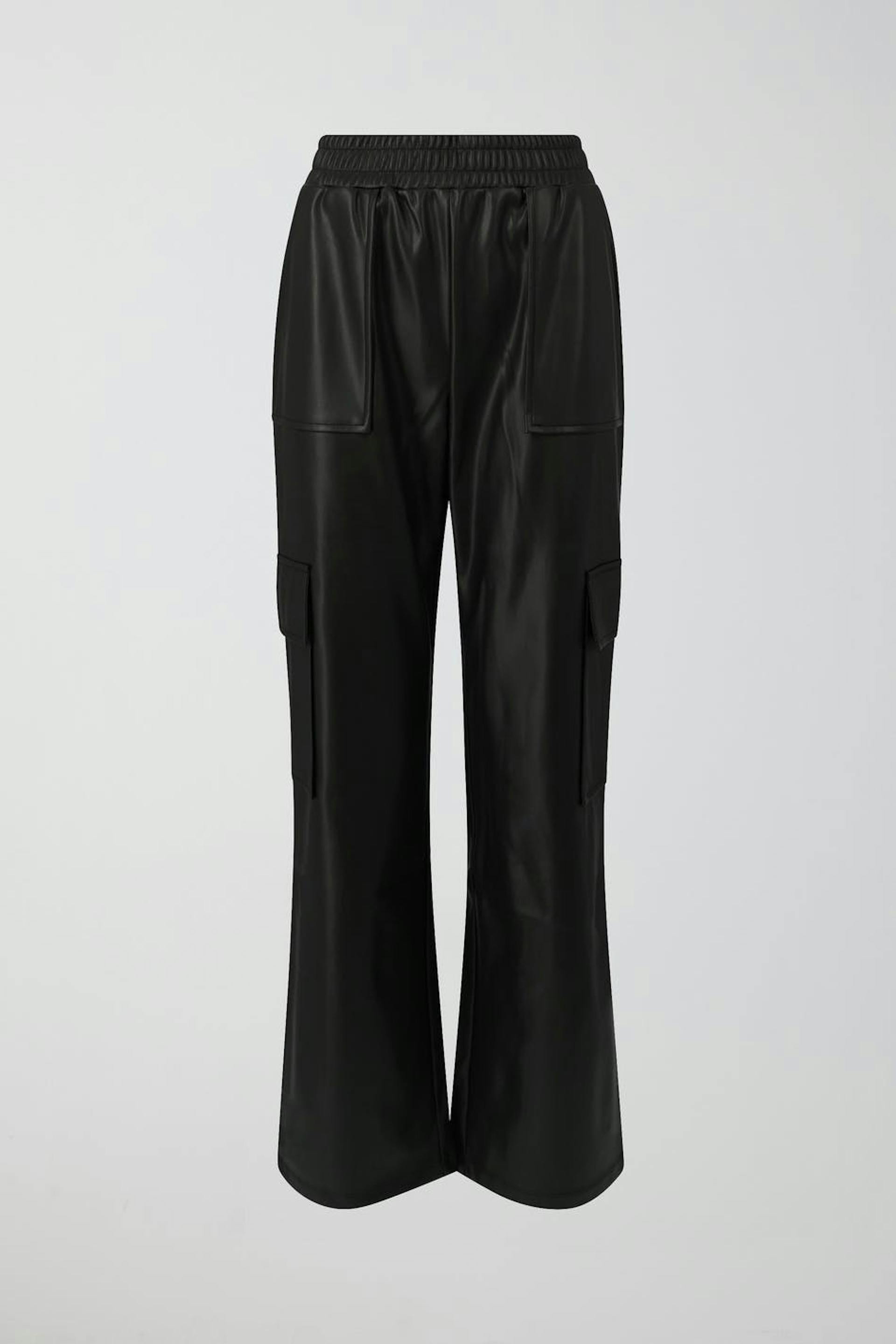 Cargobukser i imiteret læder med vide ben. Bukserne er sorte og har normal pasform. De har sidelommer og elastik ved taljen.