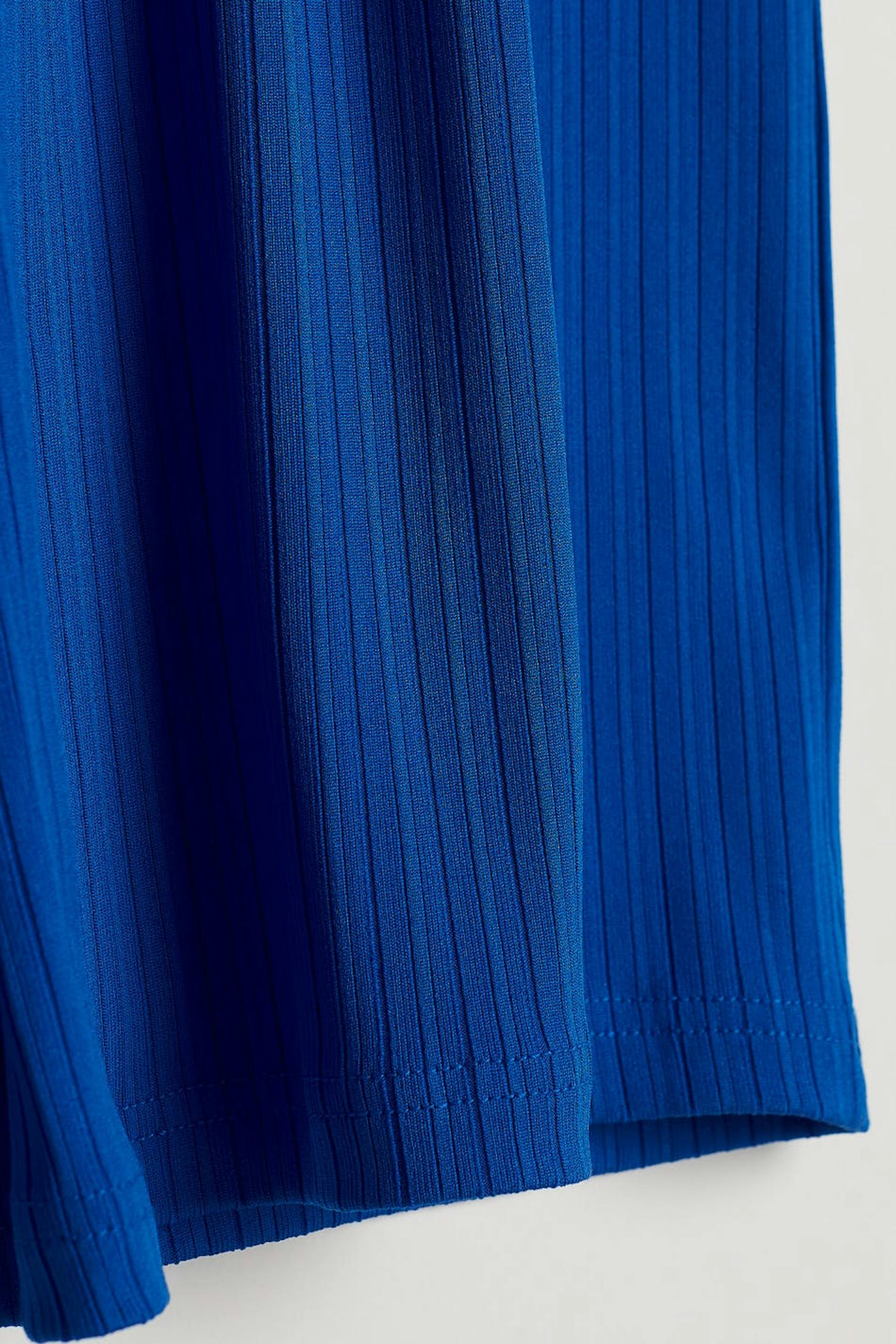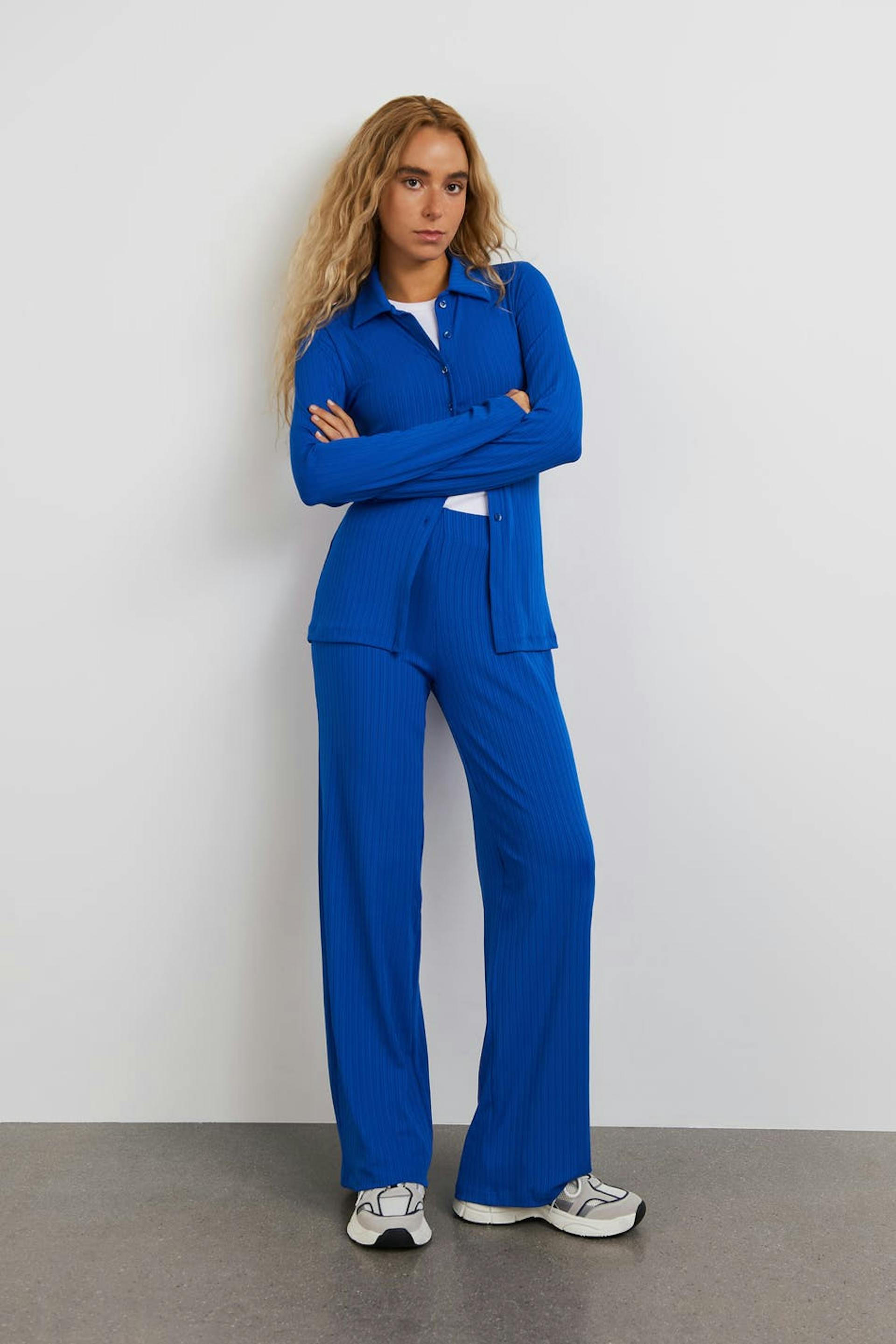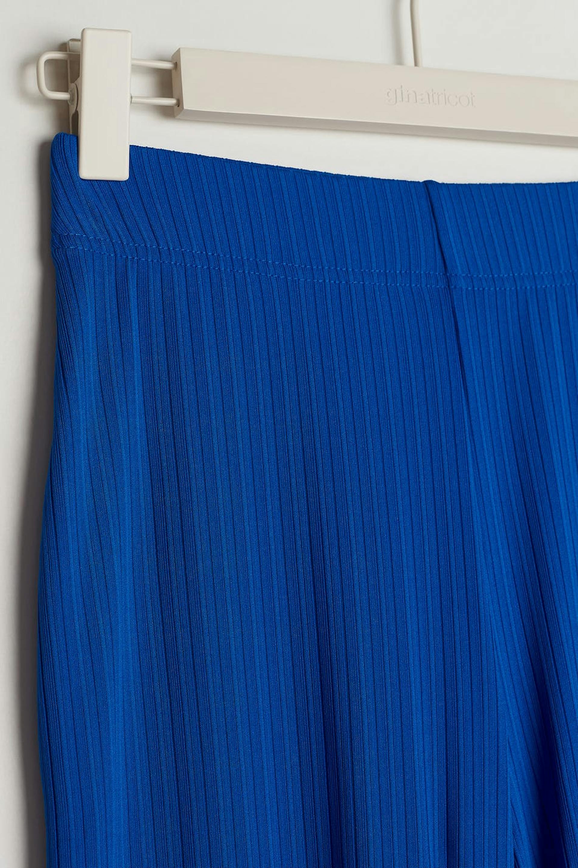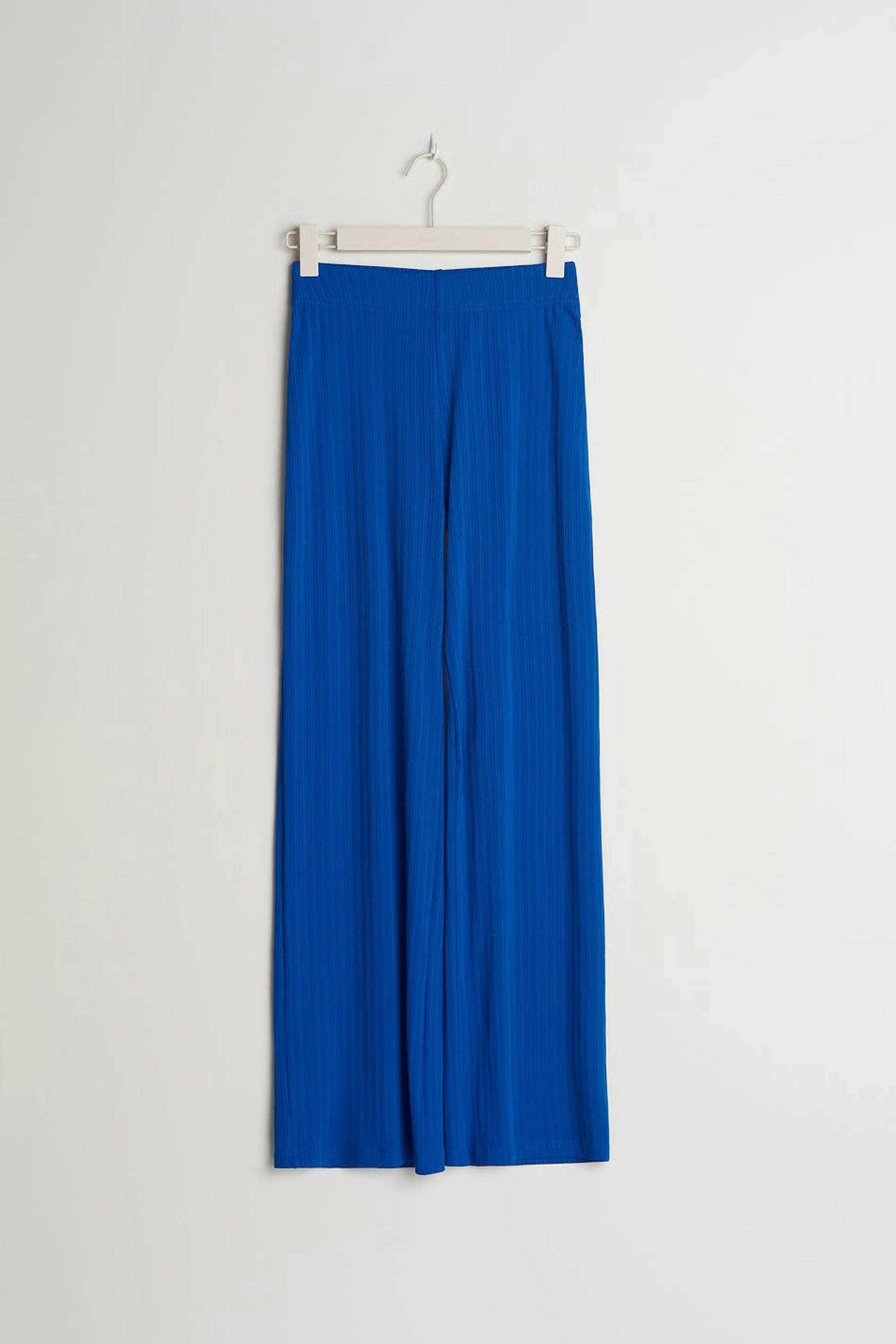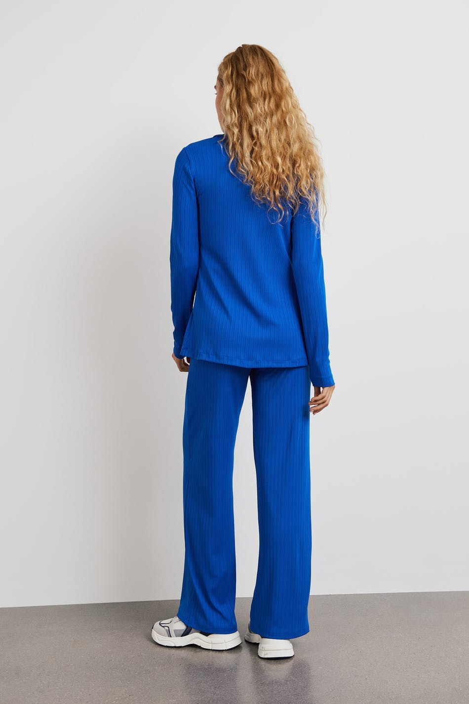 Ribbede bukser med en figursyet pasform. Bukserne er blå og har lange bukseben. De har et blødt elastisk bånd ved taljen.