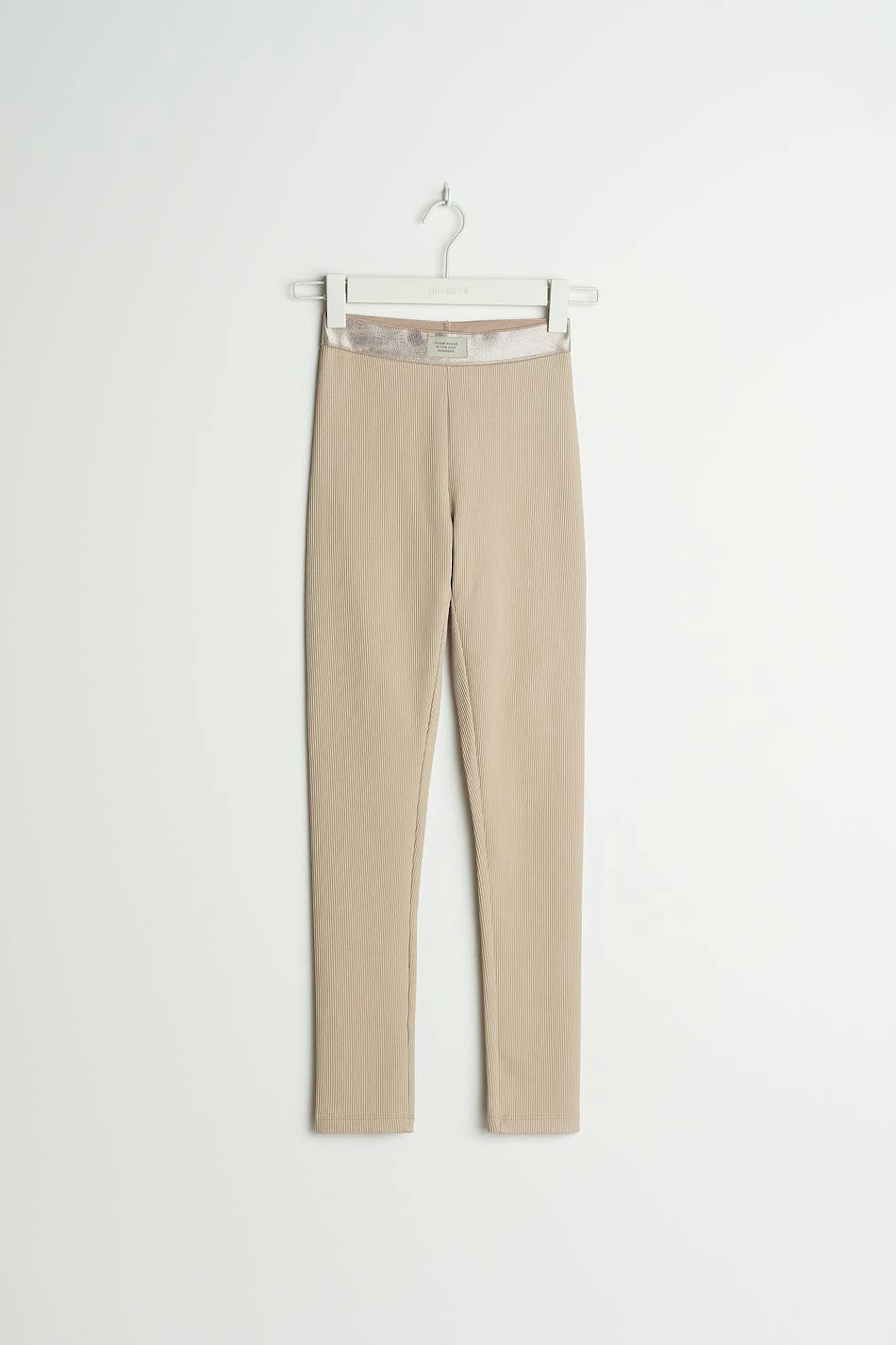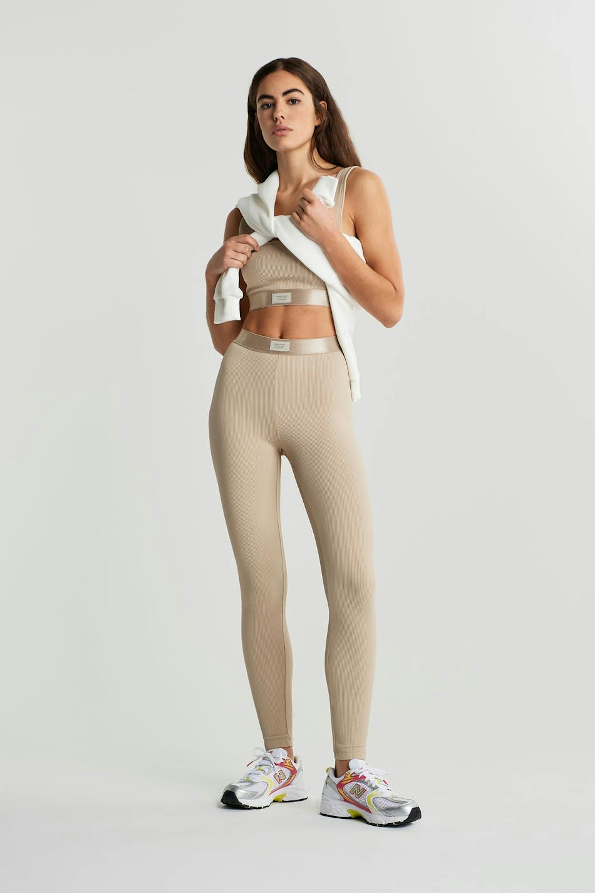 Bløde leggings med en figursyet pasform. Leggingsene er beige og ribbede og har et elastisk bånd ved taljen.