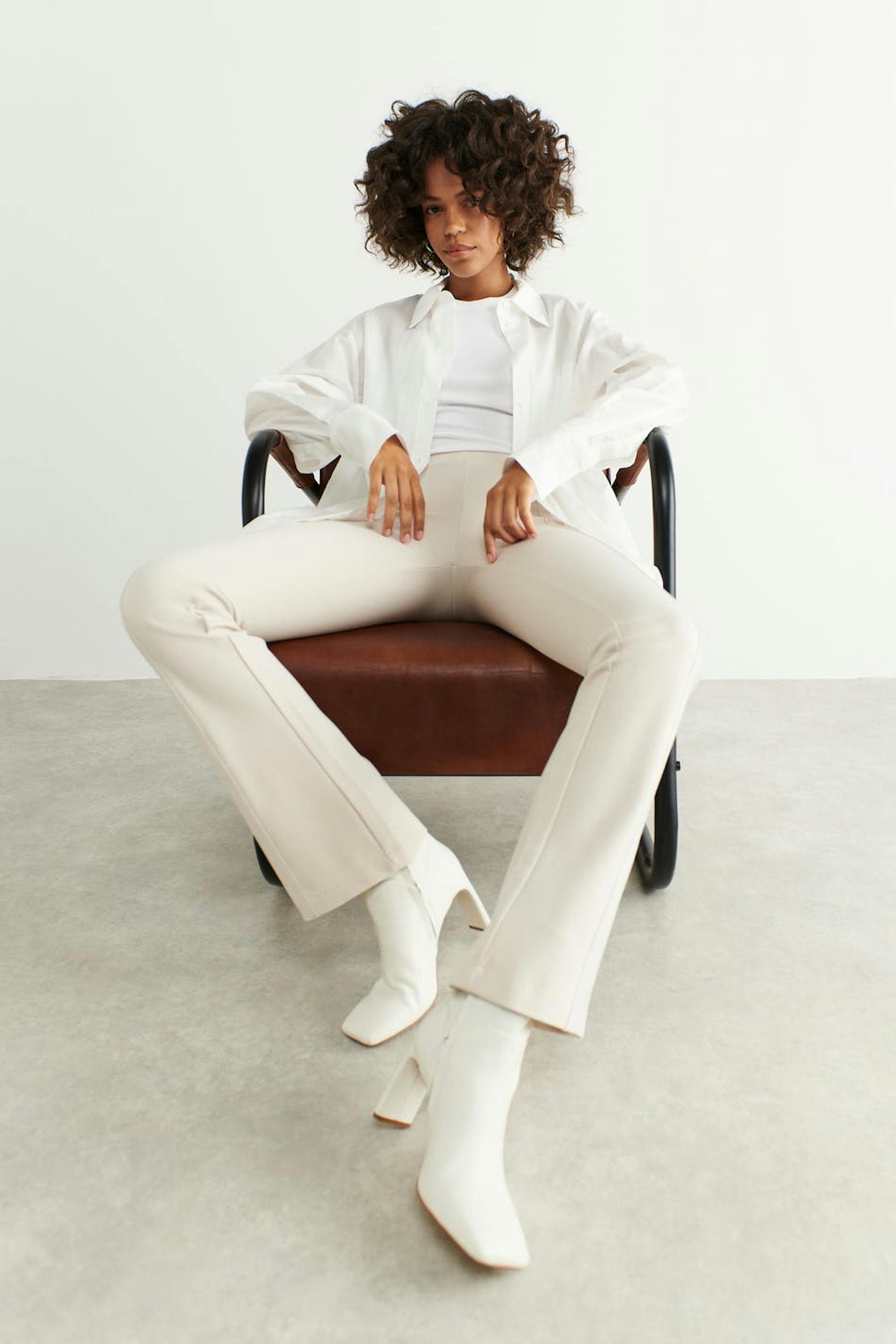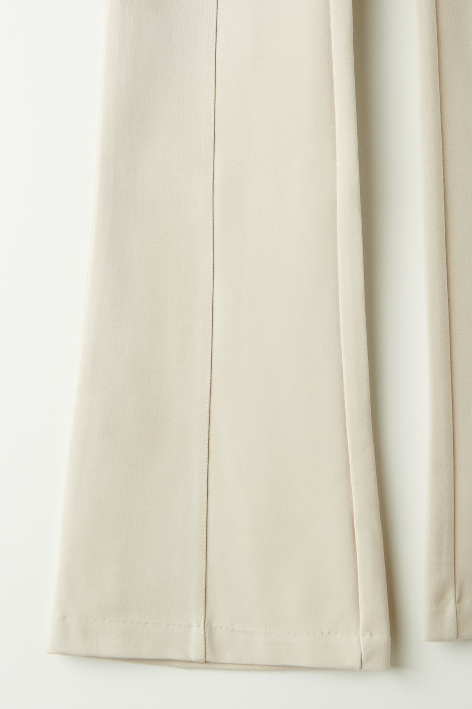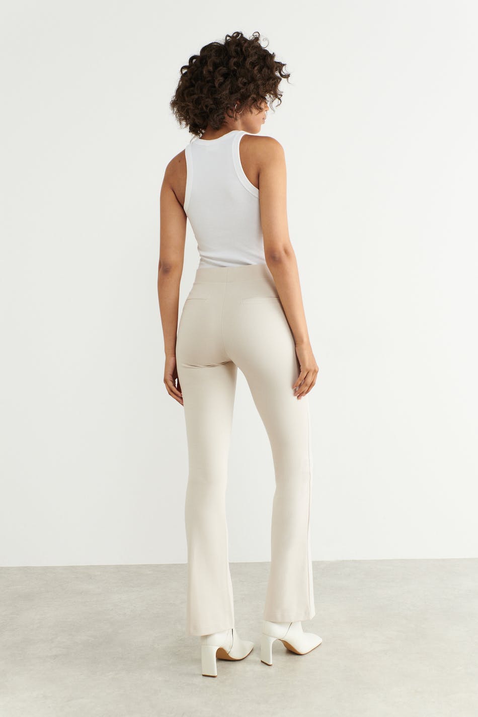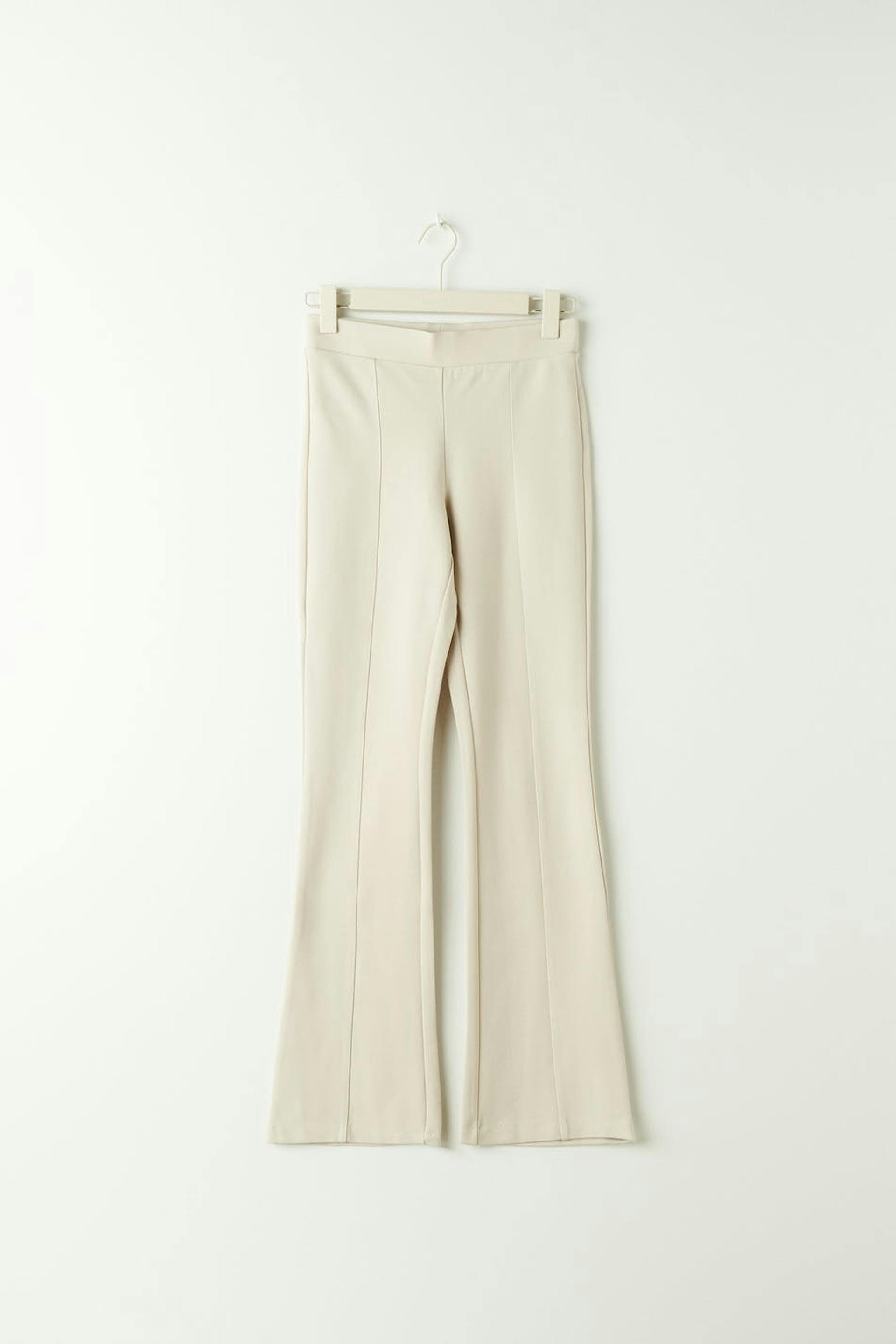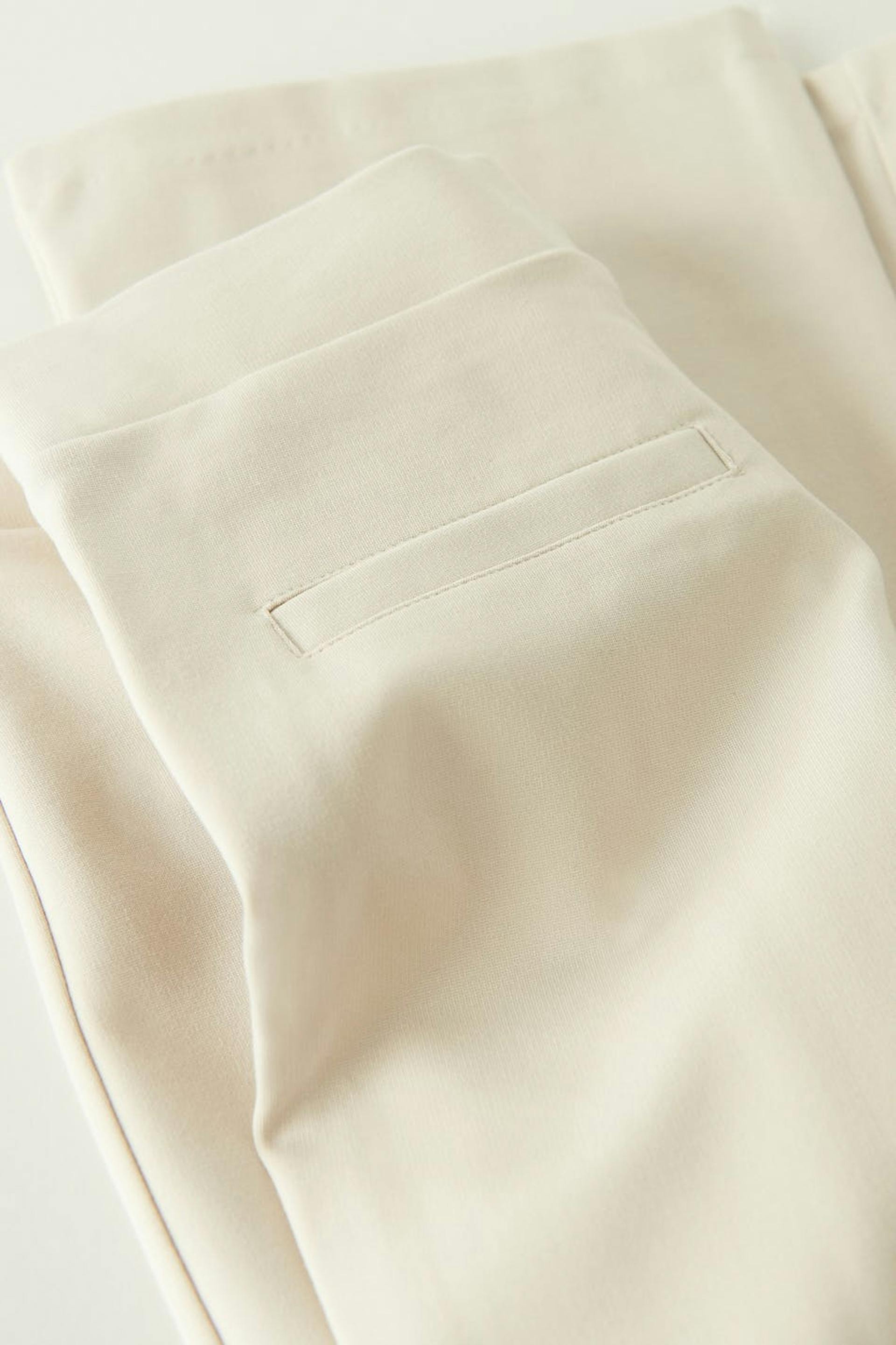 Bukser med svaj i jersey med blød elastik ved taljen. Bukserne er beige og har paspolerete lommer bagpå.