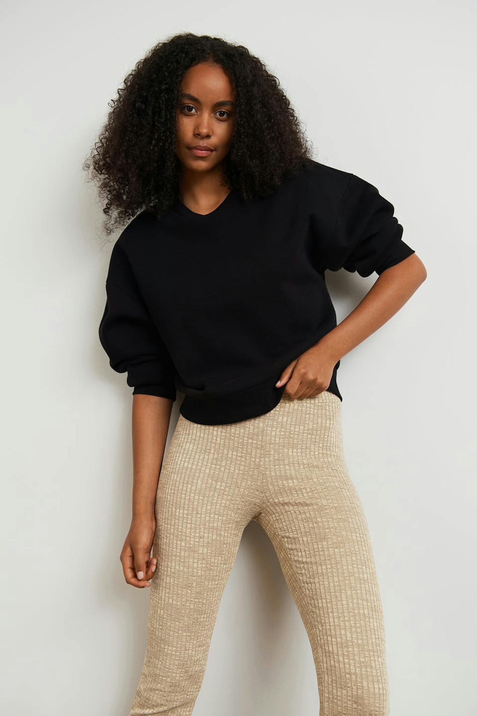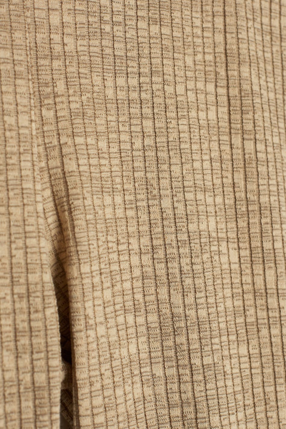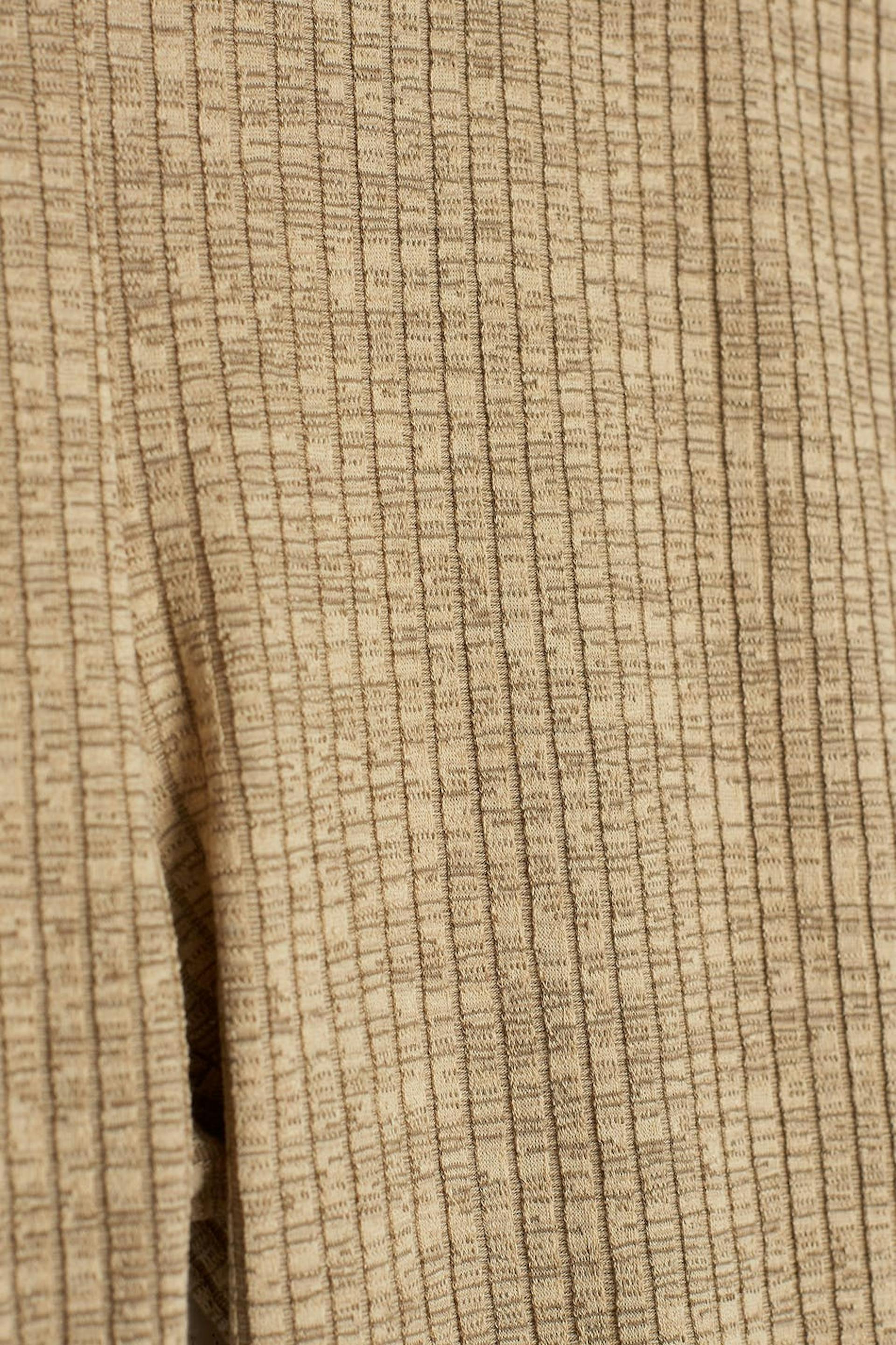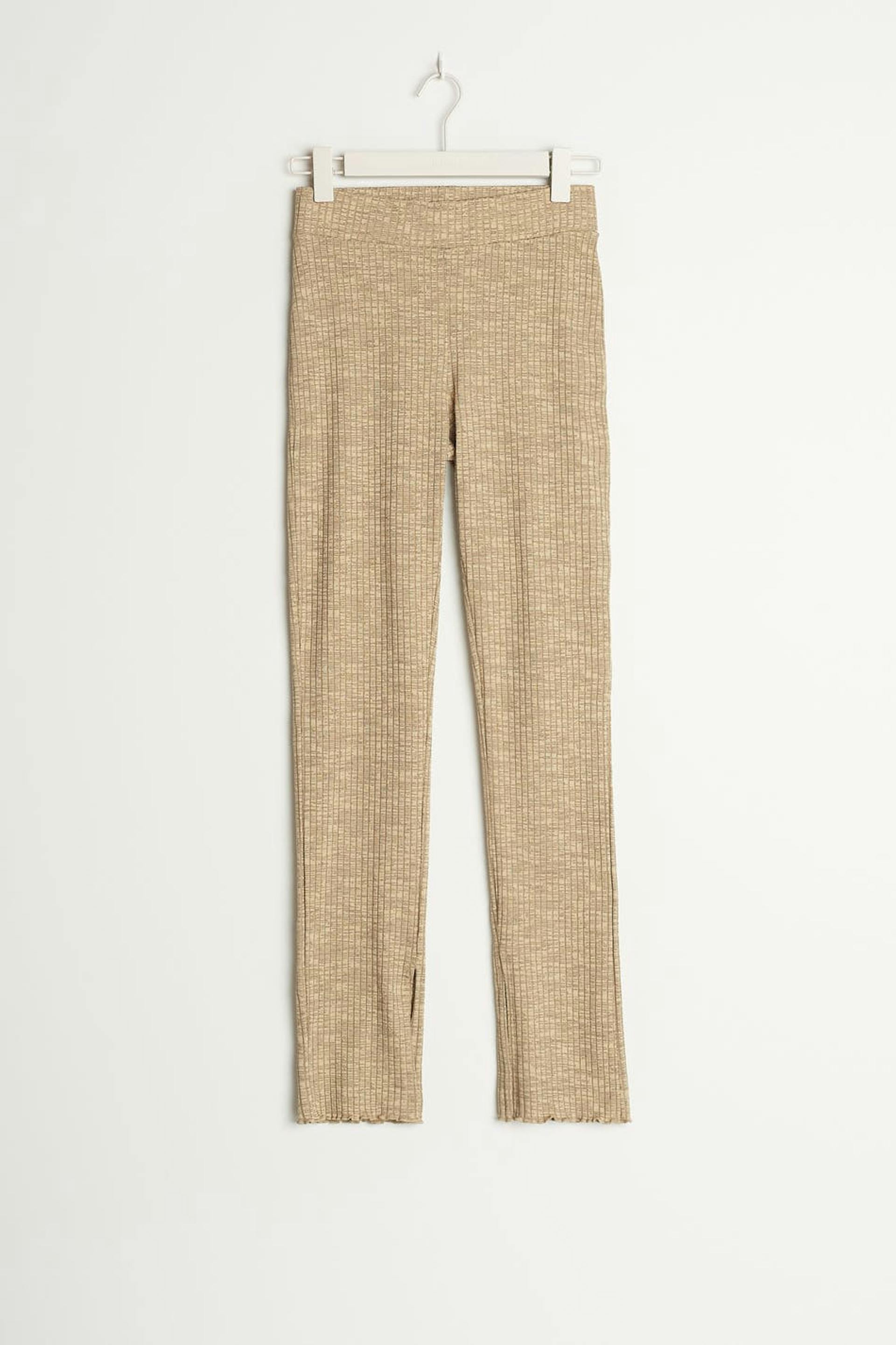 Ribbede bukser med en normal pasform. Bukserne er beige og har en høj talje. De har en elastik ved taljen, små volanter ved enden af benene og en slids på indersiden af benet.