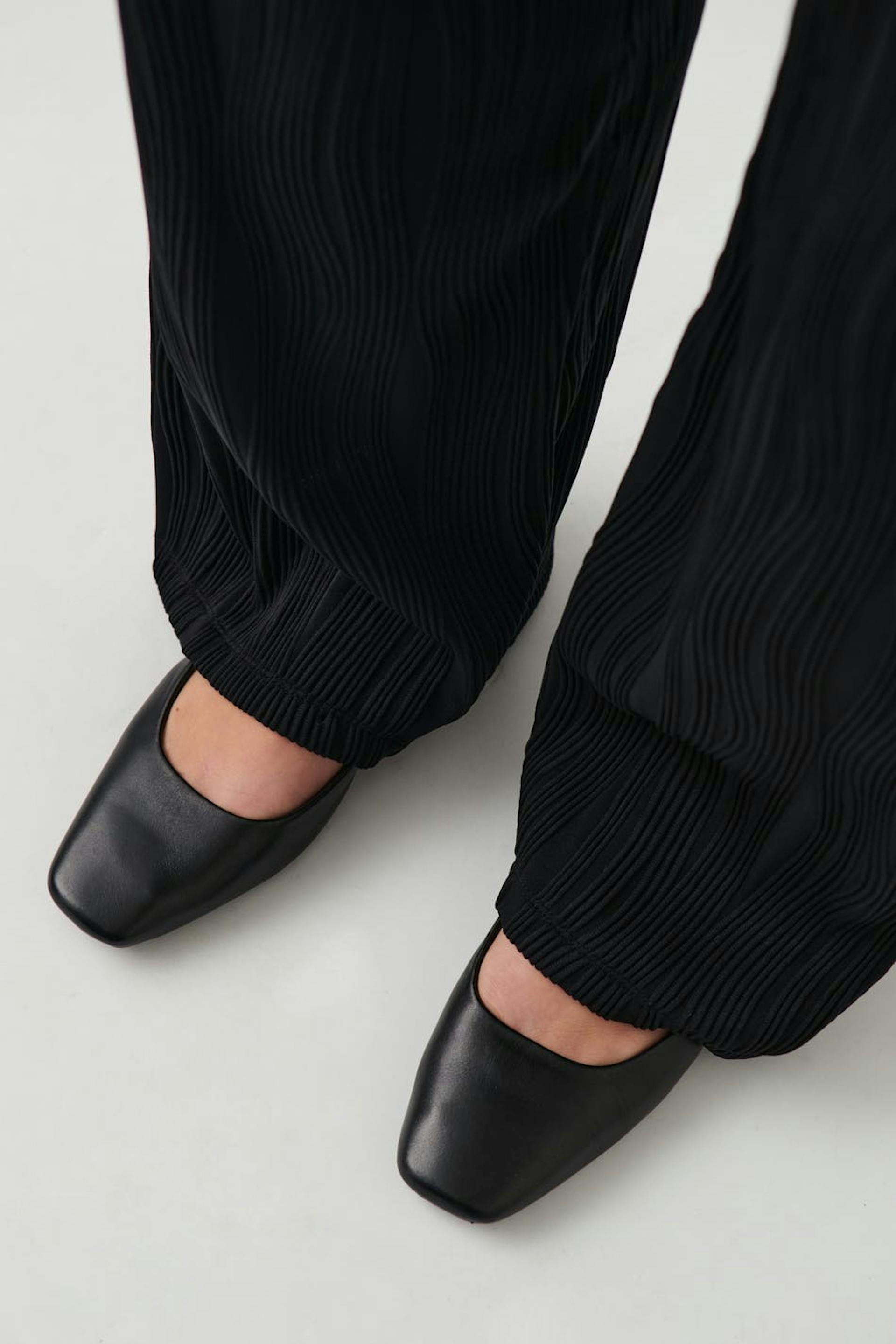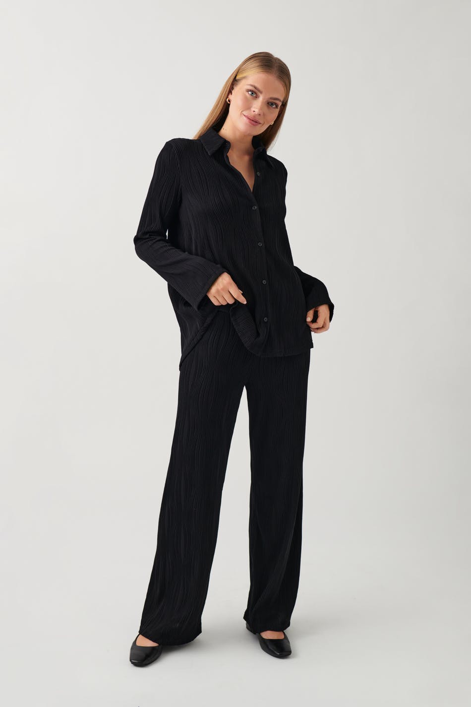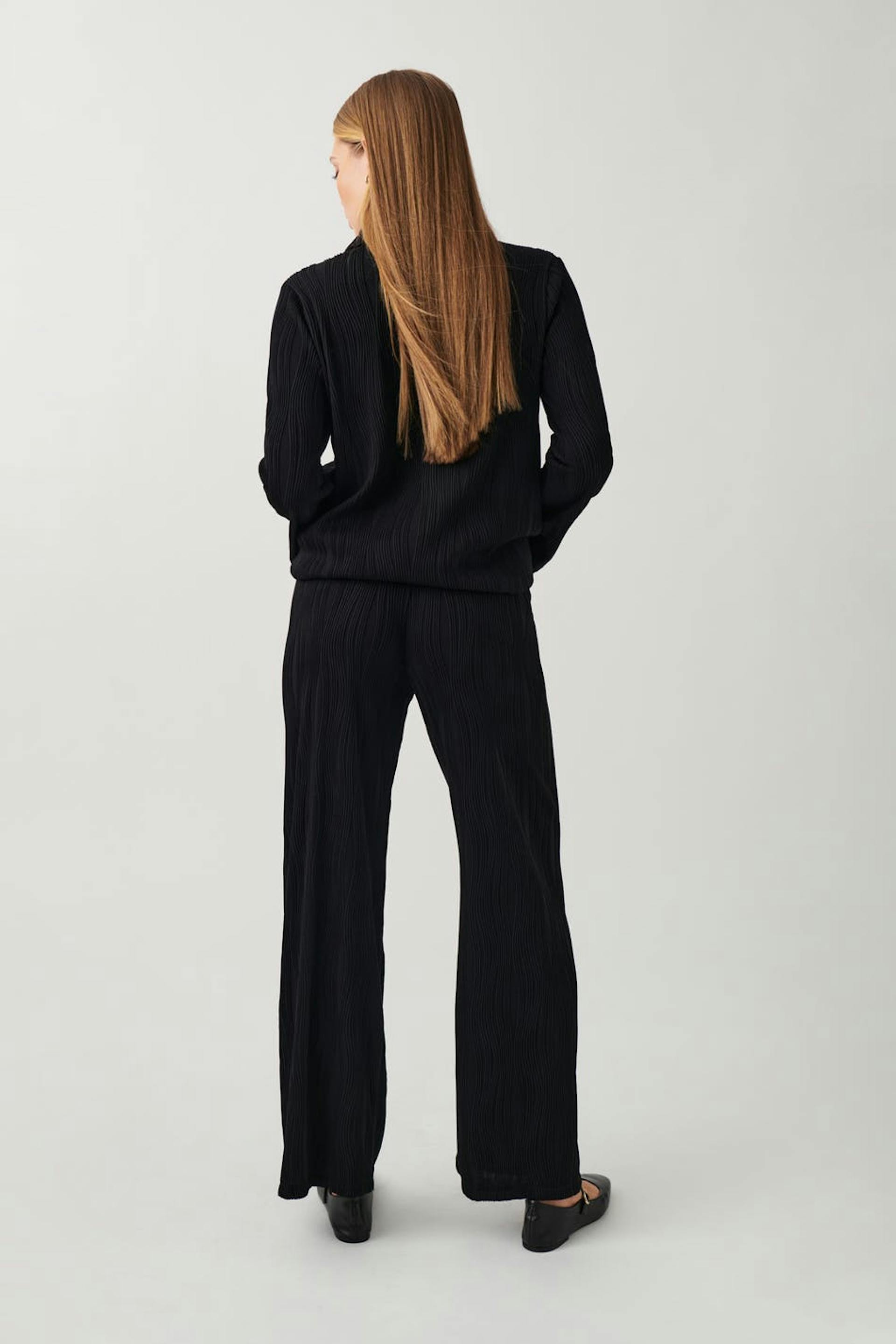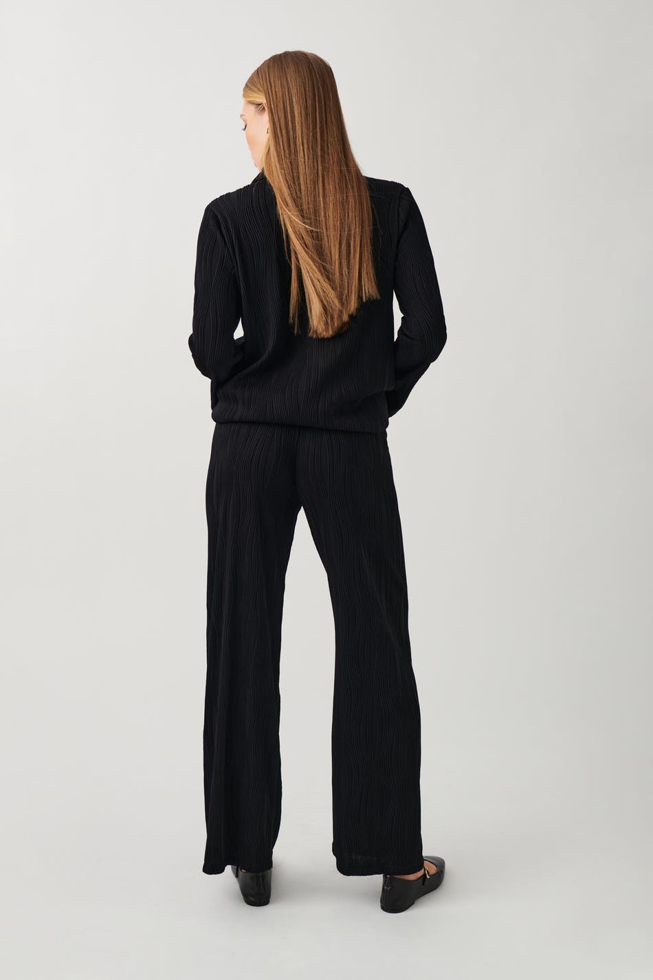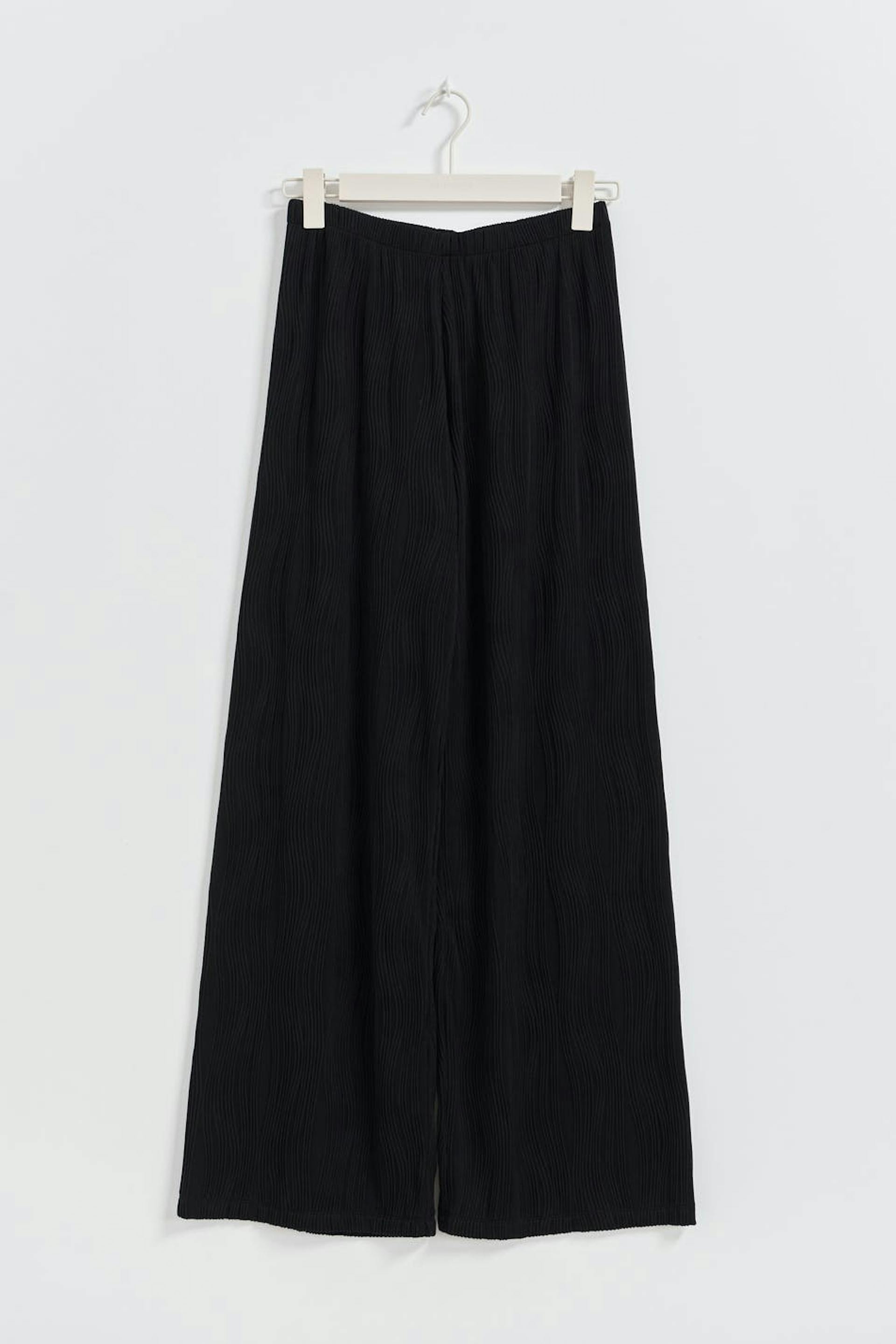 Brede bukser i jersey med struktureret materiale. Bukserne er sorte og har normal talje. De har blød elastik ved taljen og normal længde.