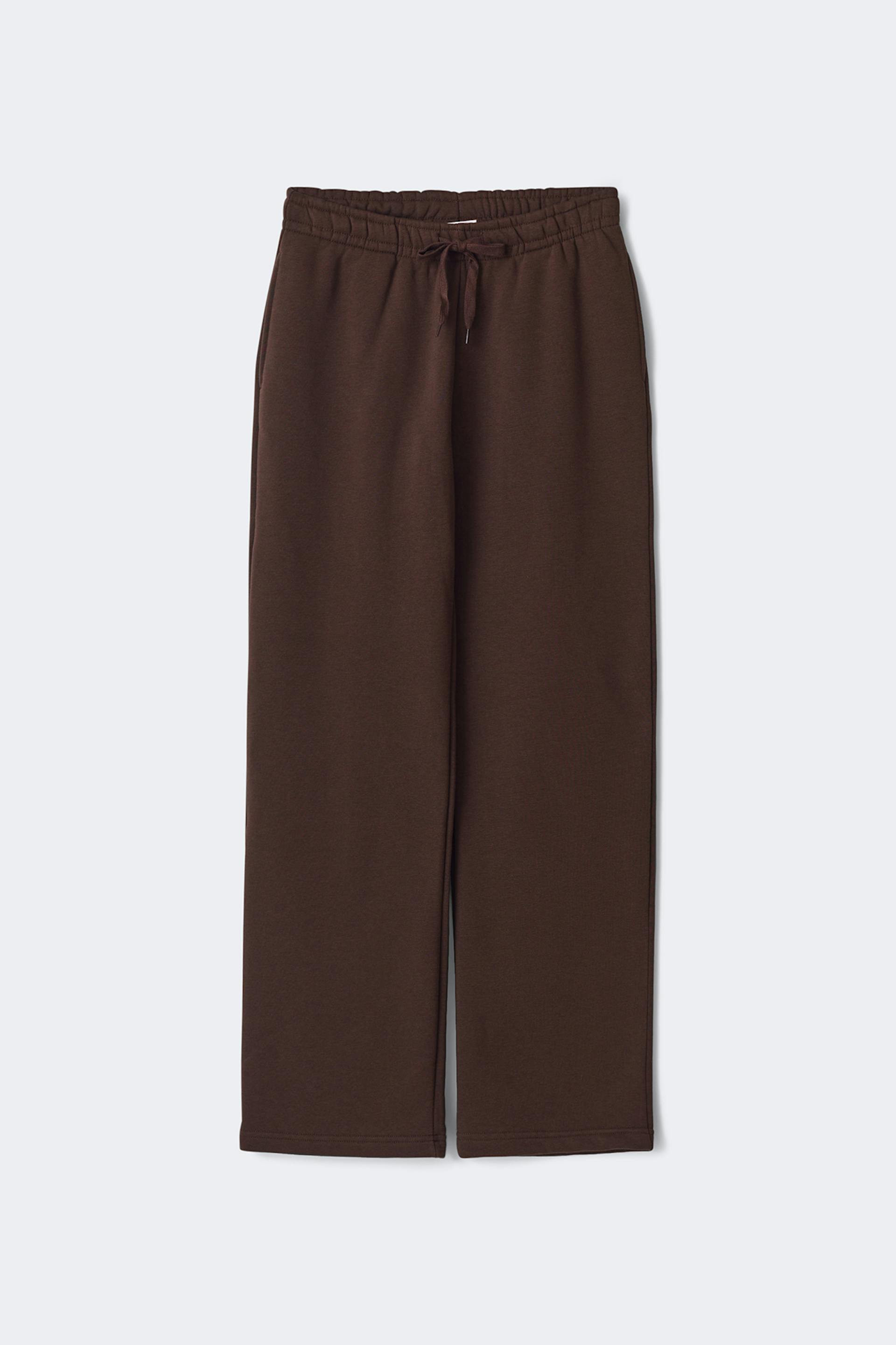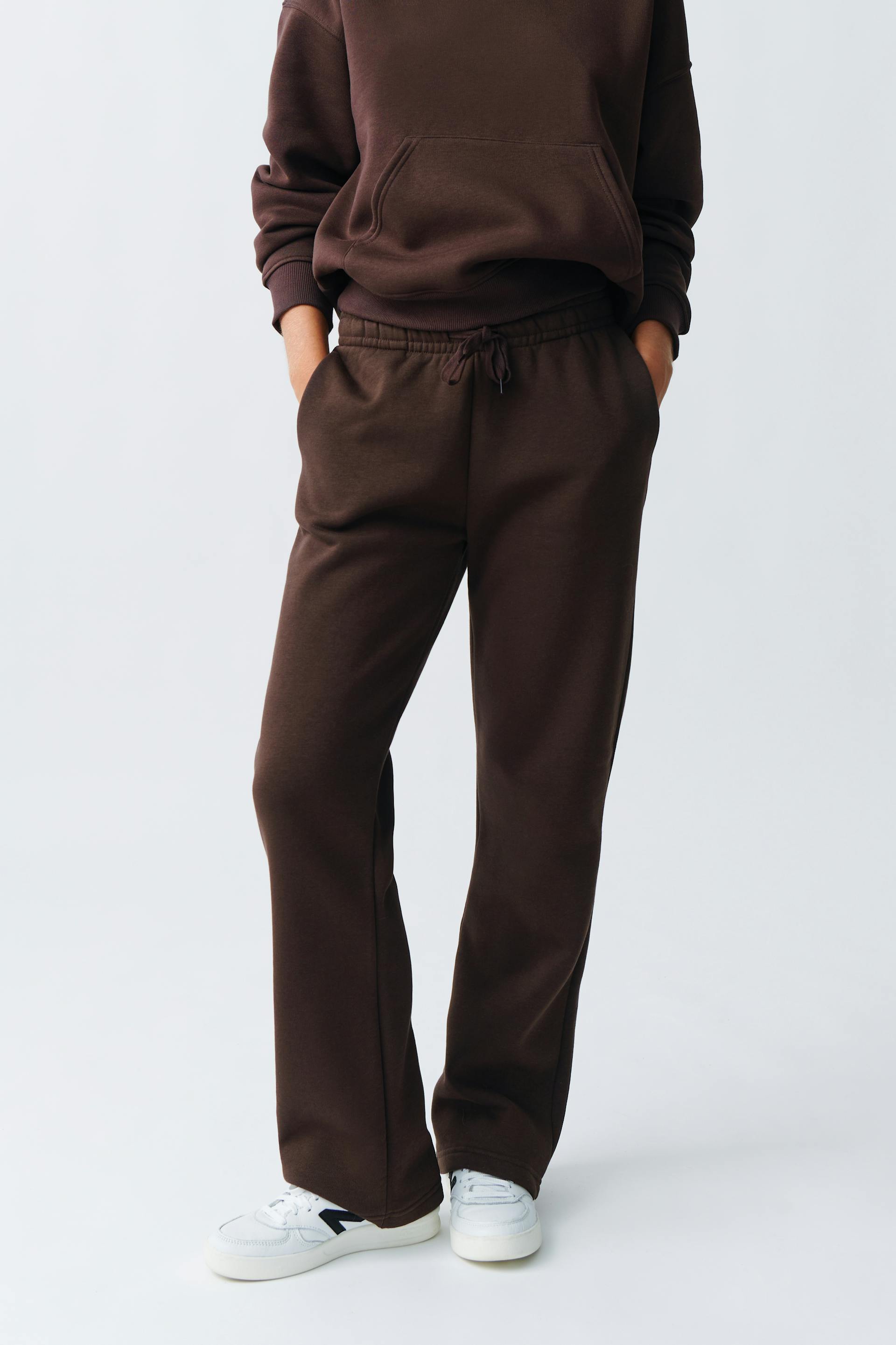 Træningsbukser med normal pasform. Bukserne er brune og har lommer i siderne. De har lige bener og elastik ved taljen med bindbart bånd ved fronten.