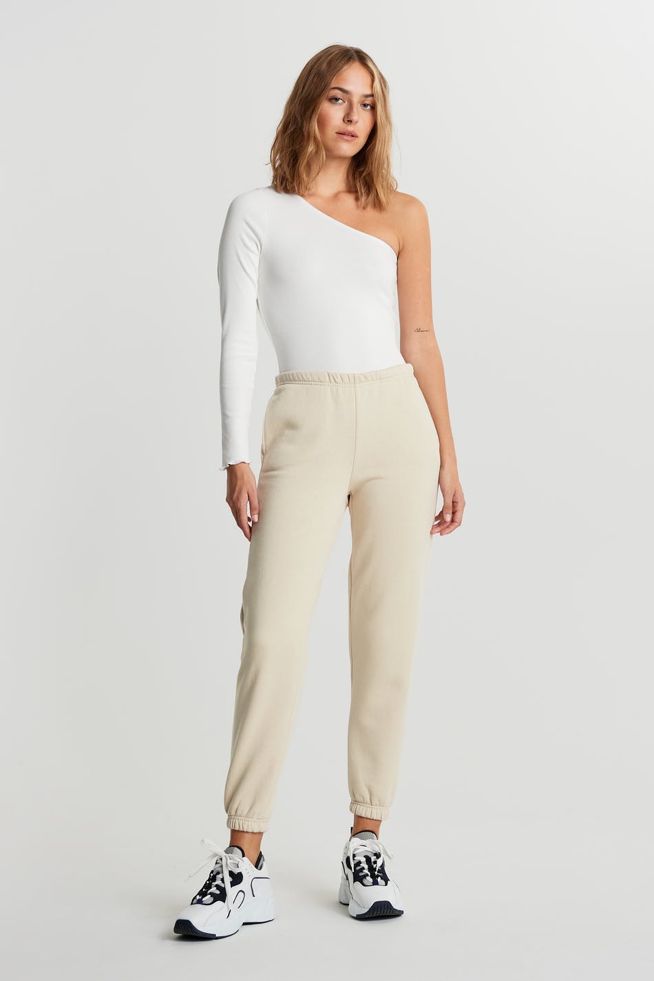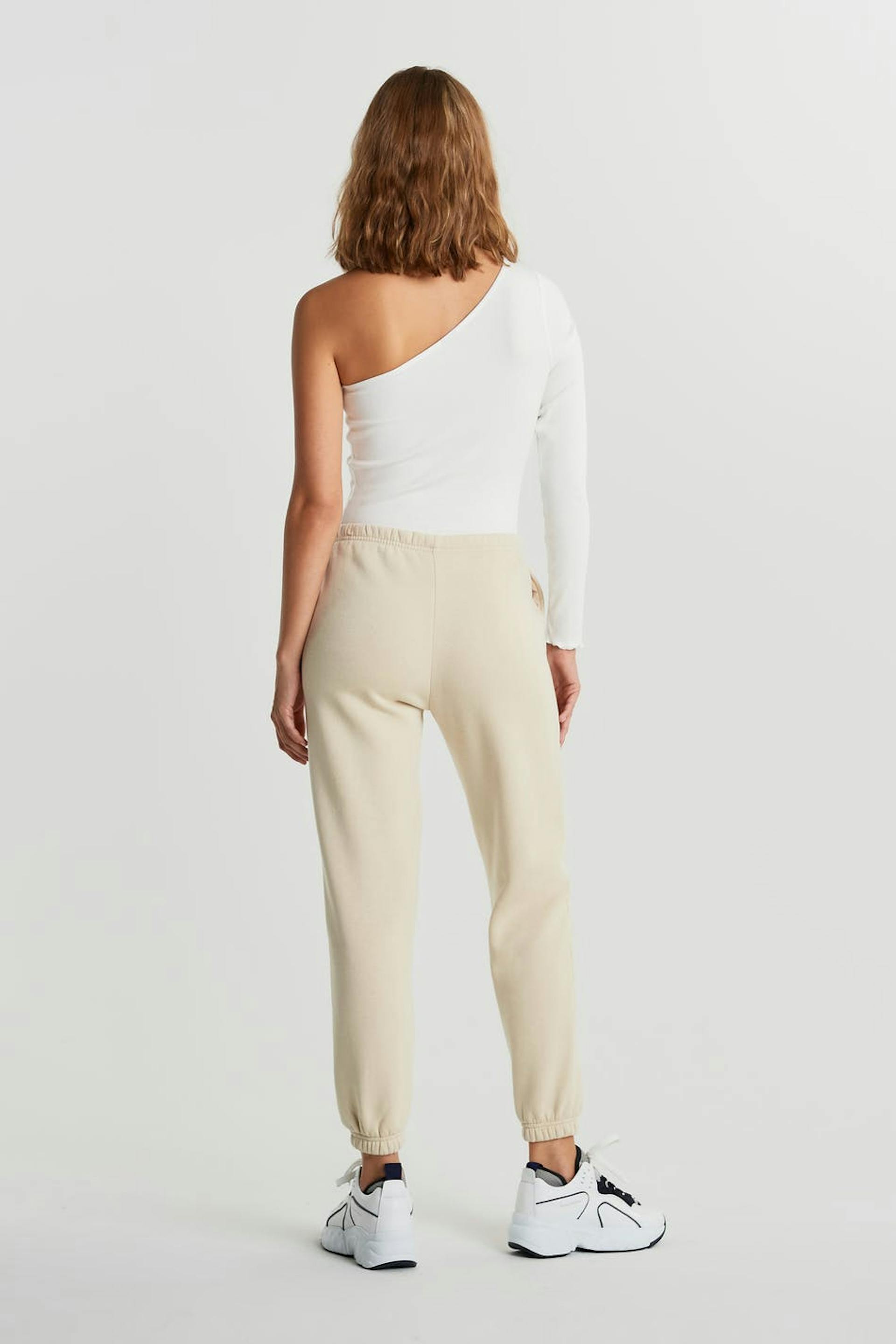 Hyggelige træningsbukser med en normal pasform. Bukserne er beige og har et elastisk bånd ved taljen og ved enden af benene.