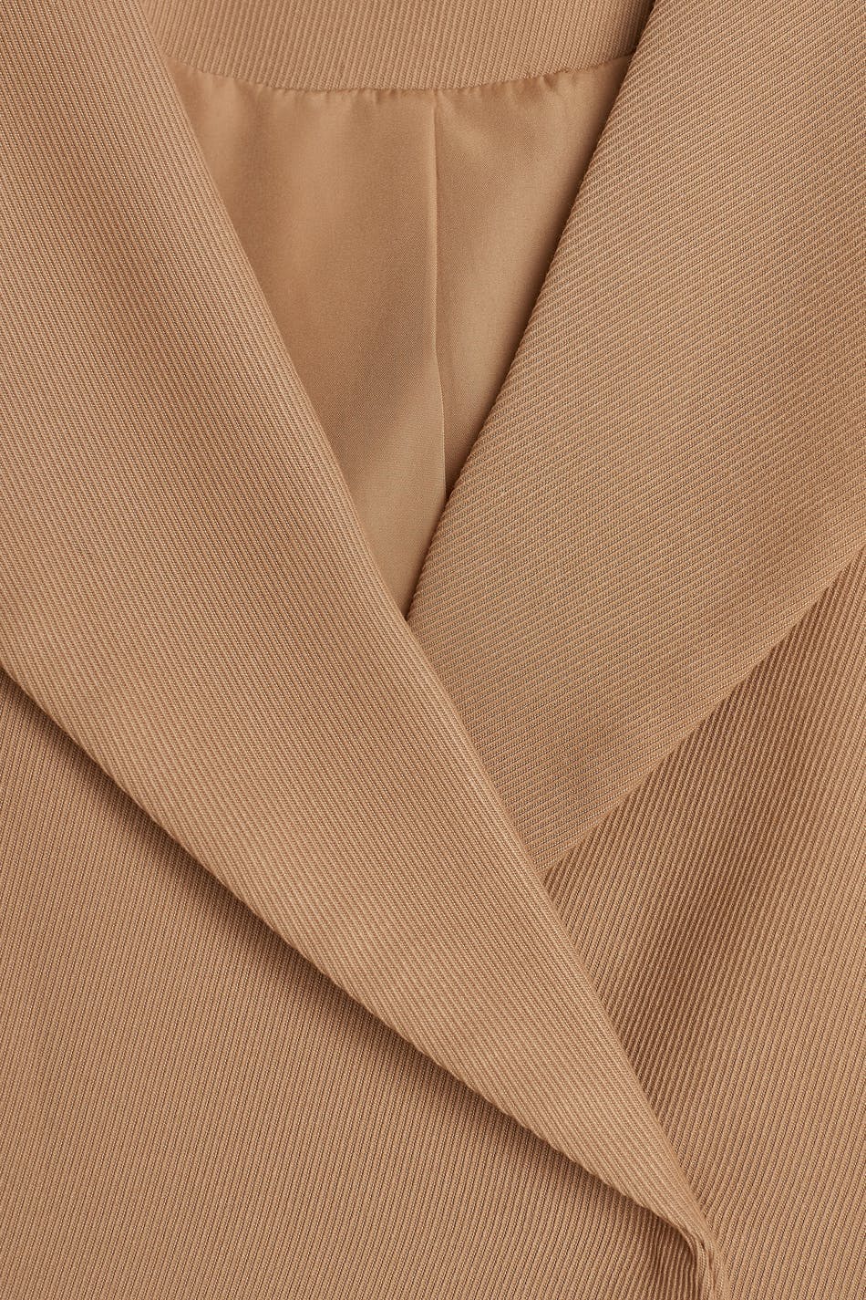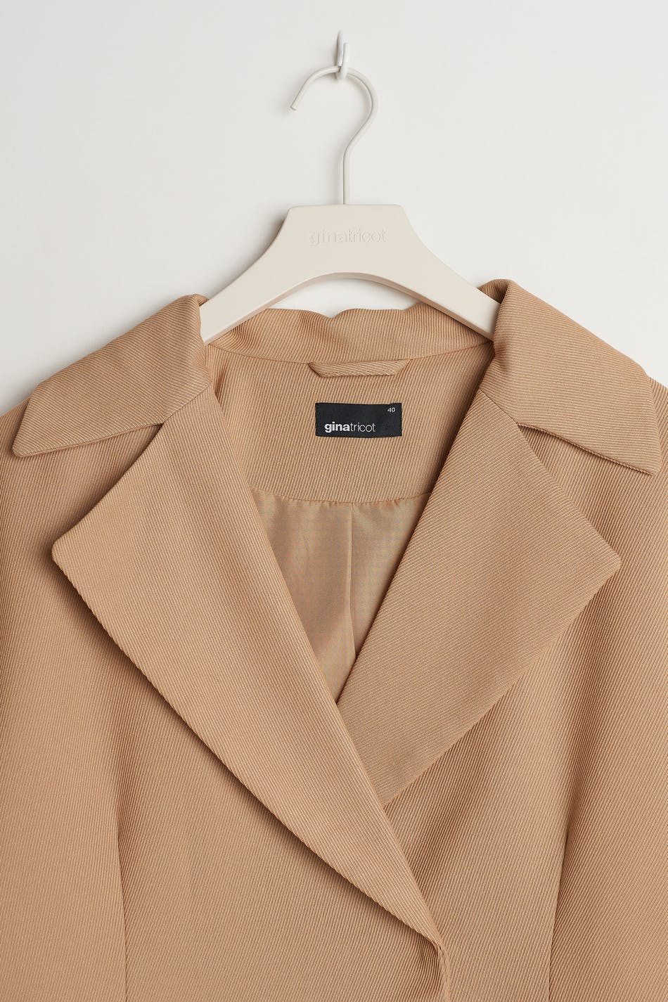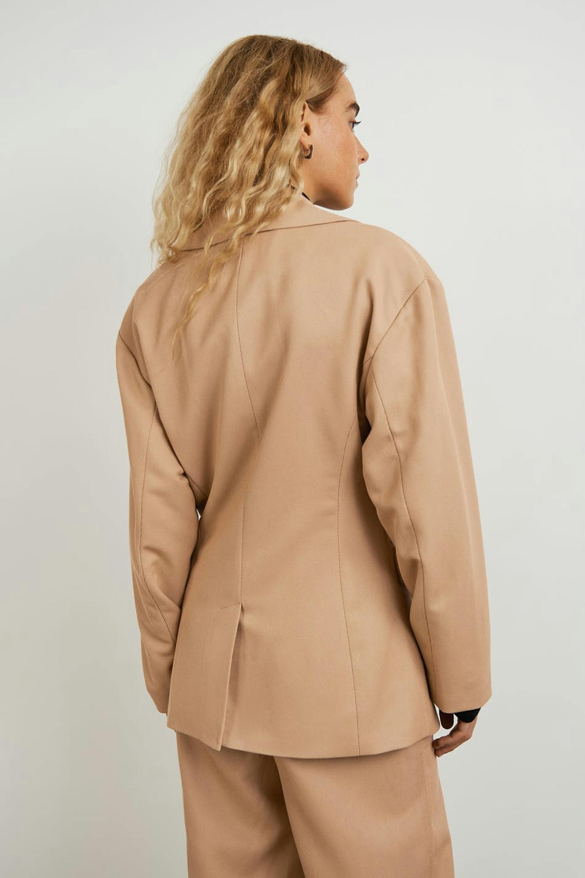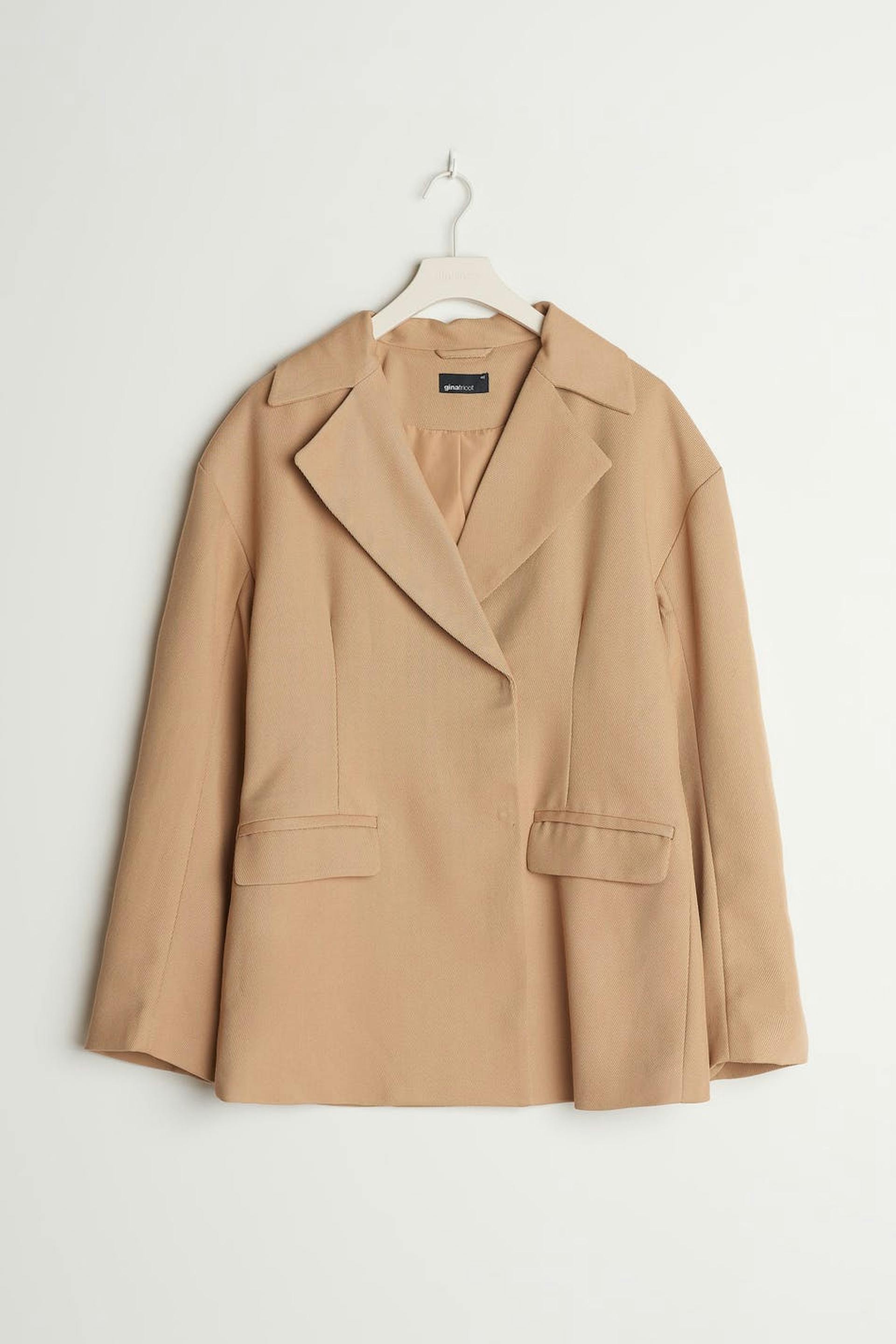 Let figursyet habitjakke med en krage. Habitjakken er beige og har paspolerede lommer med låg ved fronten. Den har en slids ved bagsiden.
