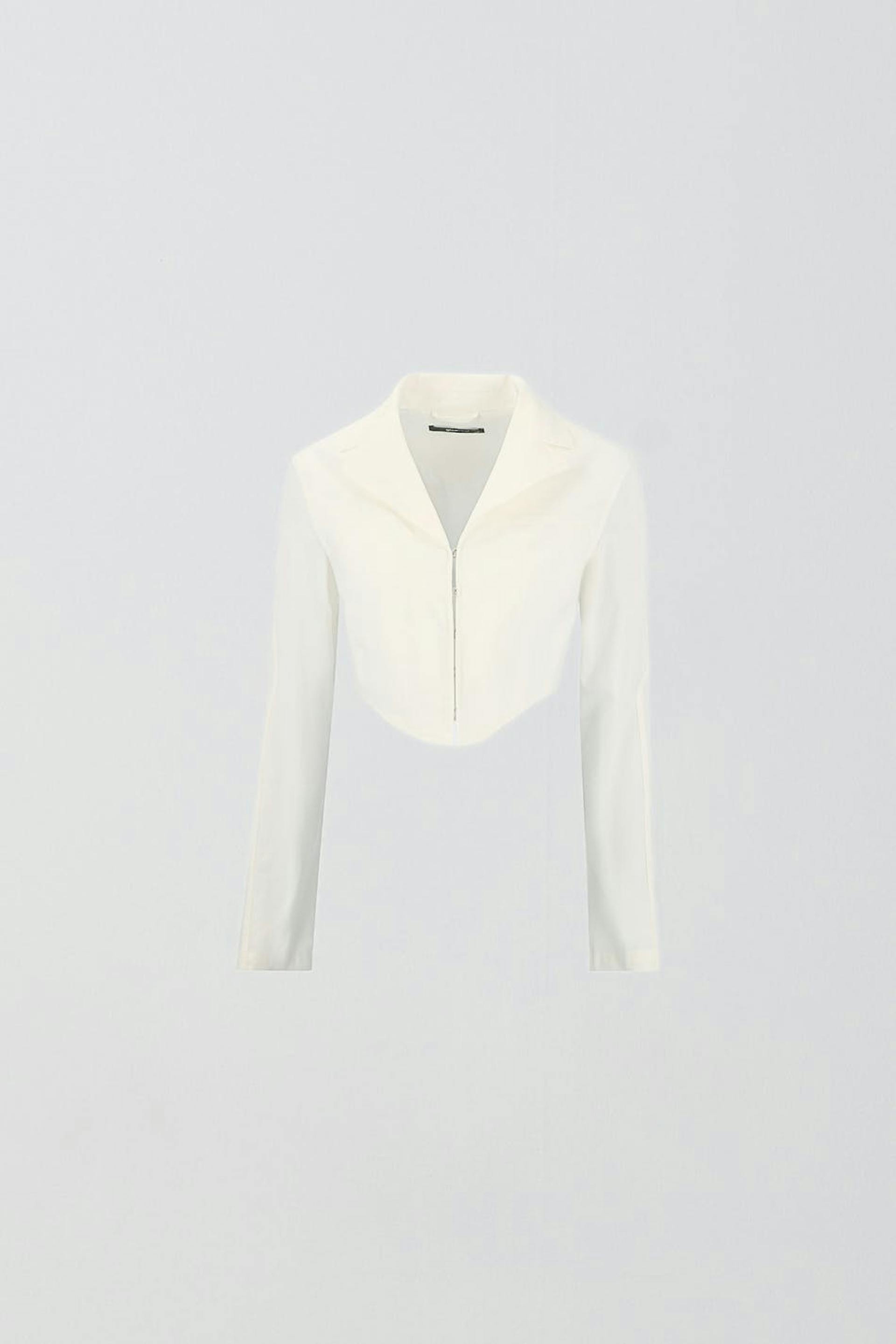 Croppet habitjakke med korsetlignende silhuet. Habitjakken er hvid og har knaplukning foran. Den har langt ærme og krave med skåret revers.