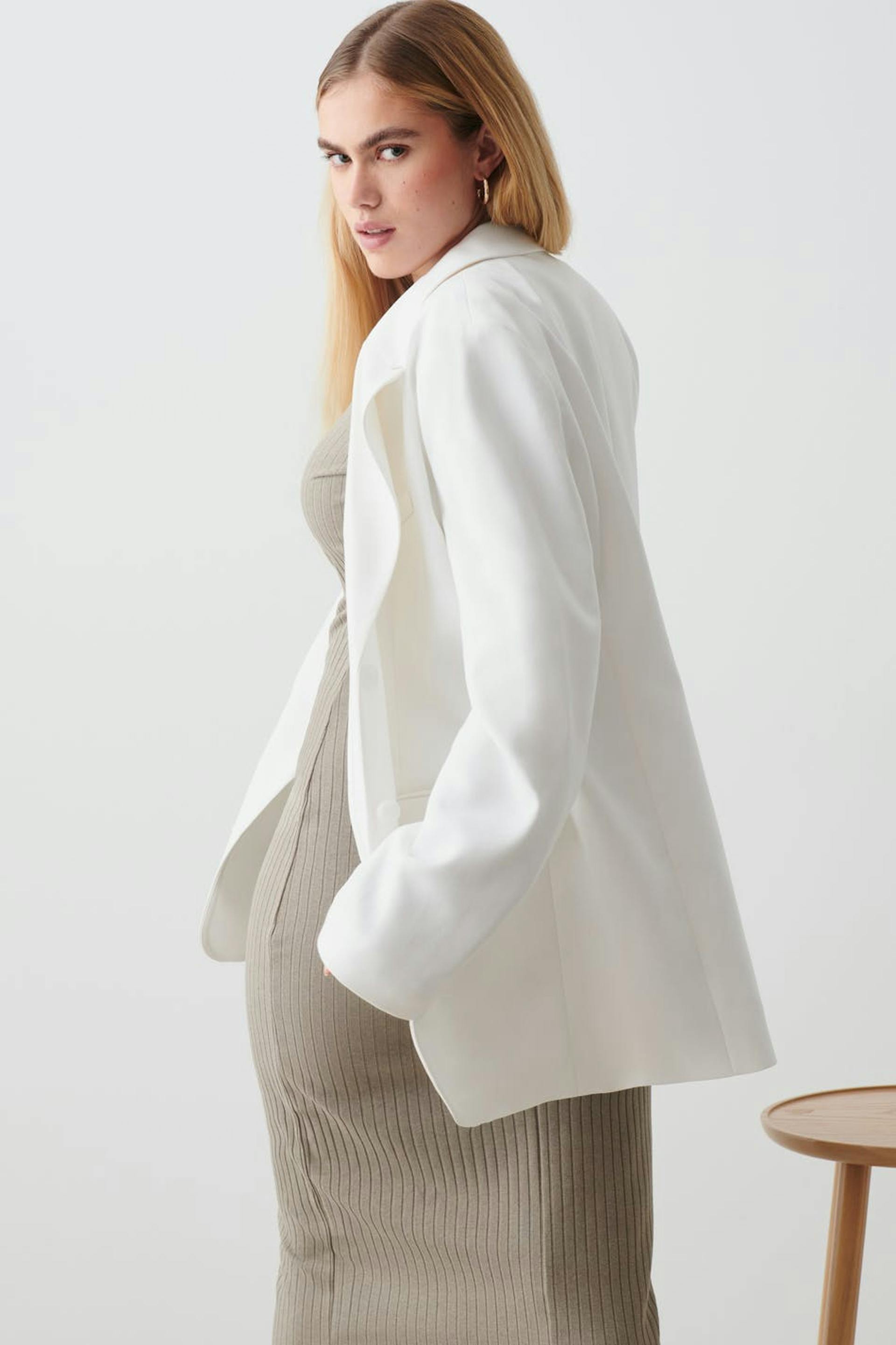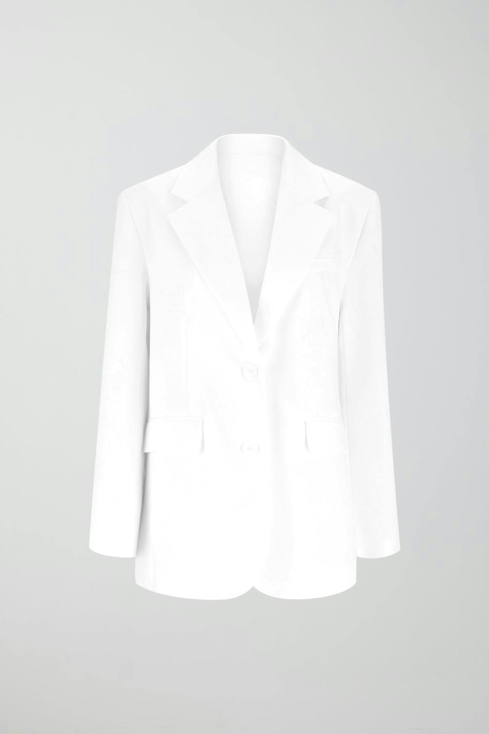 Oversized habitjakke med knapstolpe foran. Habitjakken er hvid, vævet og enkeltradet. Den har krave med skåret revers, brystlomme på den venstre side og paspolerede lommer med klapper ved fronten.