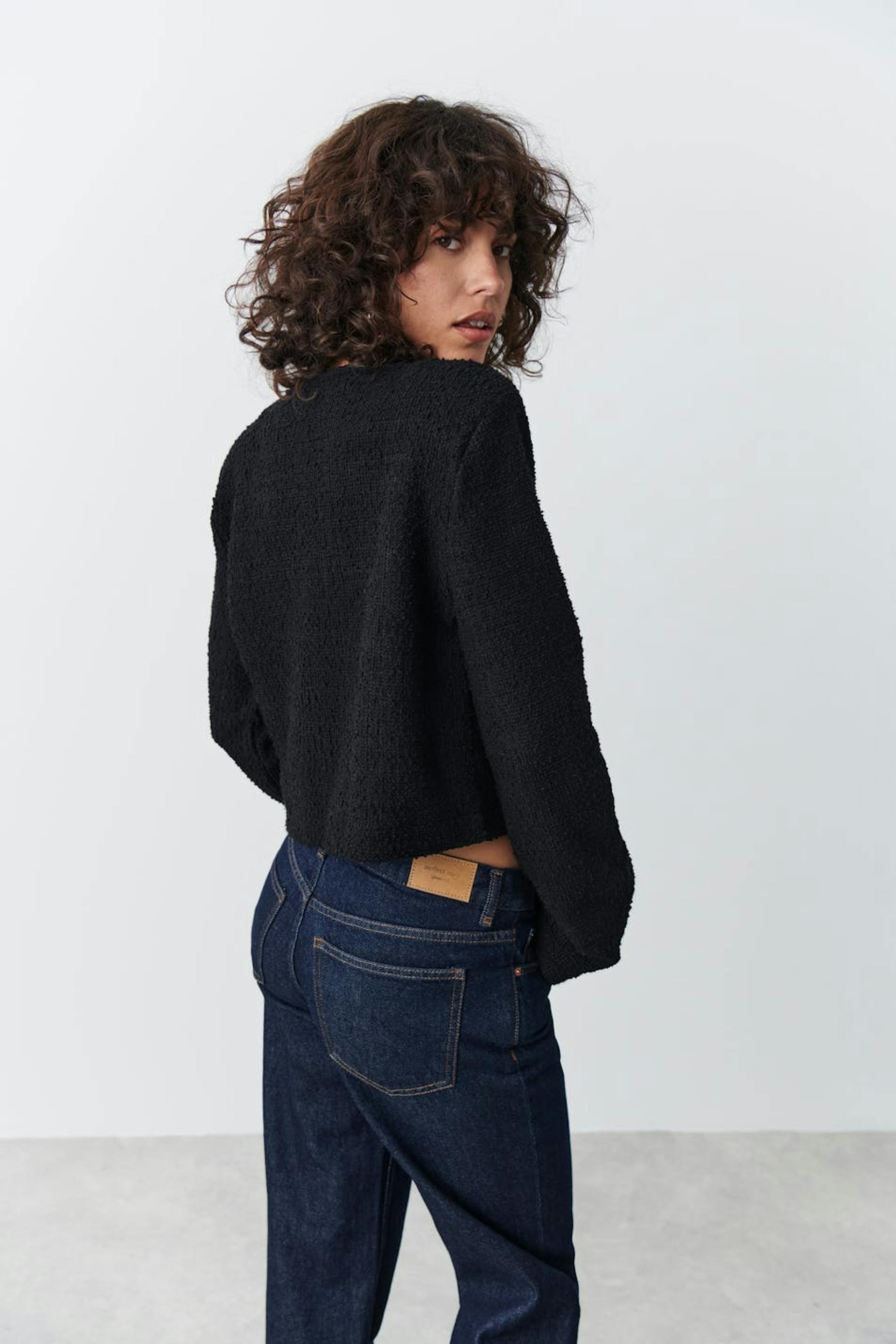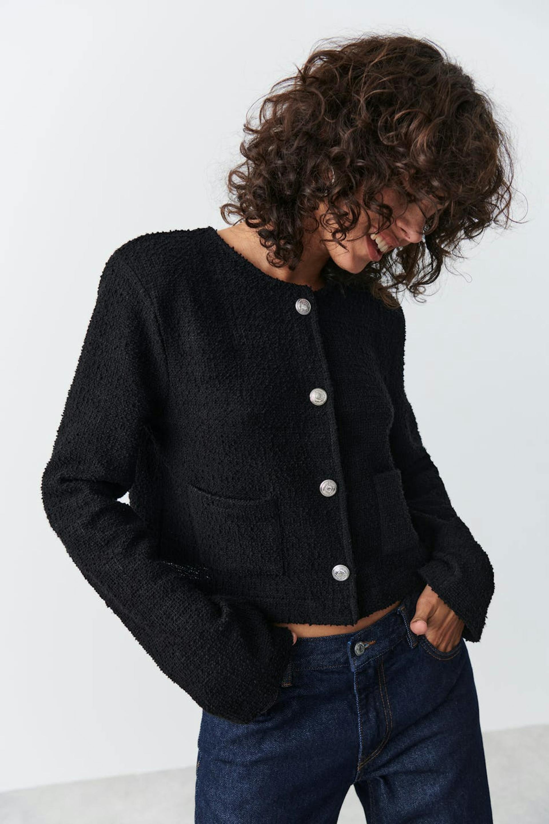Foret tweedjakke med knaplukning foran. Tweedjakken er sort og har lommer i siderne.