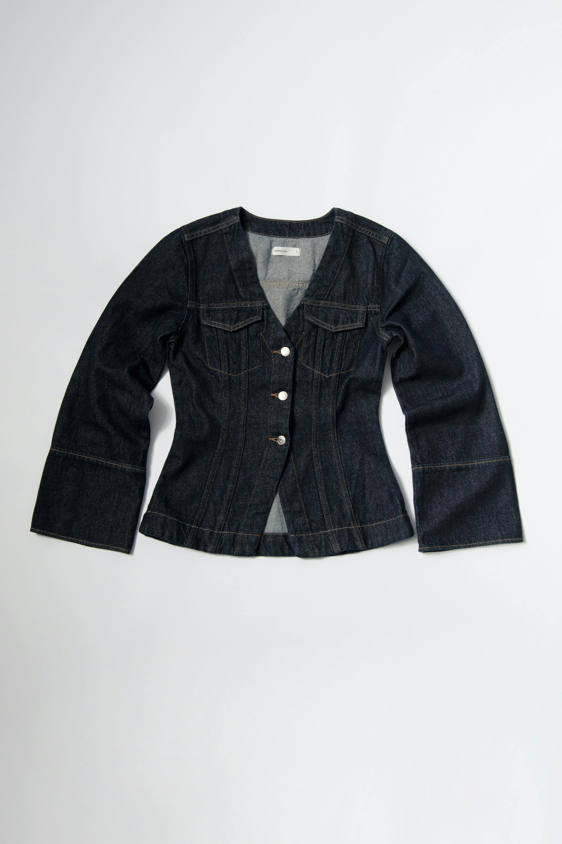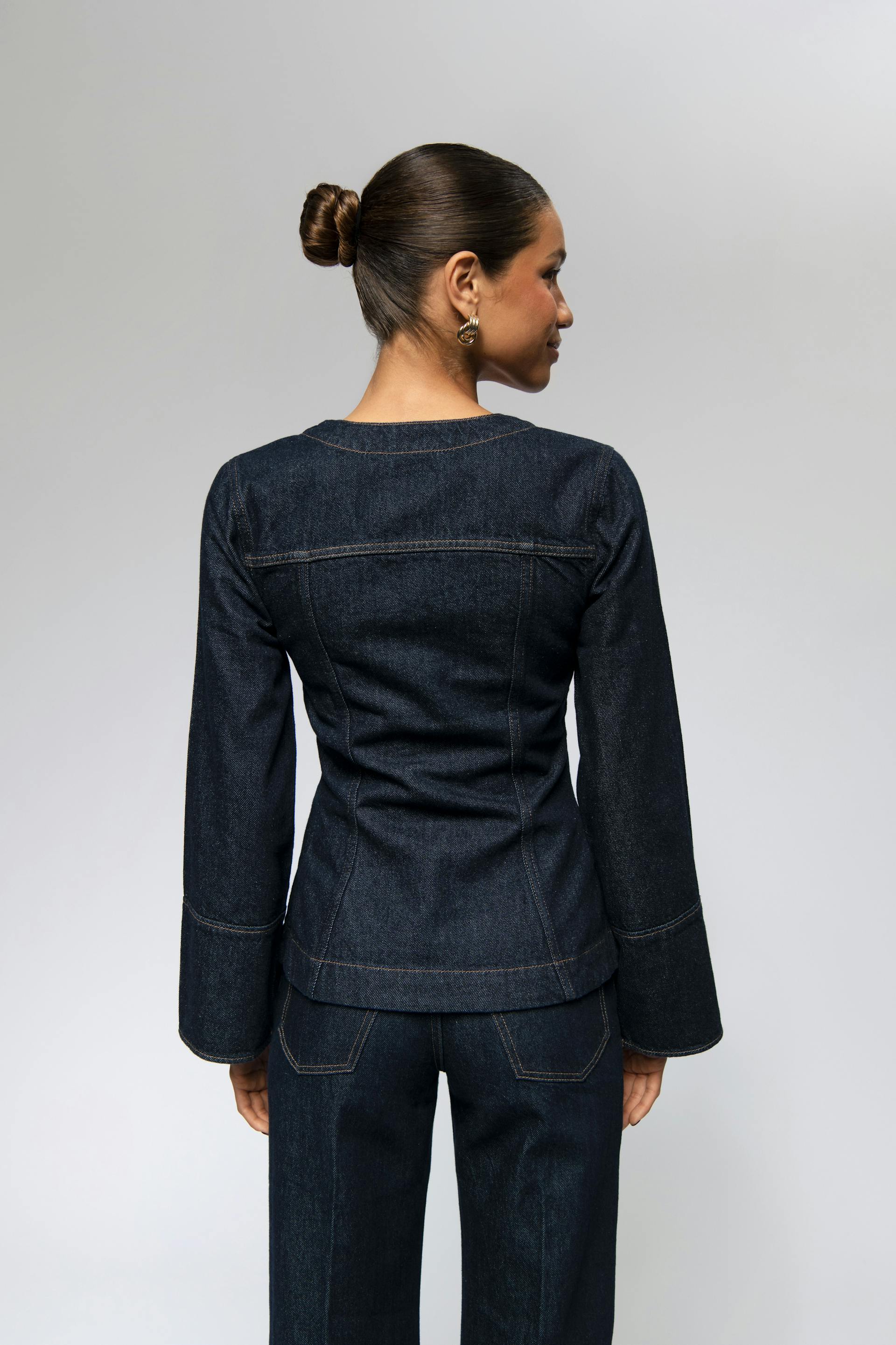 Denim jakke med knaplukning foran. Jakken er blå og har brede ærmer. Den har figurnær pasform i non-stretch denim, v-udskæring og brystlommer.