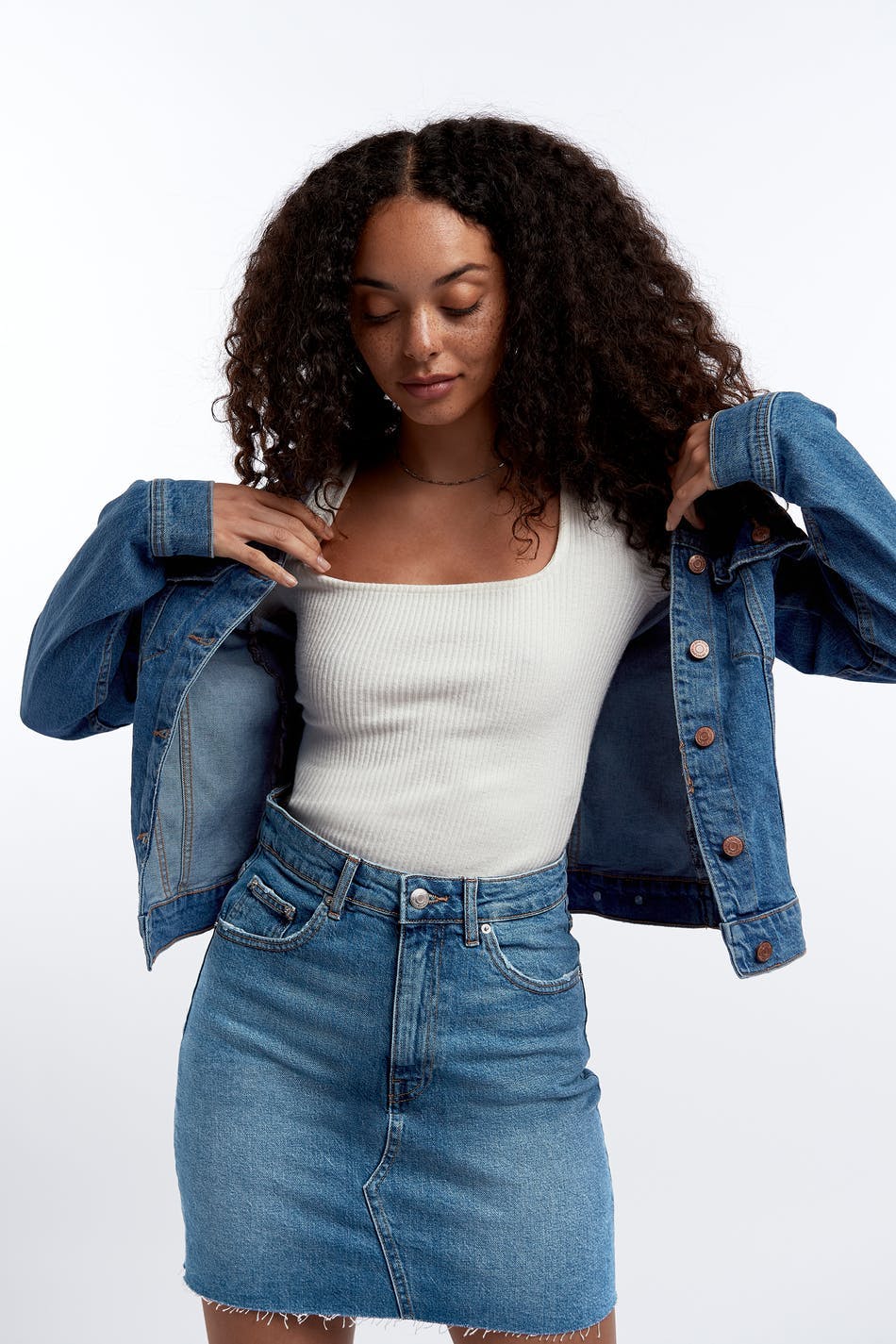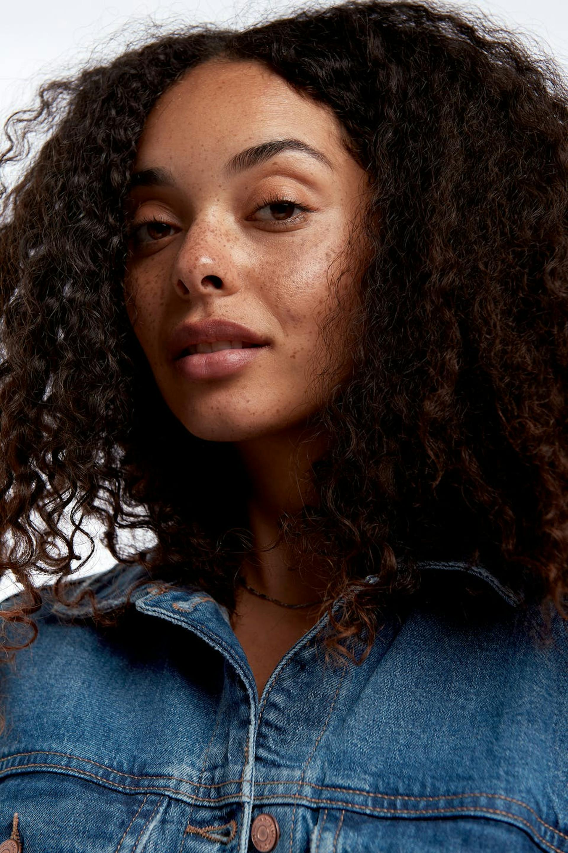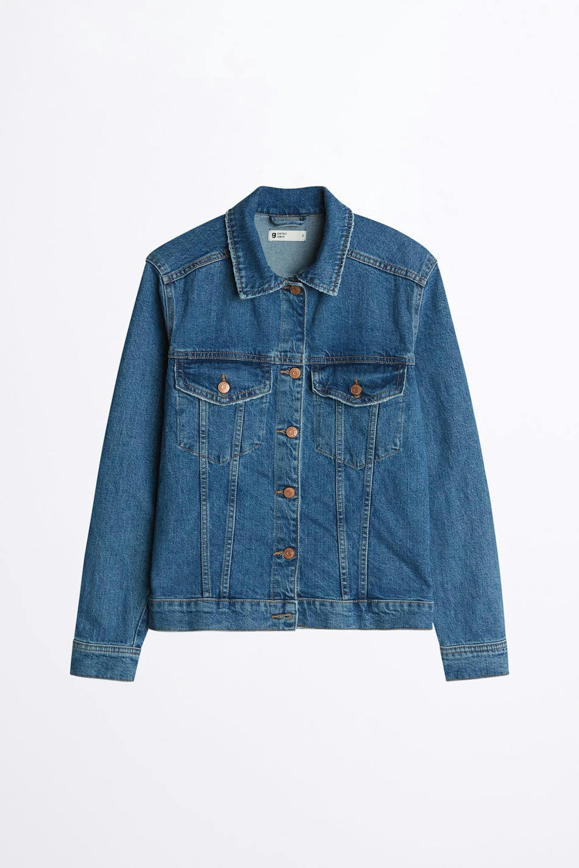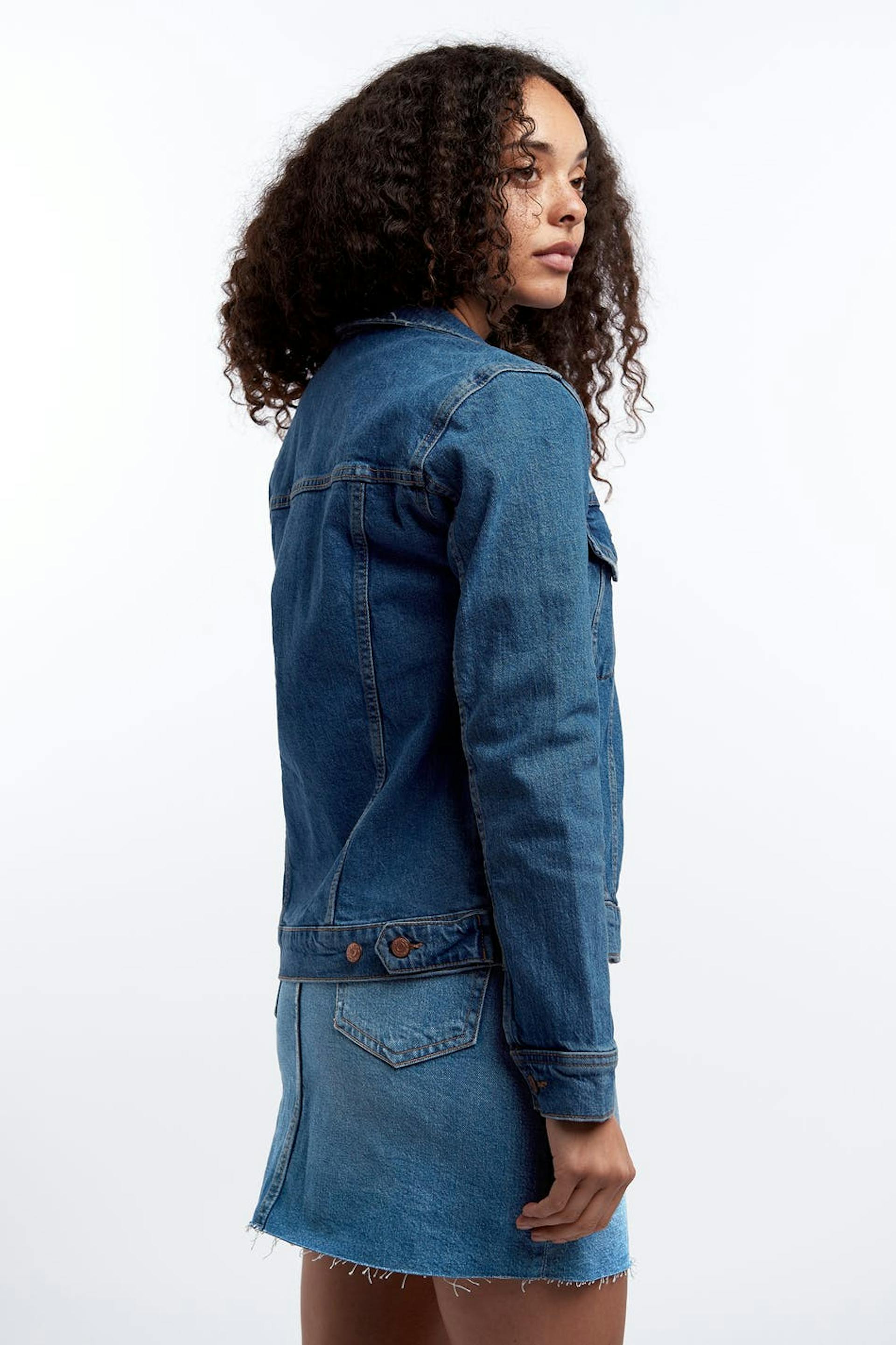 Klassisk denim jakke med en normal pasform. Jakken er blå og har en krage. Den er fremstillet af denim og har lange ærmer med en knapstolpe på ærmeafslutningerne, brystlommer med låg og knap og en justerbar lukning på siderne.