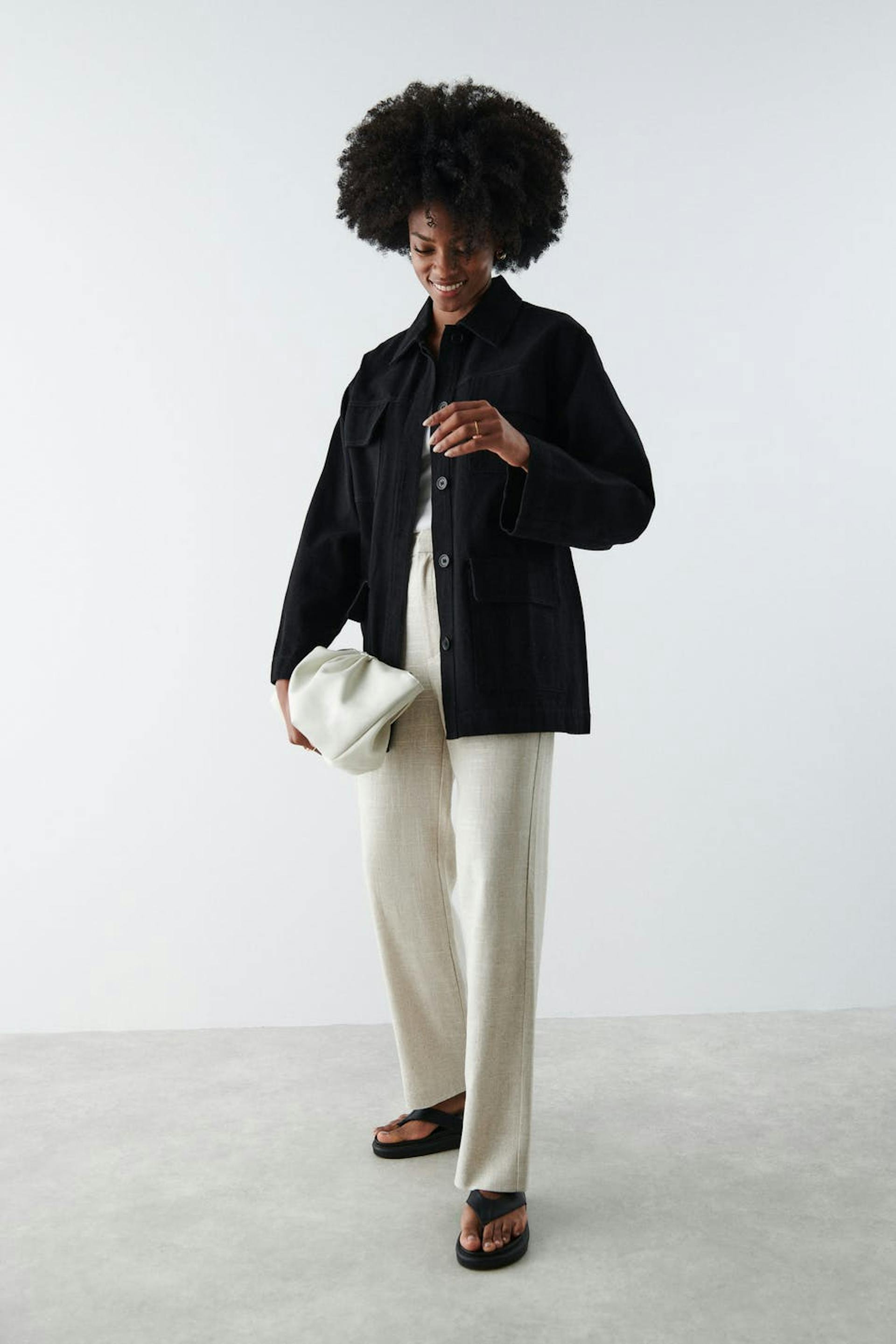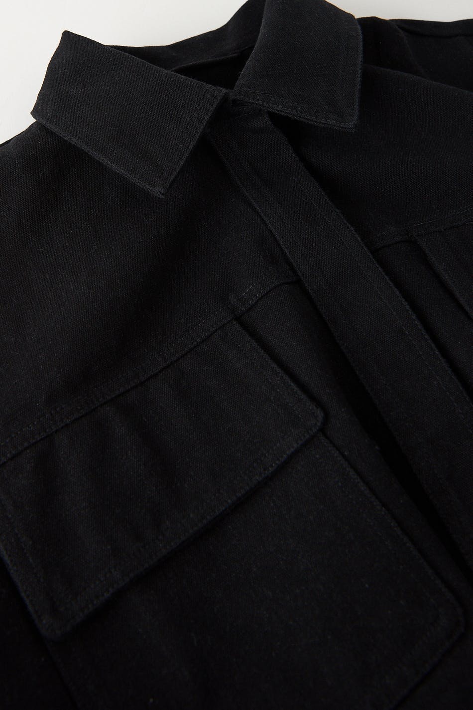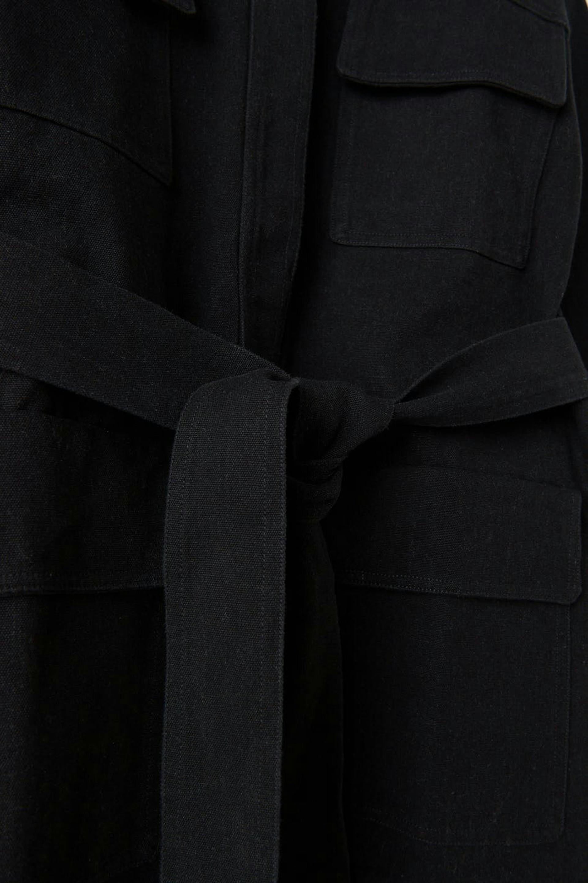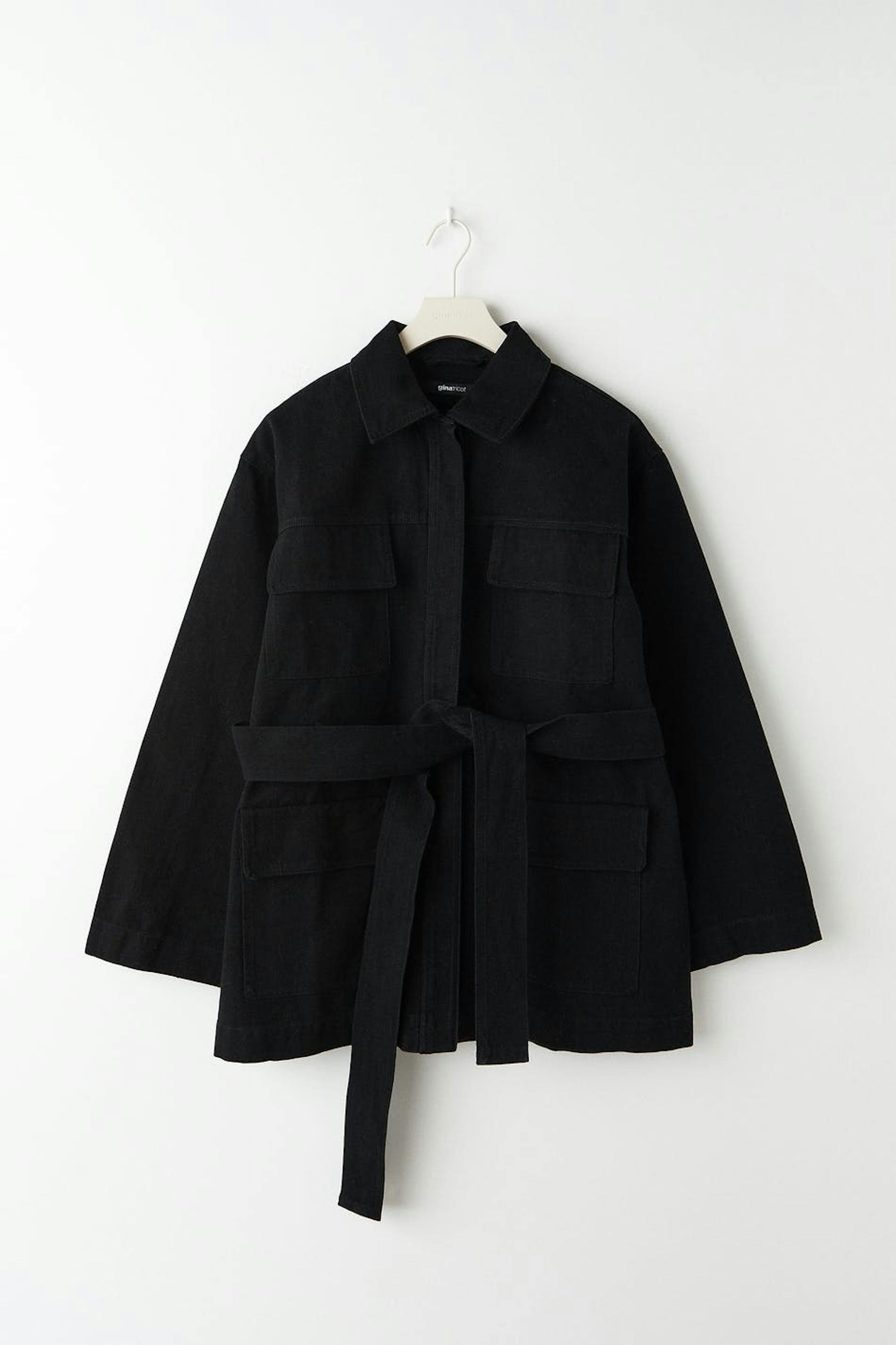 Jakke med bindebælte ved taljen. Jakken er sort og har en løs pasform. Den har en vævet kvalitet i bomuld, krave, brystlommer, skjult knaplukning ved fronten og lommer på siderne.