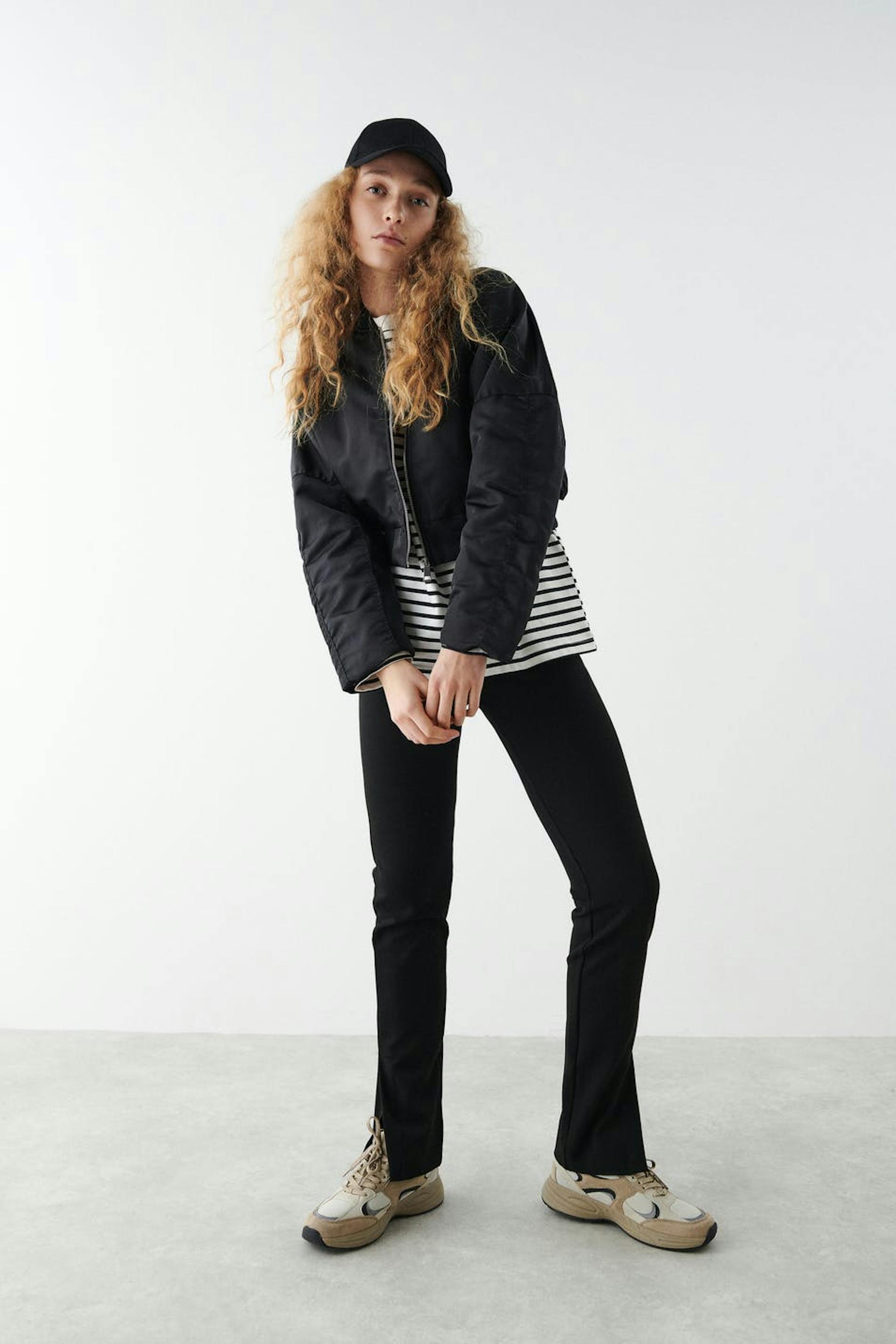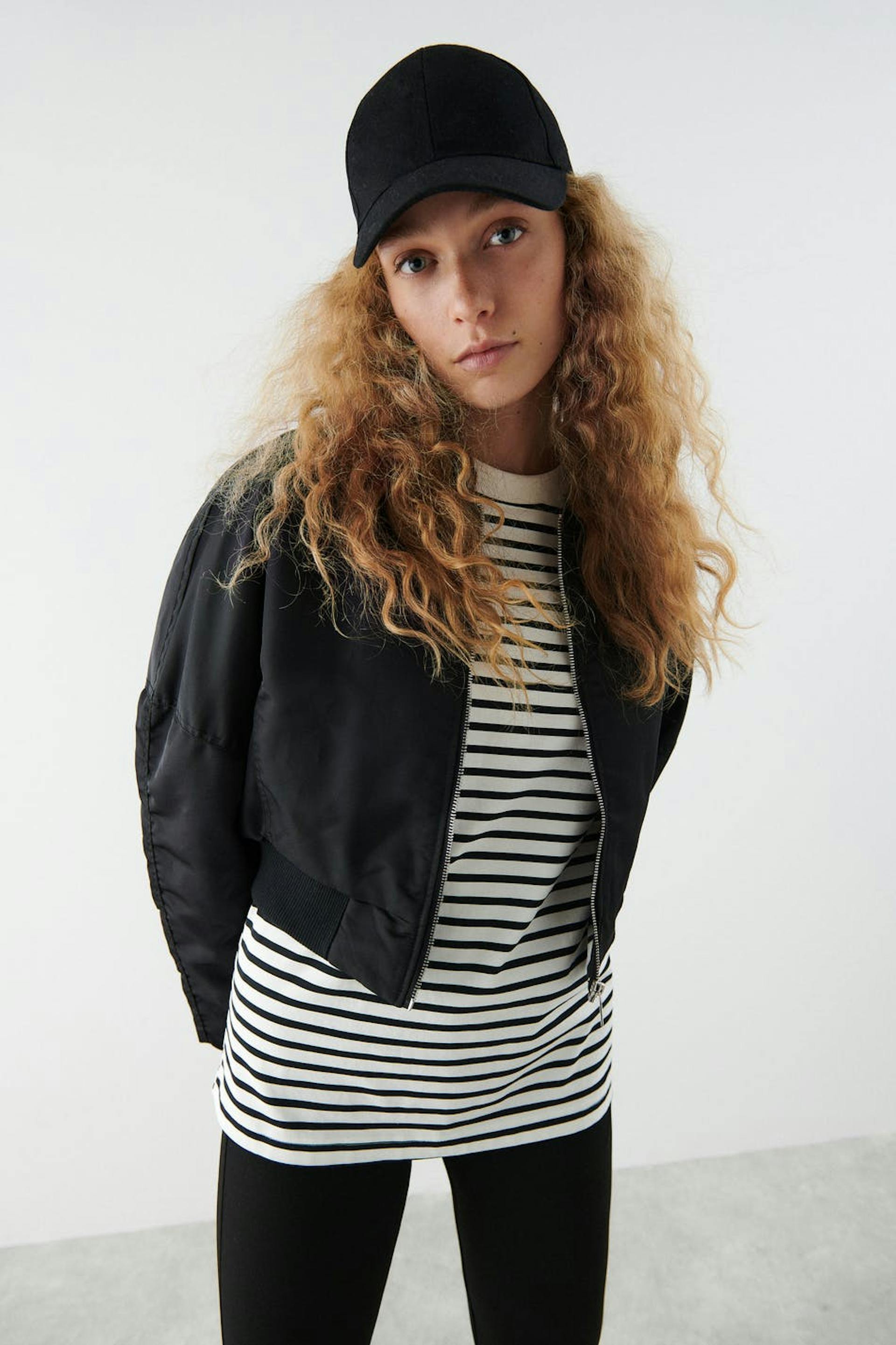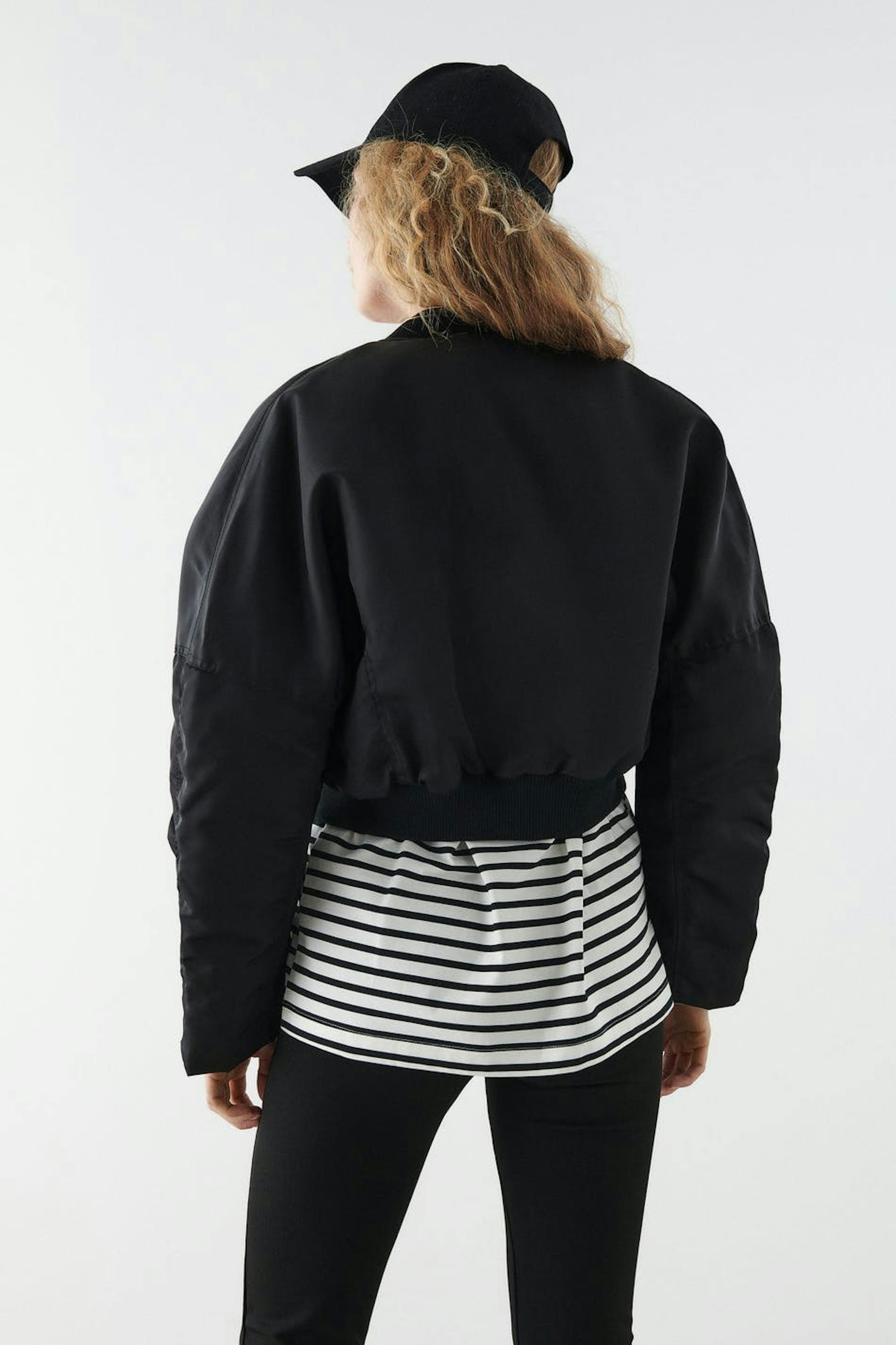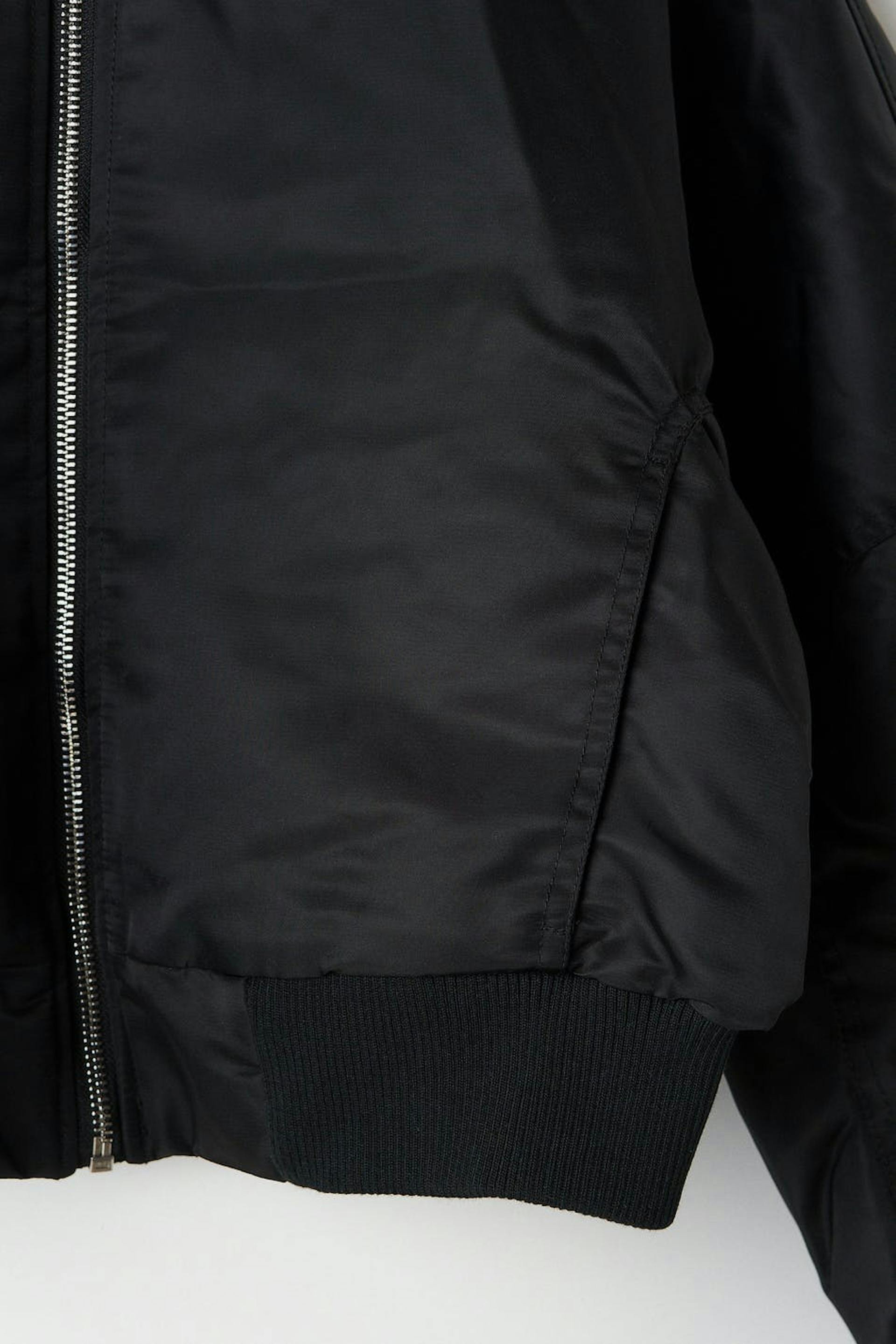 Kort bomberjakke med boxy pasform. Jakken er sort og har en foret, vævet kvalitet i polyester. Den har en ribbet krave, lynlåslukning foran, ribbet søm og dekorative sømdetaljer på siderne og på ærmerne.