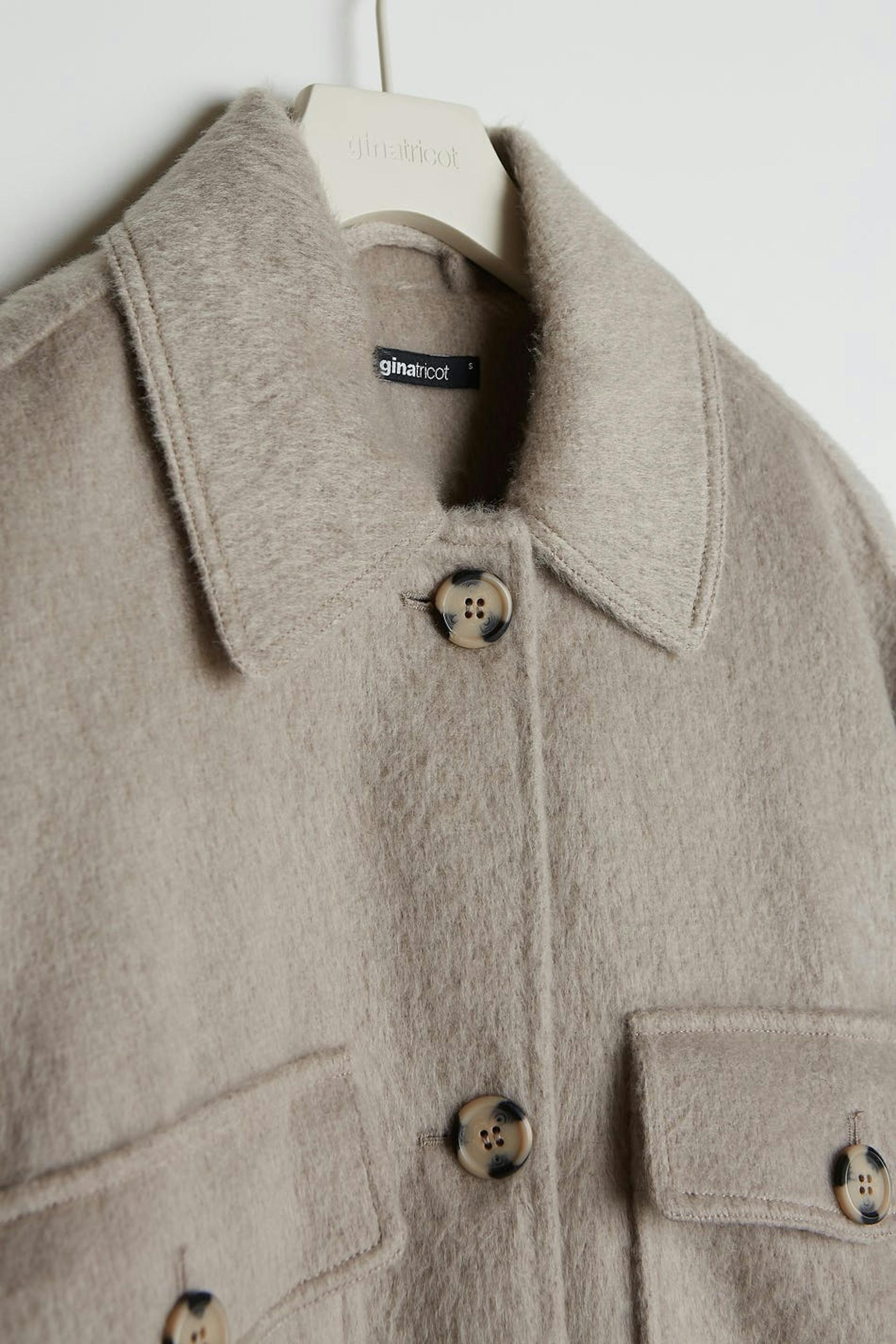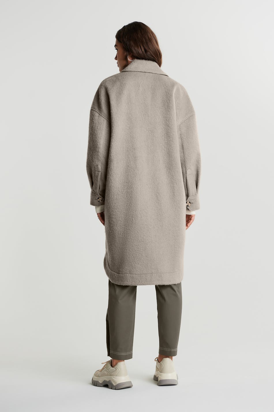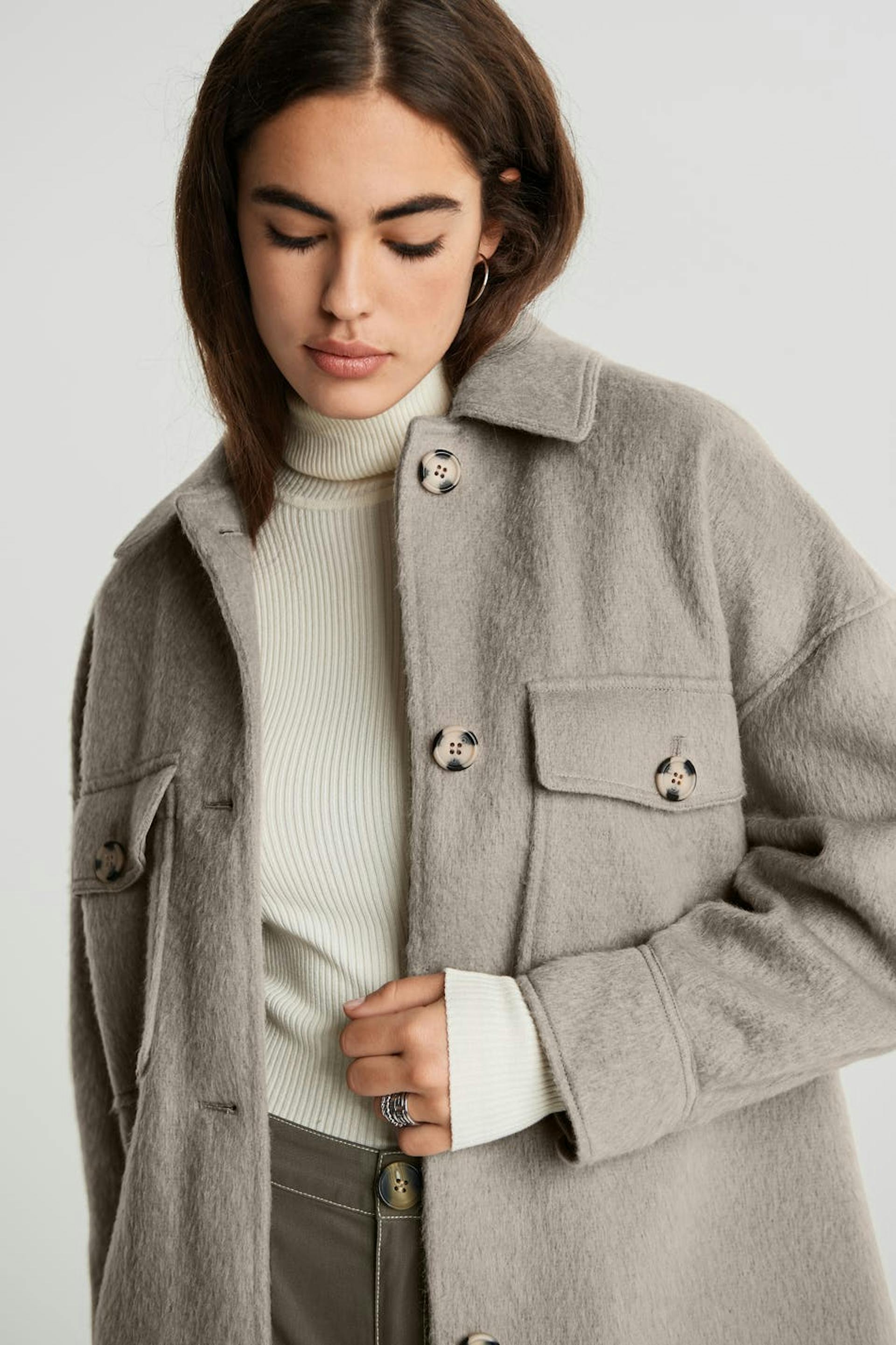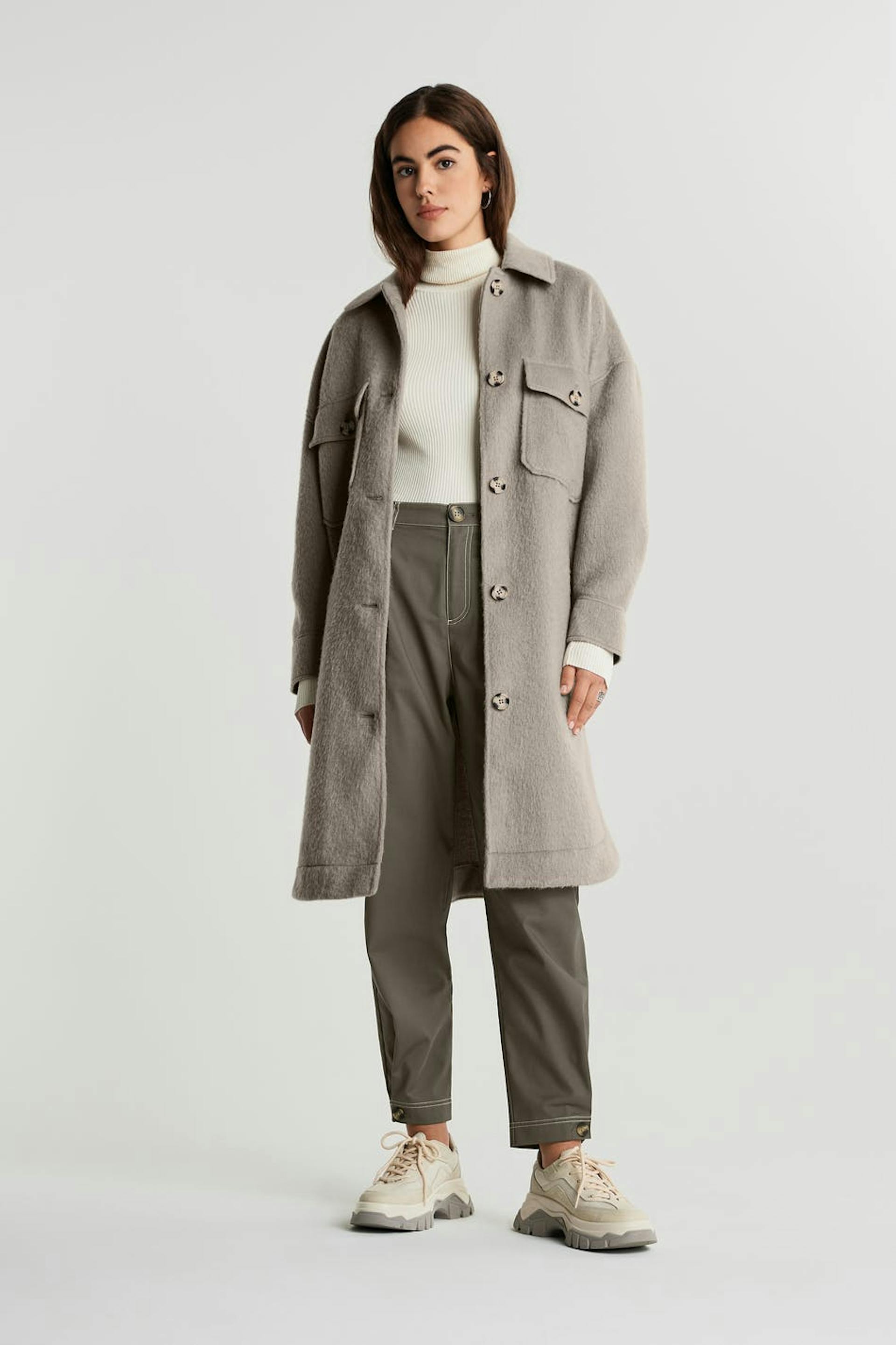 Lang frakke med en model med en skjortestil. Frakken er beige og har brystlommer.