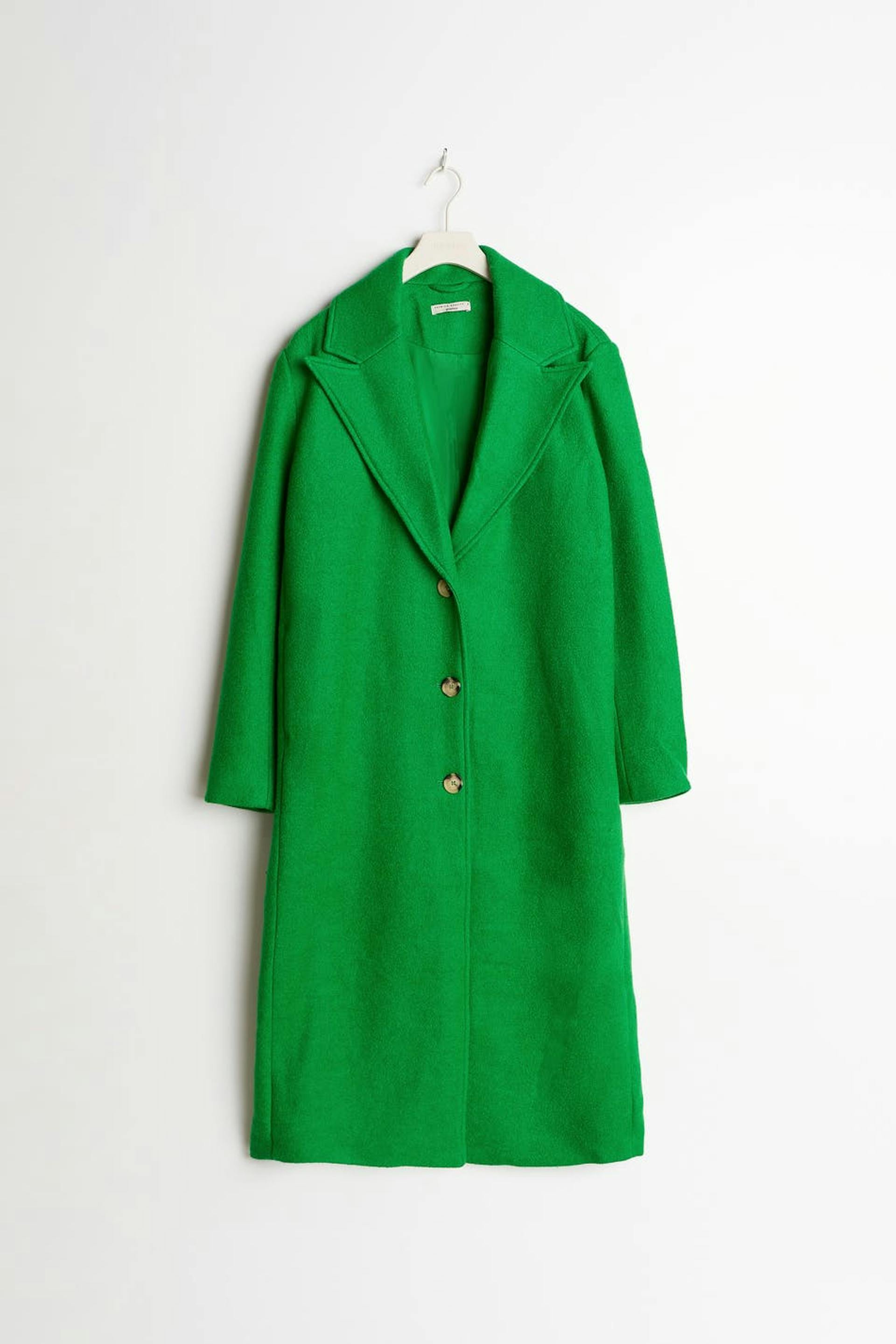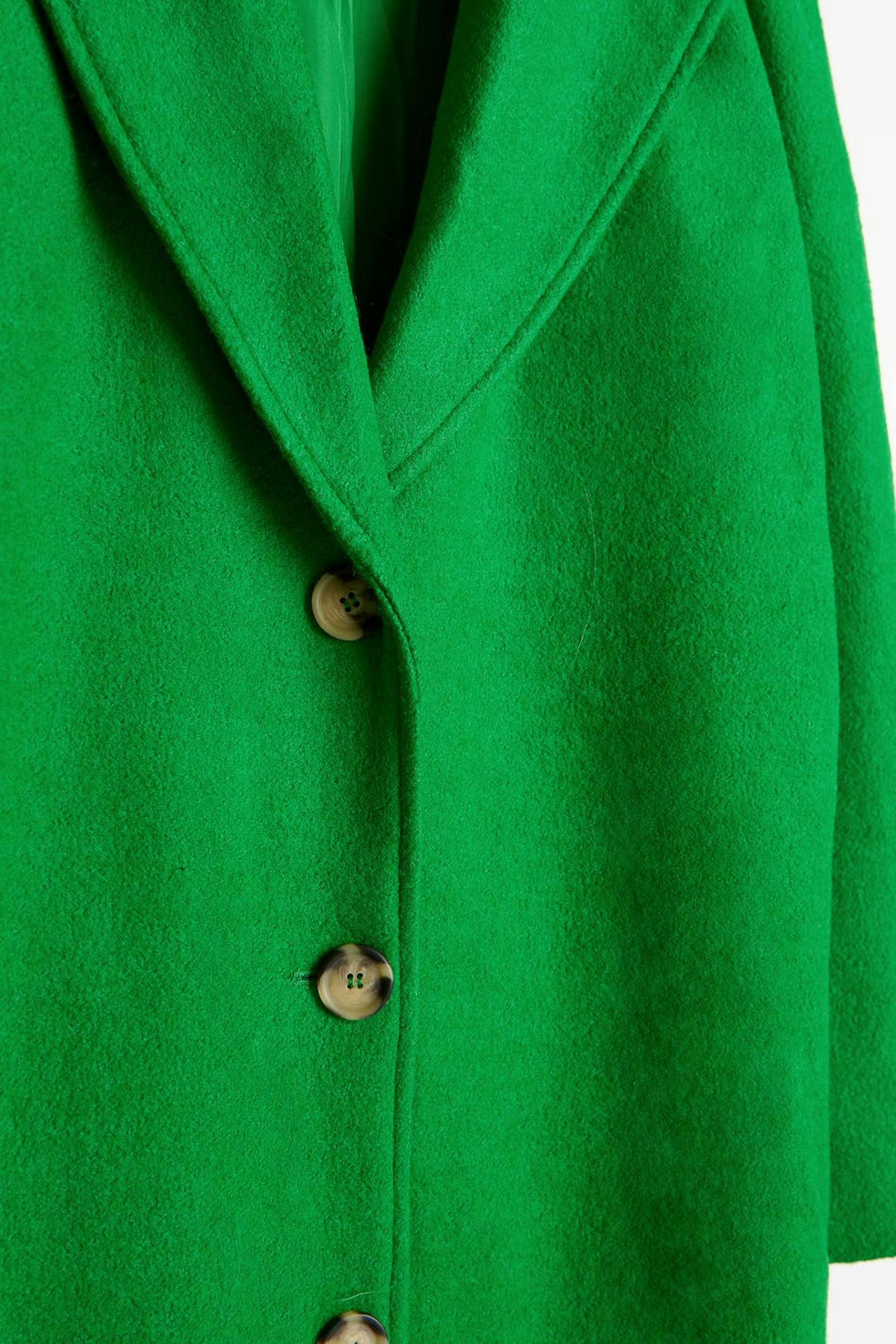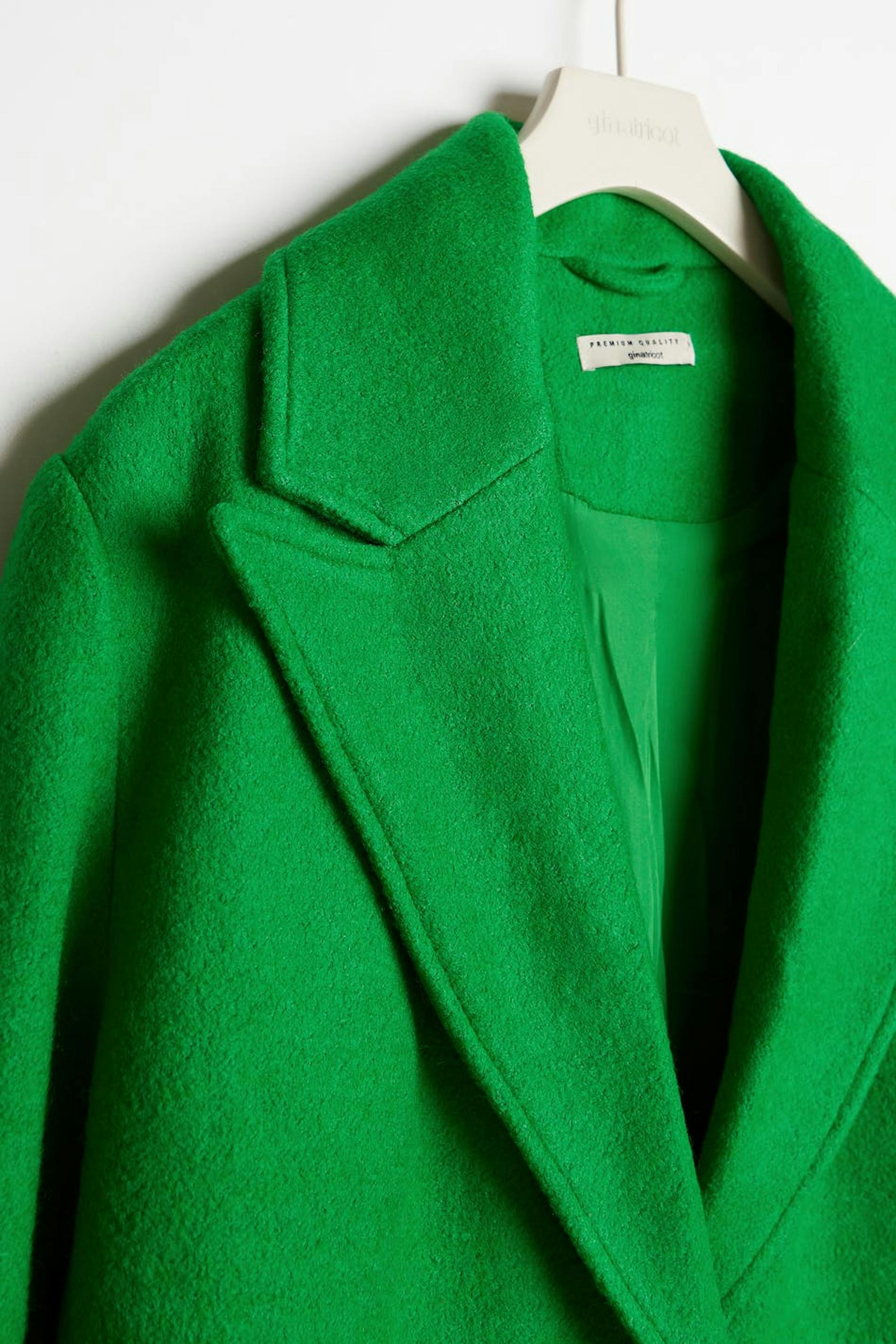 Lang frakke med lige pasform. Frakken er grøn og har en tyk, vævet premium kvalitet i uldblanding. Den har en krave, brede reverser, sidelommer, tre store knapper ved fronten og ventilation bagved.