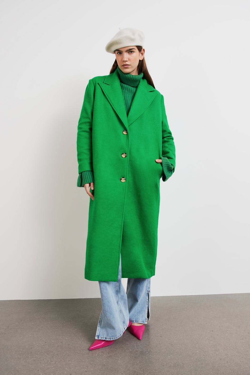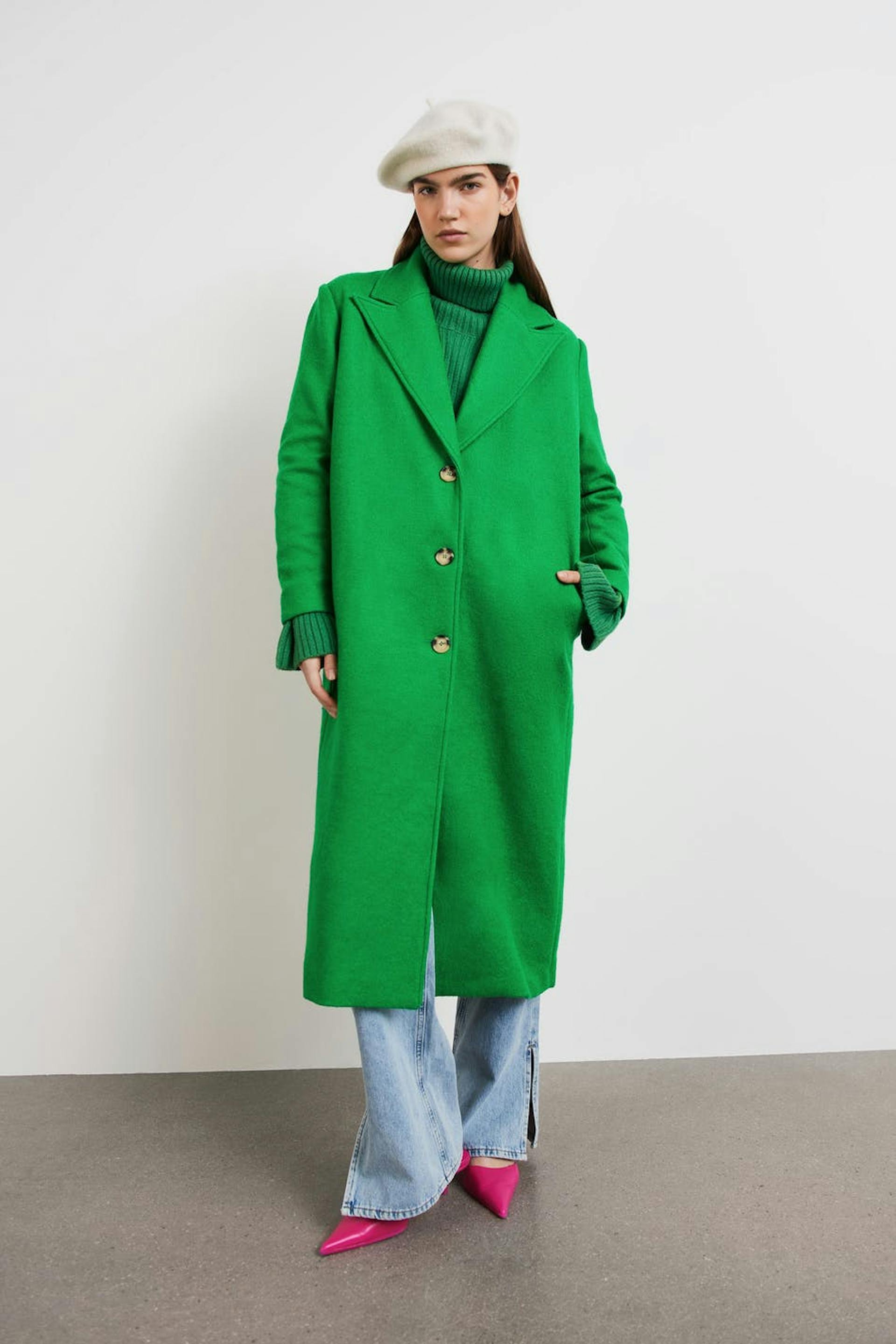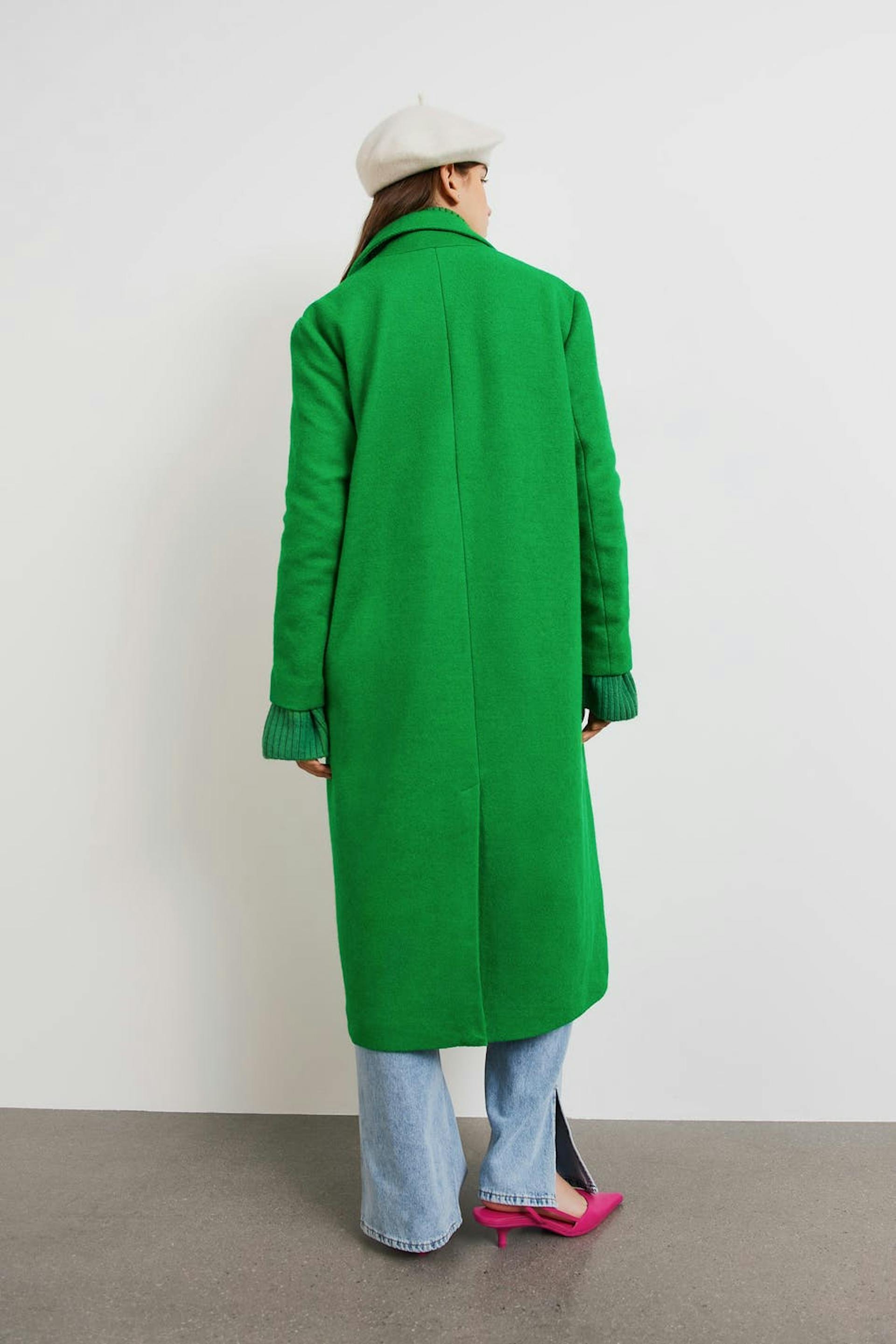 Lang frakke med lige pasform. Frakken er grøn og har en tyk, vævet premium kvalitet i uldblanding. Den har en krave, brede reverser, sidelommer, tre store knapper ved fronten og ventilation bagved.
