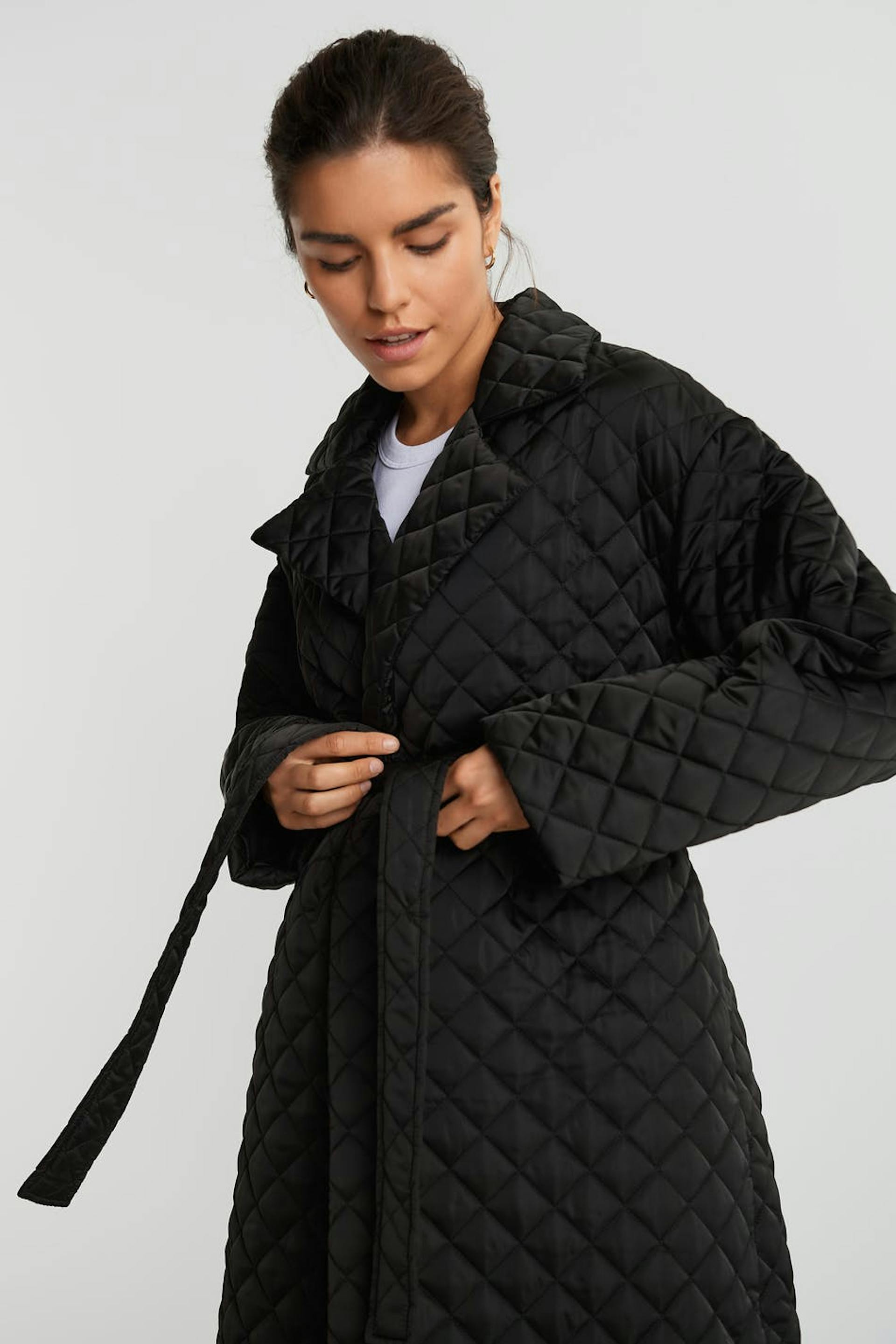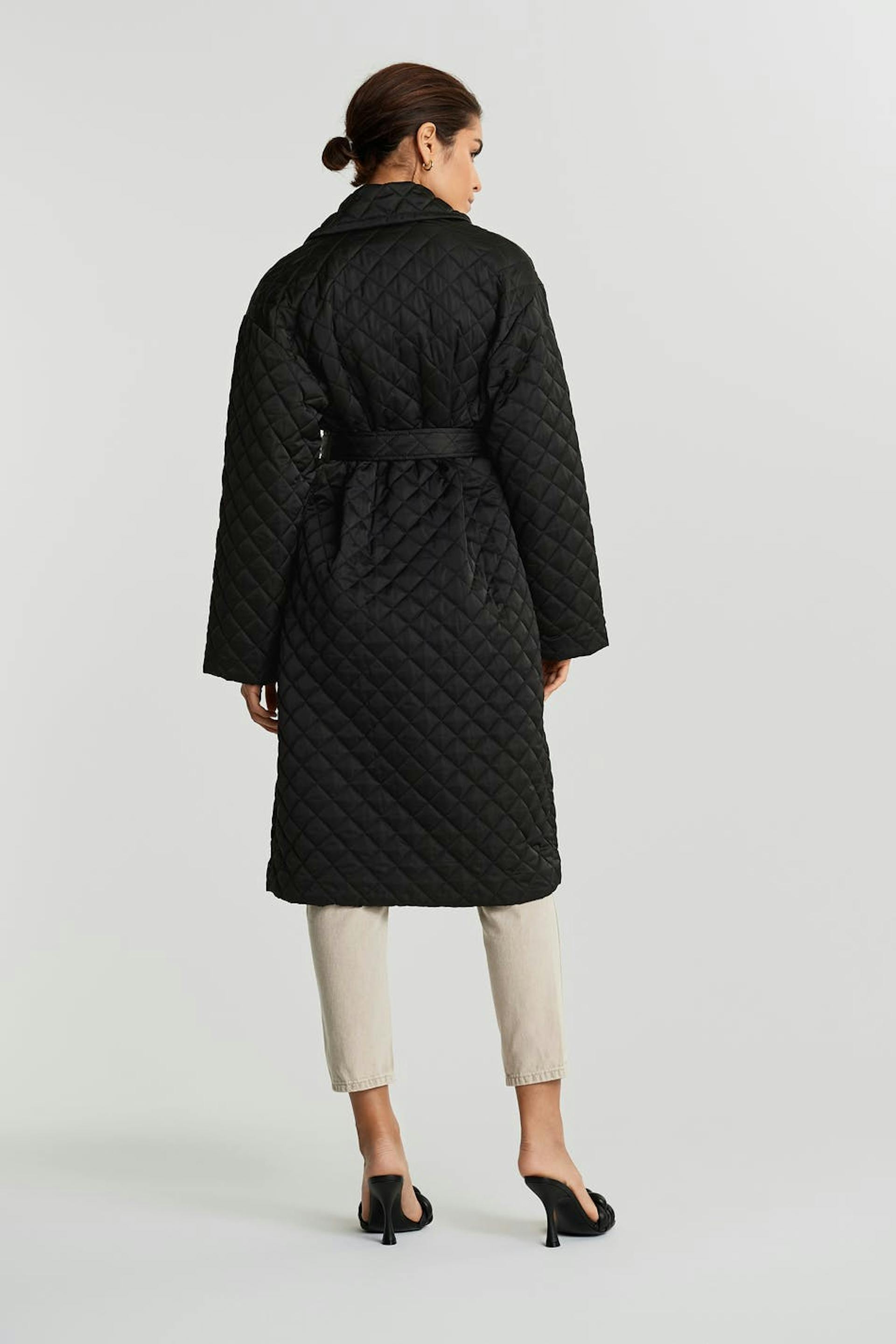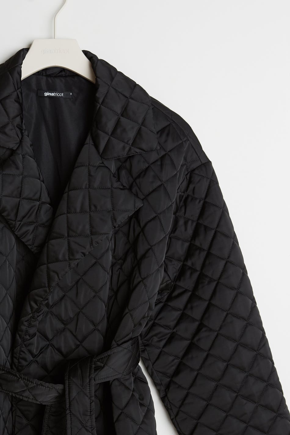 Quiltet frakke med revers. Frakken er sort og komfortabel og har et bindebælte. Den har en uformel pasform.