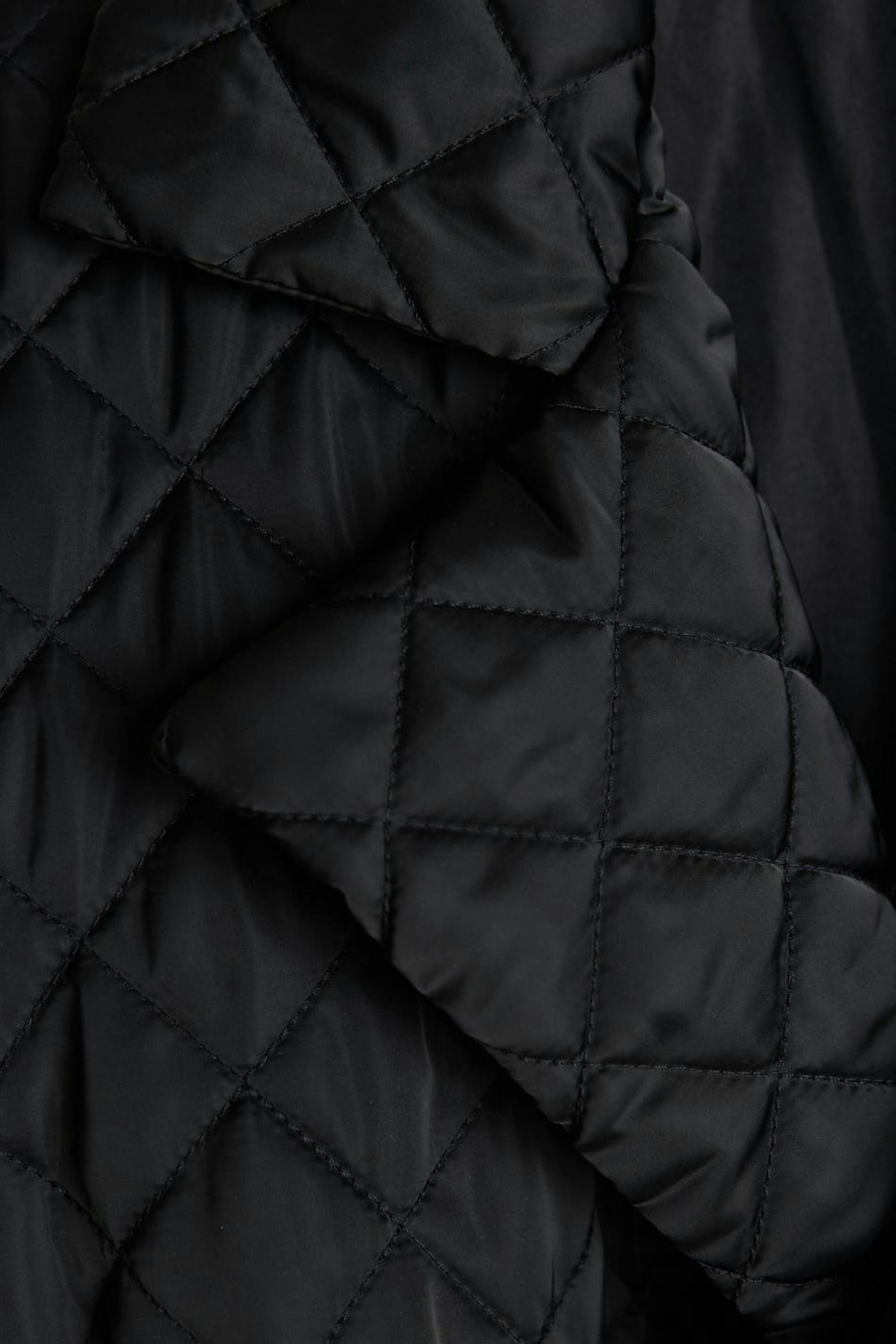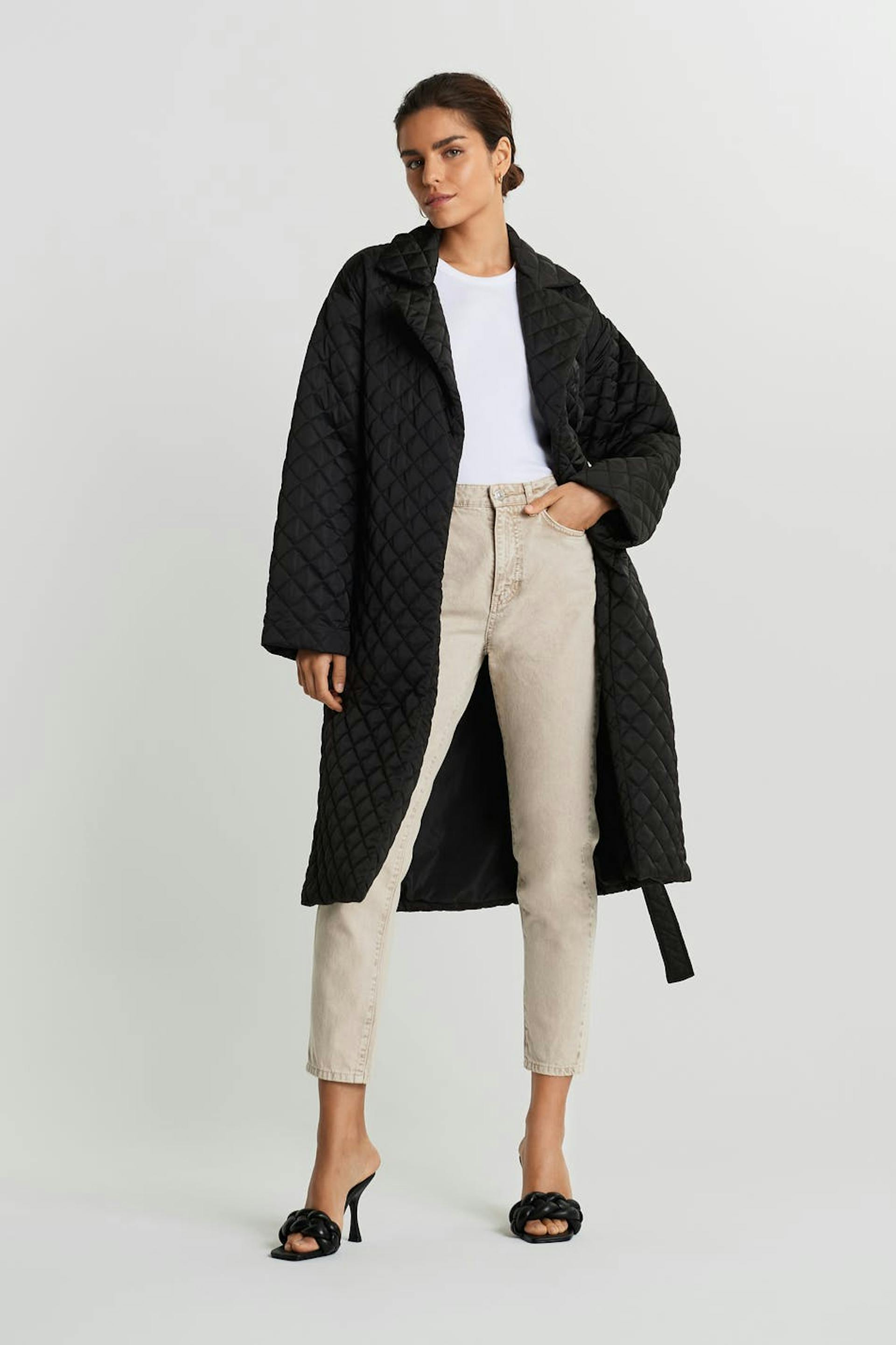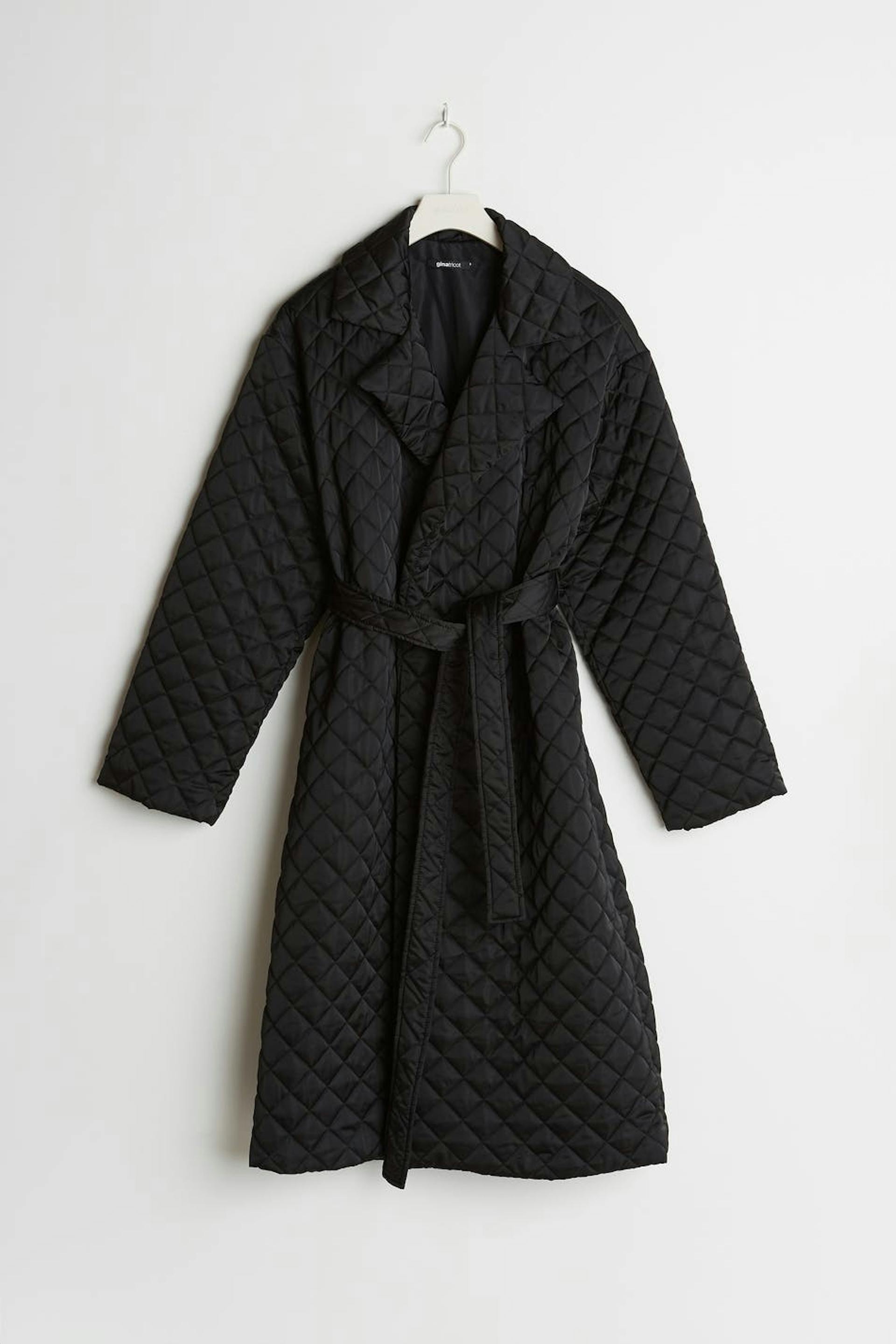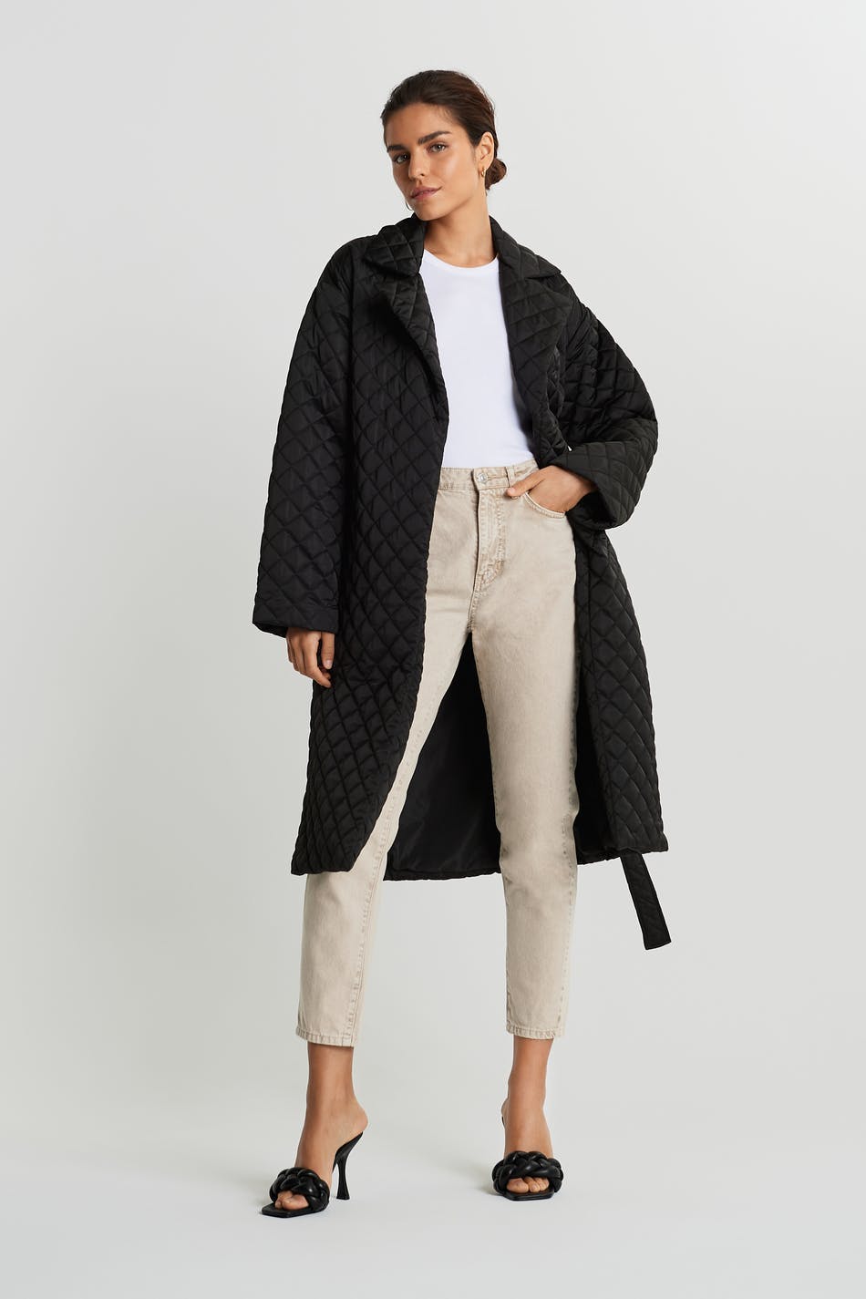 Quiltet frakke med revers. Frakken er sort og komfortabel og har et bindebælte. Den har en uformel pasform.