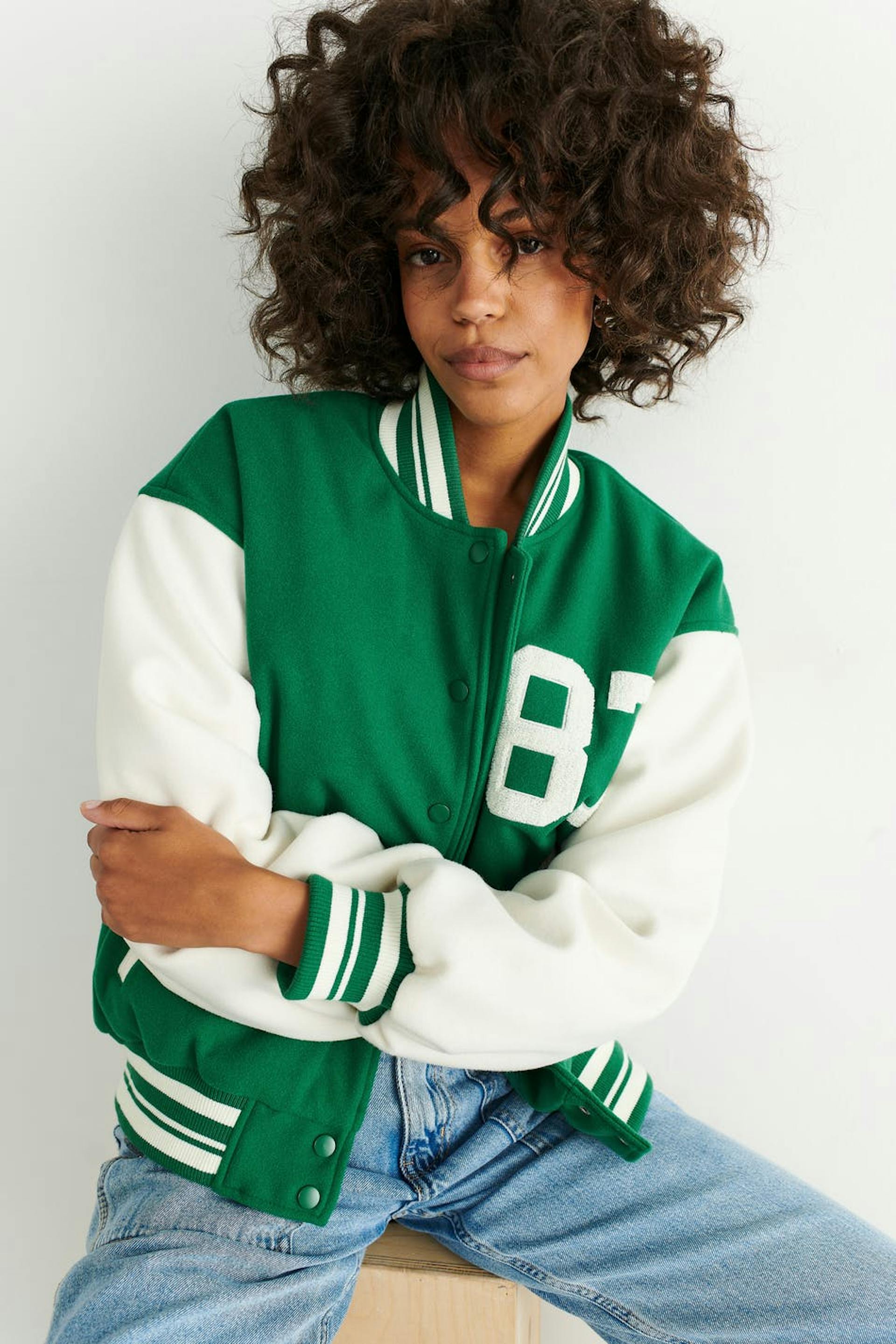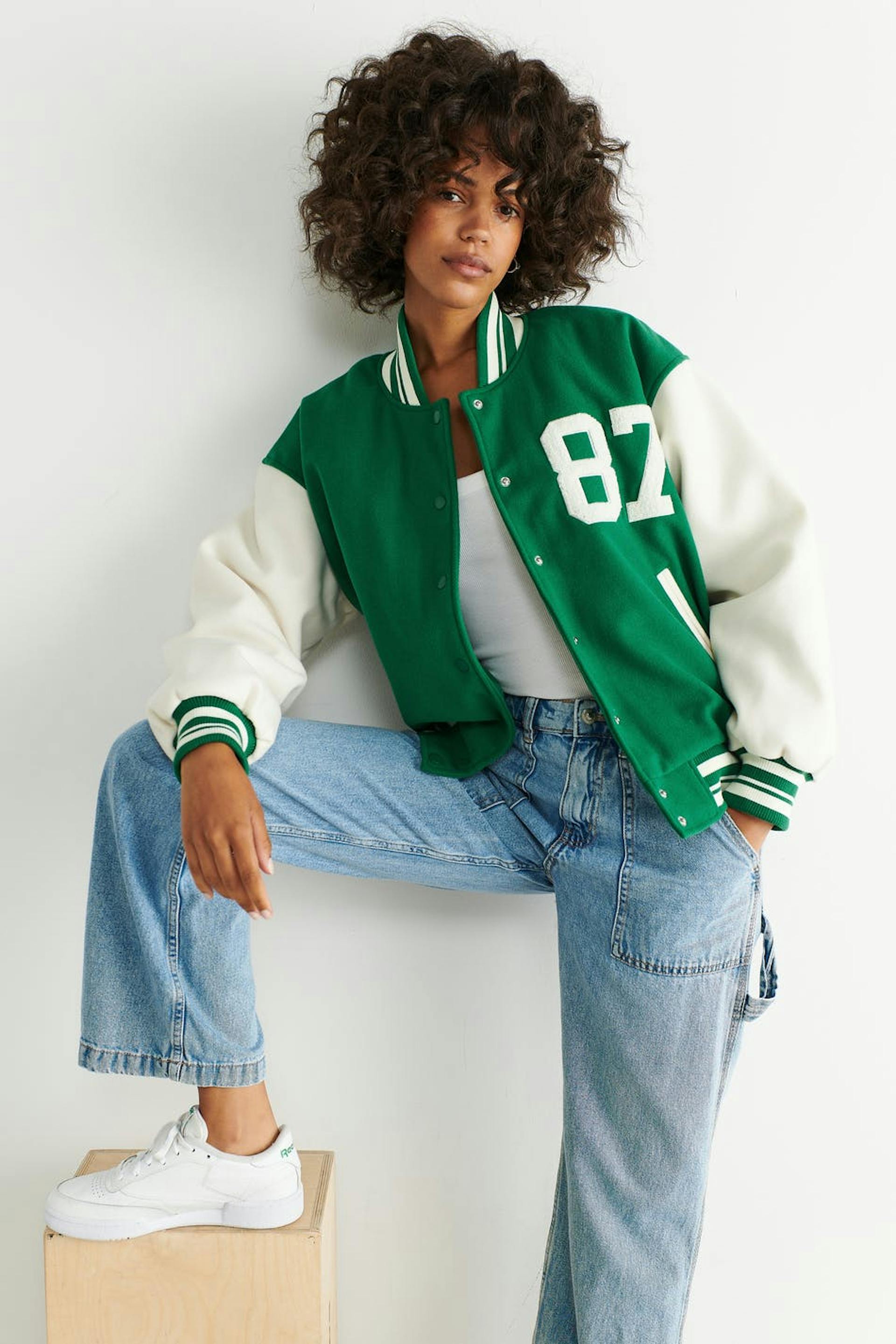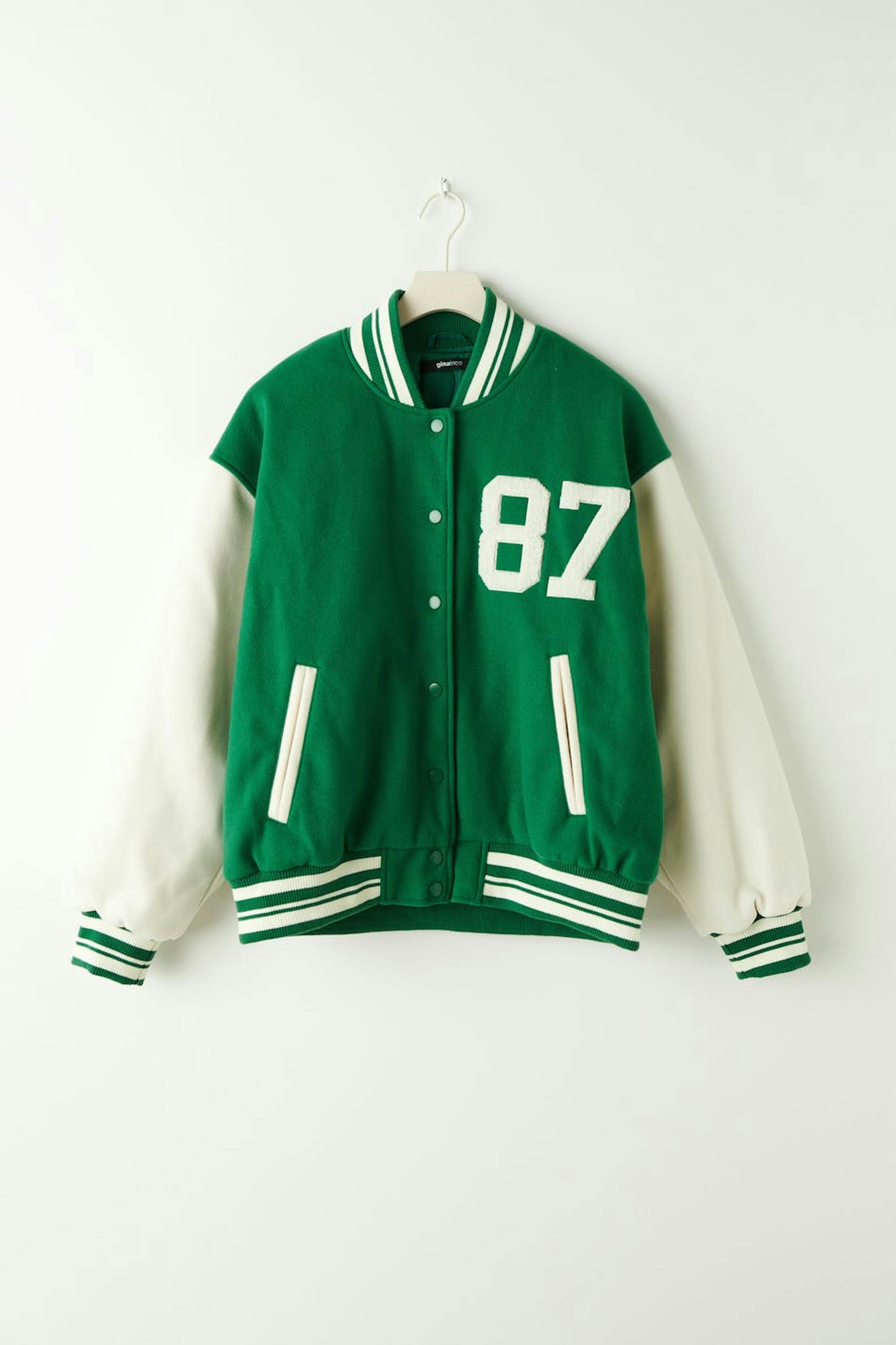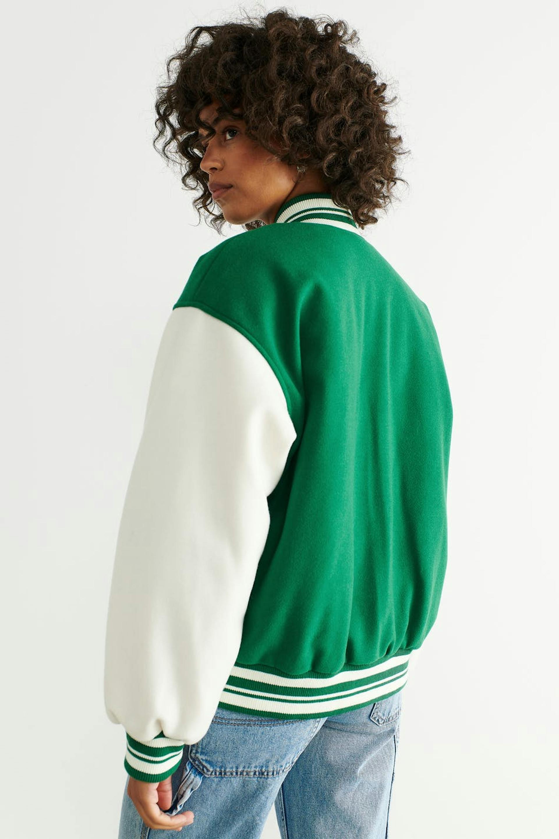 Oversized baseballjakke med trykknapslukning foran. Jakken er grøn og har et filtet stof. Den har ribbet krave, paspolerete lommer i siderne, broderi på venstre bryst og en stribet, ribbet manchet nederst og på ærmeafslutningerne.