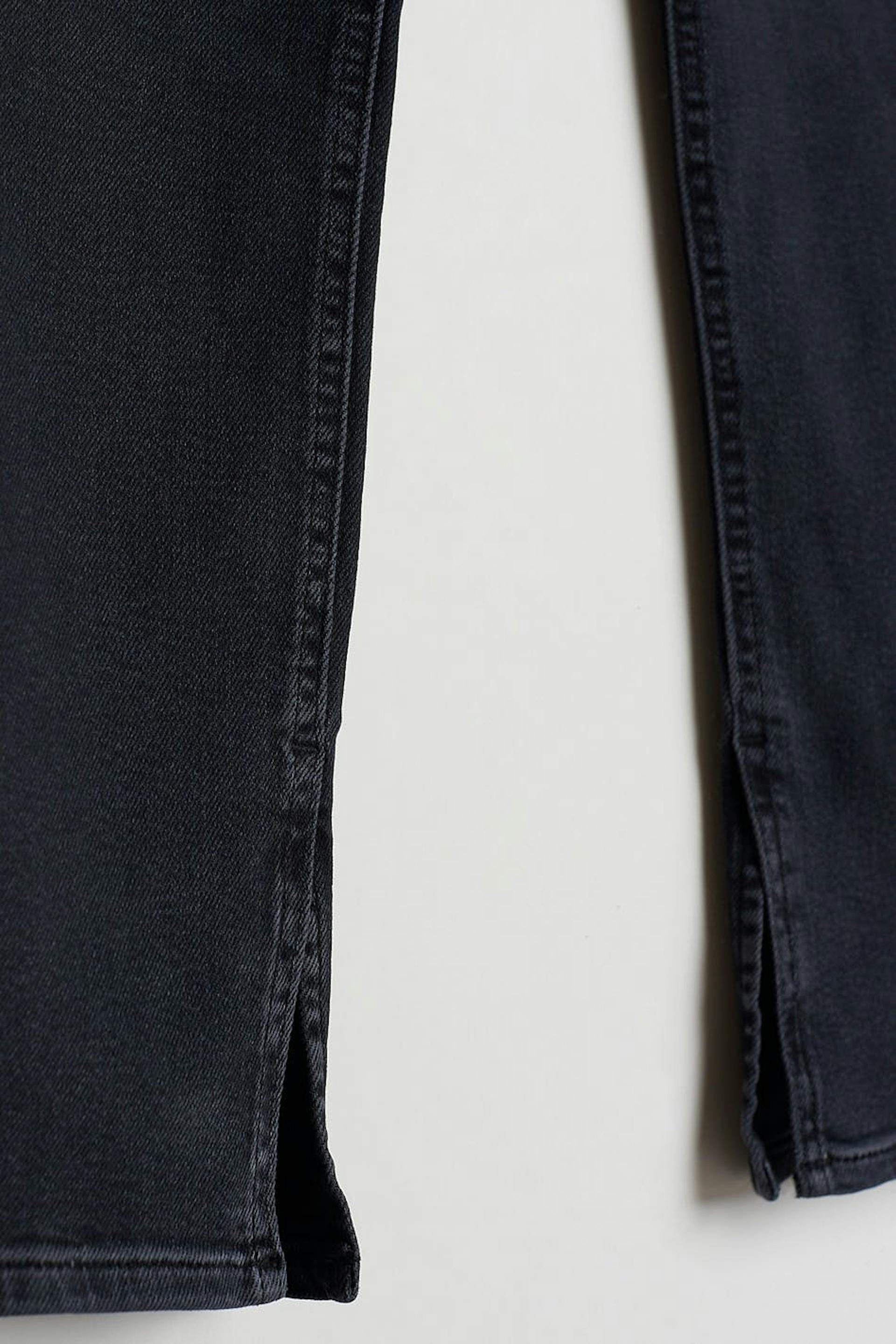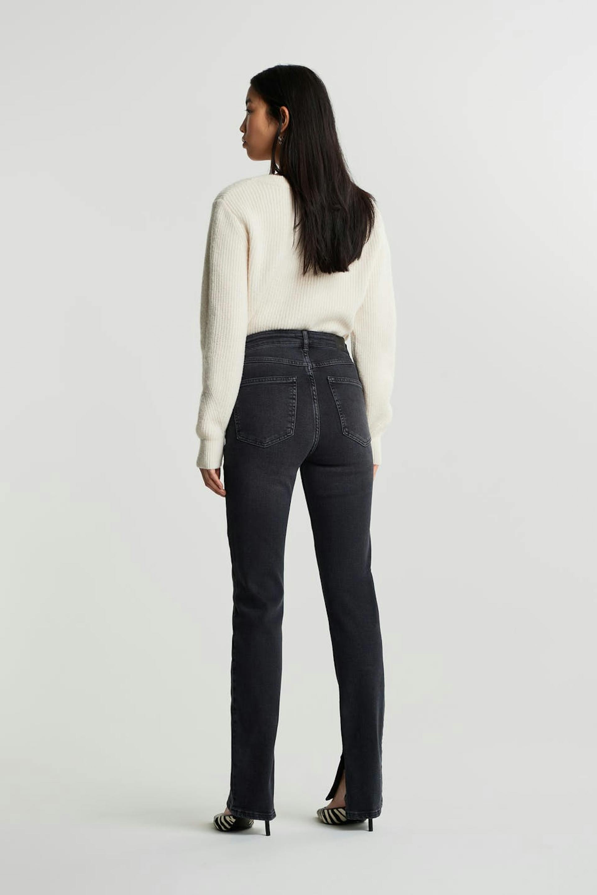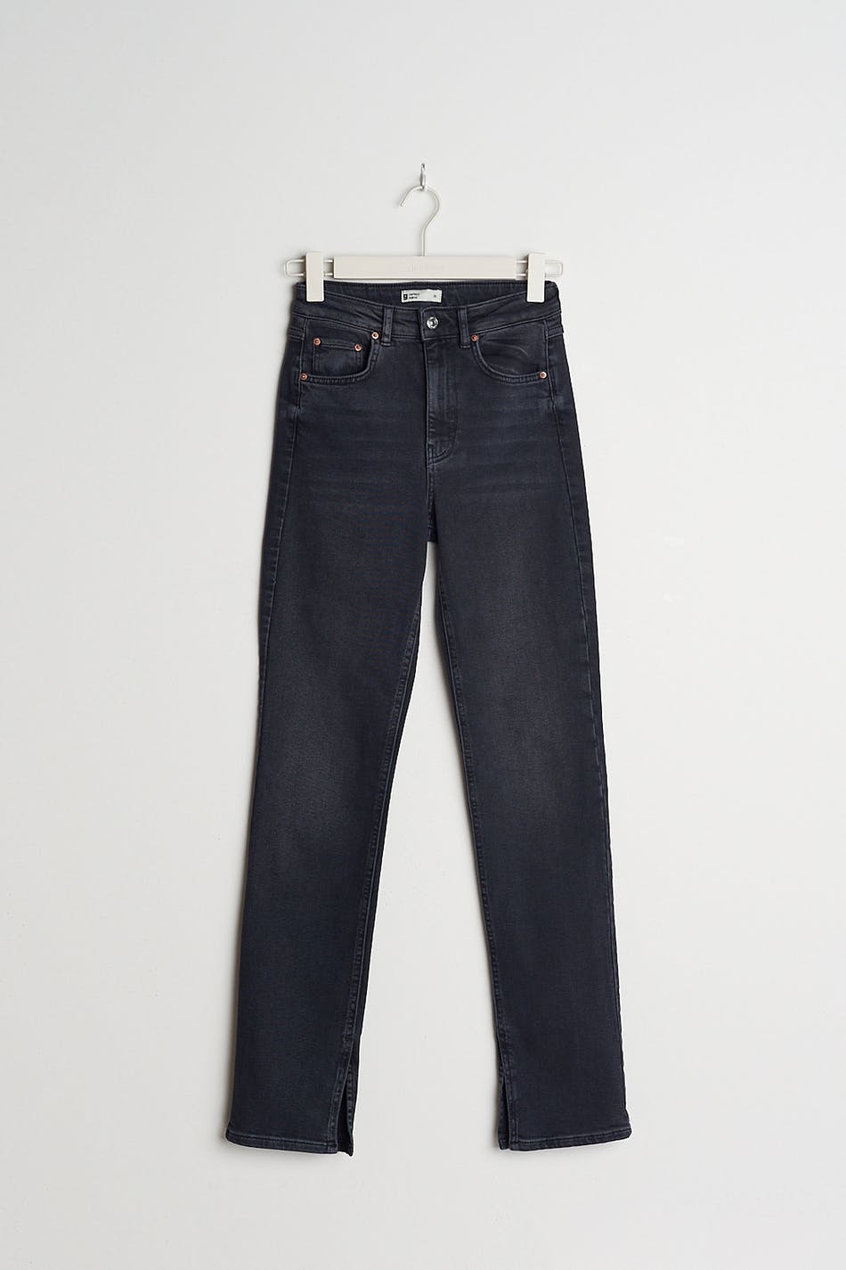Jeans med lige bener med en slids ved enden af benene. Jeansene er sortgrå og har komfortstræk. De har en høj talje.